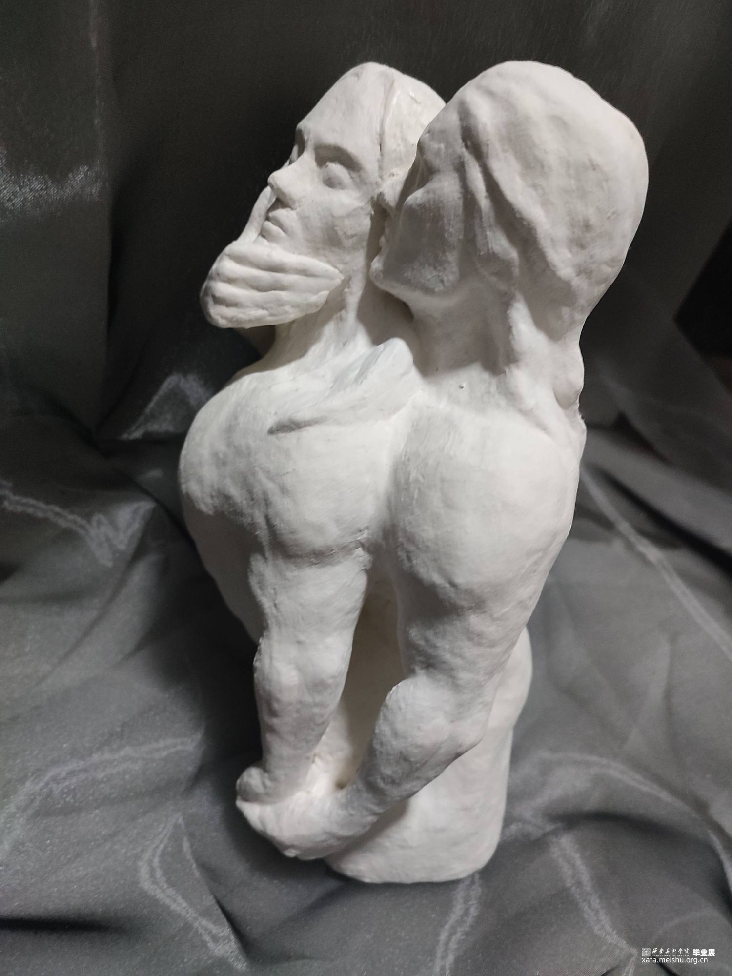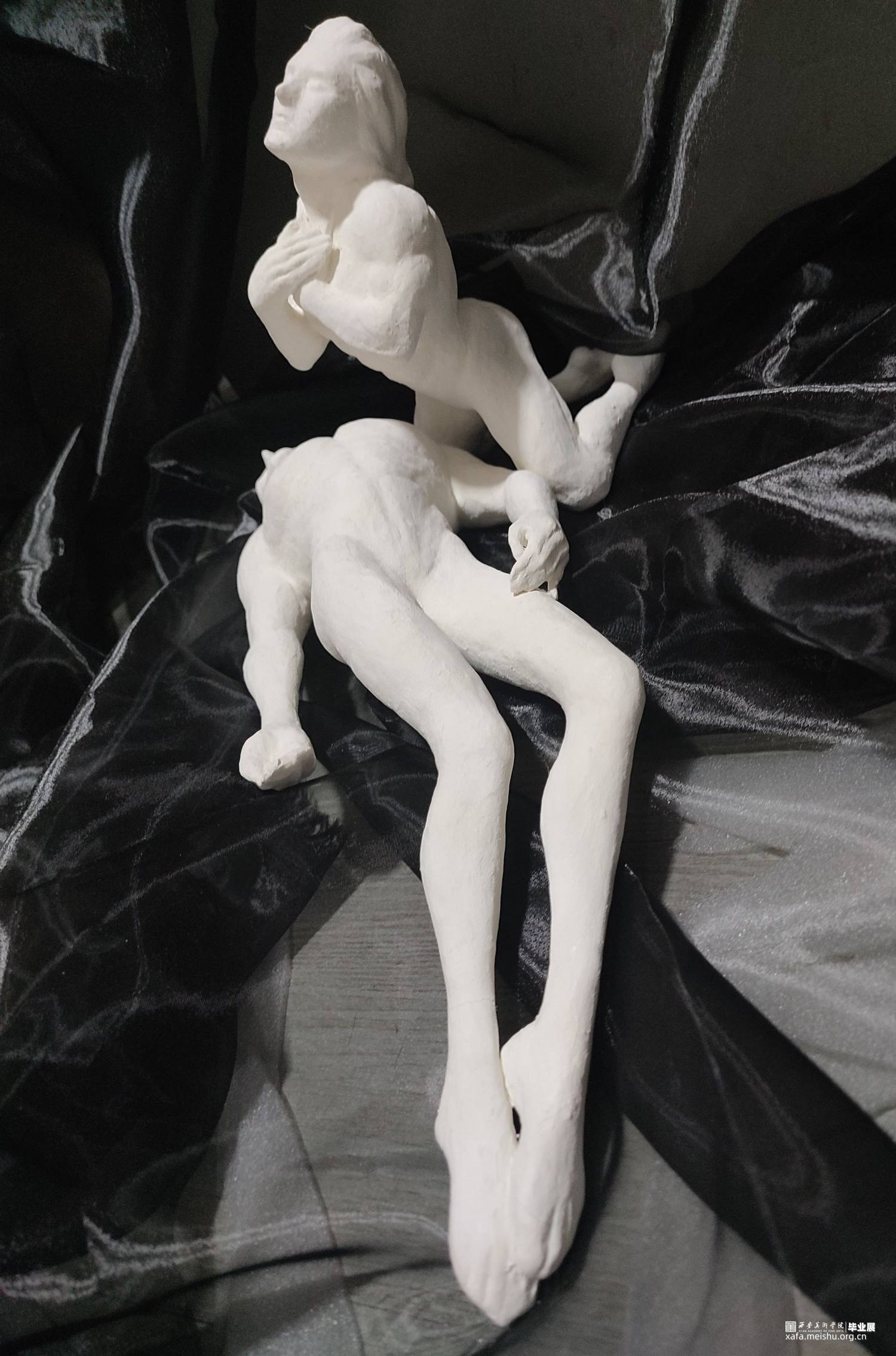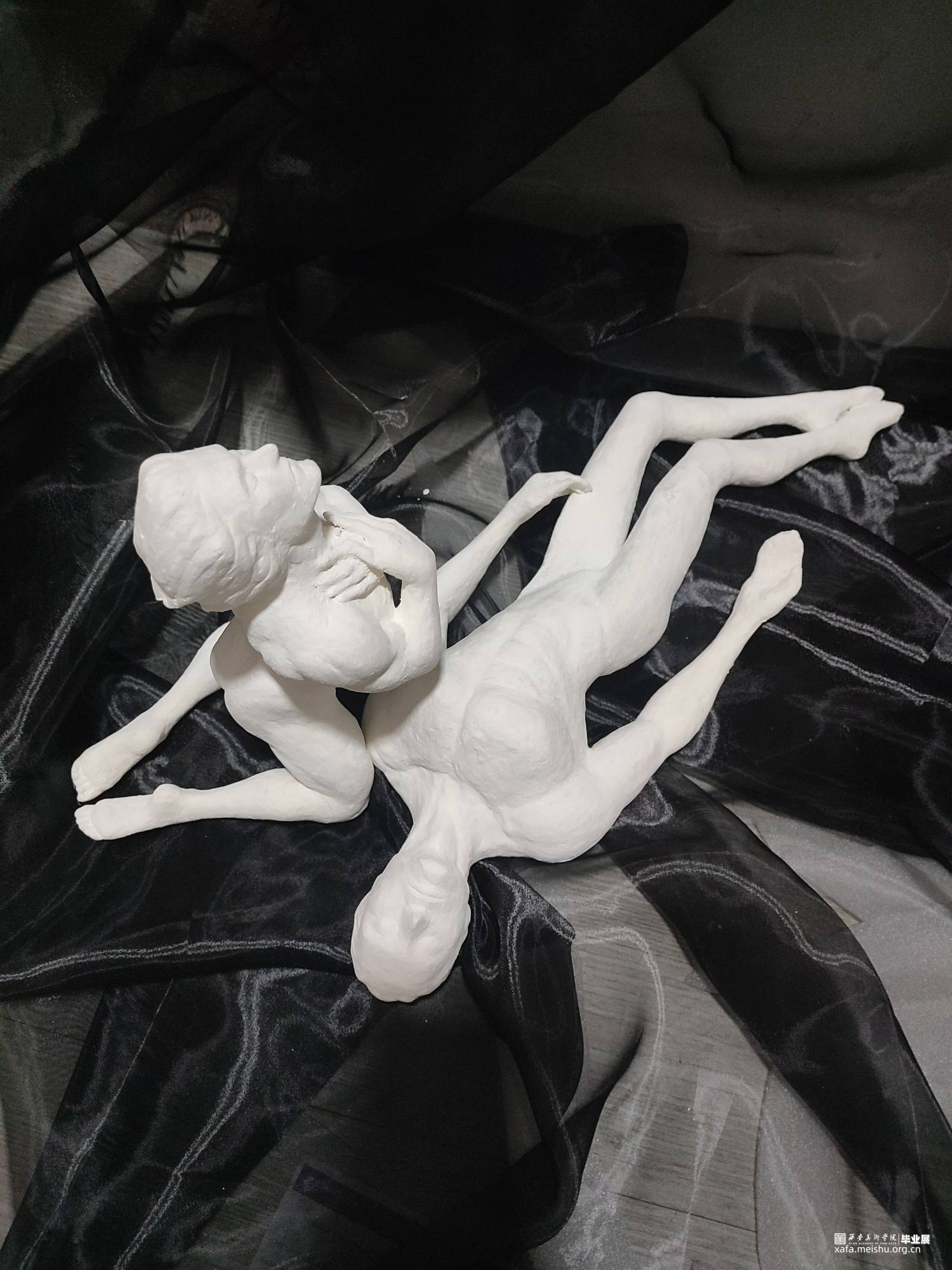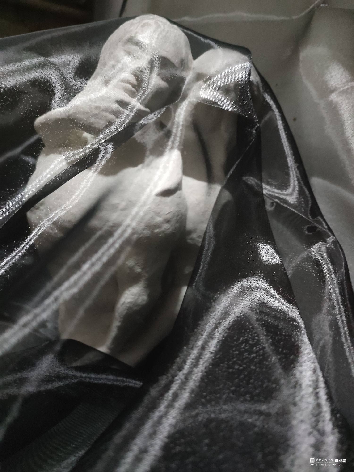 《阿卡琉斯之痛》通过表现这一场景描述传达出悲伤情绪,将古希腊少年爱的深沉与克制的表现凝聚成具象雕塑的一瞬间。跪姿的阿卡琉斯交叠的双手捂住胸口象征着失去帕特罗克洛斯的痛苦如同无法呼吸般的难咽,黑色的纱质背景如同死亡带来的阴霾,把绝望和悲伤层层笼罩无法逃离,想传达出没有你我无法呼吸。