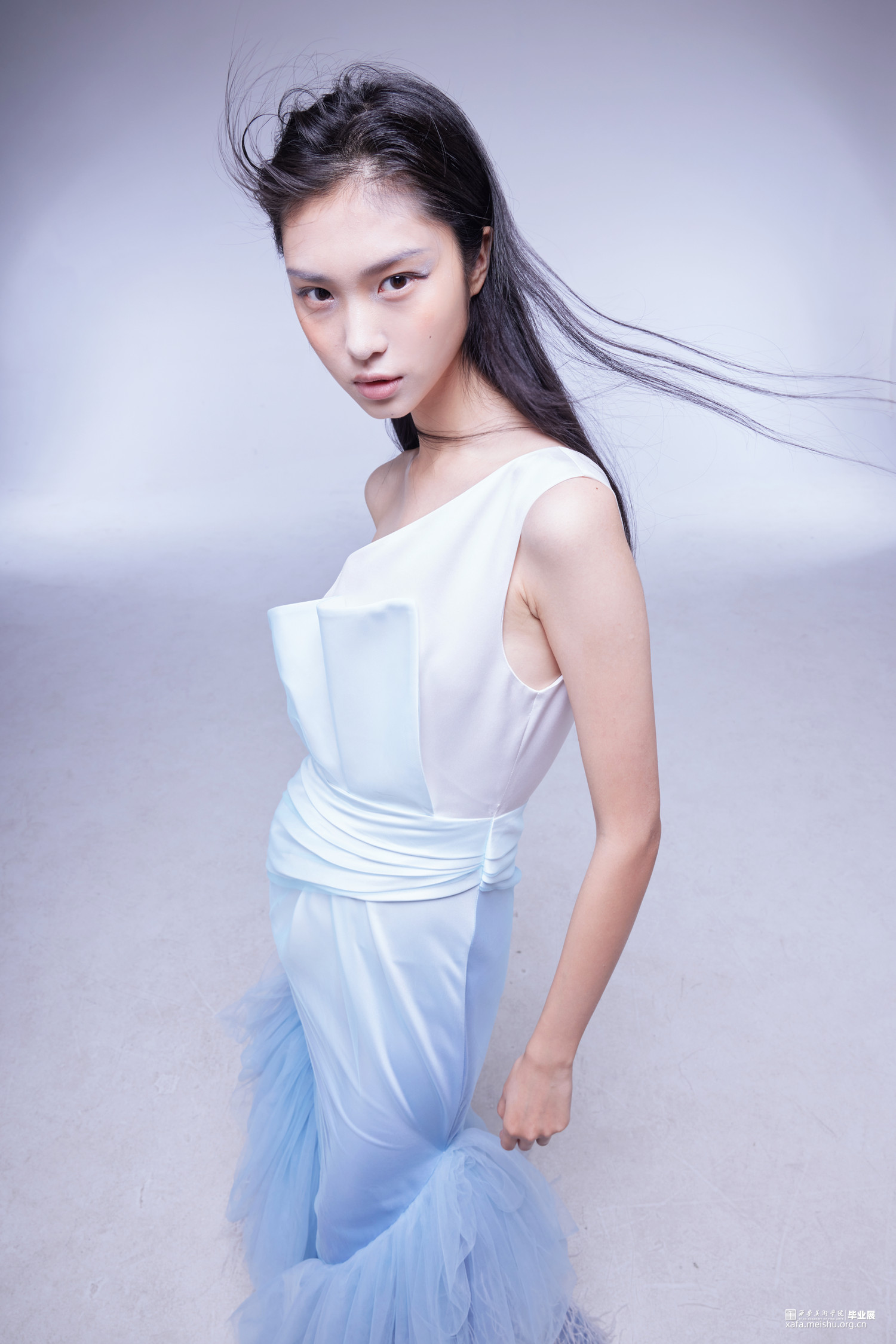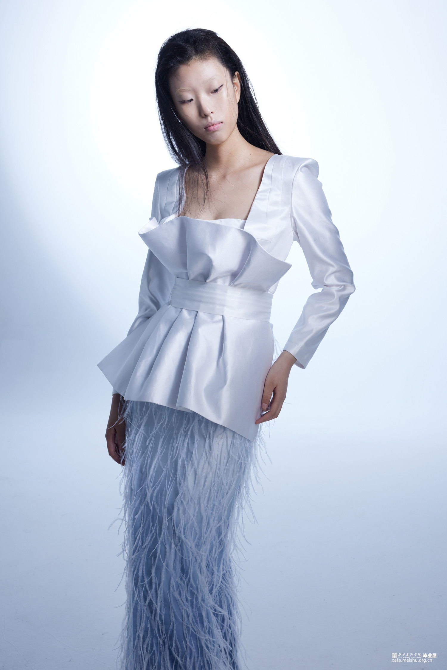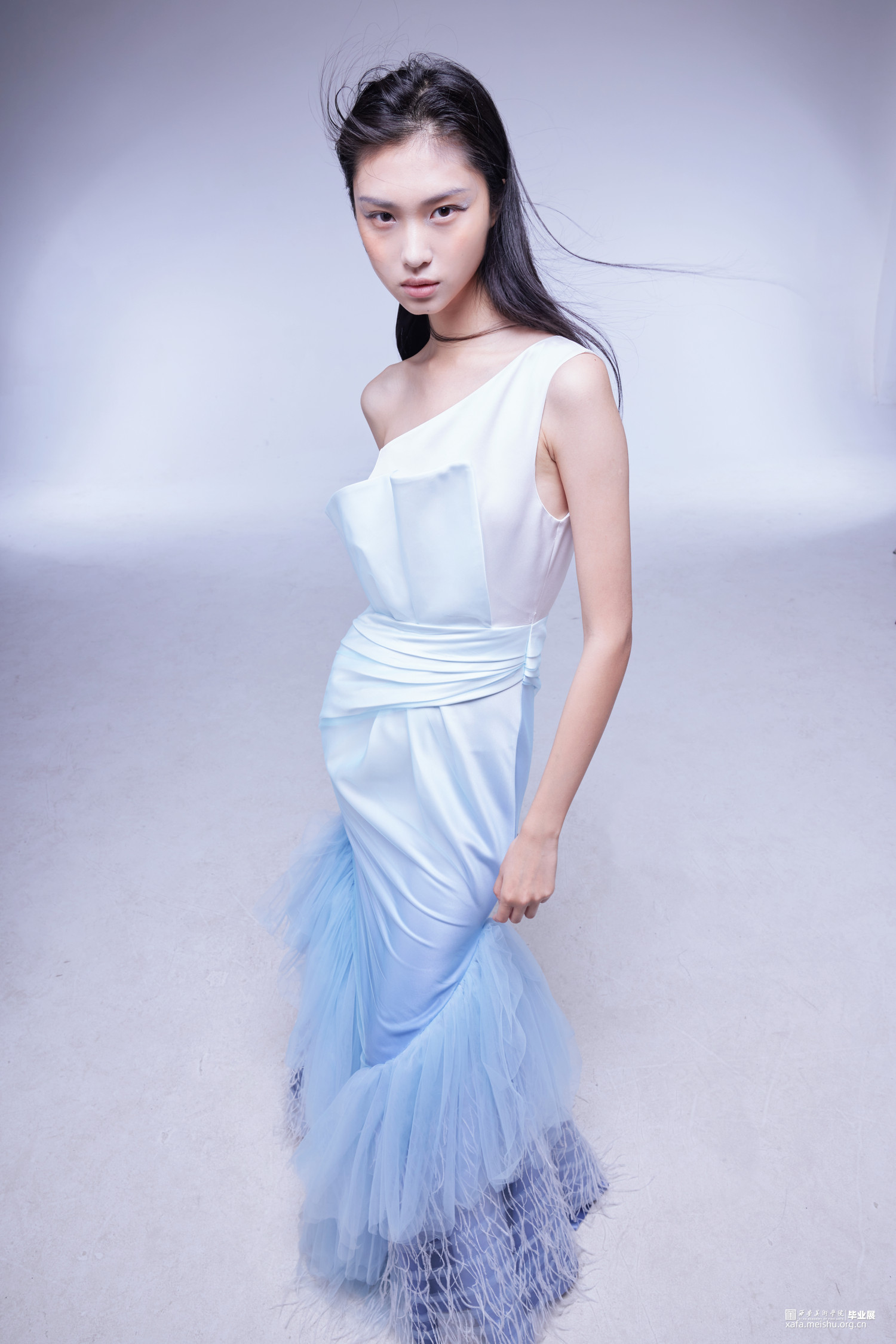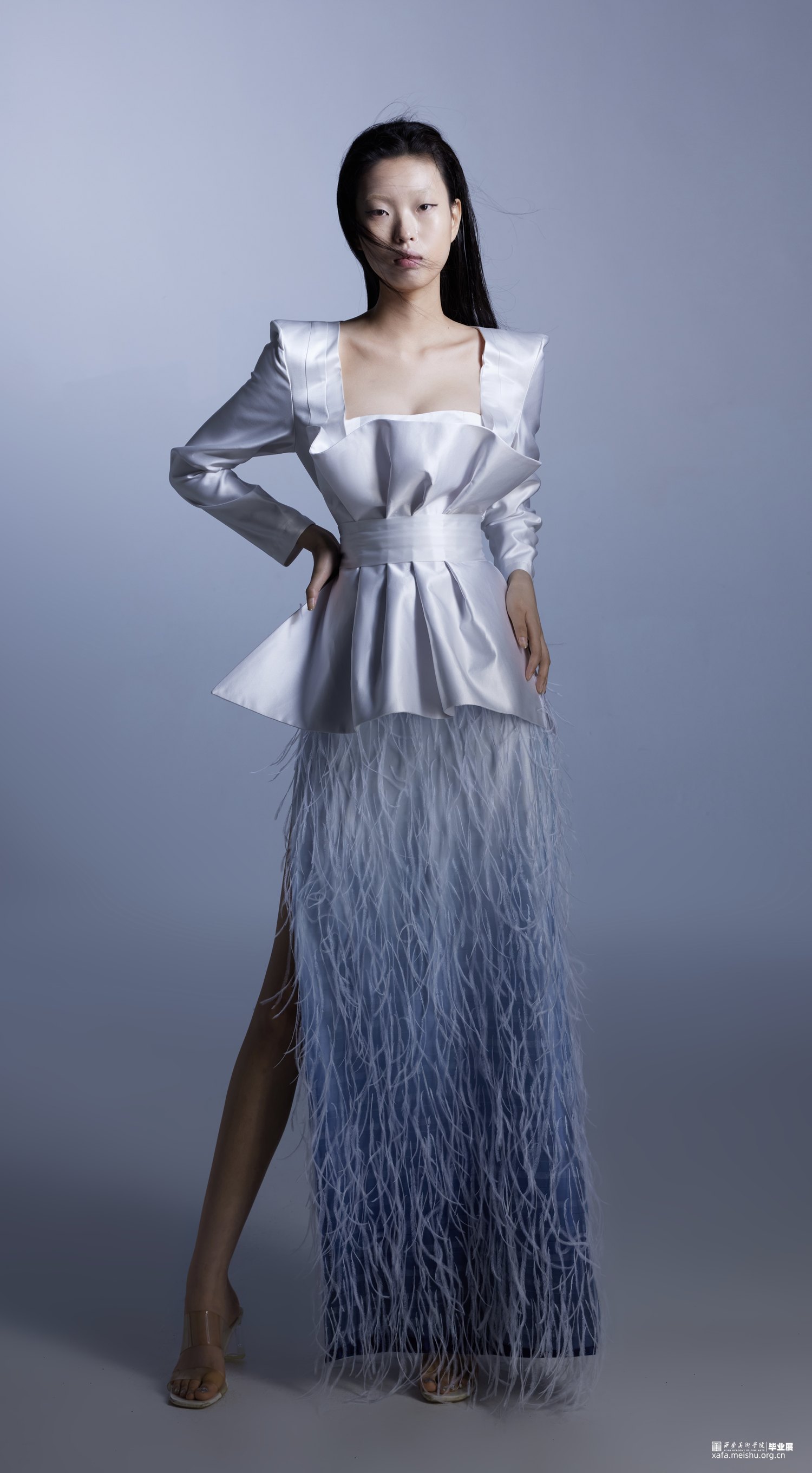 《夜宴——羽》系列礼服以网络游戏《永劫无间》中人物顾清寒为设计原型,她是是要雪葬仇敌的寒冰飞影,是殷切寻回至亲的飘零孤雁,截取人物核心元素,例如冰雪元素,羽毛元素为设计灵感切入,蓝白色为主题基调,切合人物性格和人物原型量身打造的礼服设计系列,是现代礼服与虚拟世界的一次碰撞。