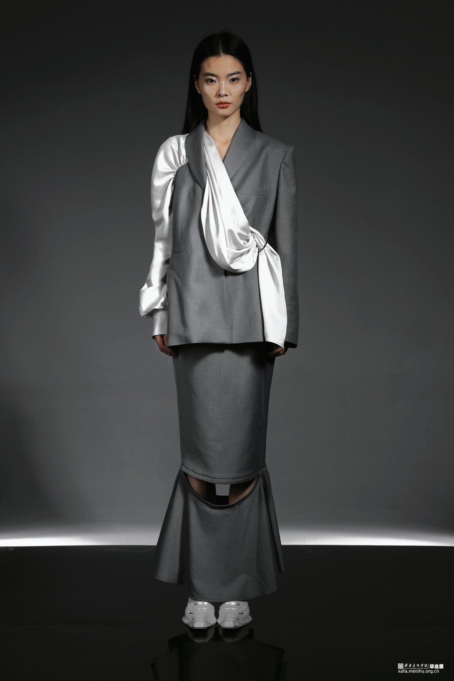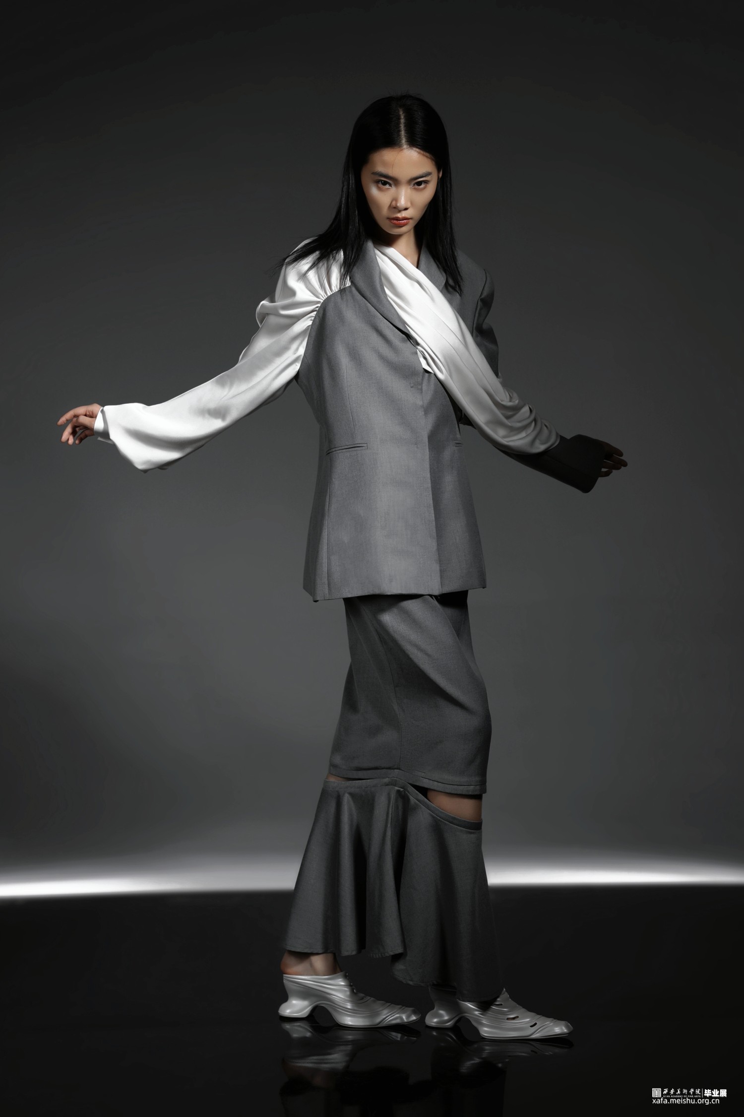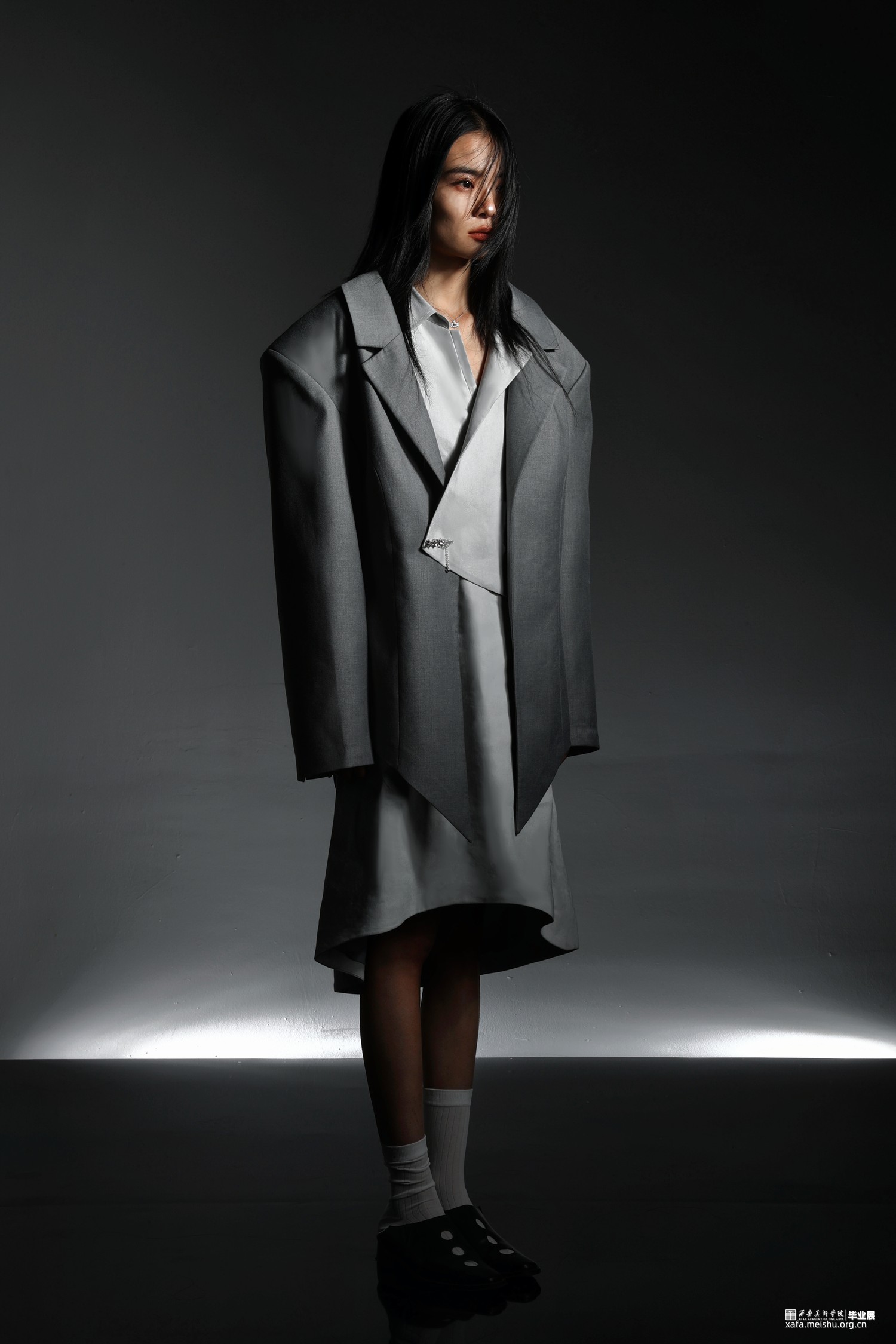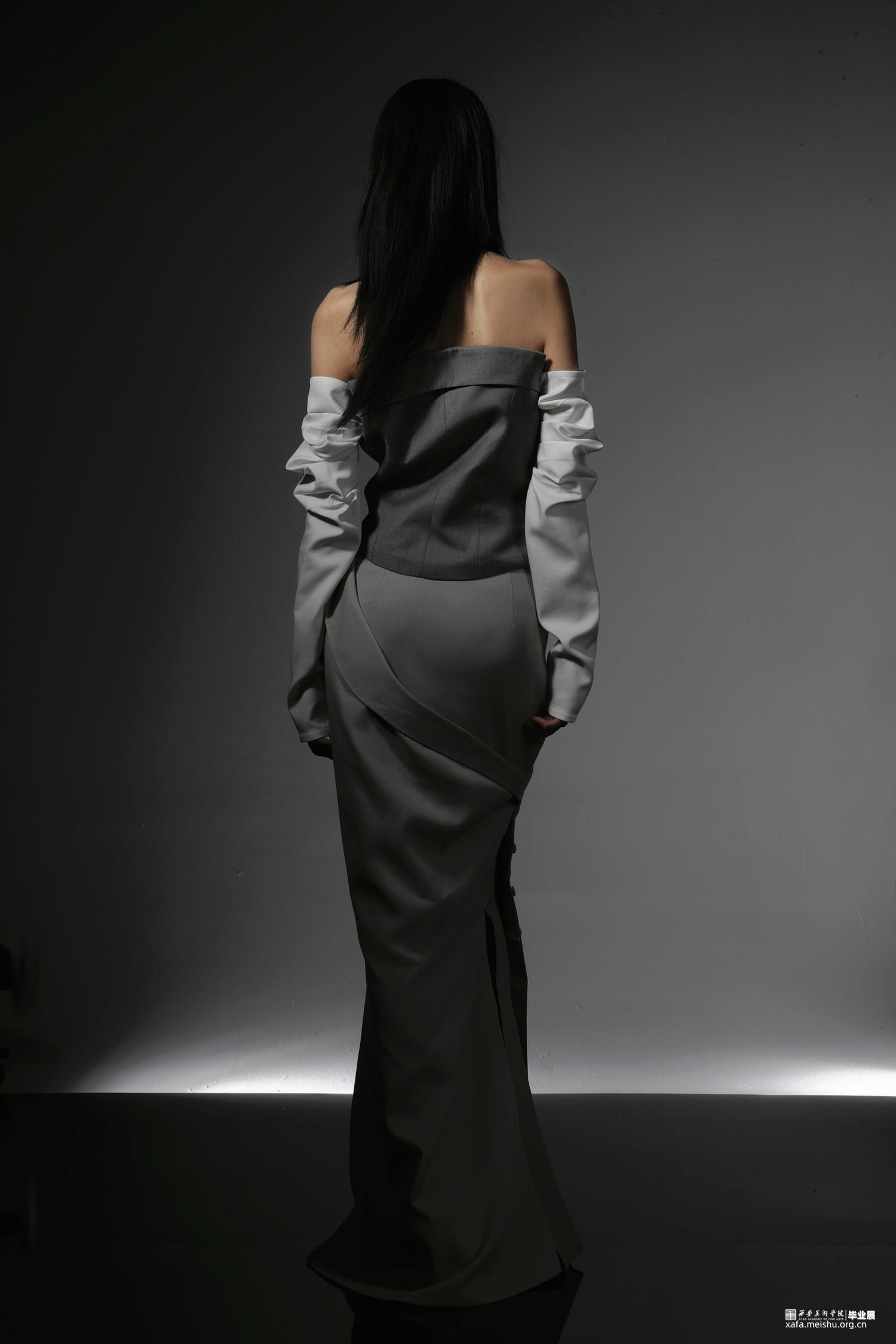 作品将空间现代建筑结构所呈现的视觉特征与服装相结合。通过保持这两种细微的相似之处,将建筑本身的内涵和美感被转化为一种服装语言,以简约精炼代替繁复奢华,专注于形式、线条、光线,使设计回归本真状态,呈现出纯粹感和优雅感。