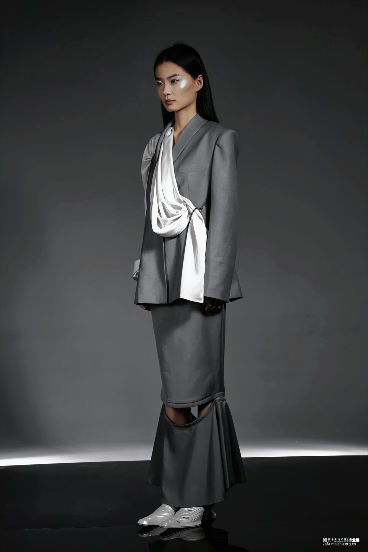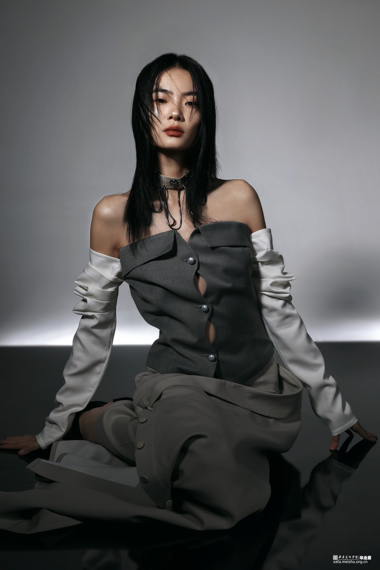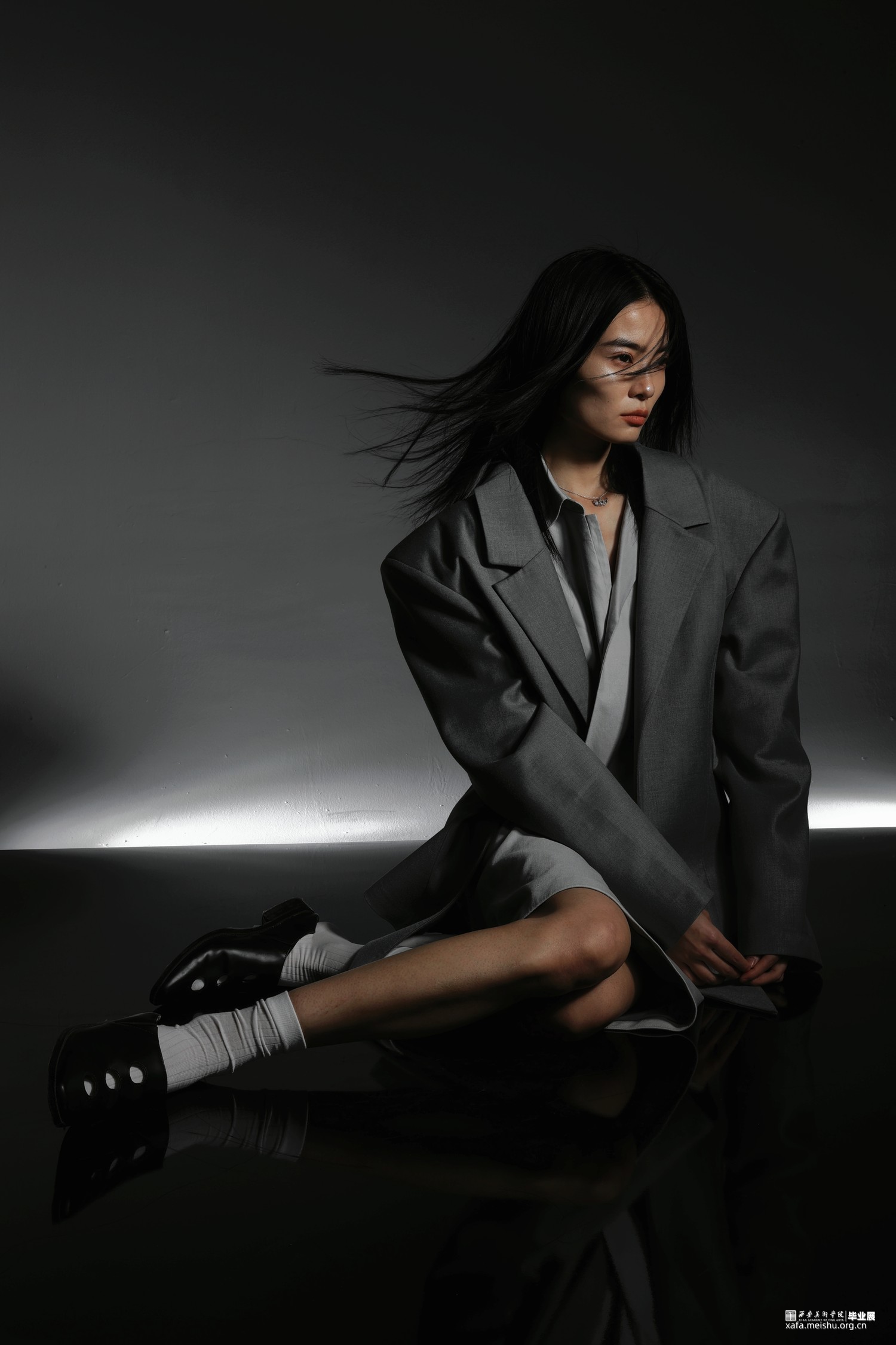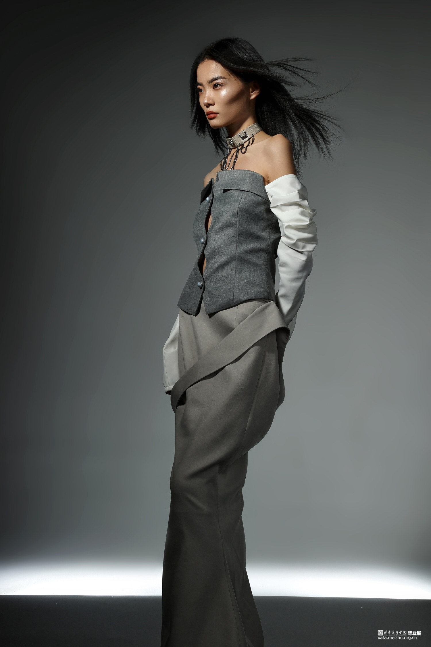 作品将空间现代建筑结构所呈现的视觉特征与服装相结合。通过保持这两种细微的相似之处,将建筑本身的内涵和美感被转化为一种服装语言,以简约精炼代替繁复奢华,专注于形式、线条、光线,使设计回归本真状态,呈现出纯粹感和优雅感。