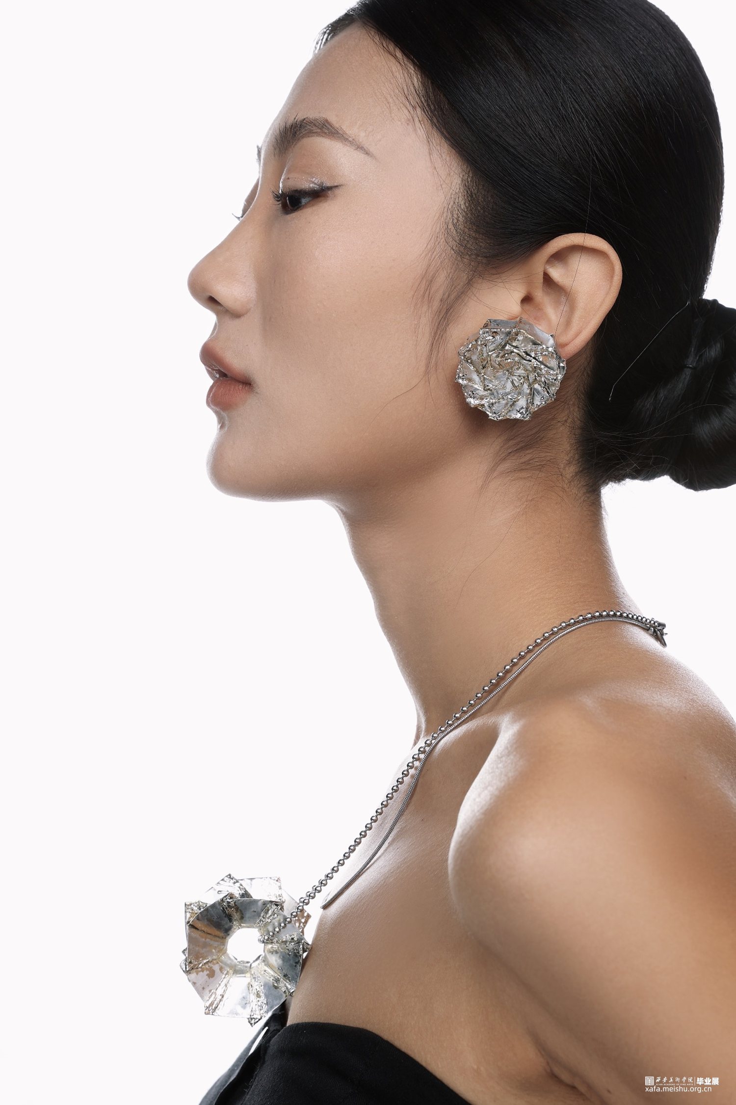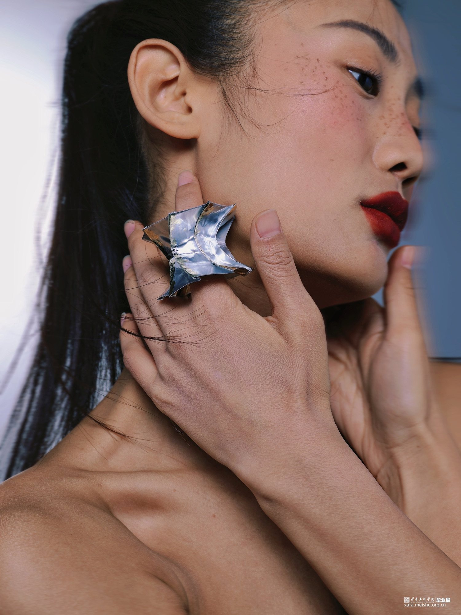 我以折纸艺术为灵感,设计了这一系列的首饰。折纸是一种古老而精致的手工艺,通过折叠纸张,可以创造出各种形态和结构。我希望通过将折纸的美学元素融入首饰设计中,呈现出简约、几何而又富有艺术感的作品。每一件首饰都代表了一种独特的折纸形态,展现了平面艺术转化为立体艺术的魅力。