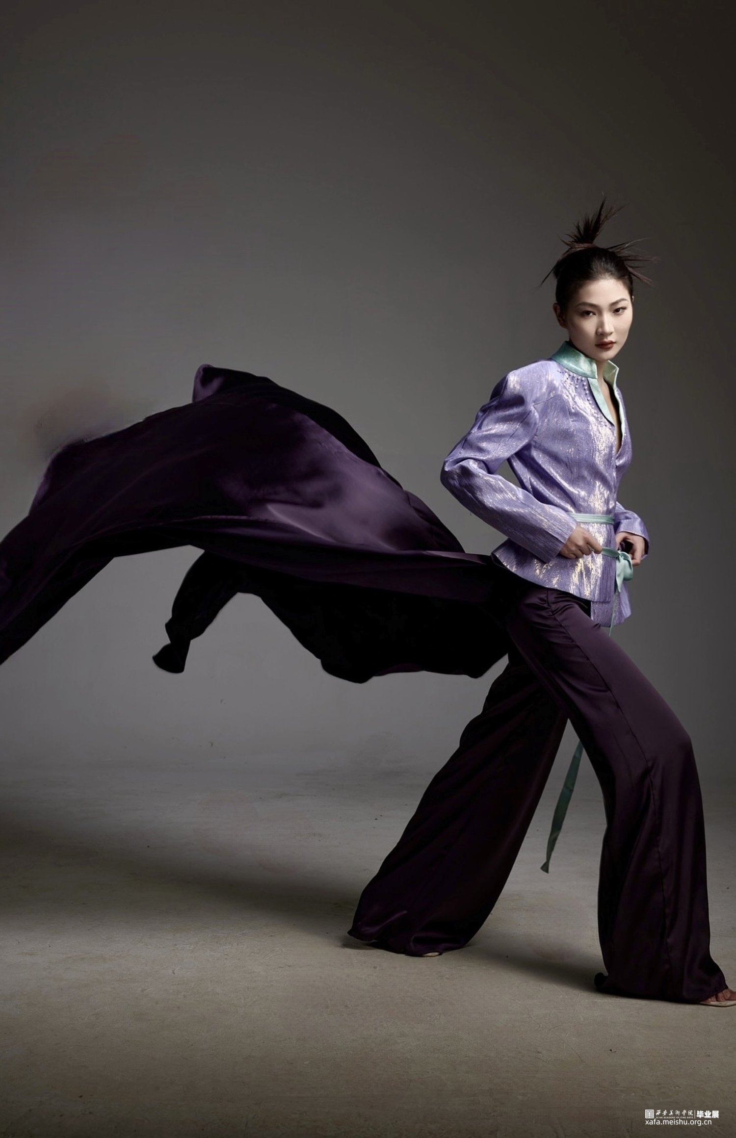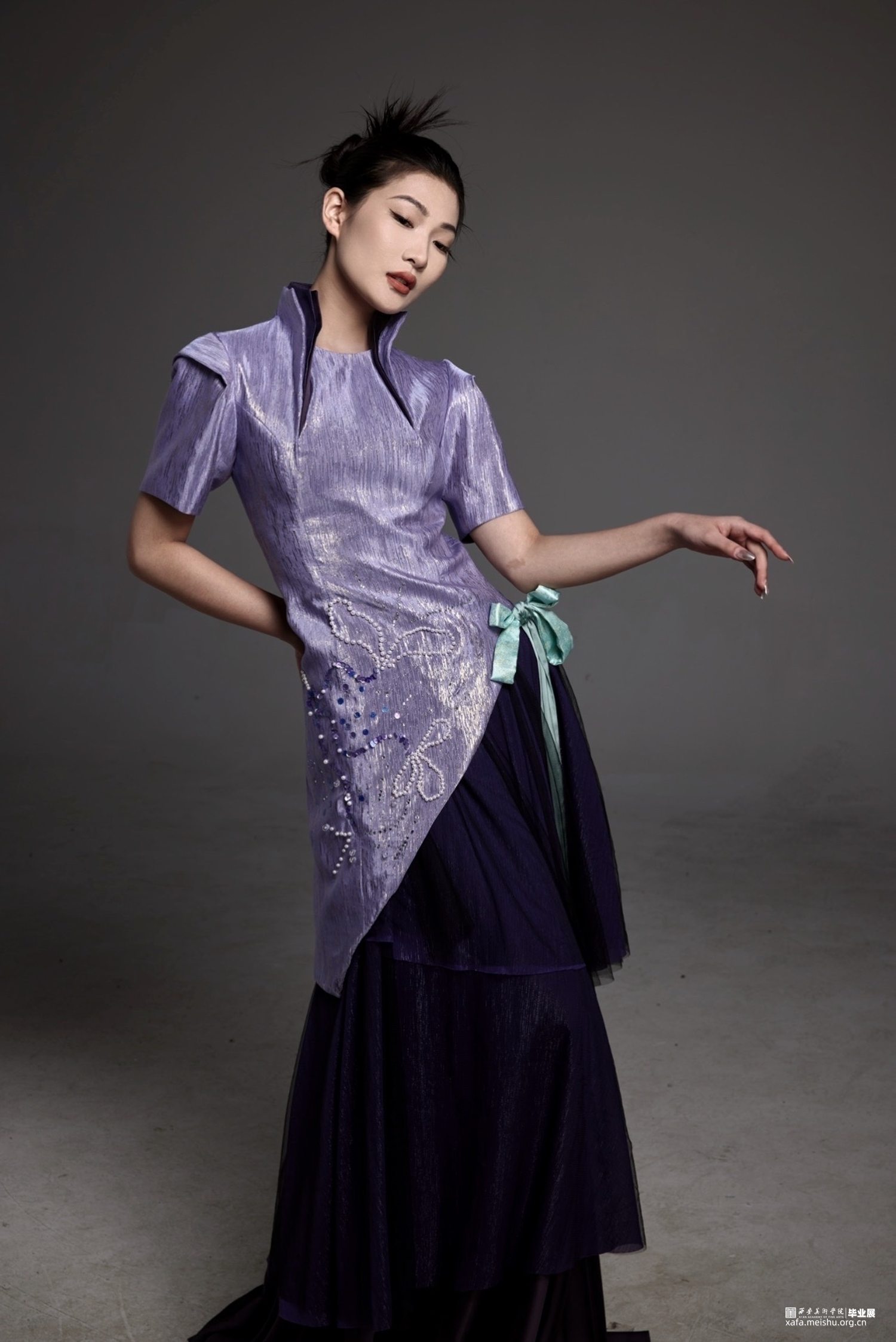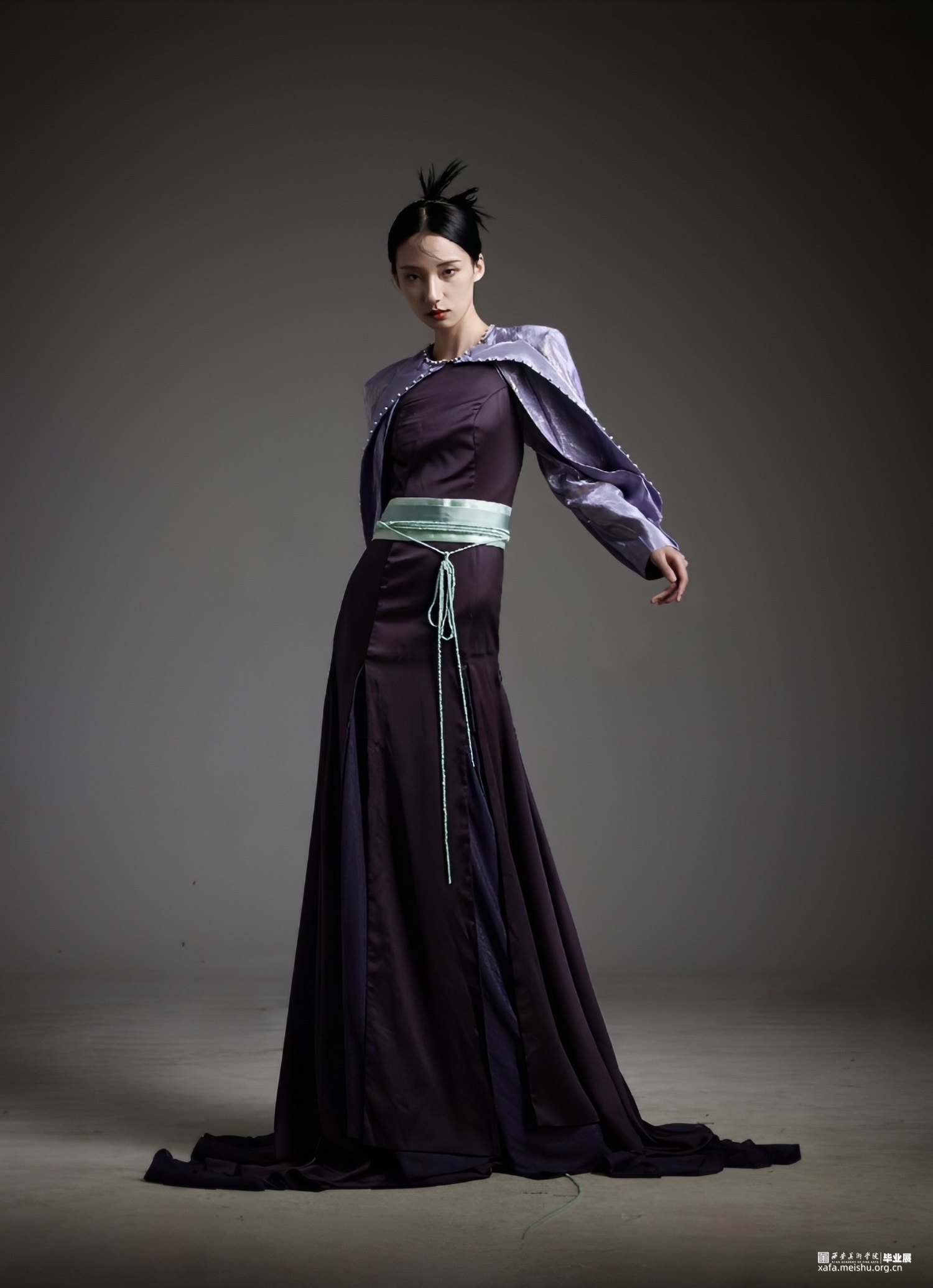 本系列作品以剑侠情缘三中的万花门派为灵感来源,采用了该门派的代表色系:紫色,并将“夜幕星河”作为服装的设计重点,裙子部分如月花顺流而下,上衣部分如星河点点流淌。