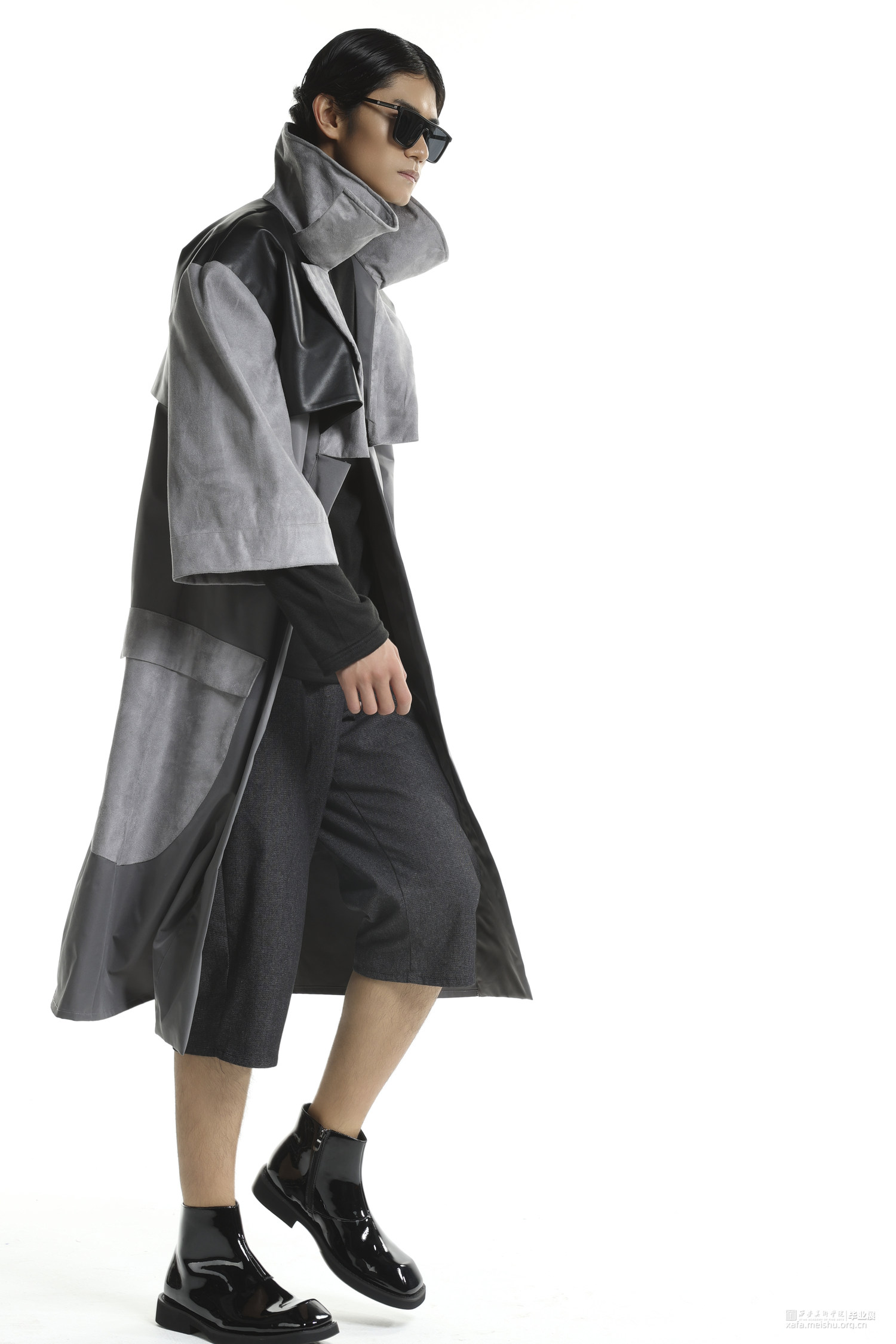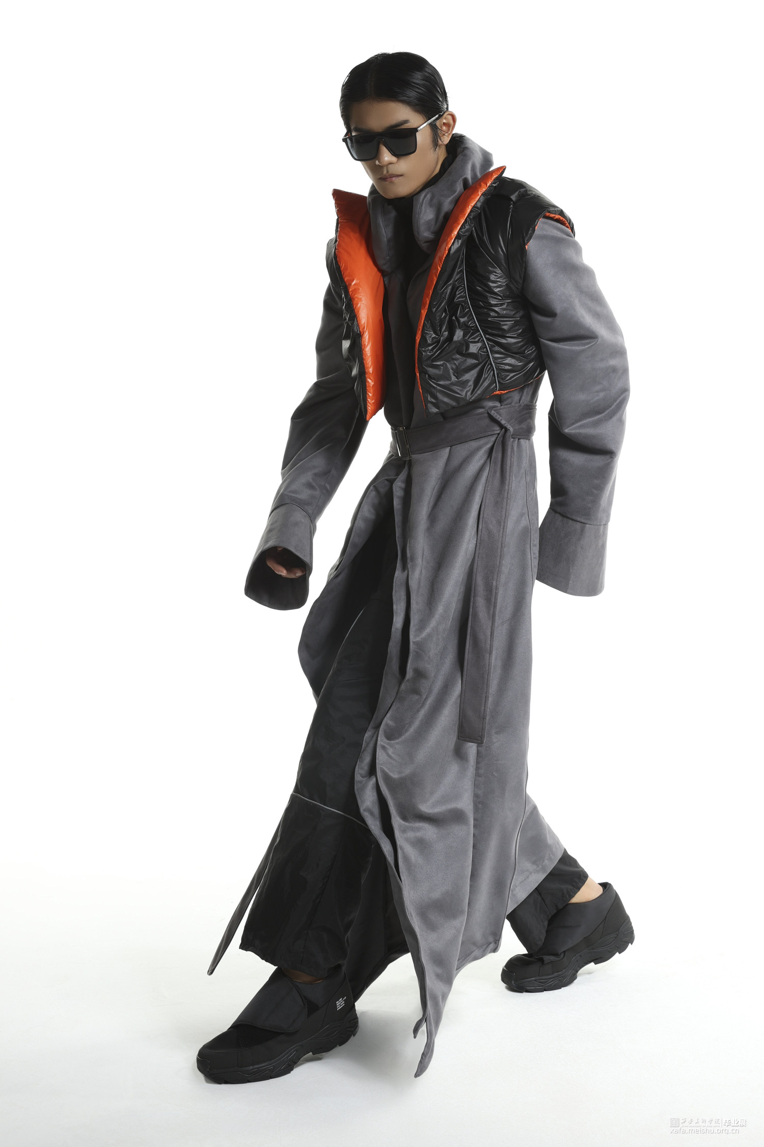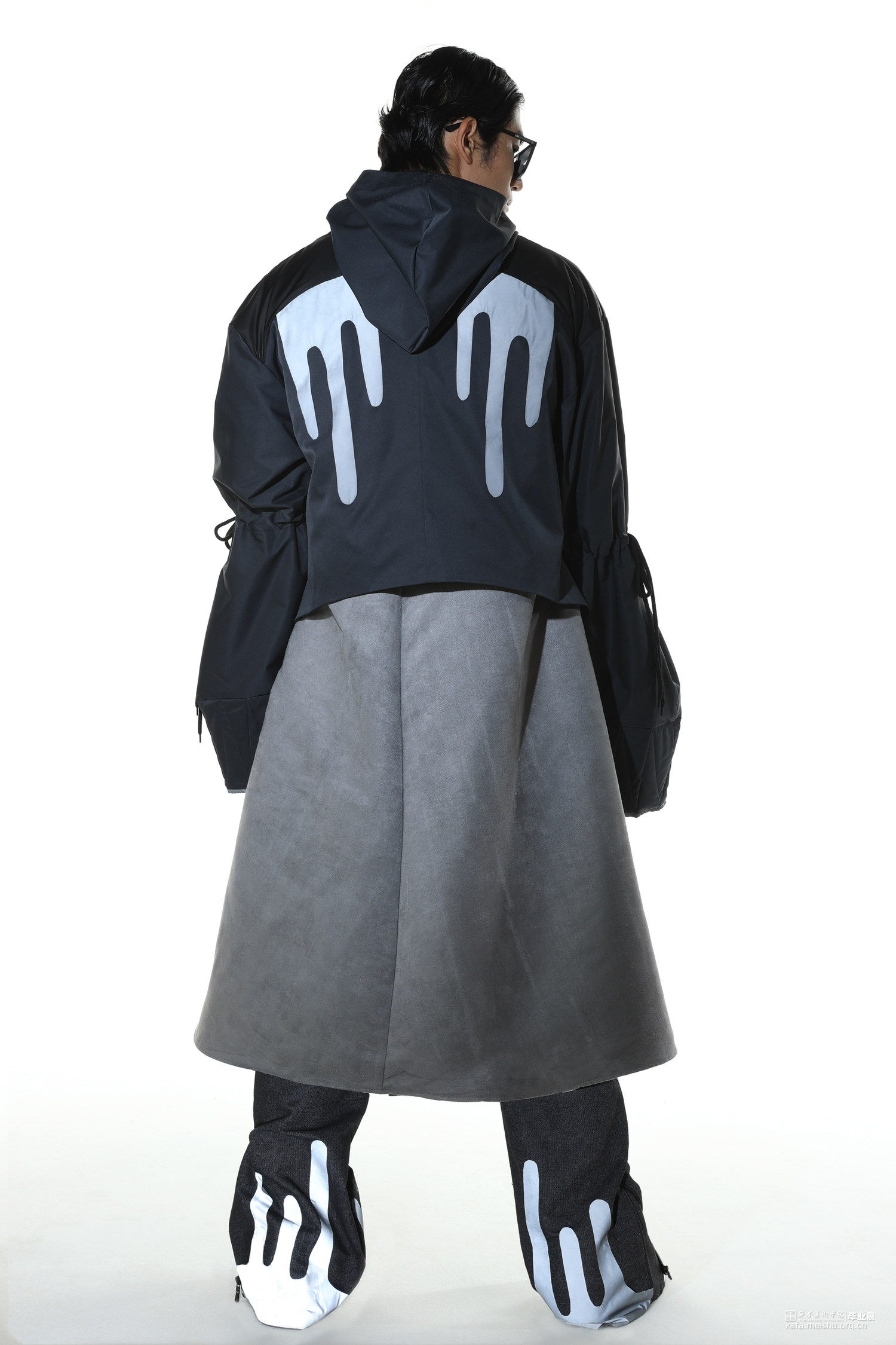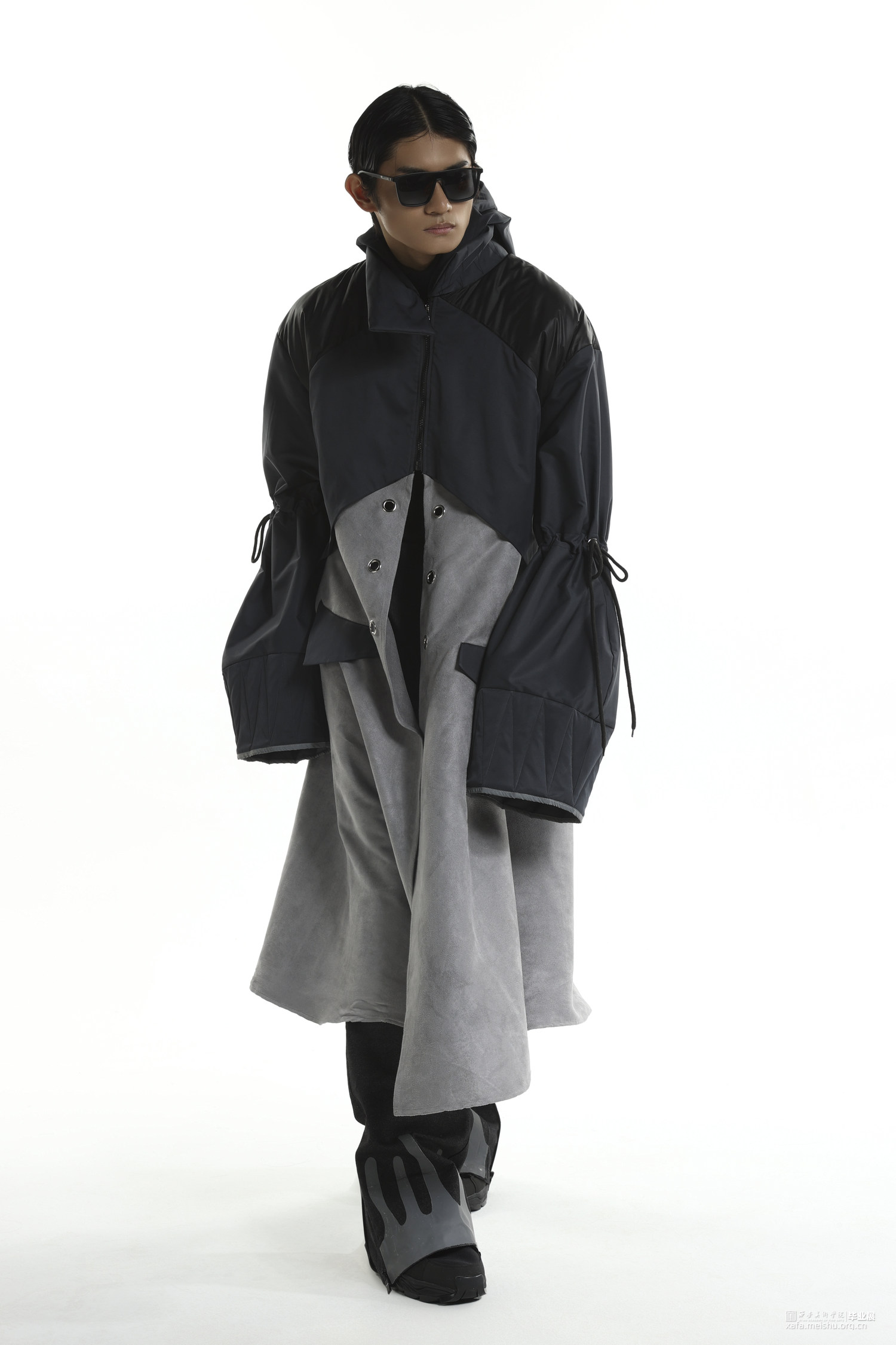 随着流行文化的发展,球鞋不仅仅是一件运动的装备,也变成了流行文化的符号。在对穿着者提供保护的同时,球鞋设计也越来越天马行空,鞋面材料越来越多样,鞋面结构越来越大胆,材料多种多样。本作品将球鞋特殊结构设计融入风衣设计,试图展现让人眼前一亮的效果。