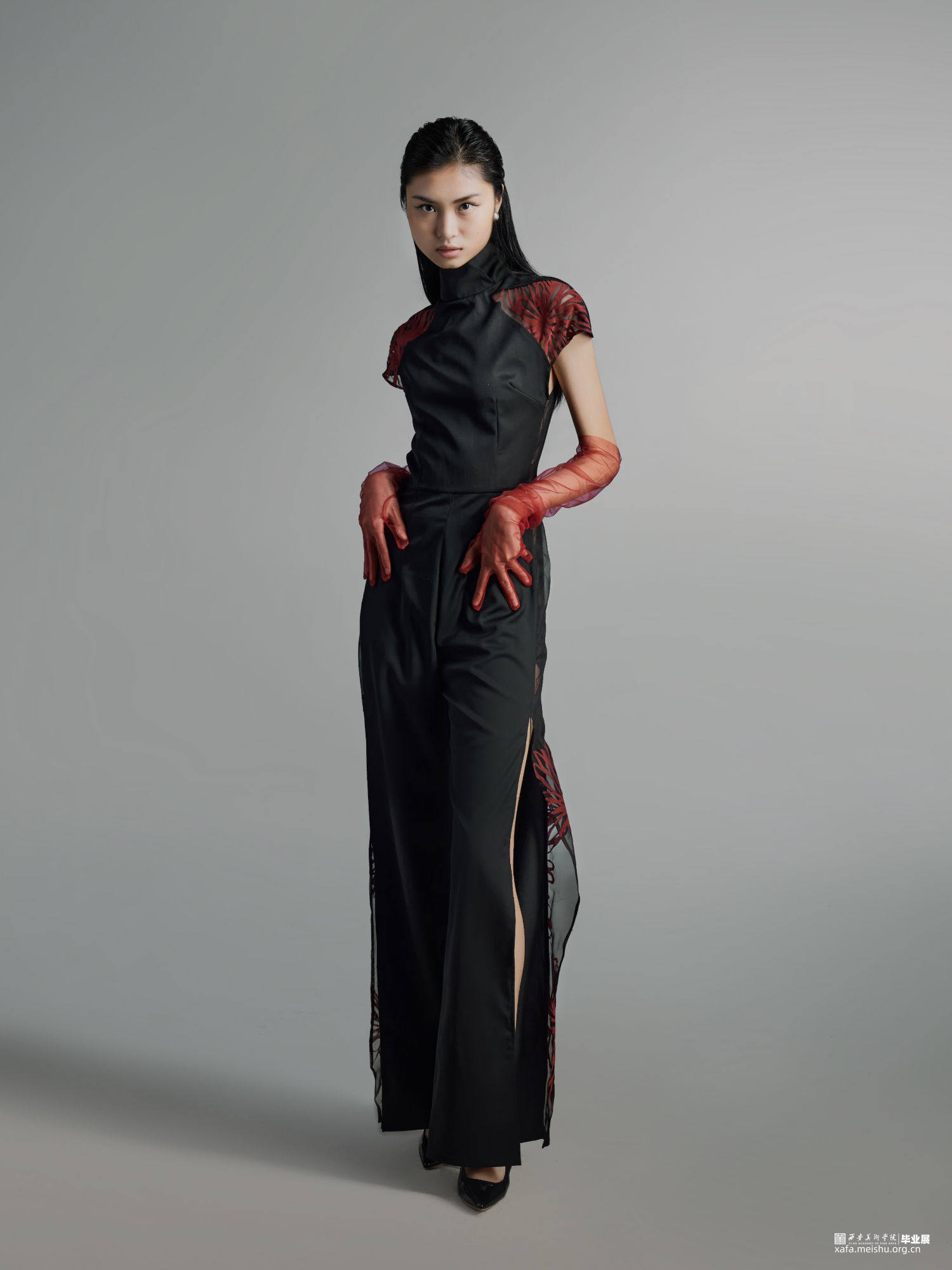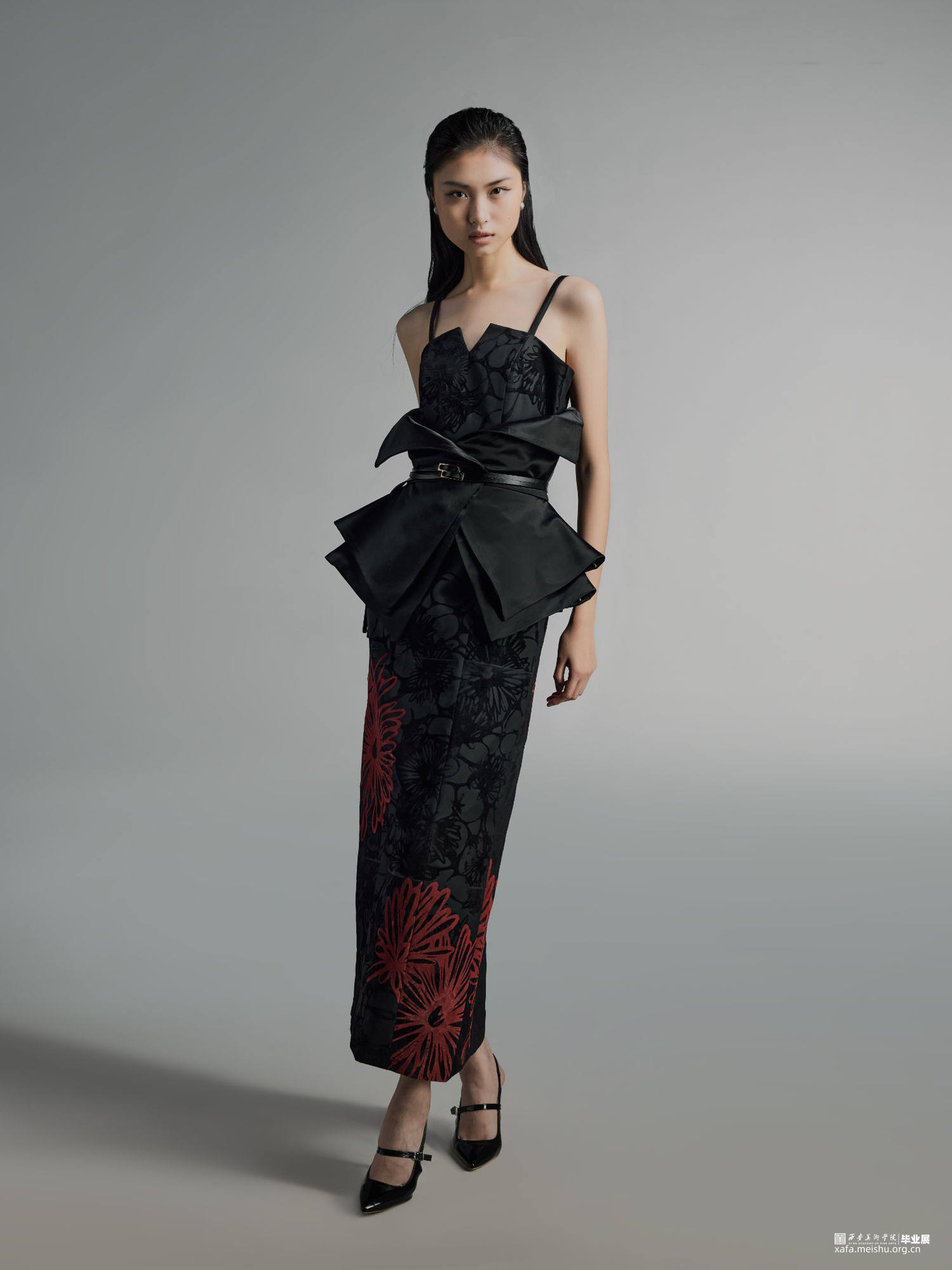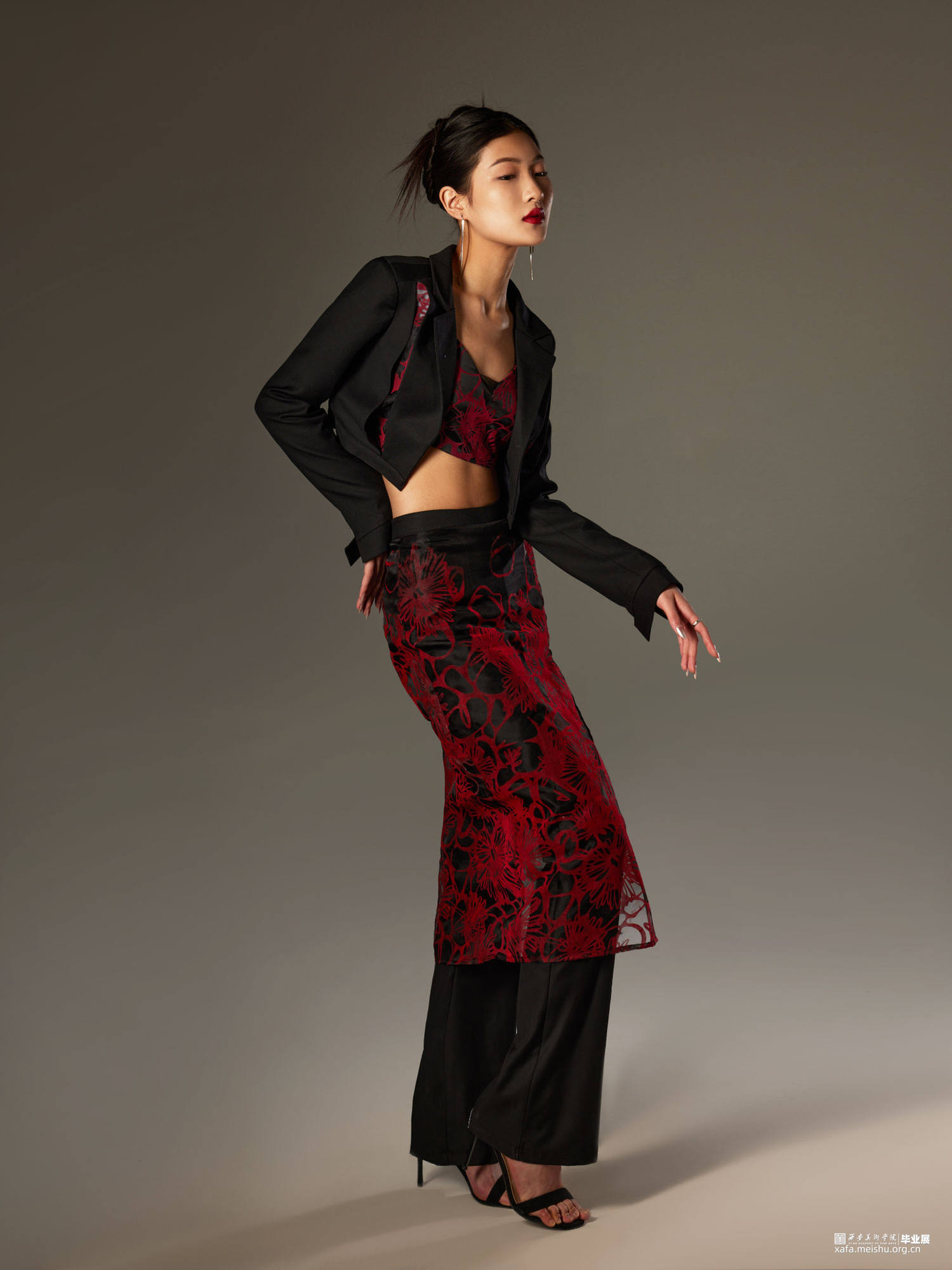 该作品以概念化的“视窗”到具像化延伸物“石生花”作为设计的核心内容,以石生花的生命理念融入到图案设计中,阐述了当代女性的智慧、自信与表达独立自我的多变风格。服装整体以黑色作为主色,视觉感舒适的同时又富有灵动和张力,给人刚柔并济的美感。