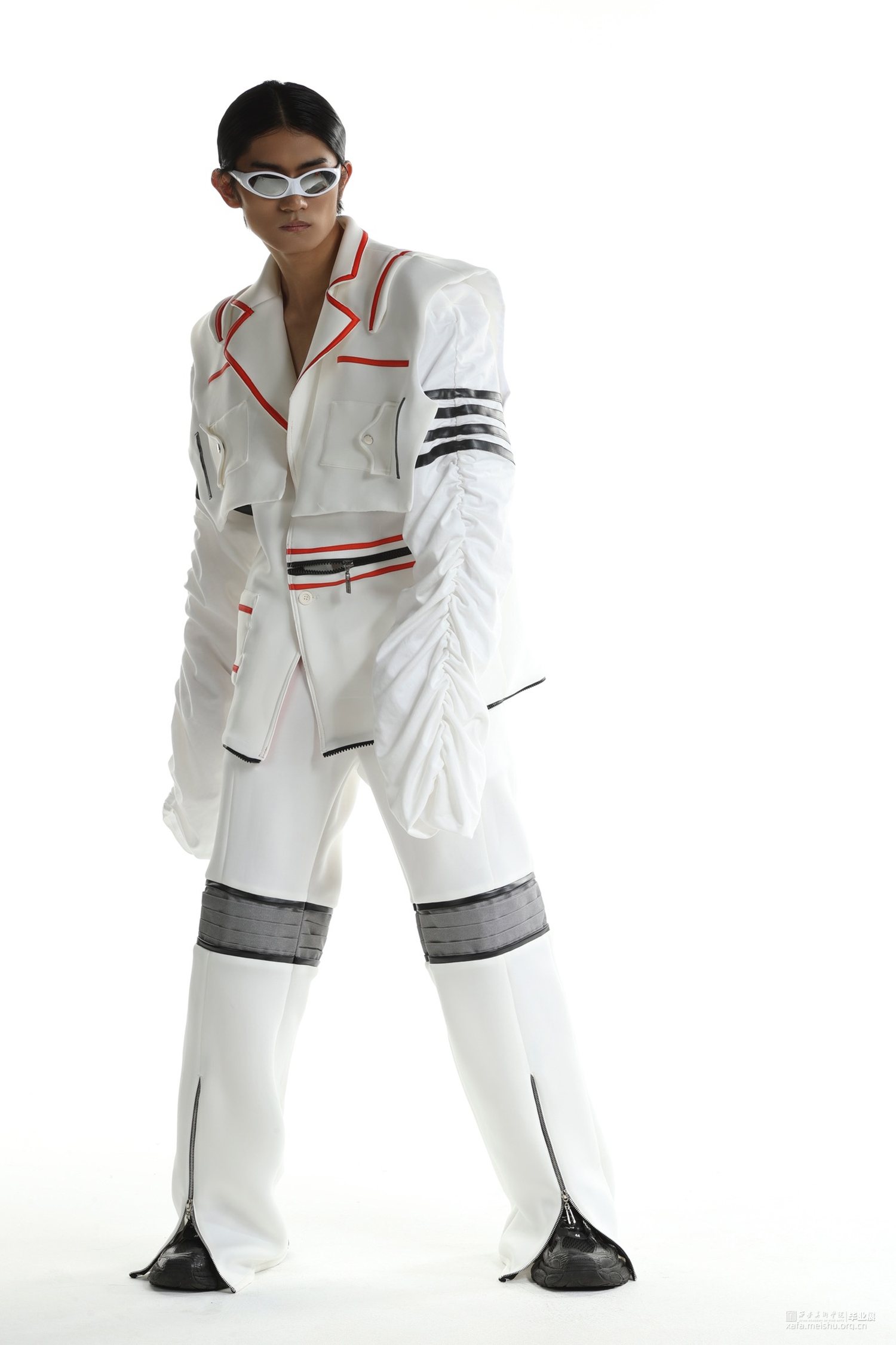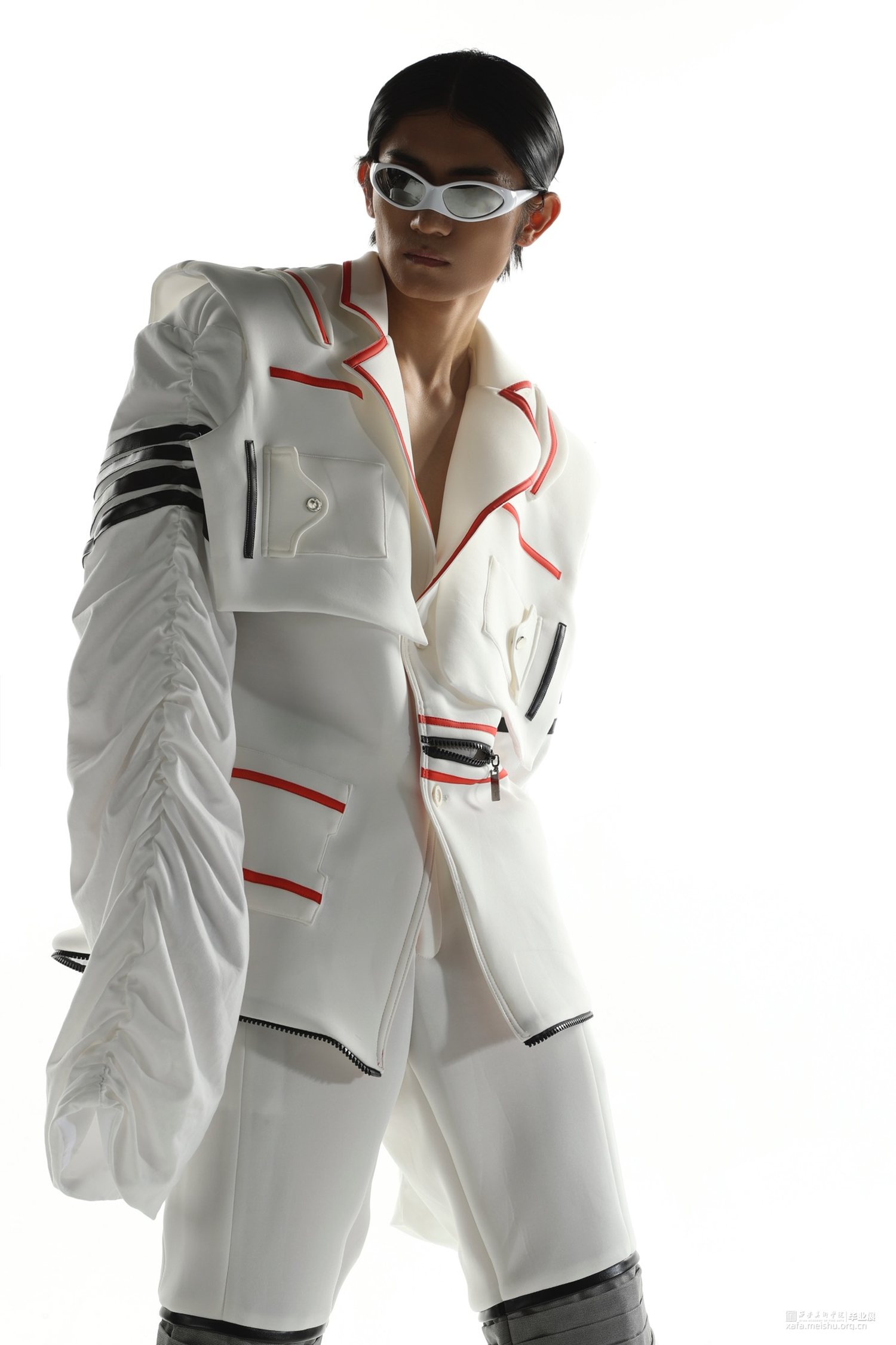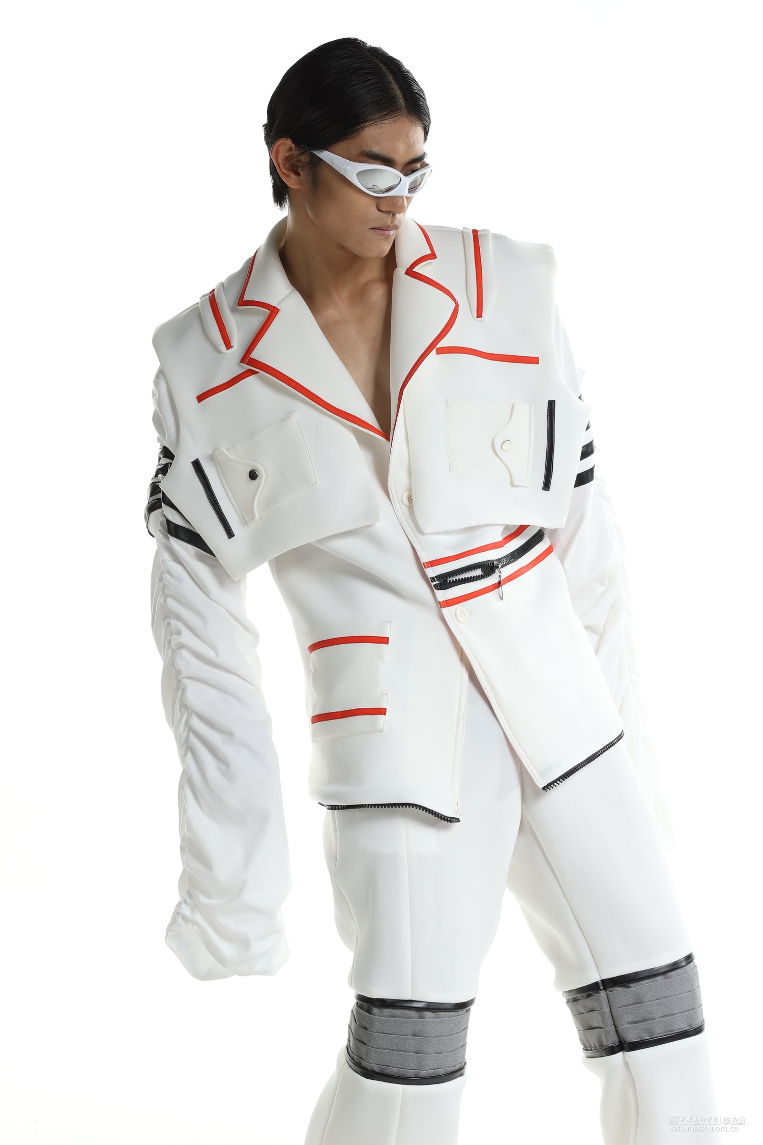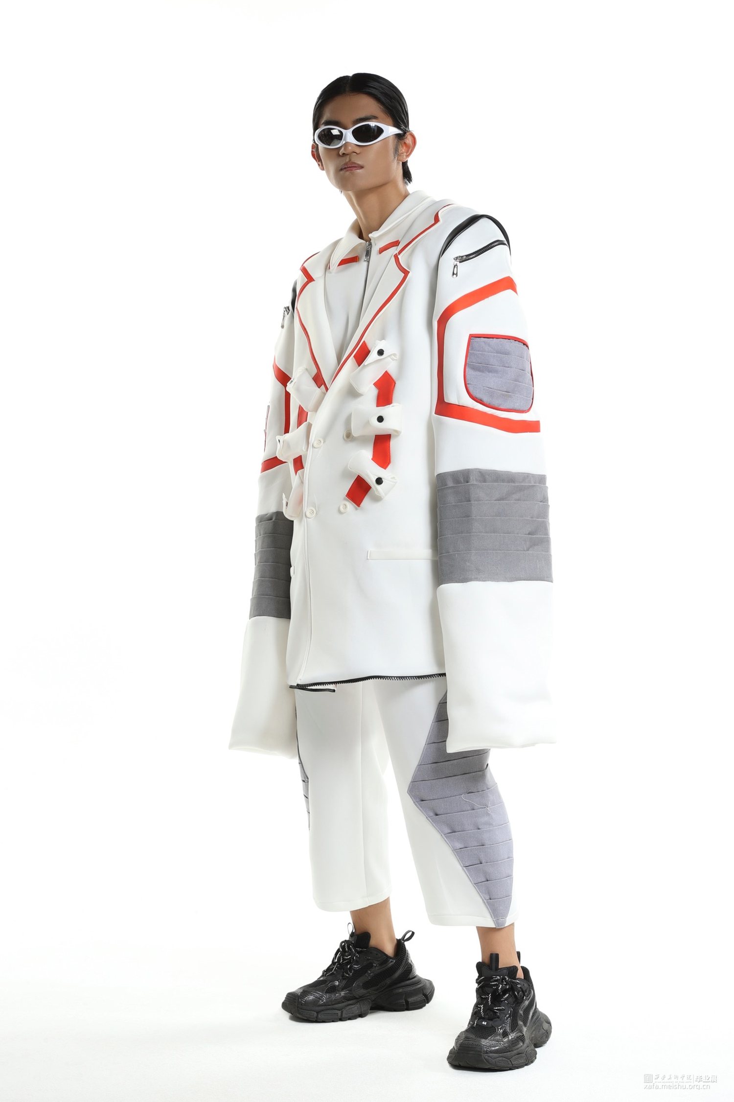 灵感来源于电影《星际穿越》中对宇宙、黑洞内部空间的大胆遐想以及宇航员身着的航天服进行的扩展延申。电影严肃庄重的氛围,将西装为基础,拆解并与太空抽象化元素以及航天服部件拆解重组,使西装的正式感多了一丝趣味性与科学氛围感,以此来表达科学与艺术所碰撞产生的美感。