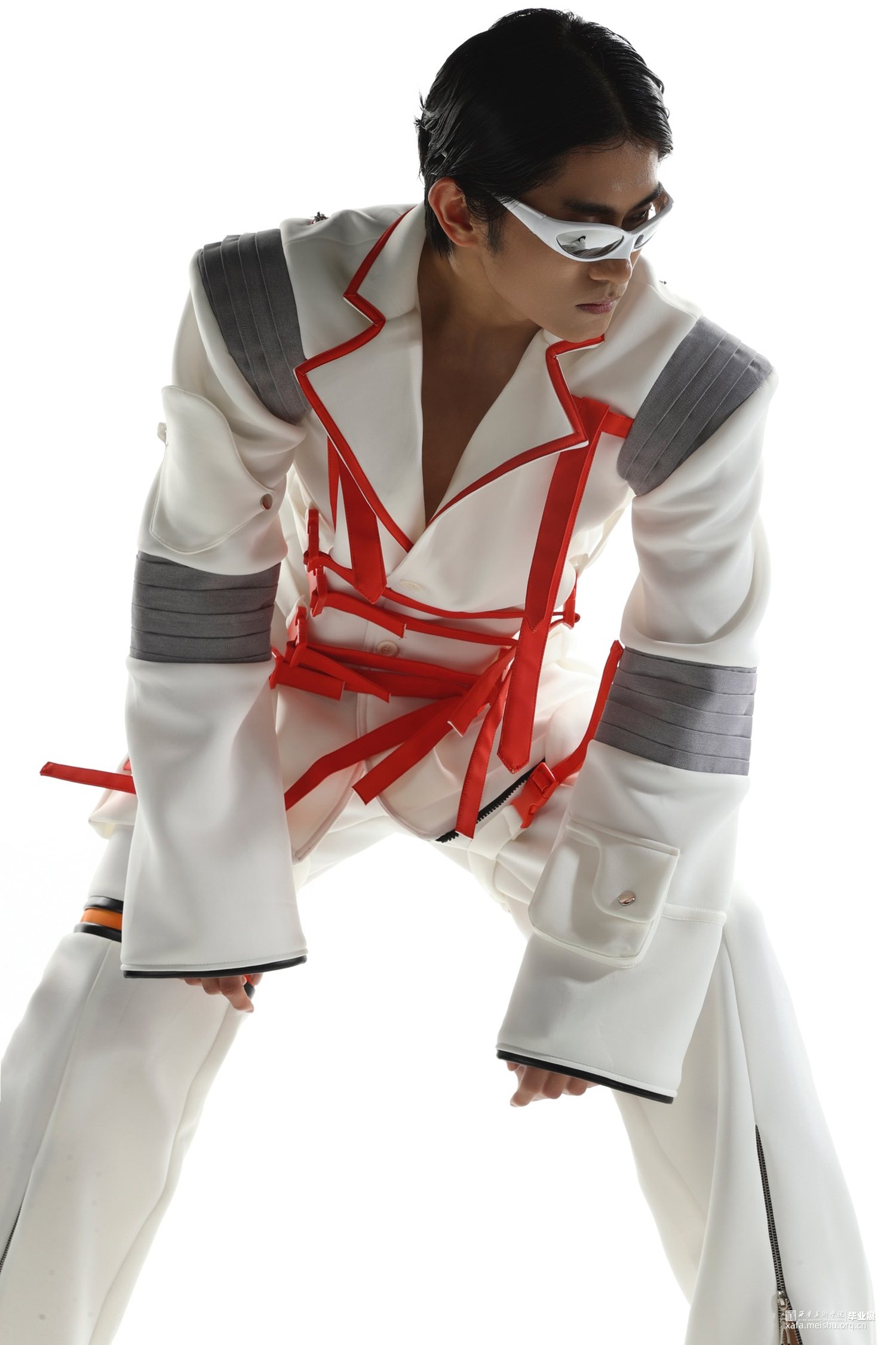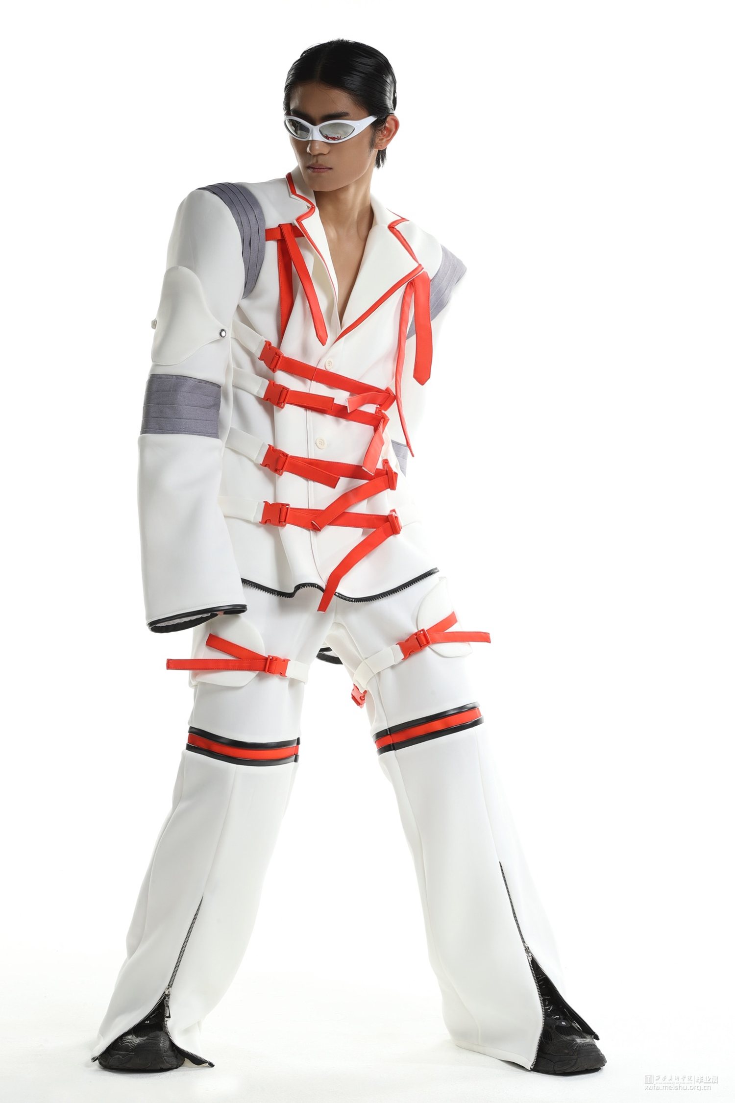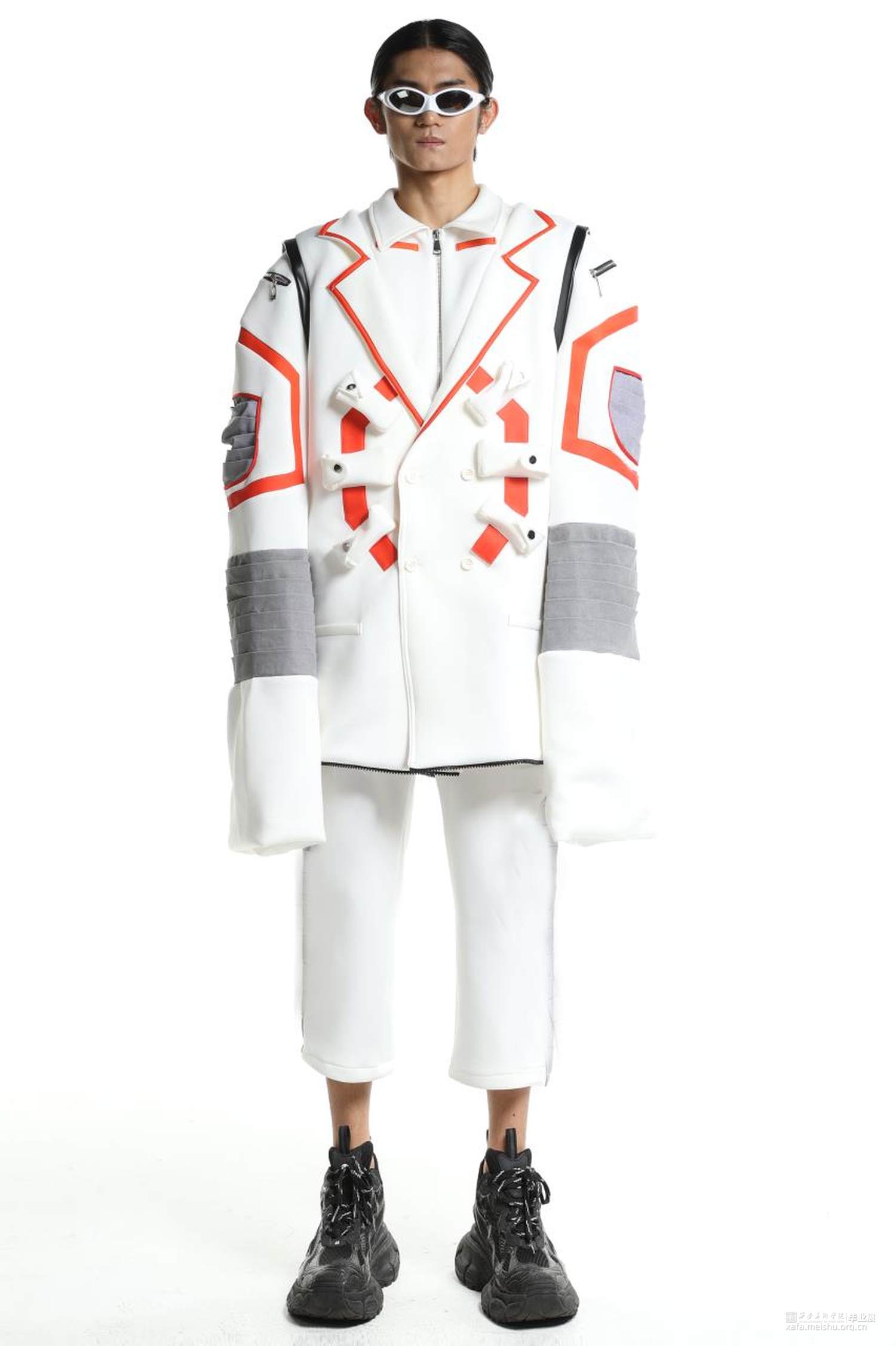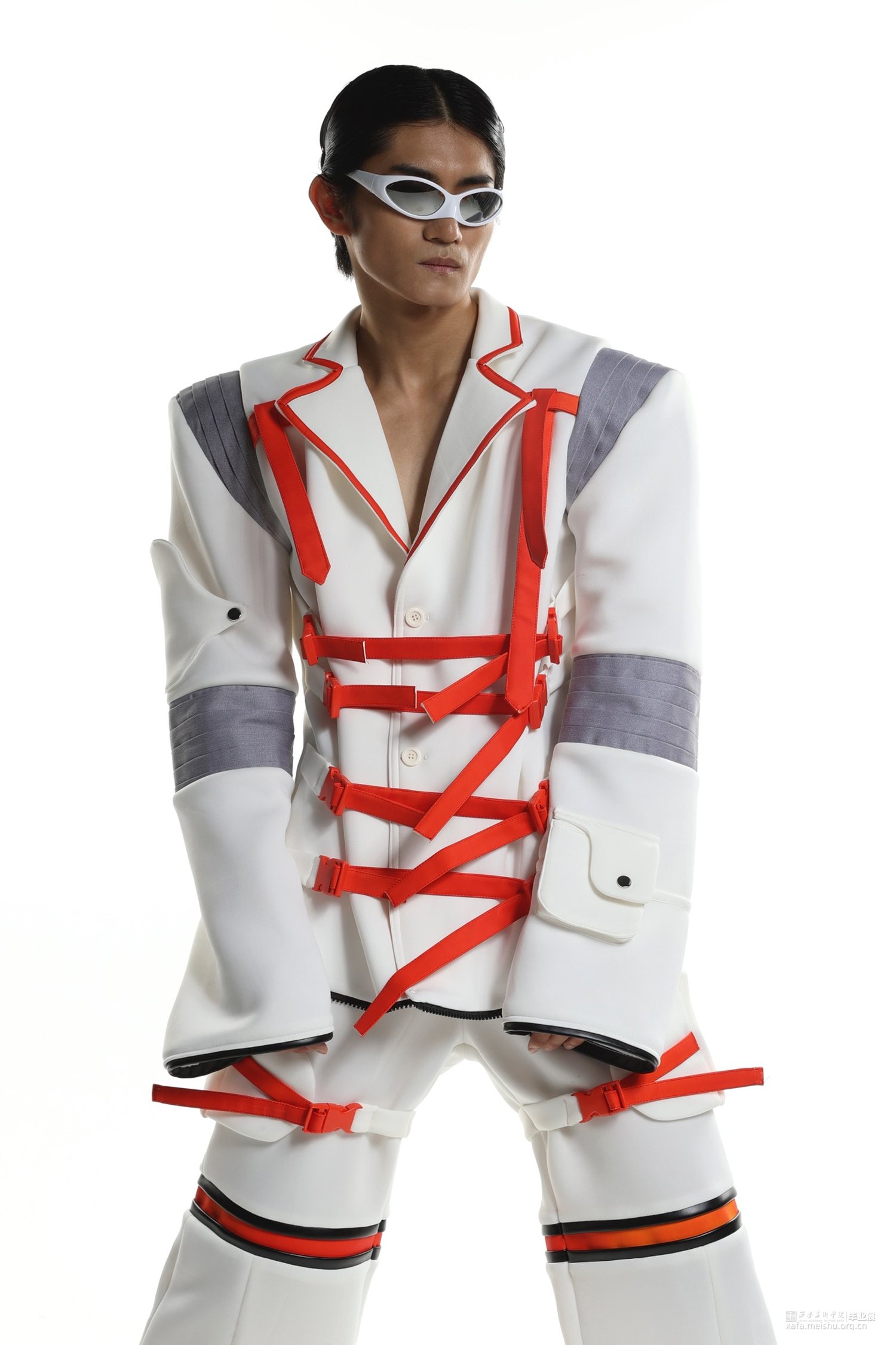 灵感来源于电影《星际穿越》中对宇宙、黑洞内部空间的大胆遐想以及宇航员身着的航天服进行的扩展延申。电影严肃庄重的氛围,将西装为基础,拆解并与太空抽象化元素以及航天服部件拆解重组,使西装的正式感多了一丝趣味性与科学氛围感,以此来表达科学与艺术所碰撞产生的美感。