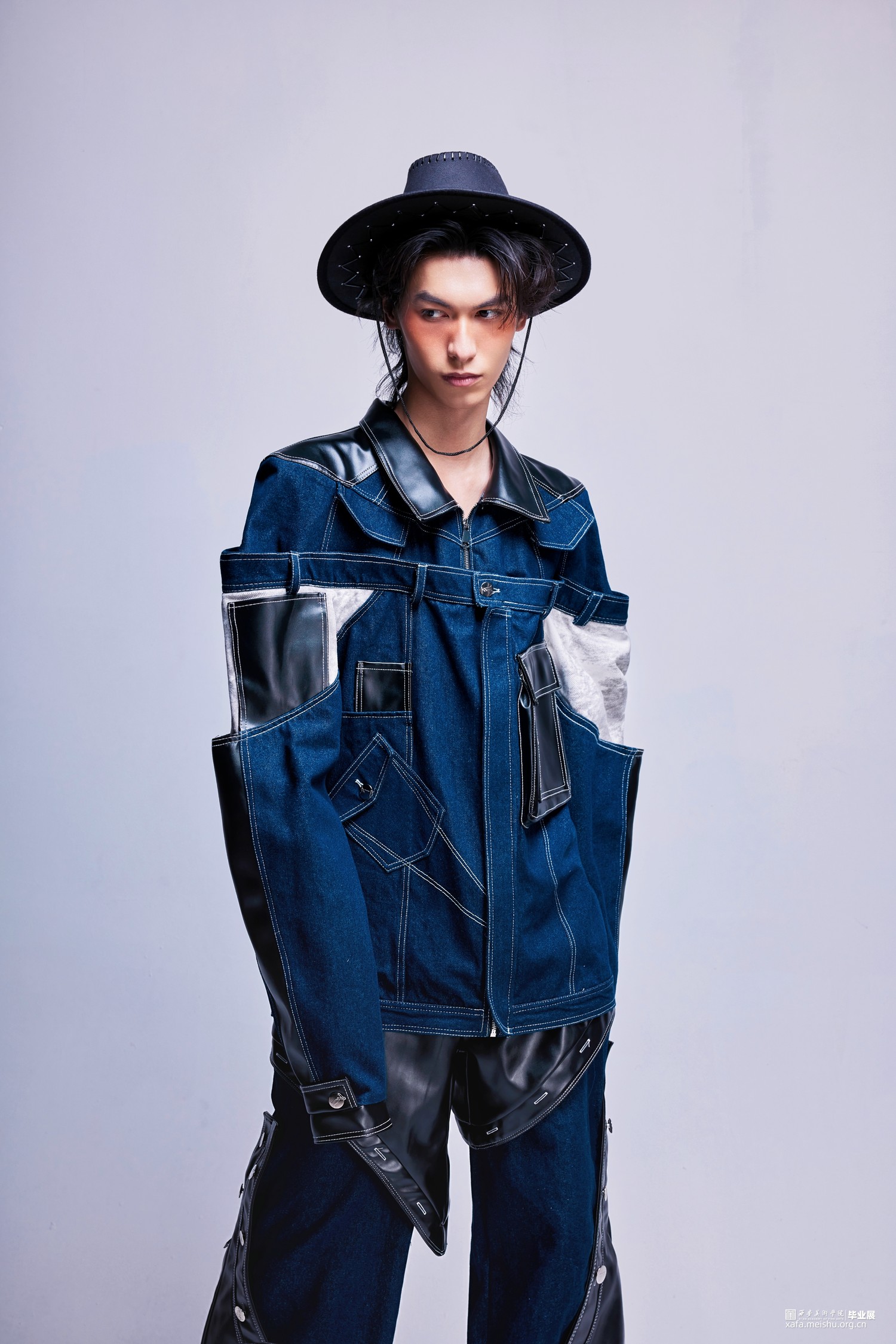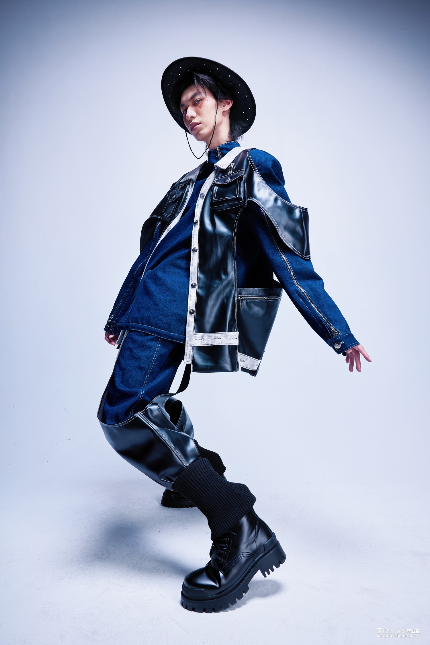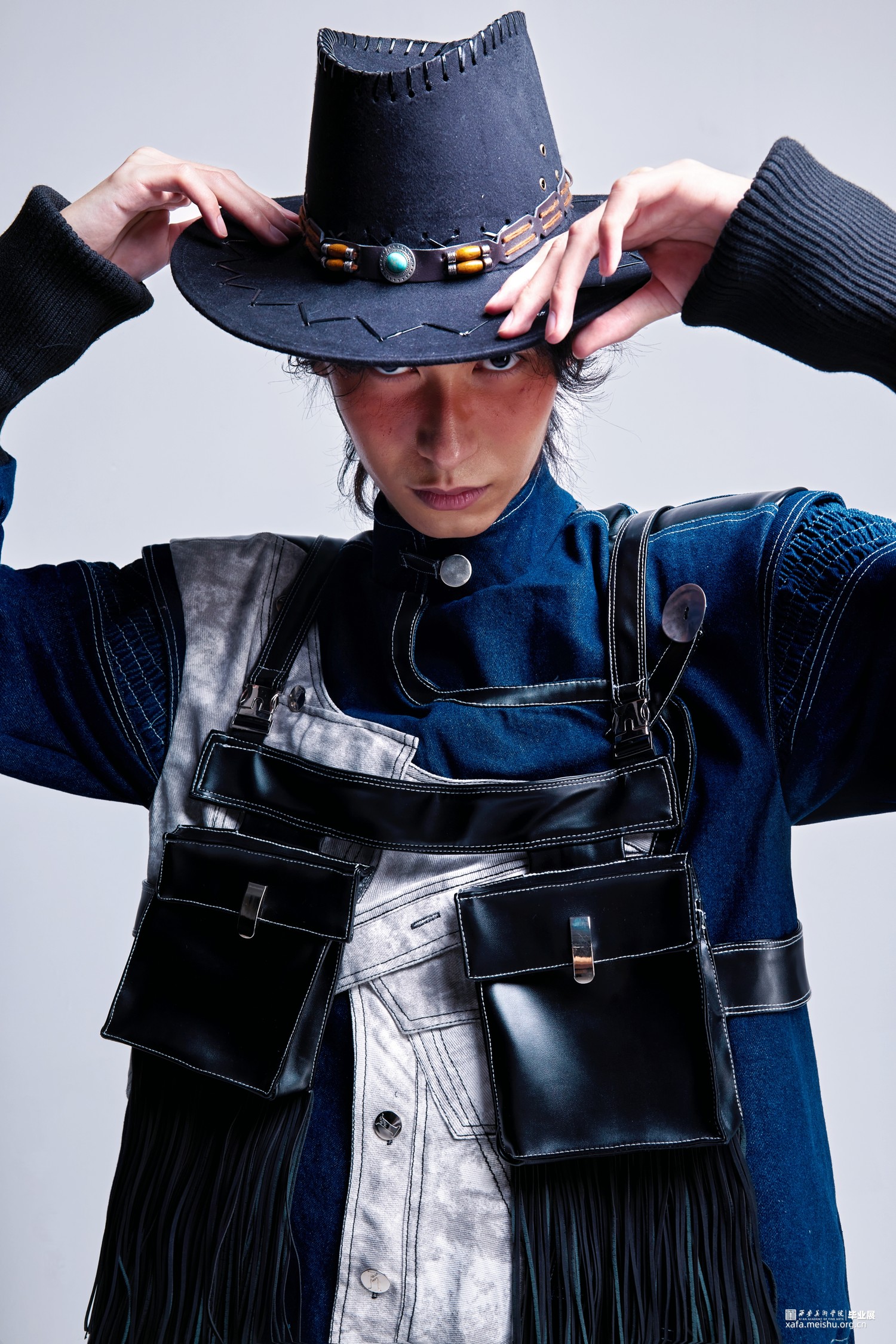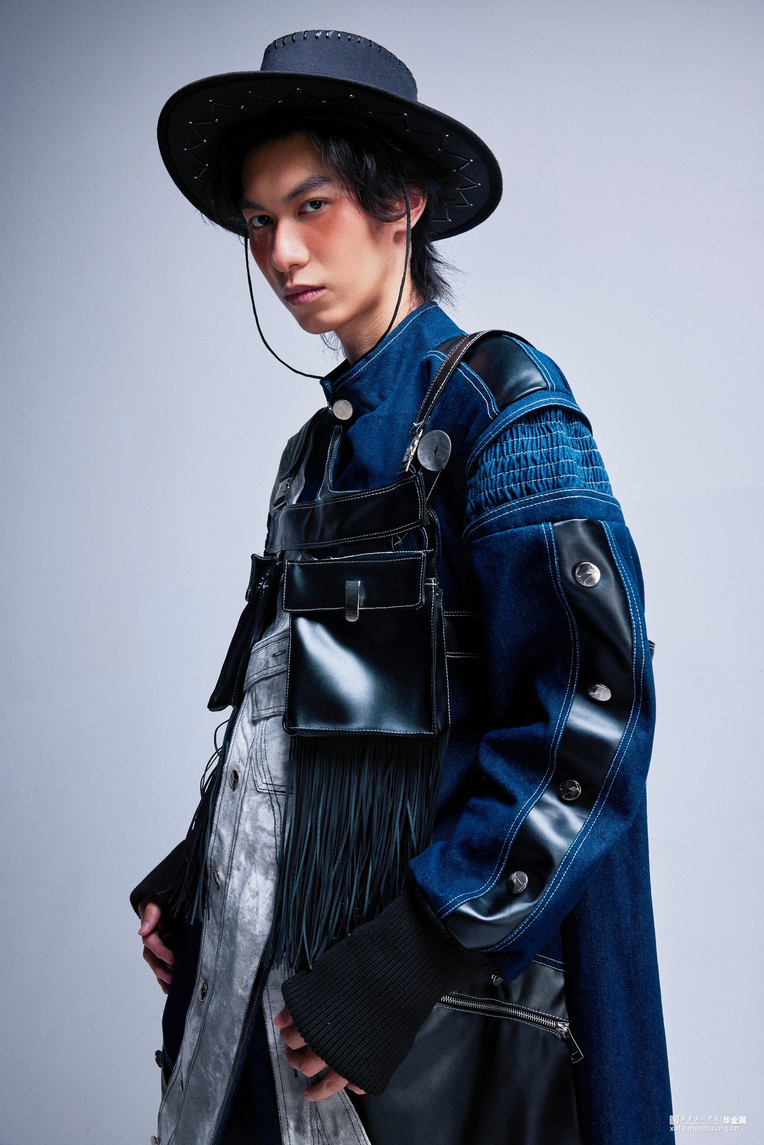 本人的毕业设计主题名为《落日骑士》,以十九世纪的西部牛仔为灵感来源,牛仔服最早来源于矿工服,由于兼具耐磨性与时尚性,被广泛推广。在创作的过程中,围绕牛仔服装展开设计,并且添加矿工服的工装风格元素,运用解构的手法来表达牛仔服装的创新设计,通过作品传达出传统的牛仔服装与解构主义相互碰撞、交流的设计理念。