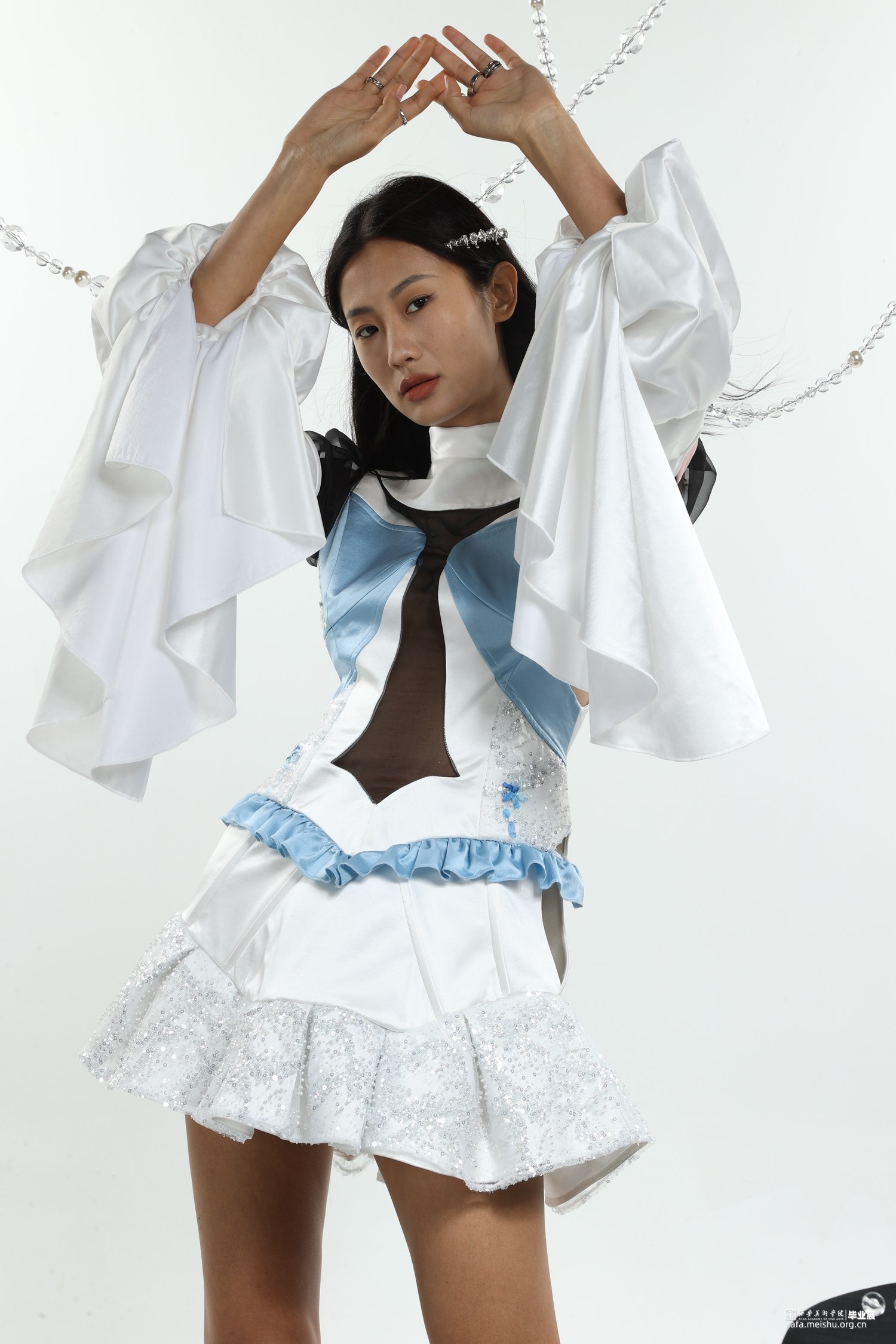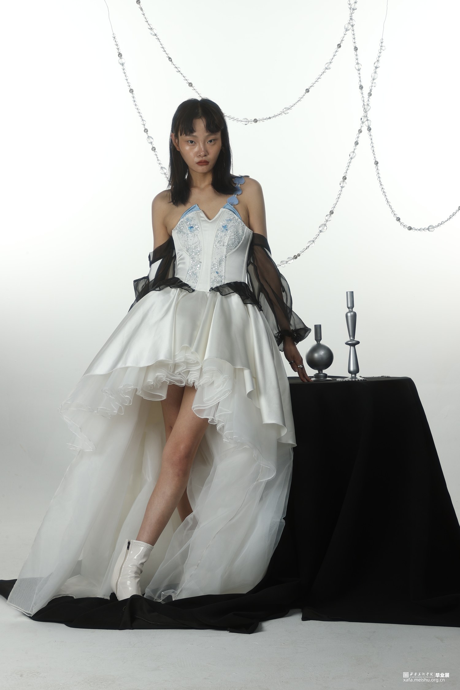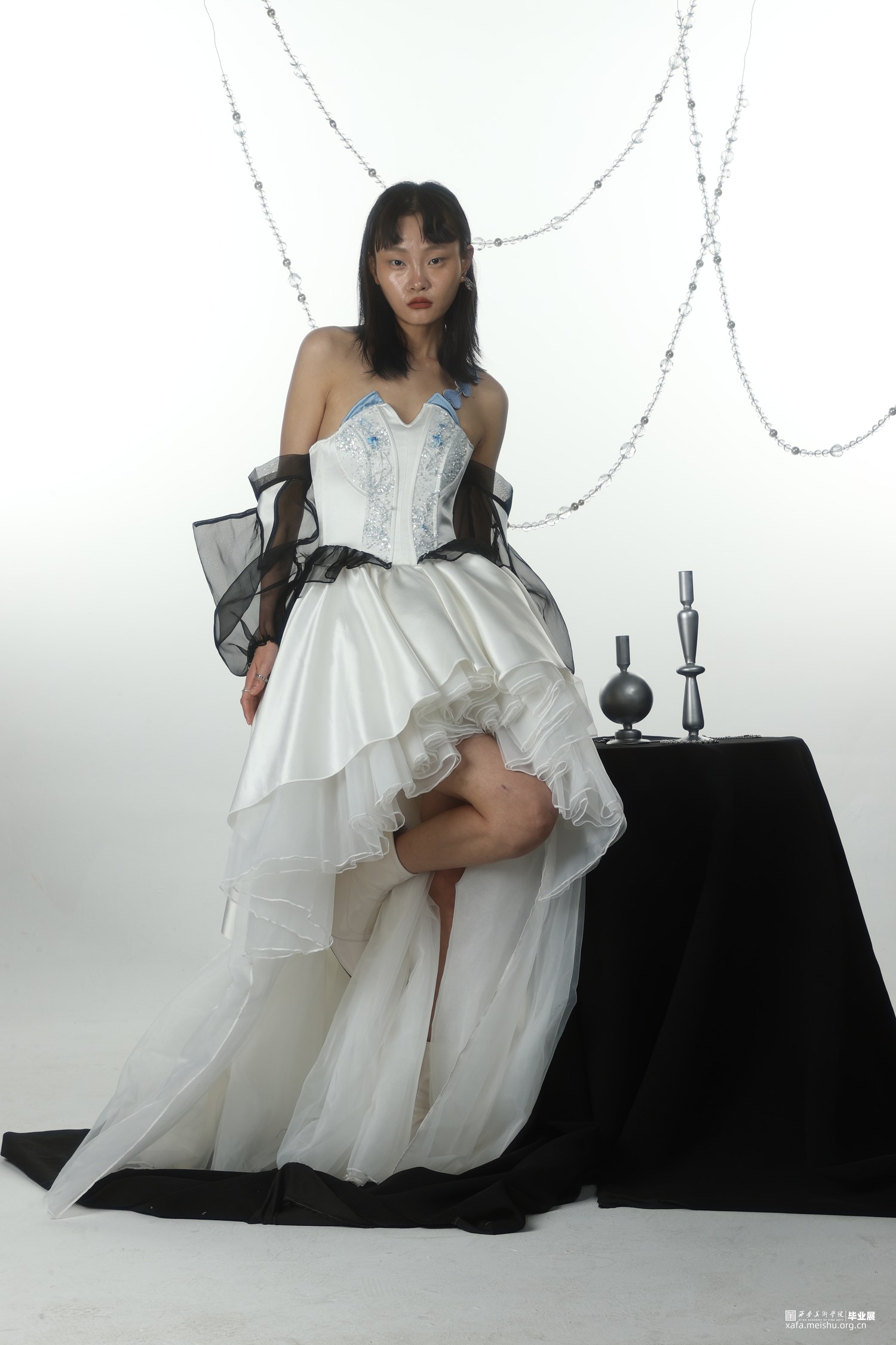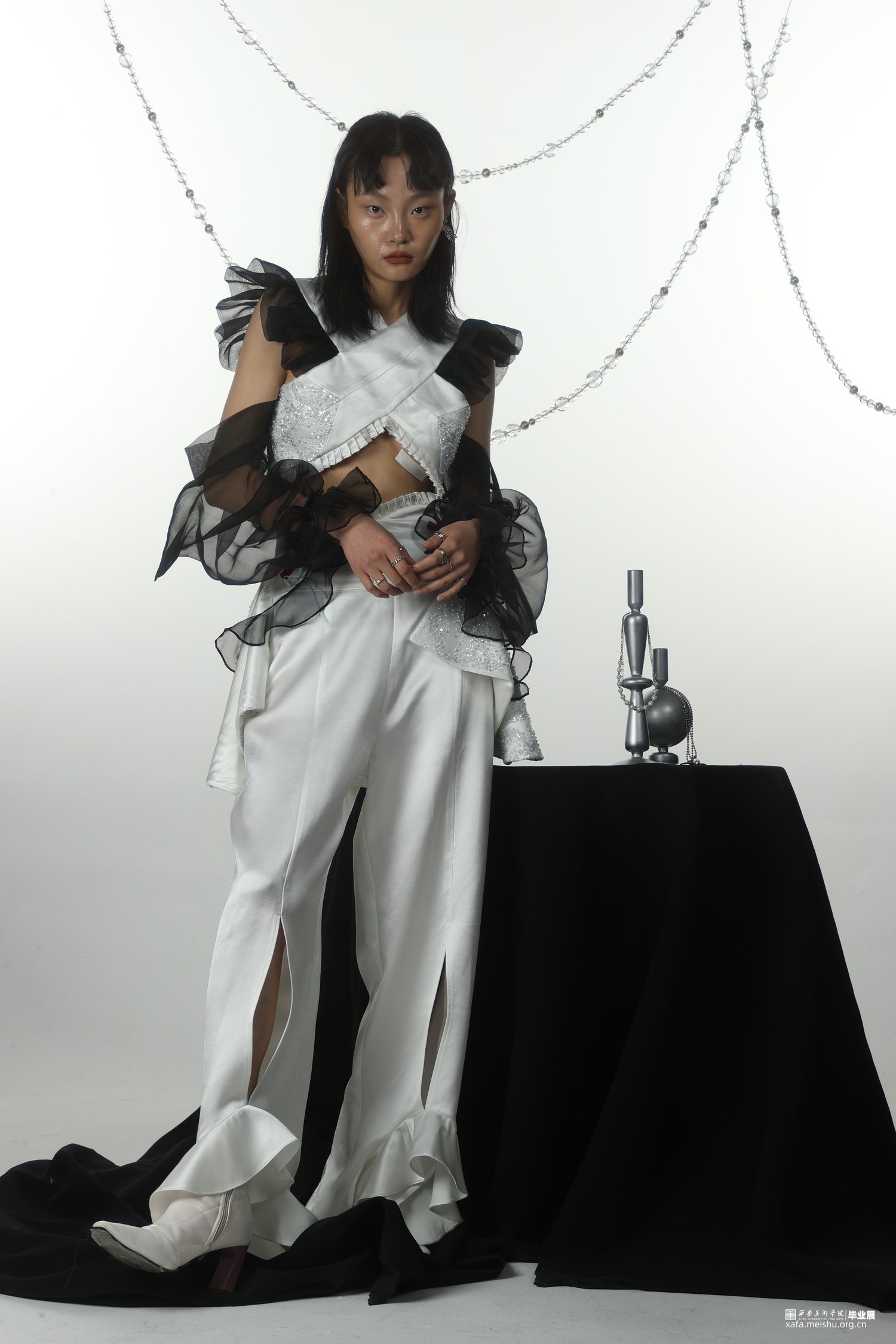 色彩设计以白色为主,配以黑色的哑光真丝纱,使整体服装既统一又富有层次感。服装廓形优雅活泼,大气夸张,质感不同的面料结合,形成视觉上的对比,使设计更加生动。