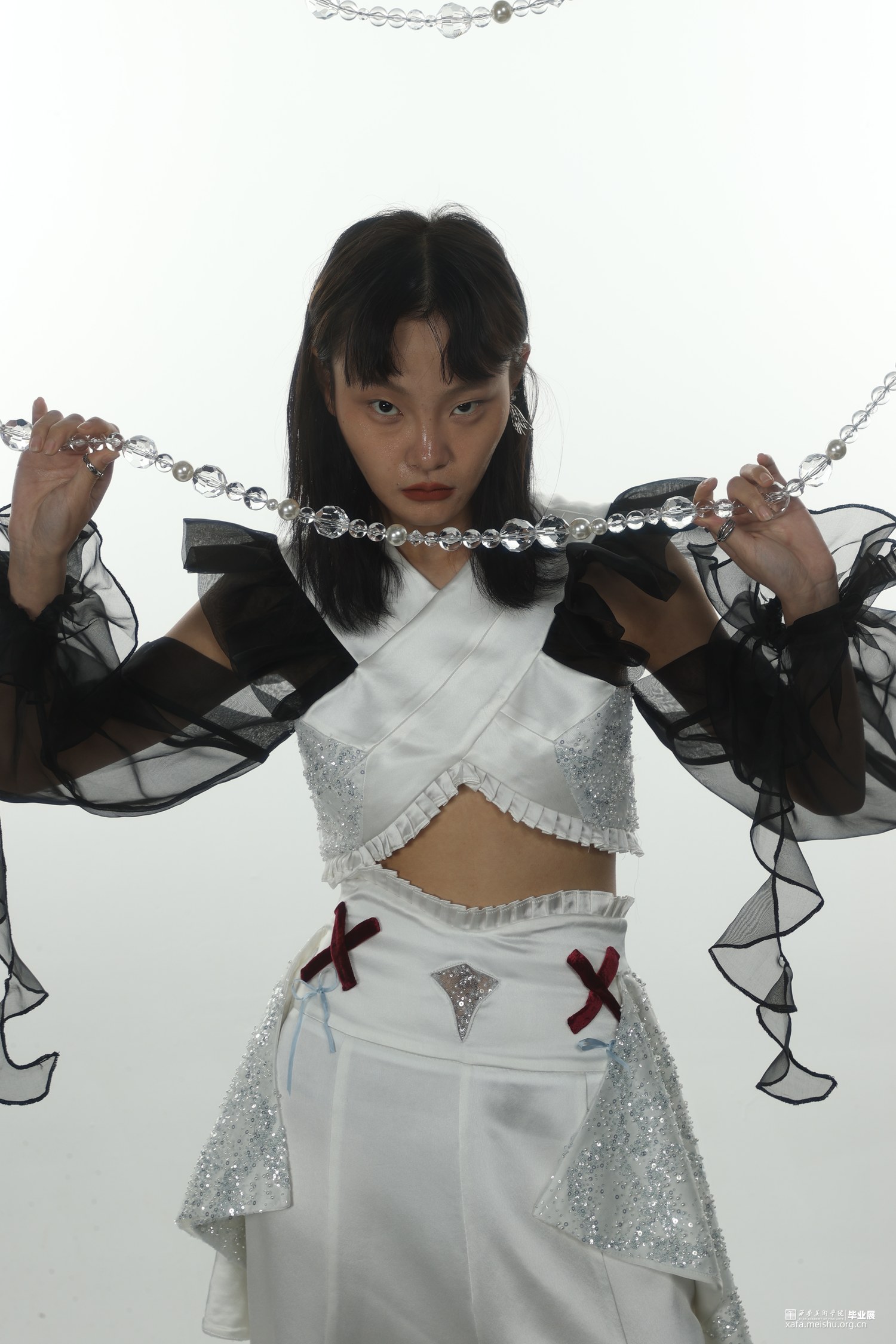 本系列主题《缪思》汲取了浪漫主义风格的艺术特点,结合童年时期所憧憬的少女英雄动漫角色,融合朋克的个性和芭蕾的优雅,将浪漫主义的形式美理念与装饰手法融入服饰设计中,展现了女性的柔美,个性和独立。精湛的工艺和极具美感的曲线,增强了服装的动感,也带给人们强烈的视觉冲击。通过艺术夸张手法,形成了样式简洁、造型美观的服装廓形,强调服装的个性表达。