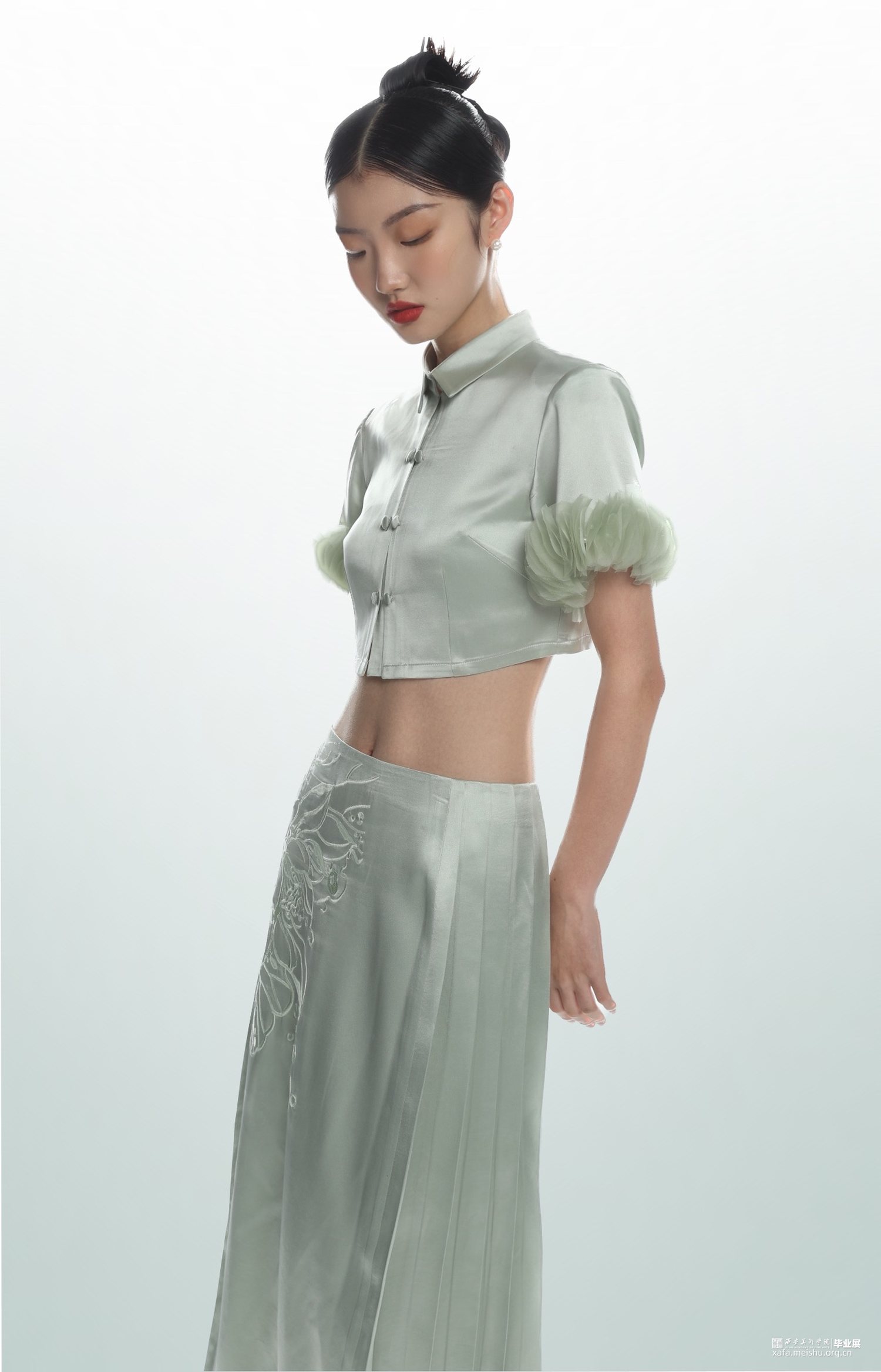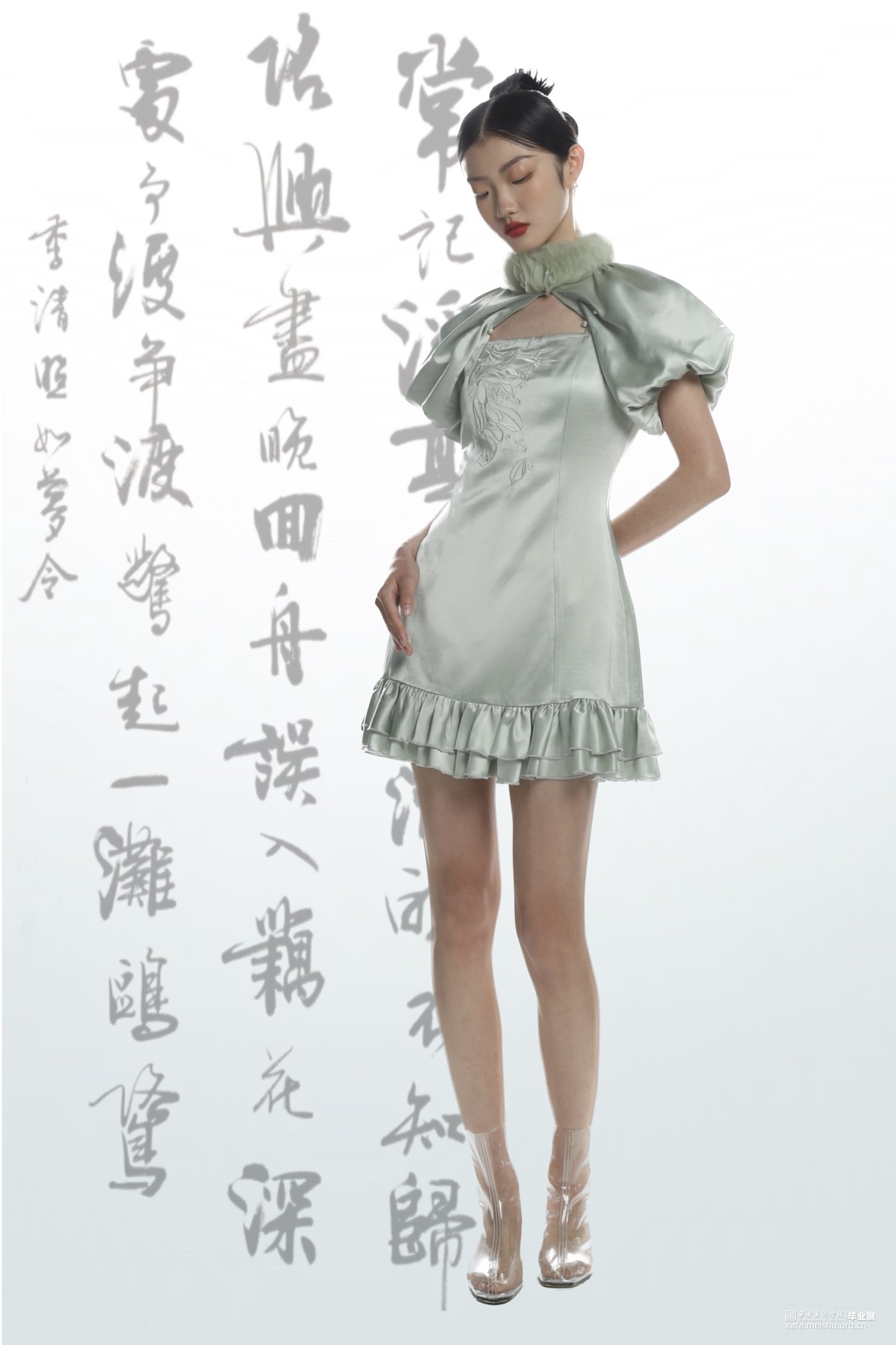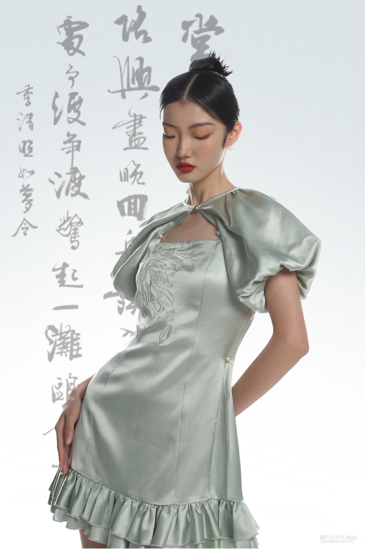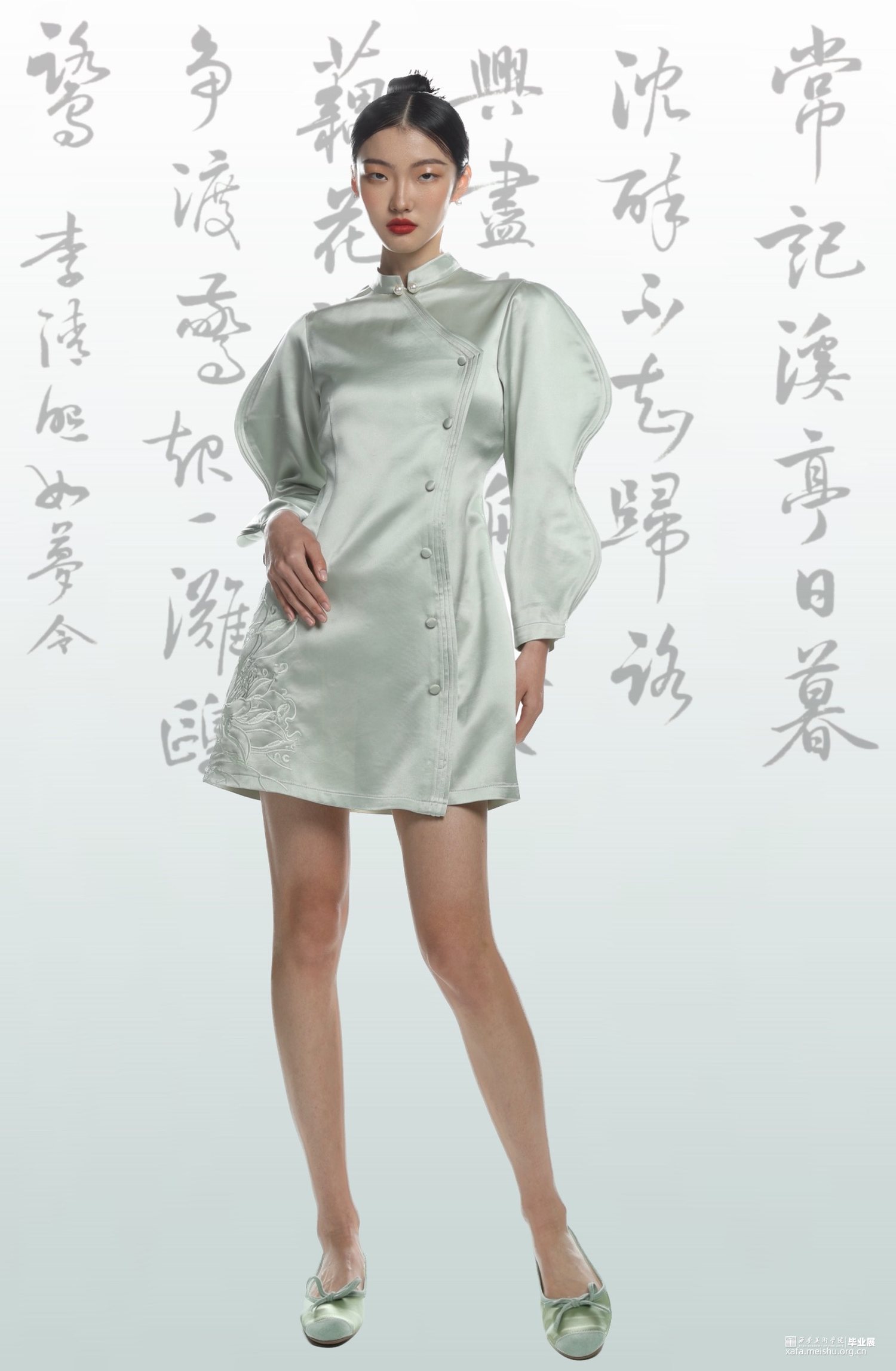 本次设计的系列主题是《如梦令》这是宋代李清照早期的一首作品,描绘了一个十几岁的少女划船外出游玩的故事。本次围绕“新中式少女”的感觉展开设计,服装运用了宋制汉服元素以及一些中式纹样,面料上采用了具有丝绸质感的醋酸面料,运用传统的刺绣工艺进行纹样表达。在色彩上以青绿色作为主色调,能够体现出设计想表现的“少女”主题,灵动、活泼且叛逆。在我的心里早期未经世事的李清照就像这个颜色一样,轻盈、明媚、透亮。