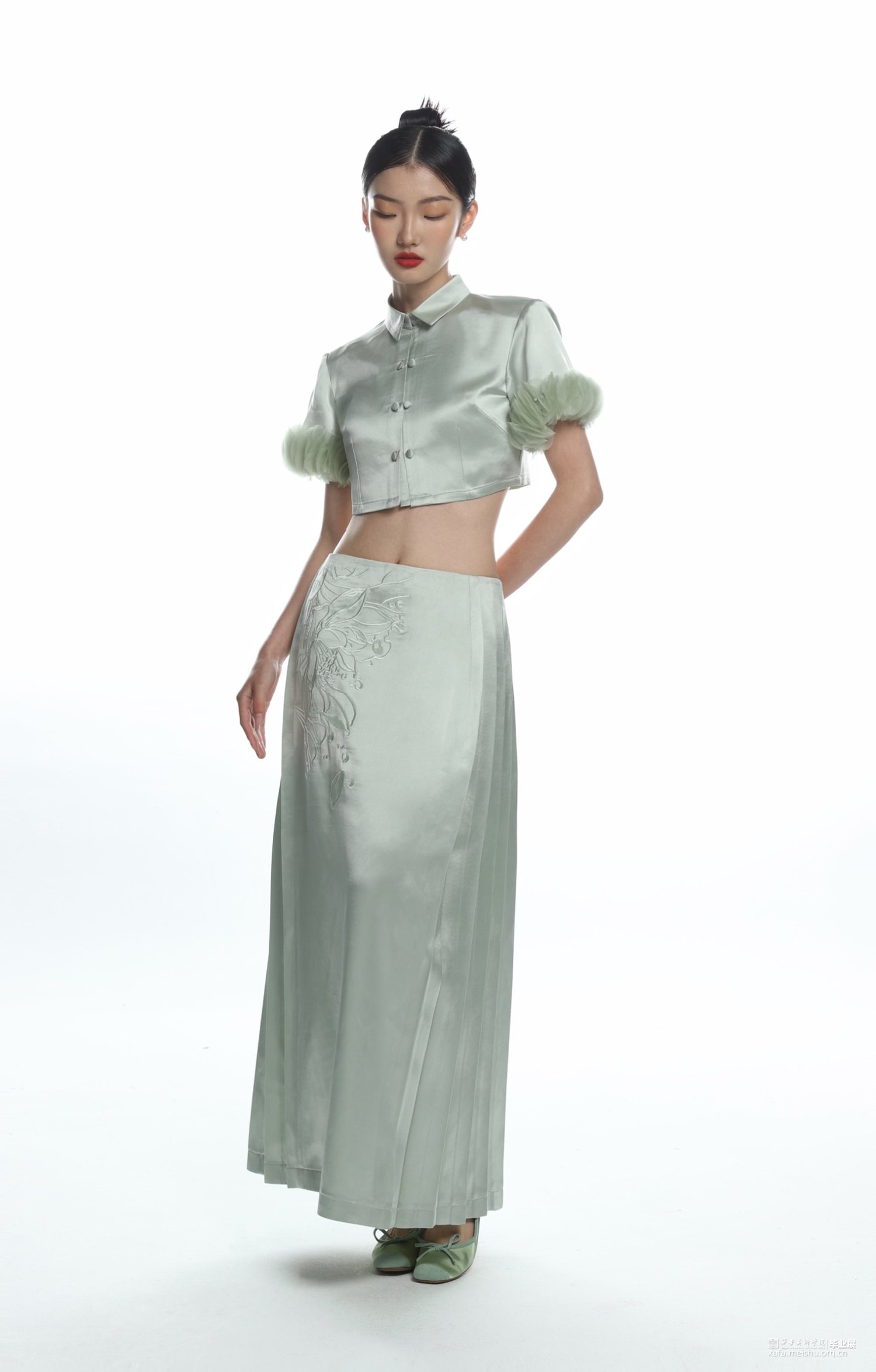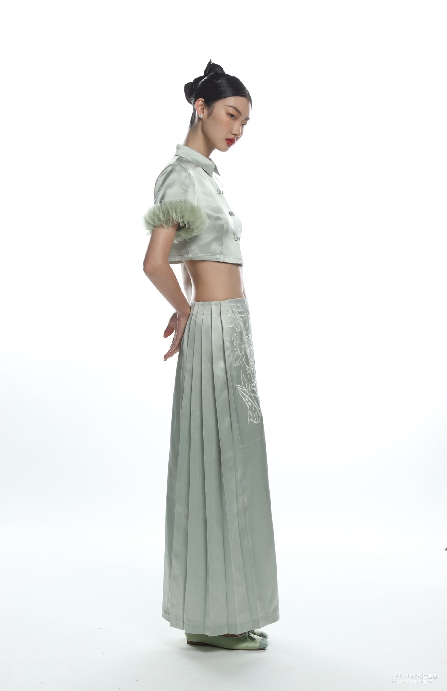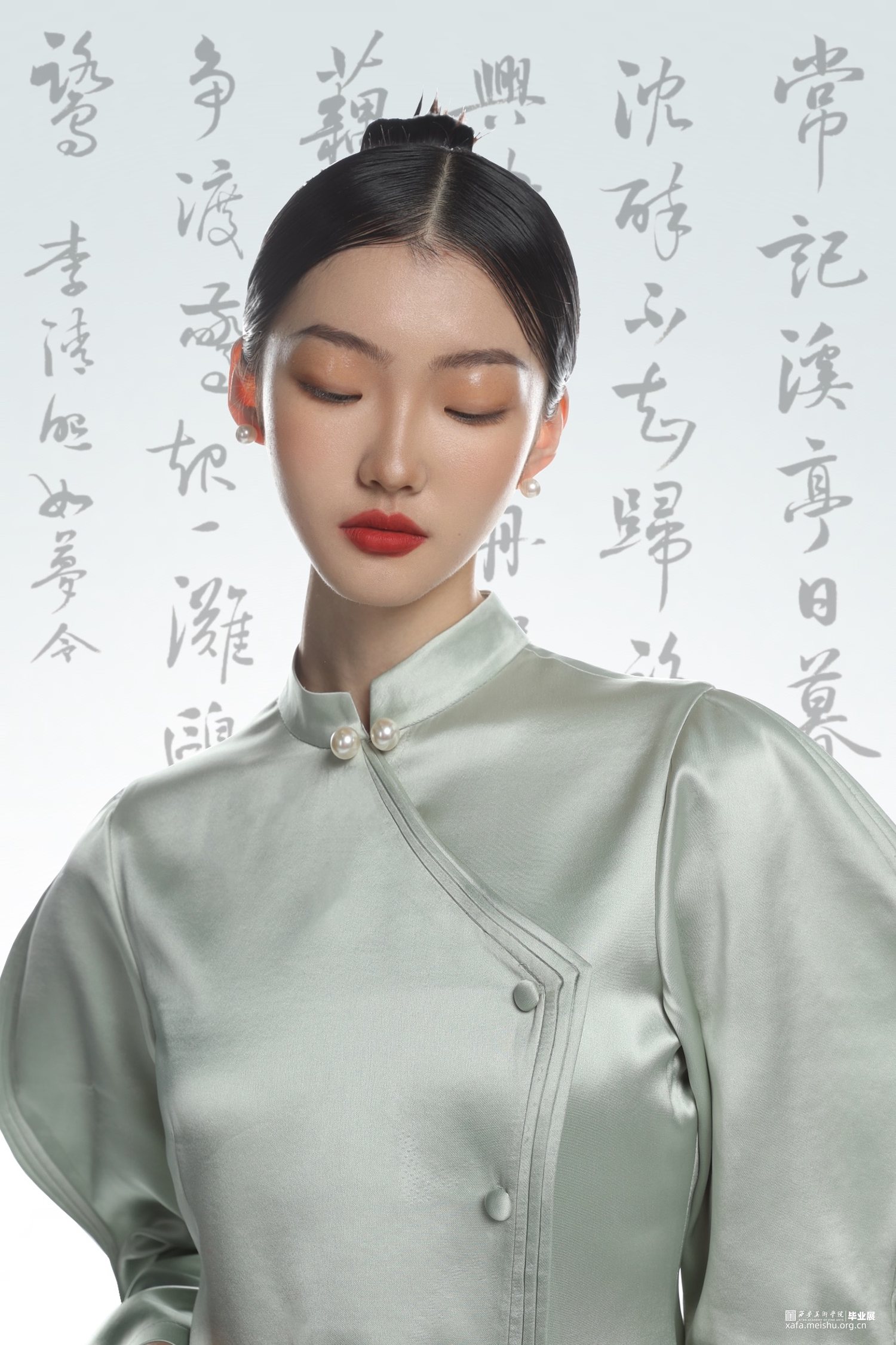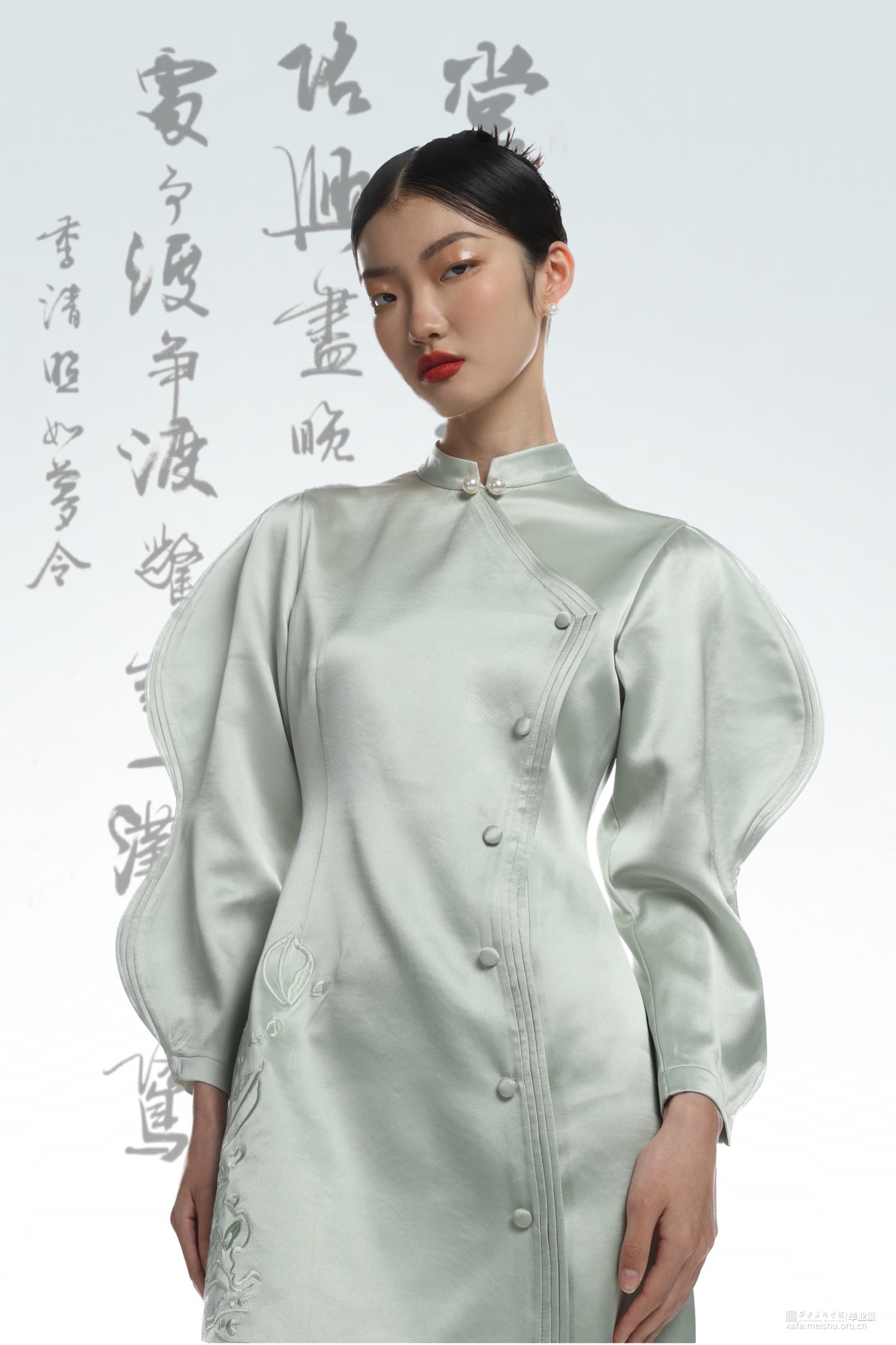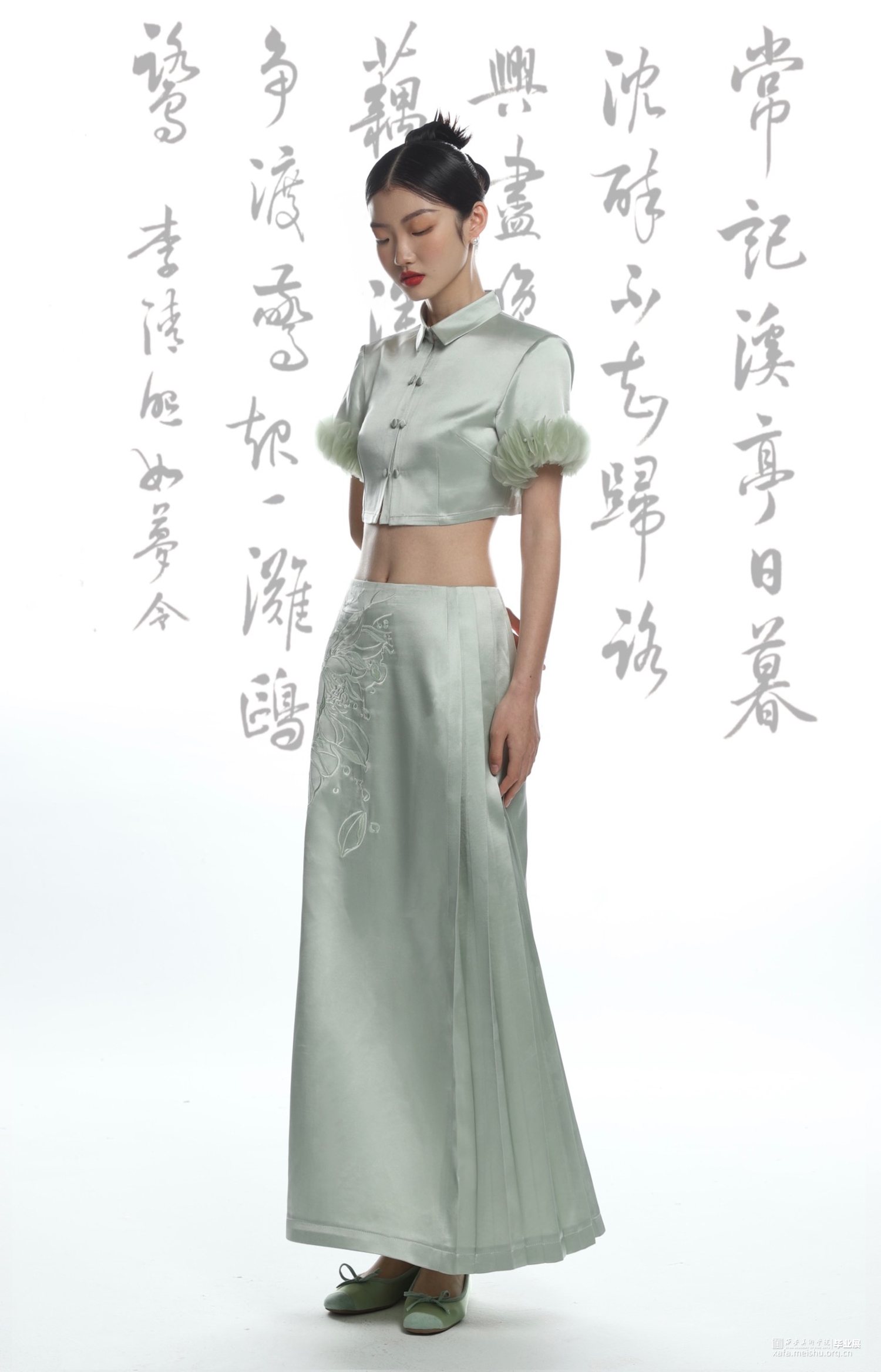 本次设计的系列主题是《如梦令》这是宋代李清照早期的一首作品,描绘了一个十几岁的少女划船外出游玩的故事。本次围绕“新中式少女”的感觉展开设计,服装运用了宋制汉服元素以及一些中式纹样,面料上采用了具有丝绸质感的醋酸面料,运用传统的刺绣工艺进行纹样表达。在色彩上以青绿色作为主色调,能够体现出设计想表现的“少女”主题,灵动、活泼且叛逆。在我的心里早期未经世事的李清照就像这个颜色一样,轻盈、明媚、透亮。