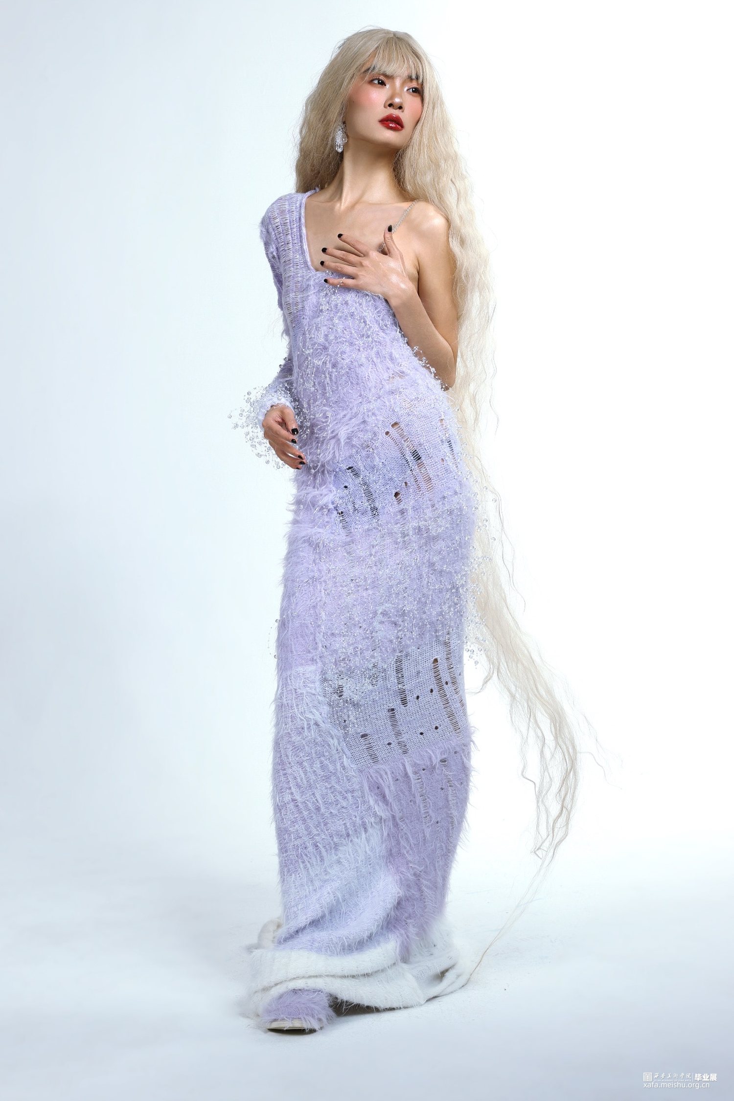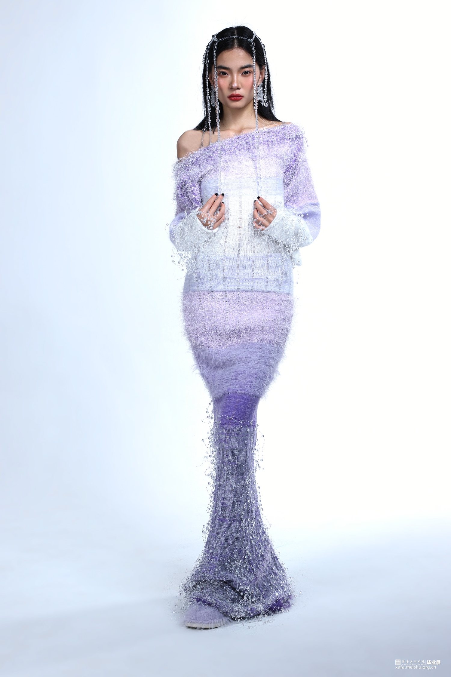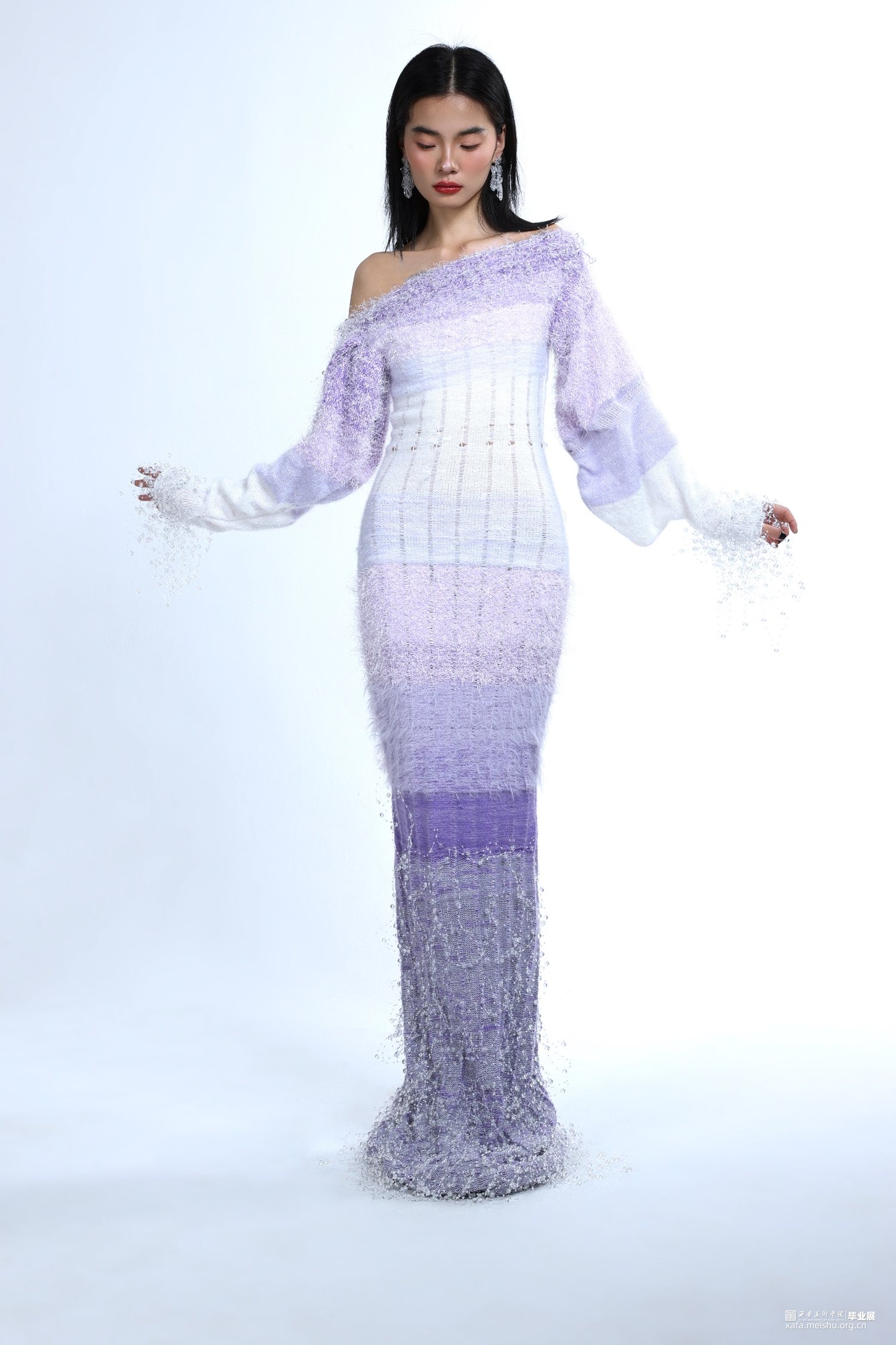 该作品灵感来源于针织材料与现代礼服的结合,以古希腊神话人物塞勒涅为主人公,为其设计的一系列服装,从传统的礼服文化中深入,结合针织材料,通过在手摇横机上针织的实践以及开发针织小样等方法,重点剖析针织材料与礼服的款式设计、配色、针织材料的组织设计等之间的实验与融合,以及运用手摇横机制作的具体工艺和组织设计,突显出塞勒涅月神的高贵形象。