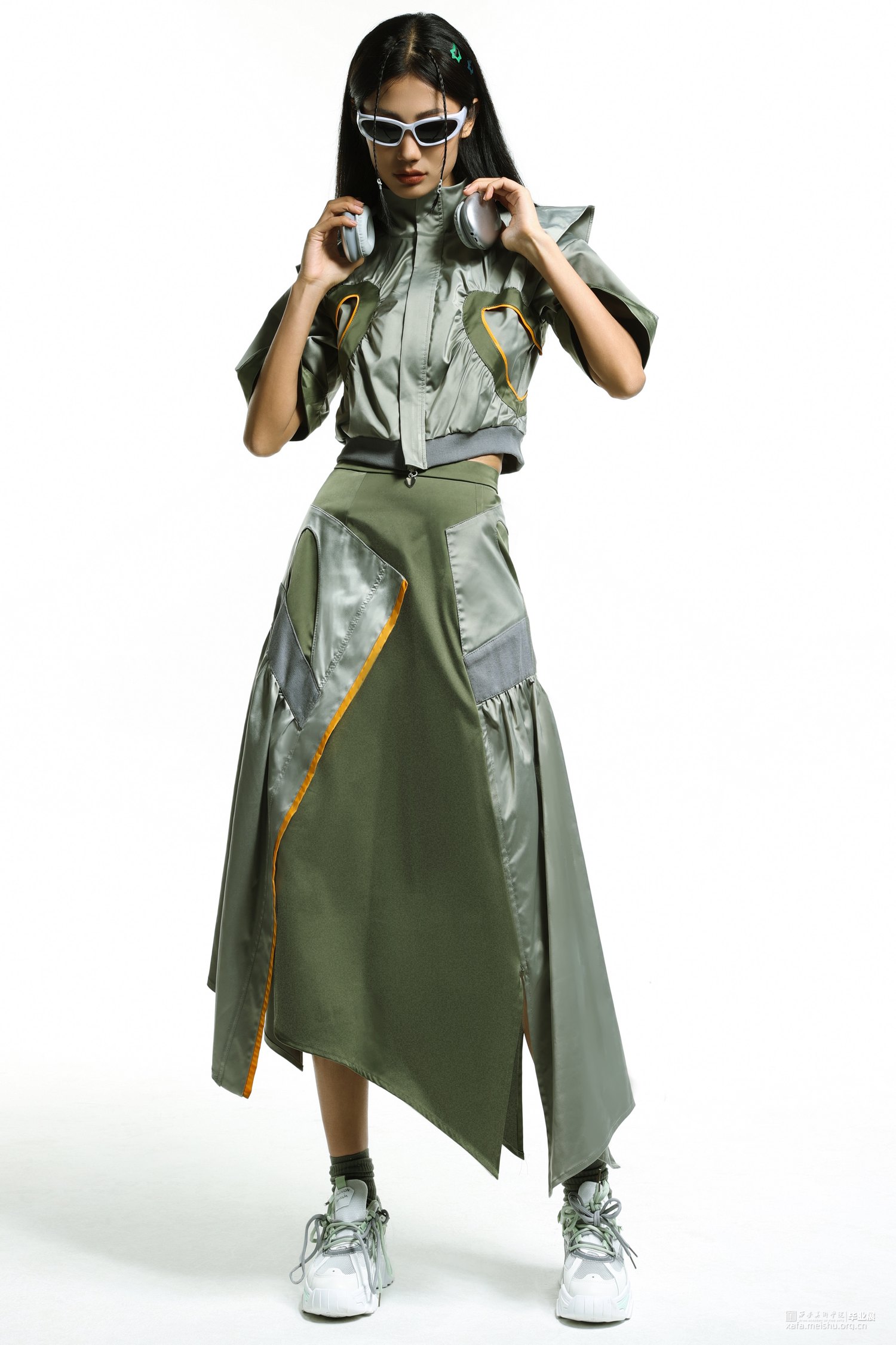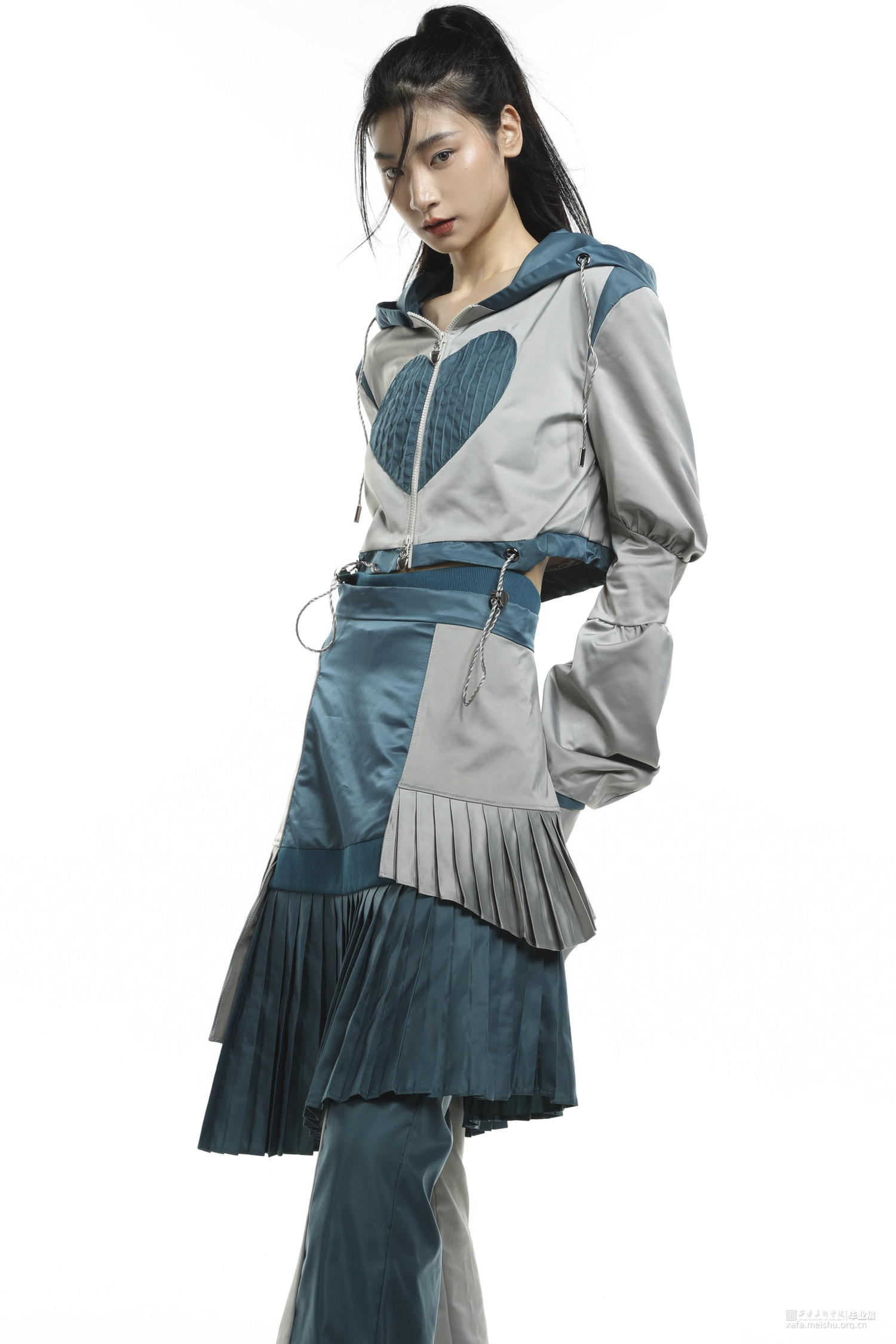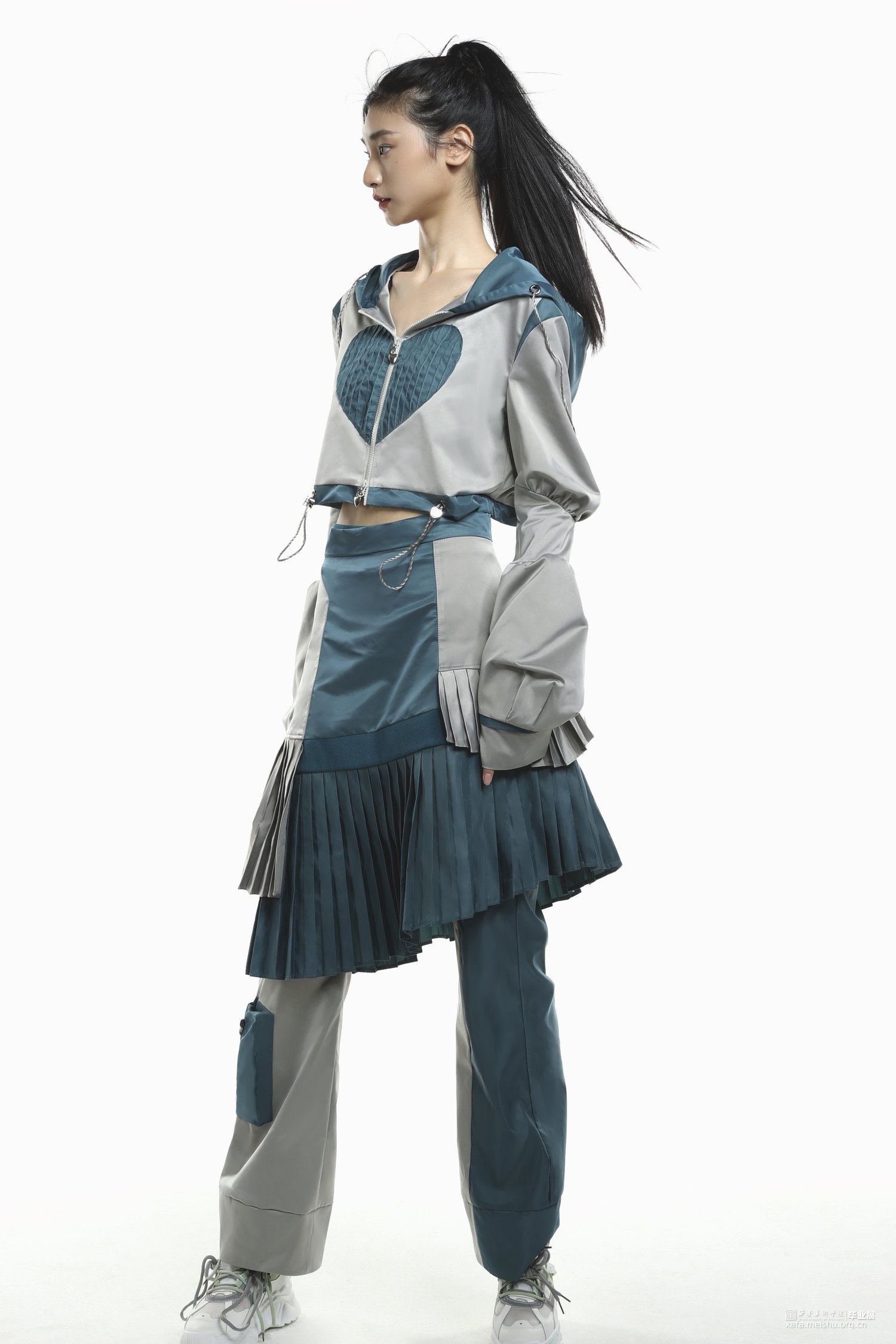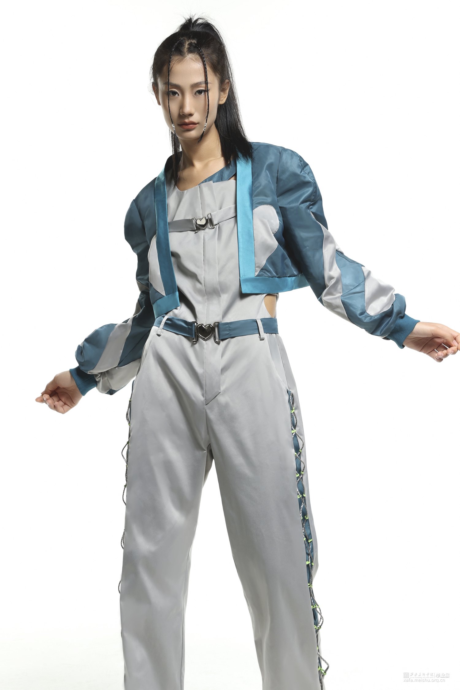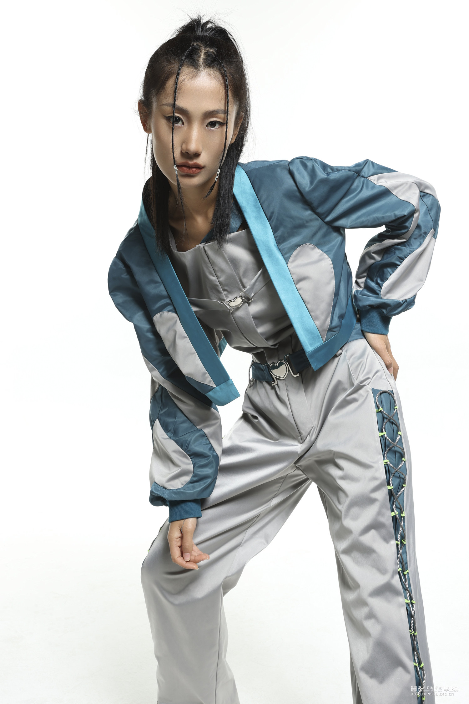 将“Y2K”风格的心形元素和拼贴的手法,及提取高腰,上短下长的千禧辣妹穿搭等款式,和休闲运动服的基本款式进行毕业创作的设计元素,融入到时尚休闲运动装上,再运用拼接的手法和丰富的色彩面料,实现现代运动机能感和千禧年代服装风格的融合创新。