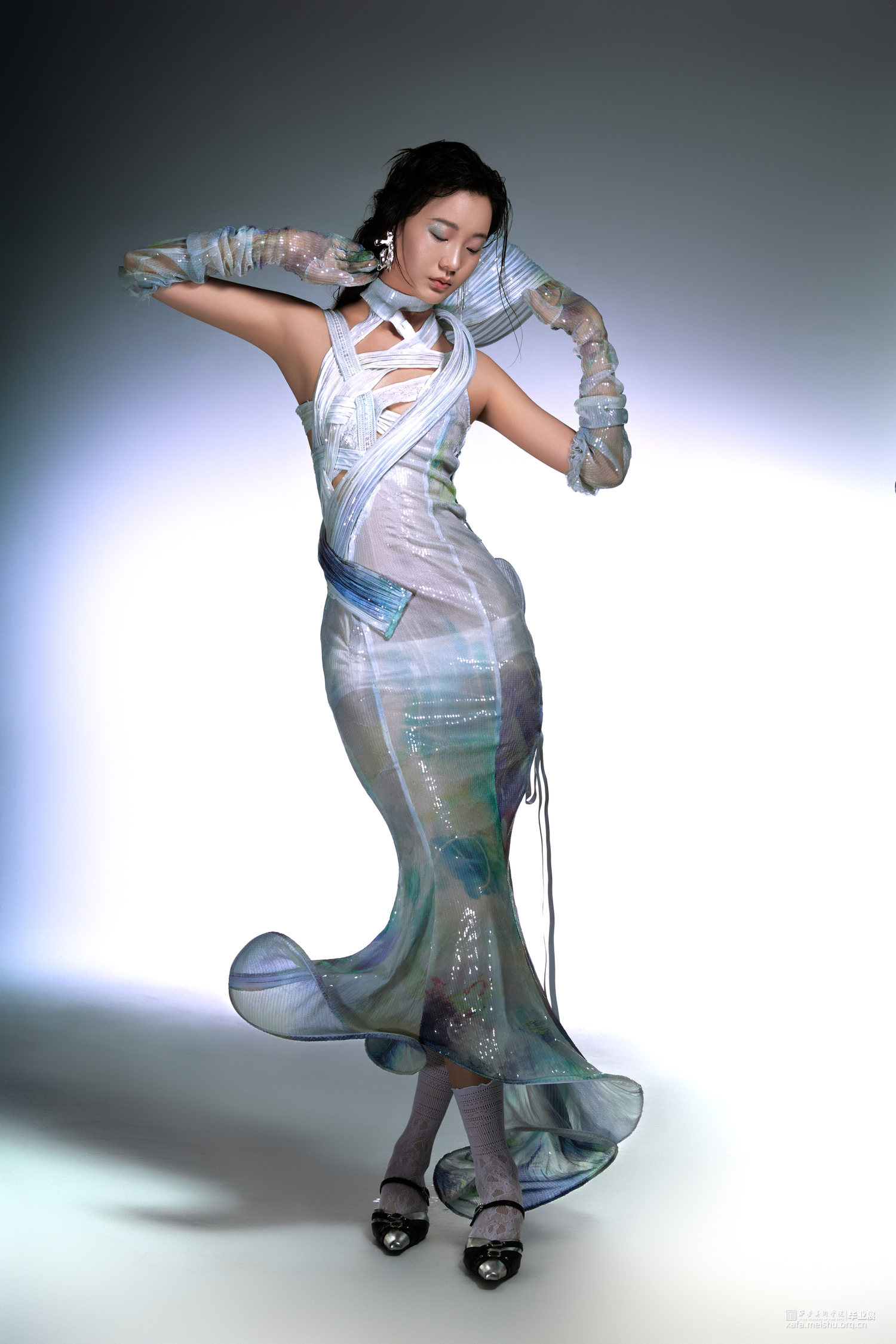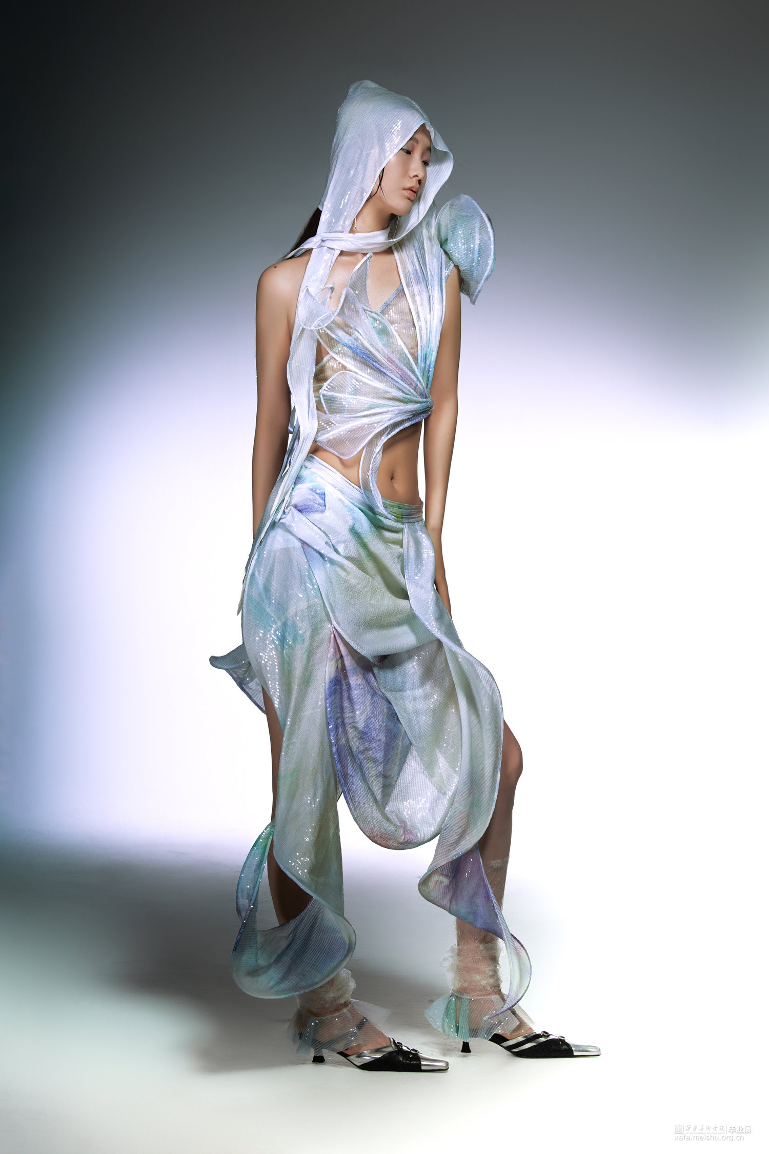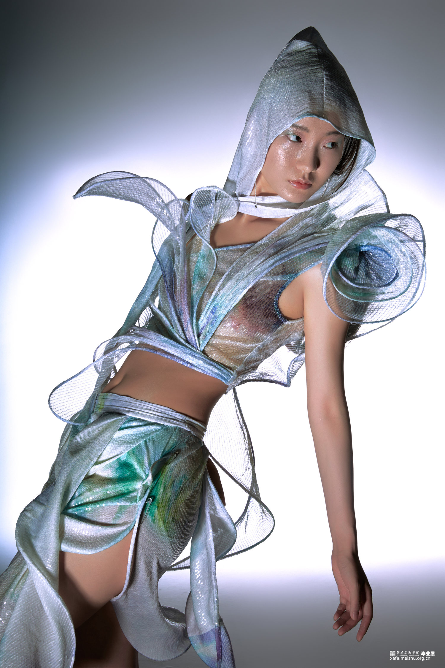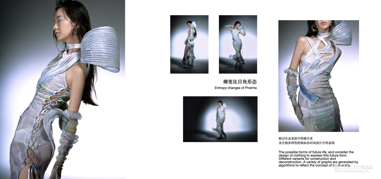 《Neo Entropy熵元境变奏》旨在探索生态系统熵的变化,象征着新生物文明的涌现。灵感源于2023年日本核污水事件,当科技逻辑与生态逻辑的交互影响,特别是对海洋生态系统的影响,生态系统的熵值会发生怎样的变化,以及这种变化如何转化为服装语言的有序性和无序性,来表达生物拟态的服装设计。