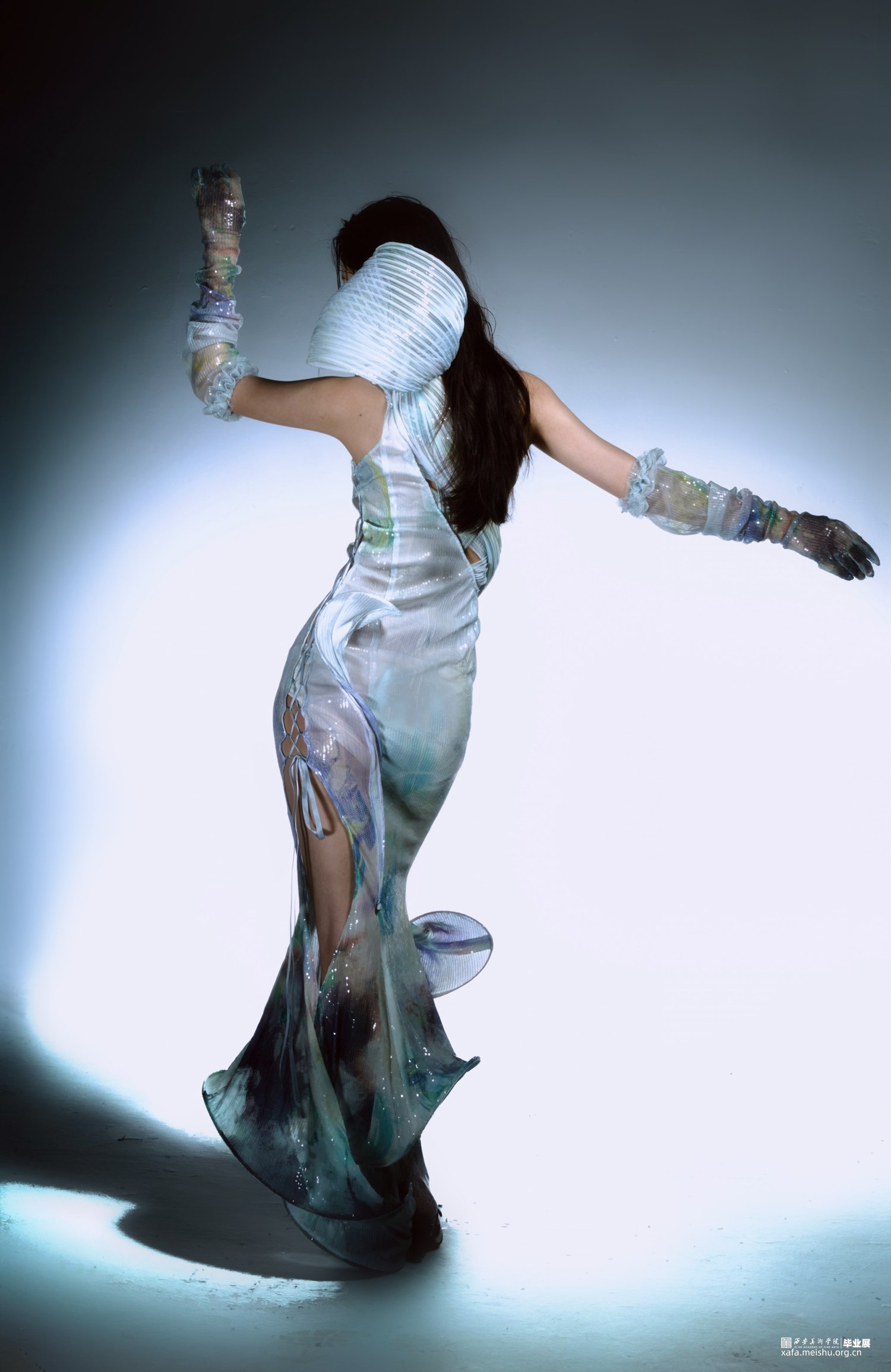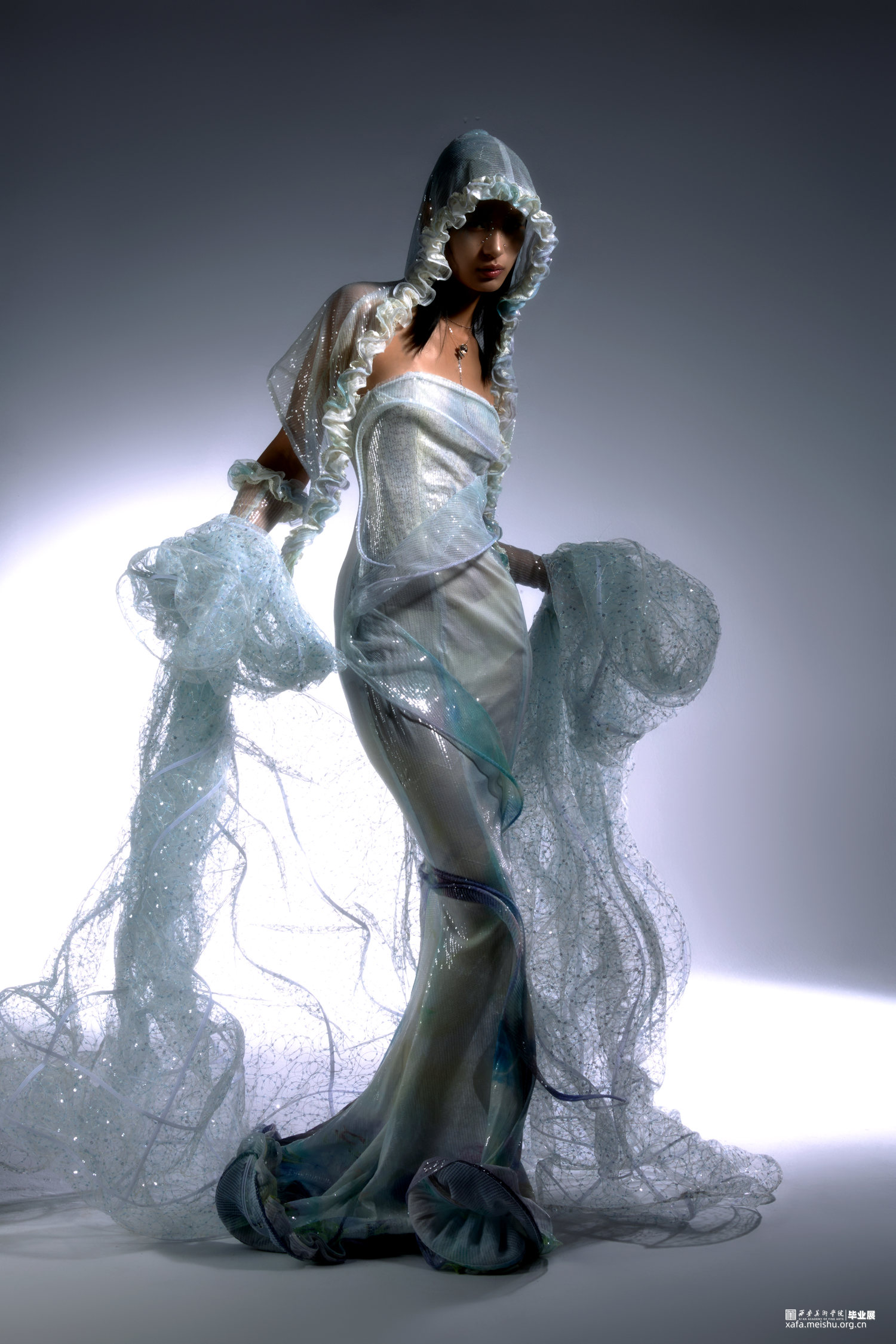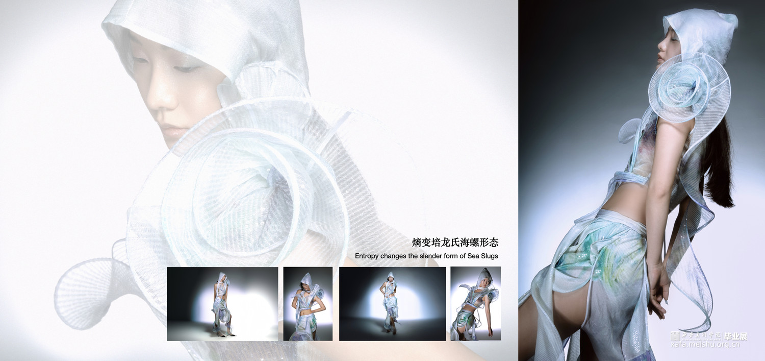 《Neo Entropy熵元境变奏》旨在探索生态系统熵的变化,象征着新生物文明的涌现。灵感源于2023年日本核污水事件,当科技逻辑与生态逻辑的交互影响,特别是对海洋生态系统的影响,生态系统的熵值会发生怎样的变化,以及这种变化如何转化为服装语言的有序性和无序性,来表达生物拟态的服装设计。