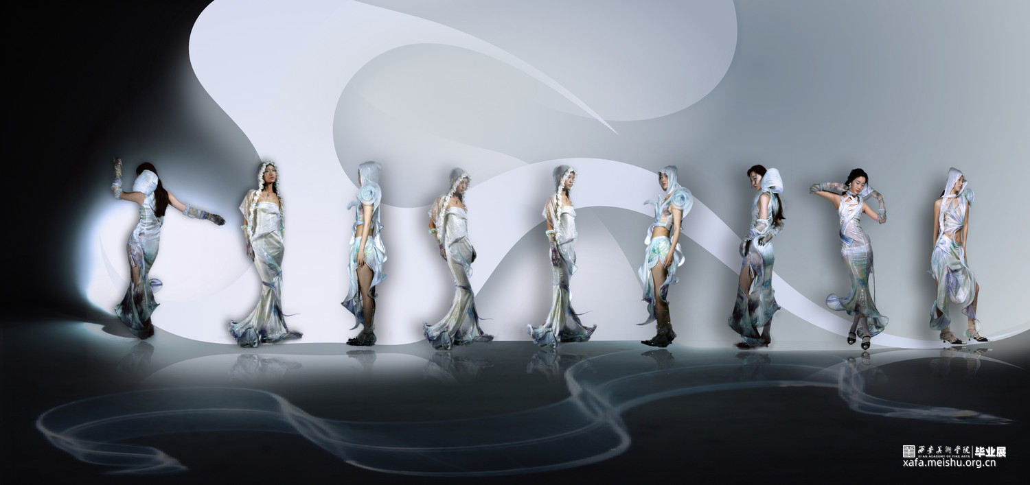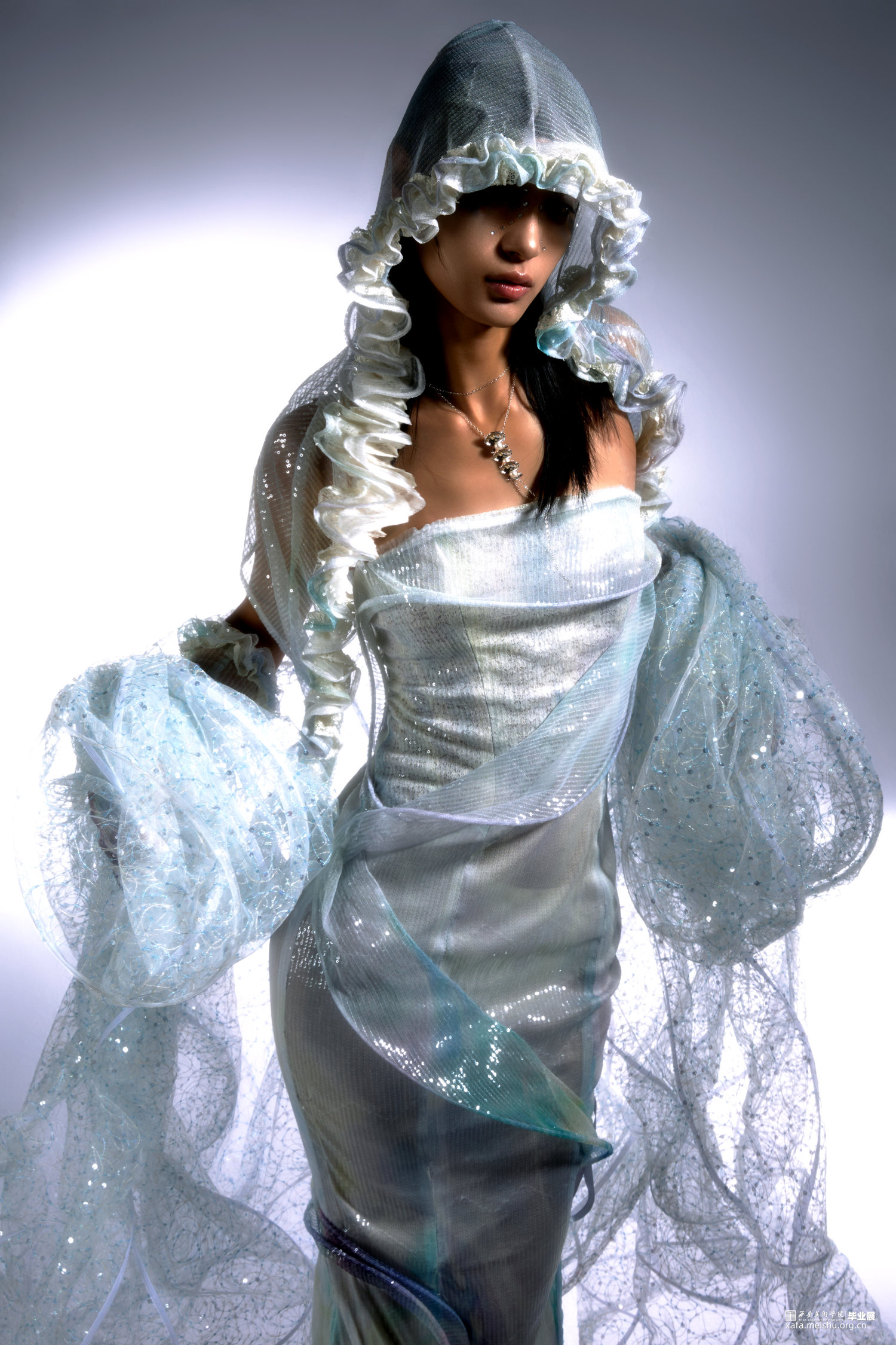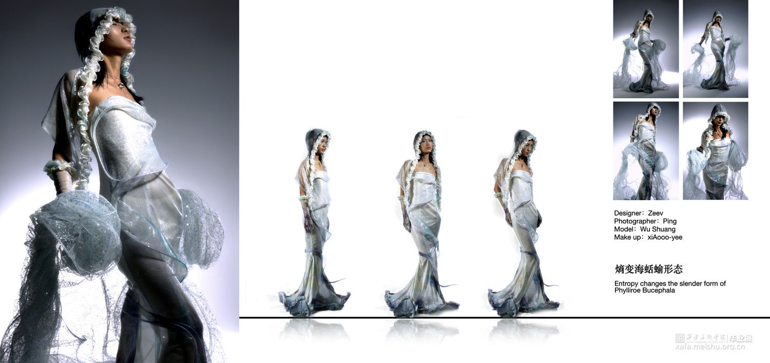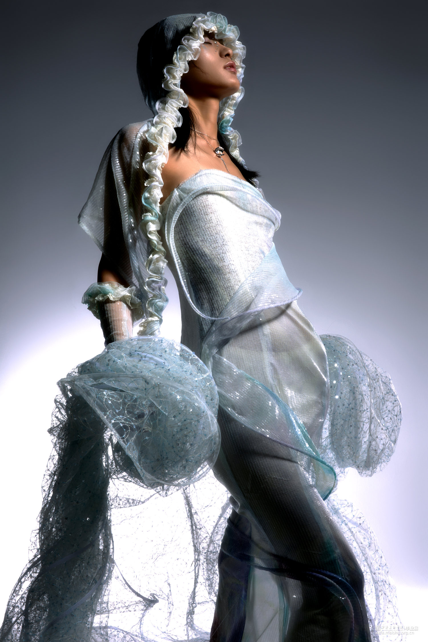《Neo Entropy熵元境变奏》旨在探索生态系统熵的变化,象征着新生物文明的涌现。灵感源于2023年日本核污水事件,当科技逻辑与生态逻辑的交互影响,特别是对海洋生态系统的影响,生态系统的熵值会发生怎样的变化,以及这种变化如何转化为服装语言的有序性和无序性,来表达生物拟态的服装设计。