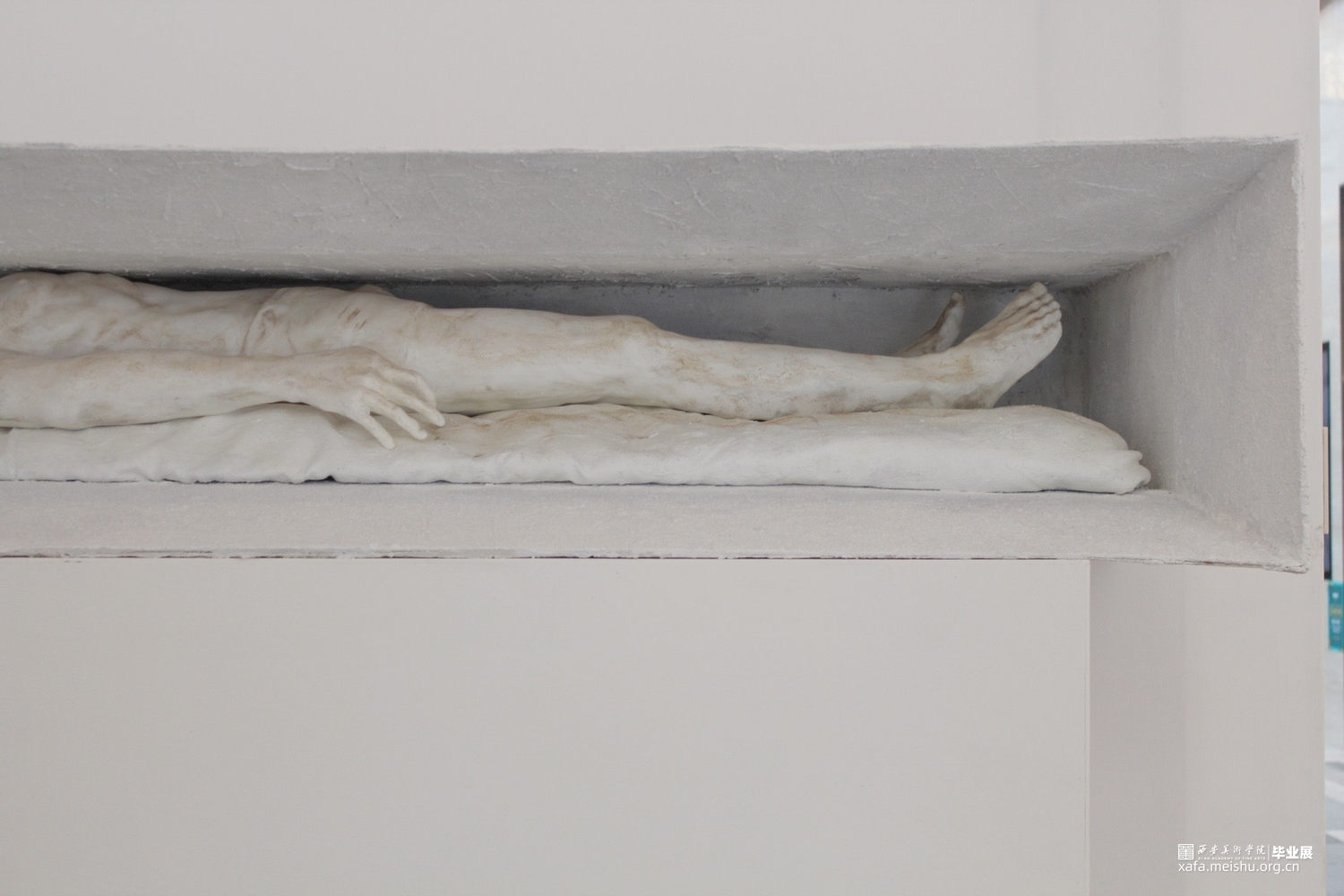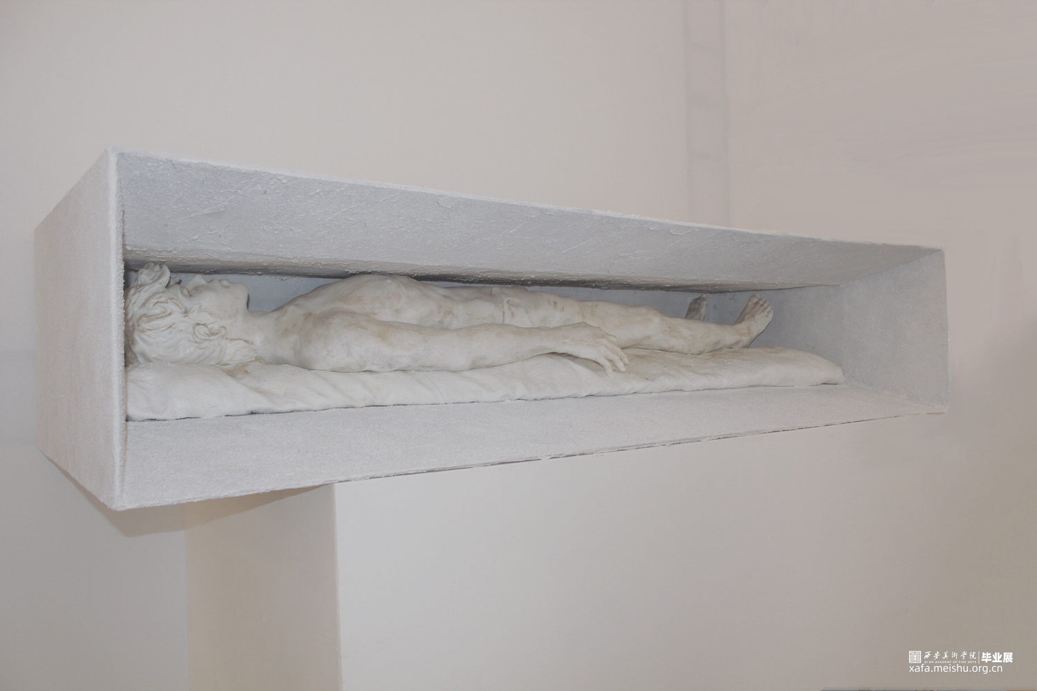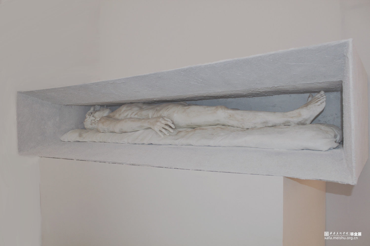 人物是通过电脑制模然后翻模而成,在设计的过程中,我们希望他是一位正处于窘迫环境下在思考在休憩的形象,然后也有看似坚硬实则柔软的物体一起去保护他支撑他。而外框选择规则的几何型喇叭式的空间从里向外扩展开来,材质选择了坚硬的石漆。