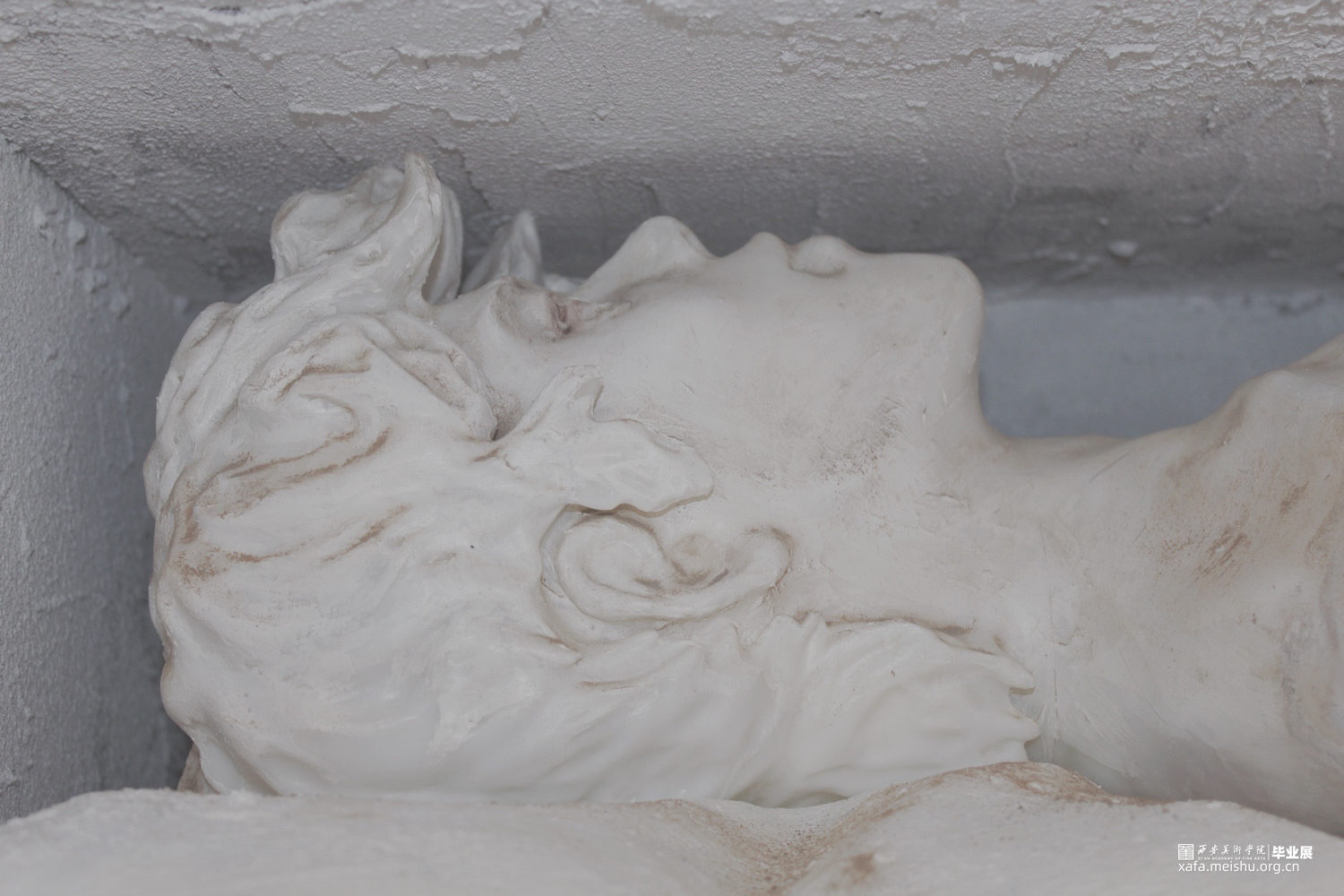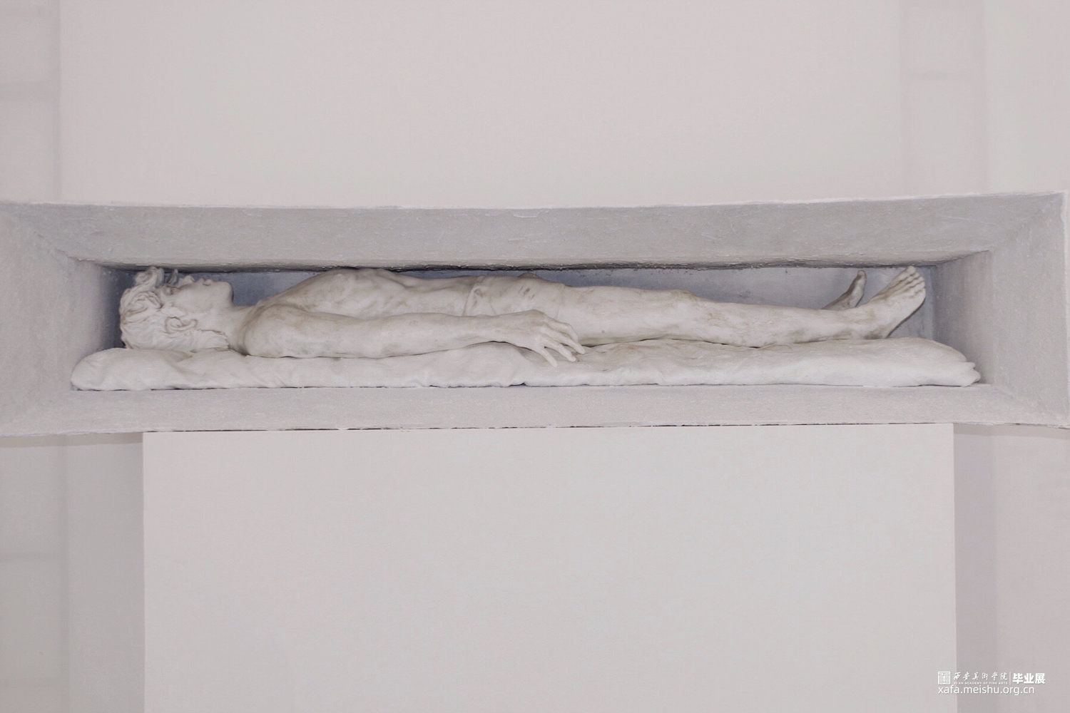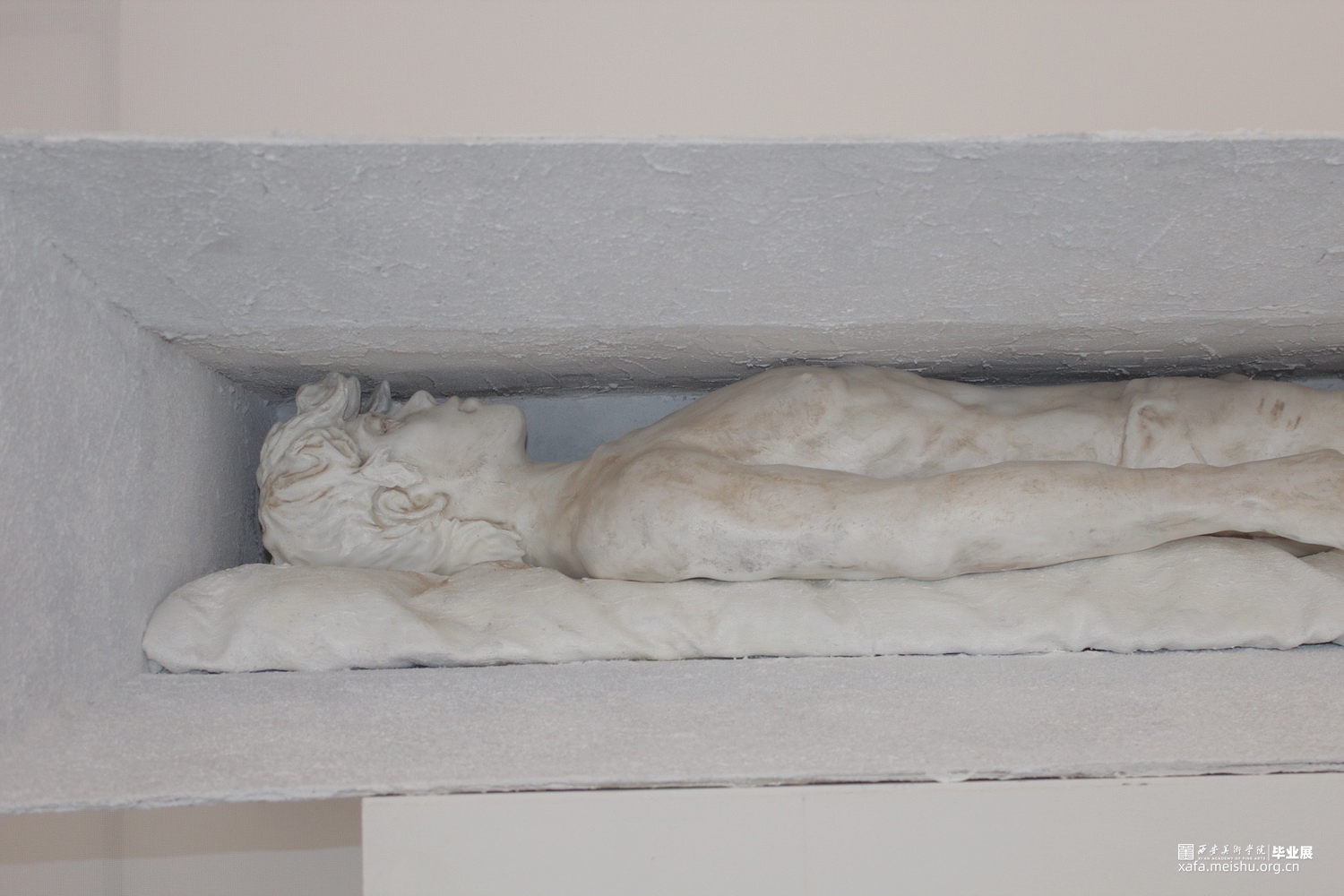 人物是通过电脑制模然后翻模而成,在设计的过程中,我们希望他是一位正处于窘迫环境下在思考在休憩的形象,然后也有看似坚硬实则柔软的物体一起去保护他支撑他。而外框选择规则的几何型喇叭式的空间从里向外扩展开来,材质选择了坚硬的石漆。