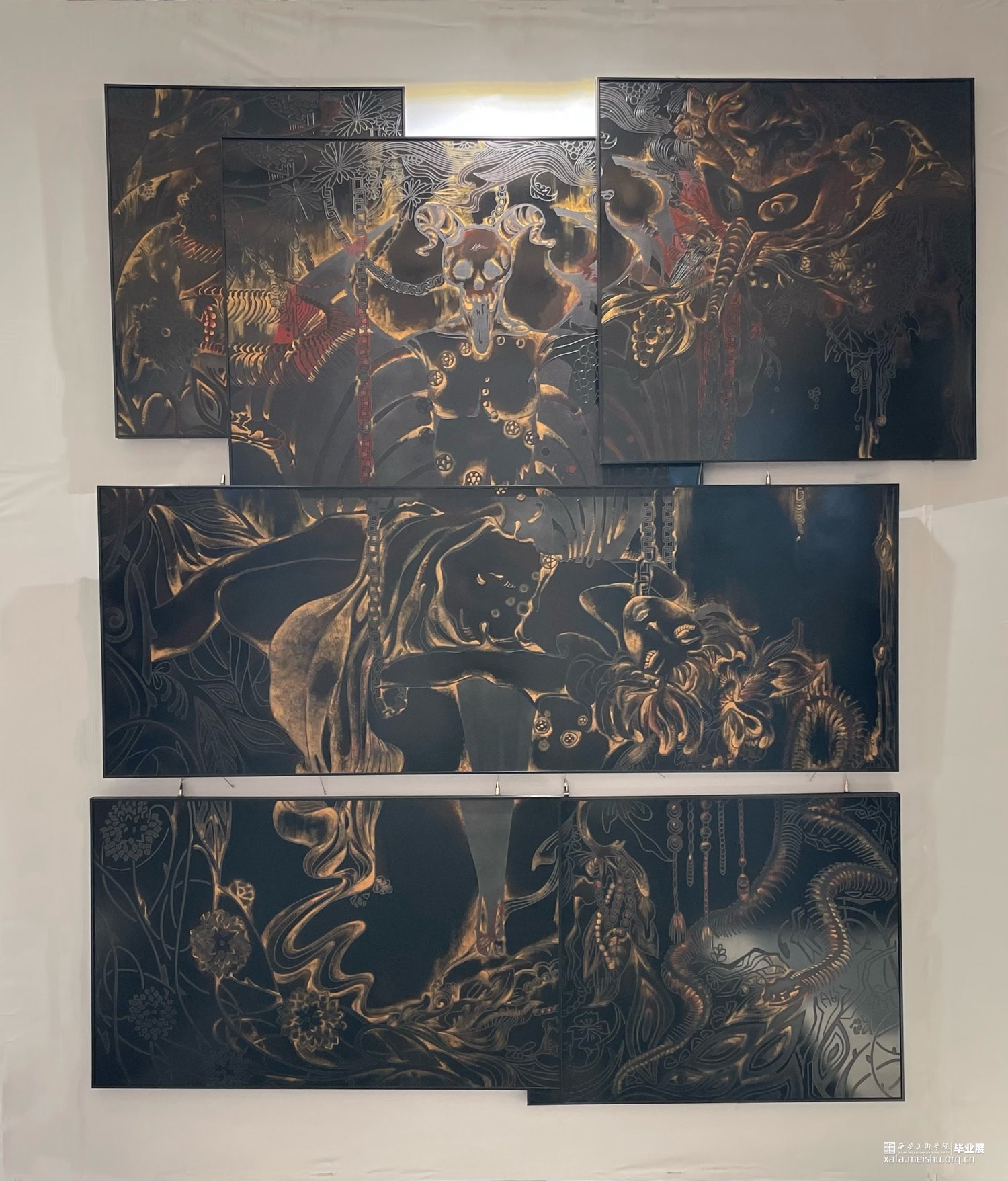 作品希望能用诙谐,谐谑,荒诞的绘画语言来表达当下女性对自己身体的诸多要求。黑色金属腐蚀刻镂与红金色版画油墨拓印相结合,尽力营造出真实的暗黑童话的氛围,因为这样的故事无时无刻不在发生,可能就在我们身边