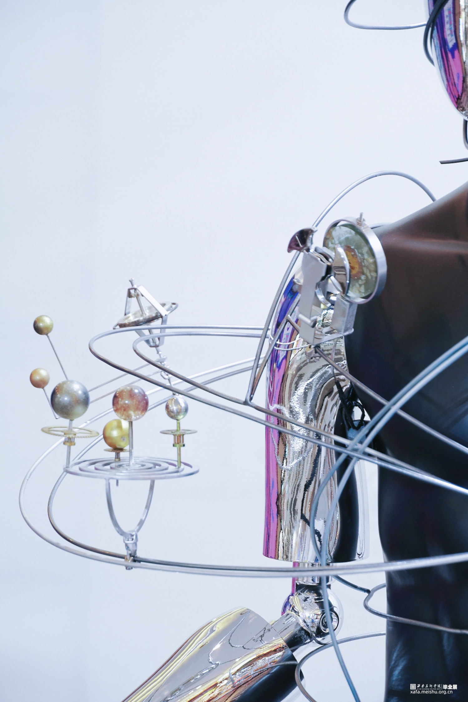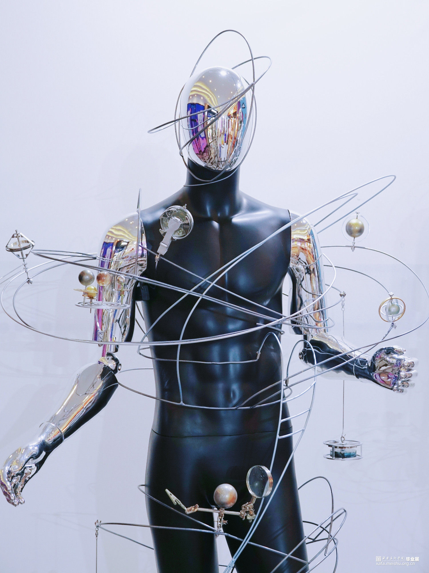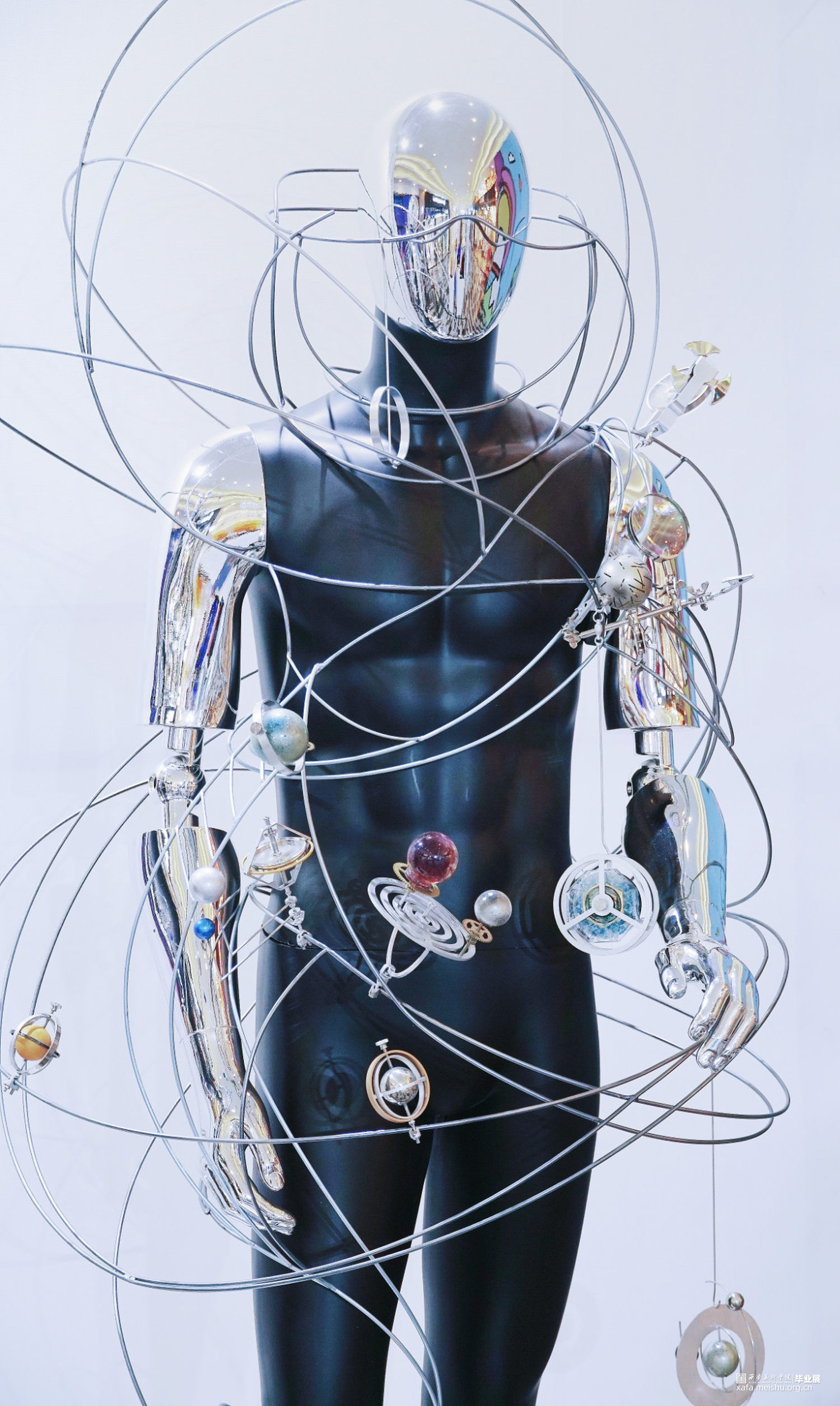 解读“通过忠实地映射宇宙来隐藏自我,是融入永恒的唯一途径。”——我们不是世界的主人,我们不是永生不朽的。过去和现在,我们都不过是独体,就像是这庞大宇宙的一颗会消亡在大气层中的流星,在短暂时光内我们愿以自己的看法去解读世界,从而造就了这个世界的复杂,同时也成就了自我。但人类也是最擅长隐藏自我的,通过伪装扮演另外一个角色来守护自己的秘密。此次创作通过金属线条的扭曲穿插表达人与人之间的交集,世界的错综复杂,金属人体的反光镜面就像是我们的圆滑处事,映射着彼此,各个球体的旋转规则是我们自身价值观的表达,每个人都在自己的轨道上自转,也在这个世界的大轨道上公转,我们平行也交集。