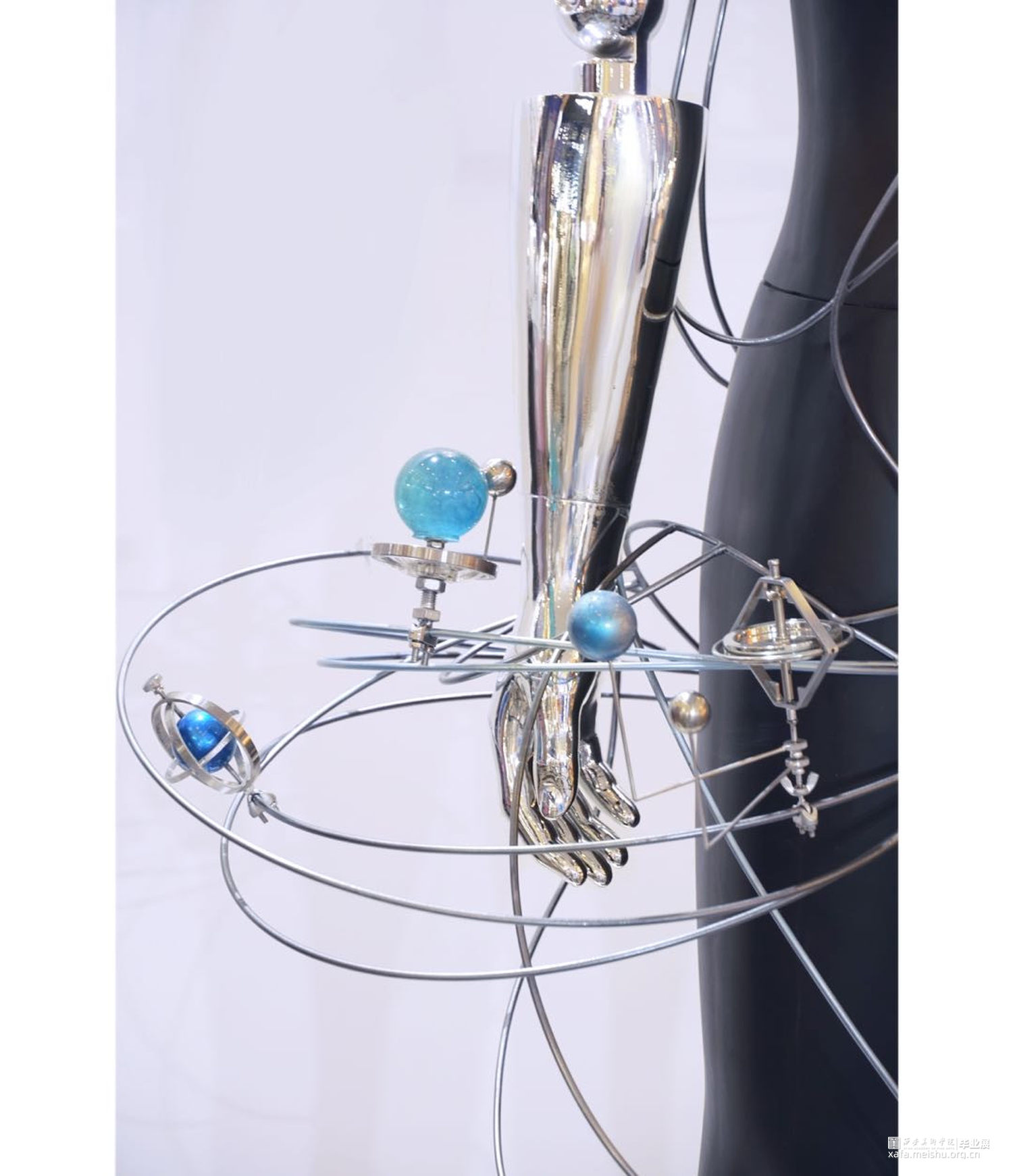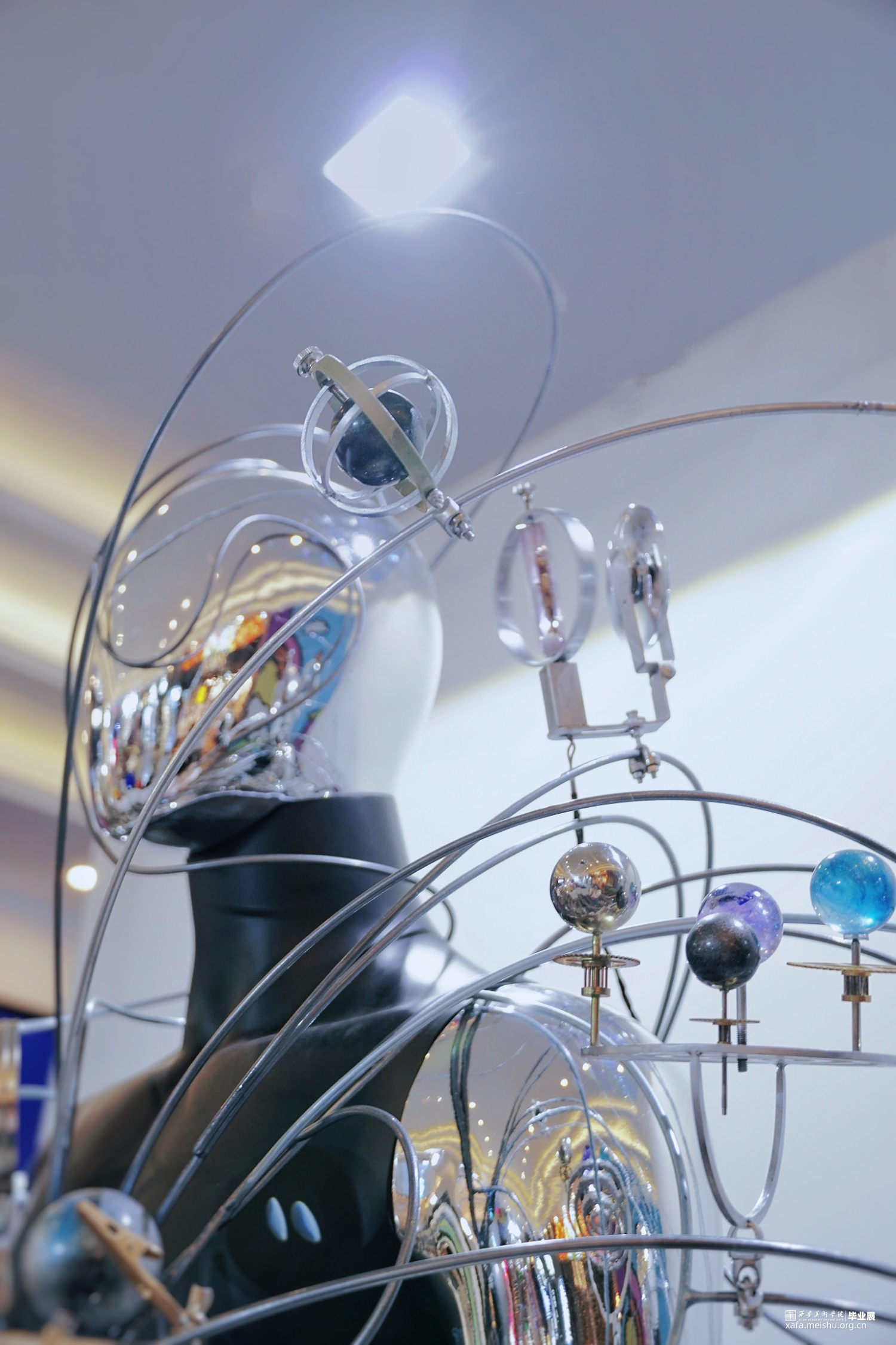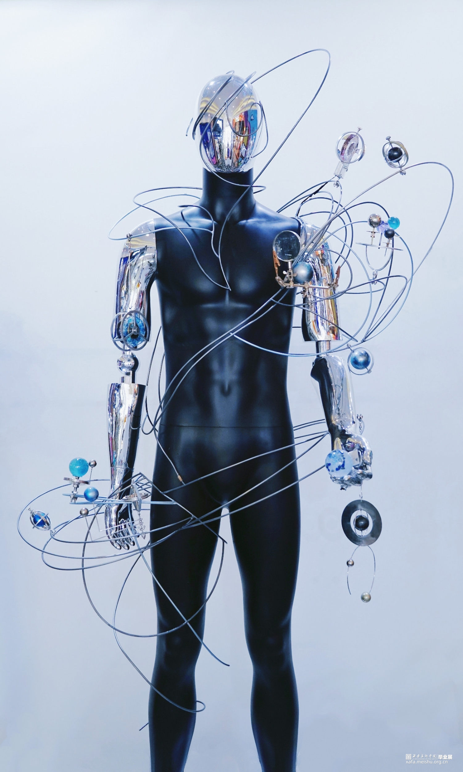 解读“通过忠实地映射宇宙来隐藏自我,是融入永恒的唯一途径。”——我们不是世界的主人,我们不是永生不朽的。过去和现在,我们都不过是独体,就像是这庞大宇宙的一颗会消亡在大气层中的流星,在短暂时光内我们愿以自己的看法去解读世界,从而造就了这个世界的复杂,同时也成就了自我。但人类也是最擅长隐藏自我的,通过伪装扮演另外一个角色来守护自己的秘密。此次创作通过金属线条的扭曲穿插表达人与人之间的交集,世界的错综复杂,金属人体的反光镜面就像是我们的圆滑处事,映射着彼此,各个球体的旋转规则是我们自身价值观的表达,每个人都在自己的轨道上自转,也在这个世界的大轨道上公转,我们平行也交集。