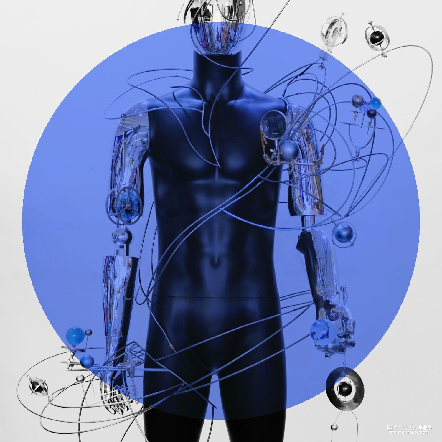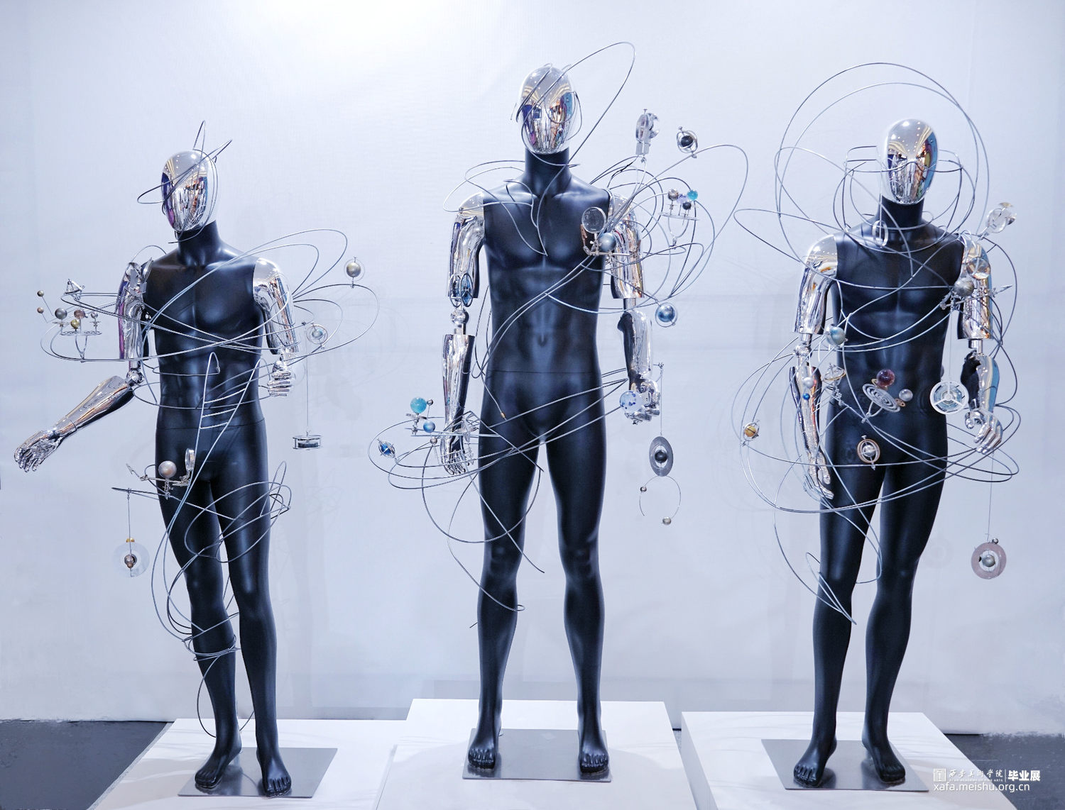 解读“通过忠实地映射宇宙来隐藏自我,是融入永恒的唯一途径。”——我们不是世界的主人,我们不是永生不朽的。过去和现在,我们都不过是独体,就像是这庞大宇宙的一颗会消亡在大气层中的流星,在短暂时光内我们愿以自己的看法去解读世界,从而造就了这个世界的复杂,同时也成就了自我。但人类也是最擅长隐藏自我的,通过伪装扮演另外一个角色来守护自己的秘密。此次创作通过金属线条的扭曲穿插表达人与人之间的交集,世界的错综复杂,金属人体的反光镜面就像是我们的圆滑处事,映射着彼此,各个球体的旋转规则是我们自身价值观的表达,每个人都在自