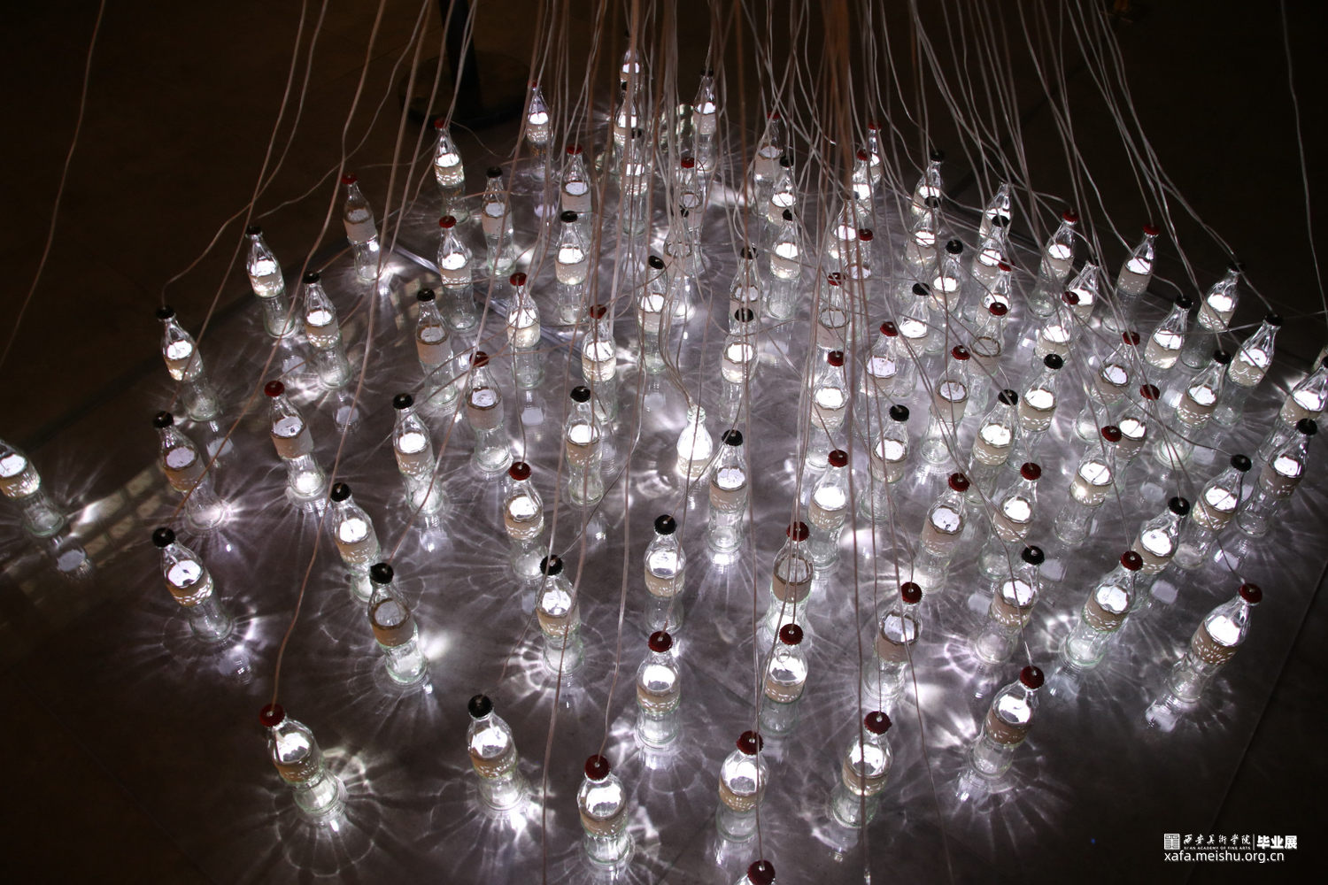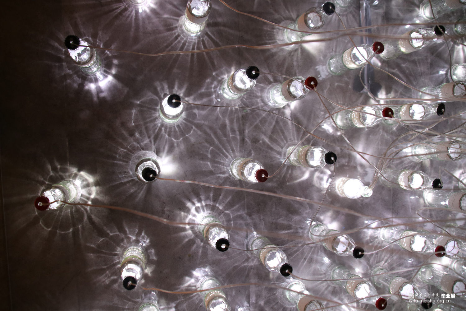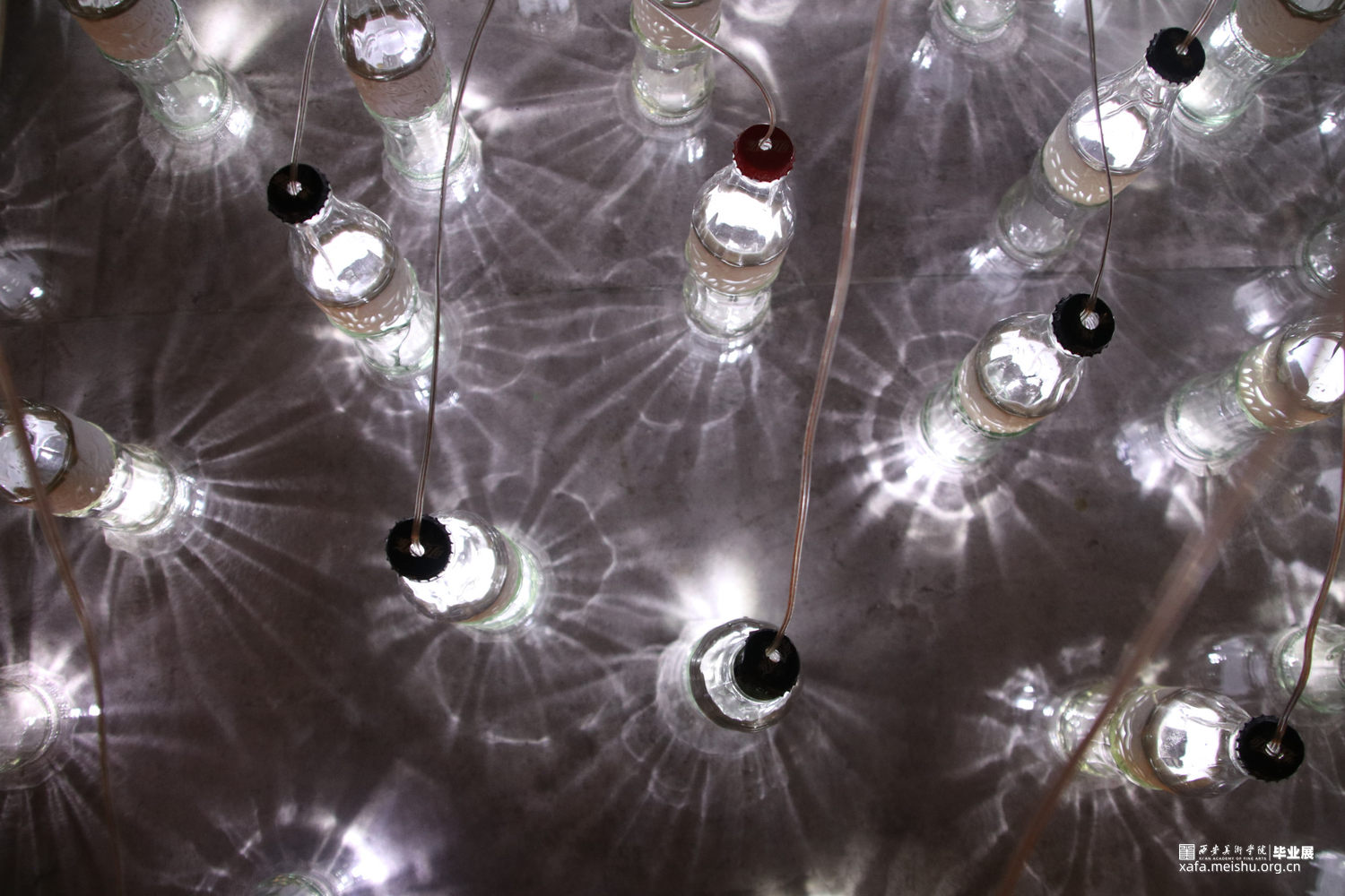 作品以“饕餮”纹样为一种代表传统装饰的符号语言,采用陶瓷材料的可塑性与透亮度,结合玻璃工艺,诠释一种光的来源与产生的效应,以此隐喻人们在某种环境与状态下,通过视觉对内在心里和判断所受到的影响。在一定形式上,通过光的作用,将陶瓷塑造的纹样和玻璃材质的切割与重组,将其生成强与弱的光线变化和融合,自然形成的视觉效果,体现着一种割裂时空但又是一种完美的交融。两者可以认为是现代与传统的冲击,也可以理解为一种包容。以光表现“点”,触发时人们释放内心的“自由”,有线的控制让光重新汇聚在一起,隐喻人们在受到外界的影响和