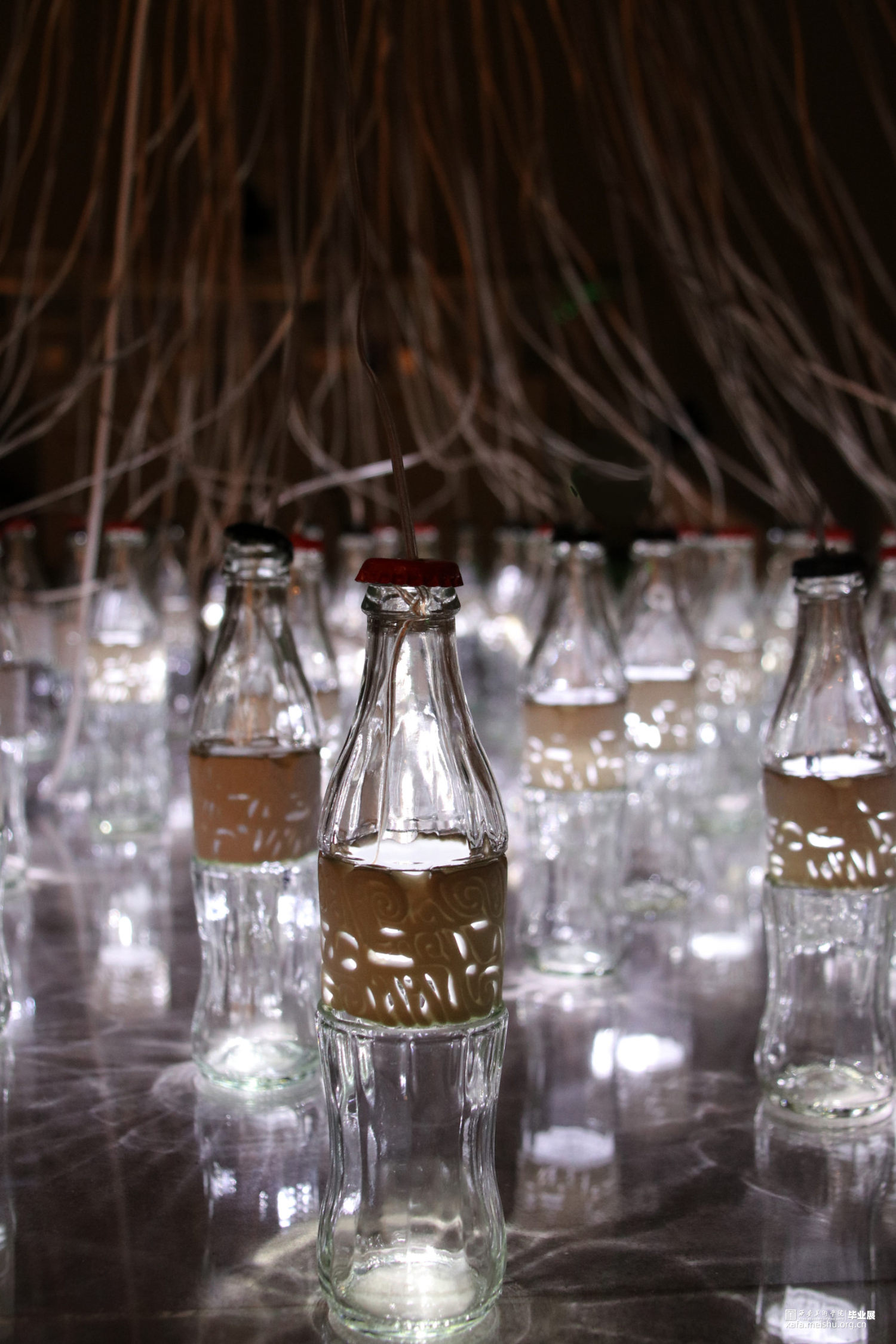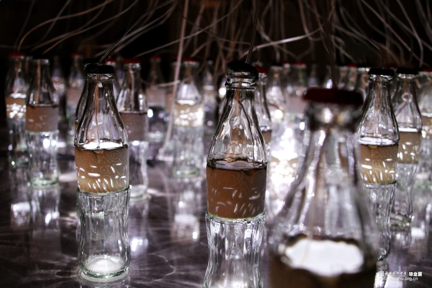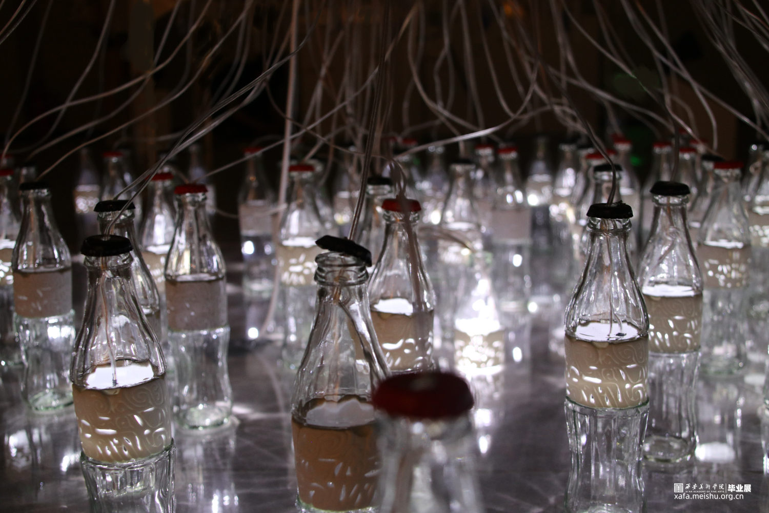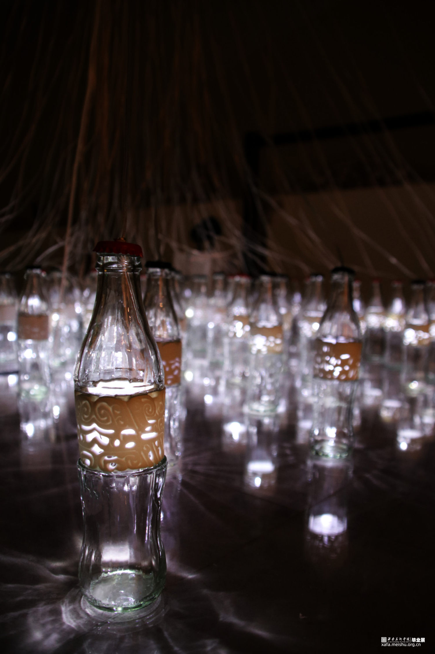 作品以“饕餮”纹样为一种代表传统装饰的符号语言,采用陶瓷材料的可塑性与透亮度,结合玻璃工艺,诠释一种光的来源与产生的效应,以此隐喻人们在某种环境与状态下,通过视觉对内在心里和判断所受到的影响。在一定形式上,通过光的作用,将陶瓷塑造的纹样和玻璃材质的切割与重组,将其生成强与弱的光线变化和融合,自然形成的视觉效果,体现着一种割裂时空但又是一种完美的交融。两者可以认为是现代与传统的冲击,也可以理解为一种包容。以光表现“点”,触发时人们释放内心的“自由”,有线的控制让光重新汇聚在一起,隐喻人们在受到外界的影响和教育时,让自己重塑行程,燃发新的希望。