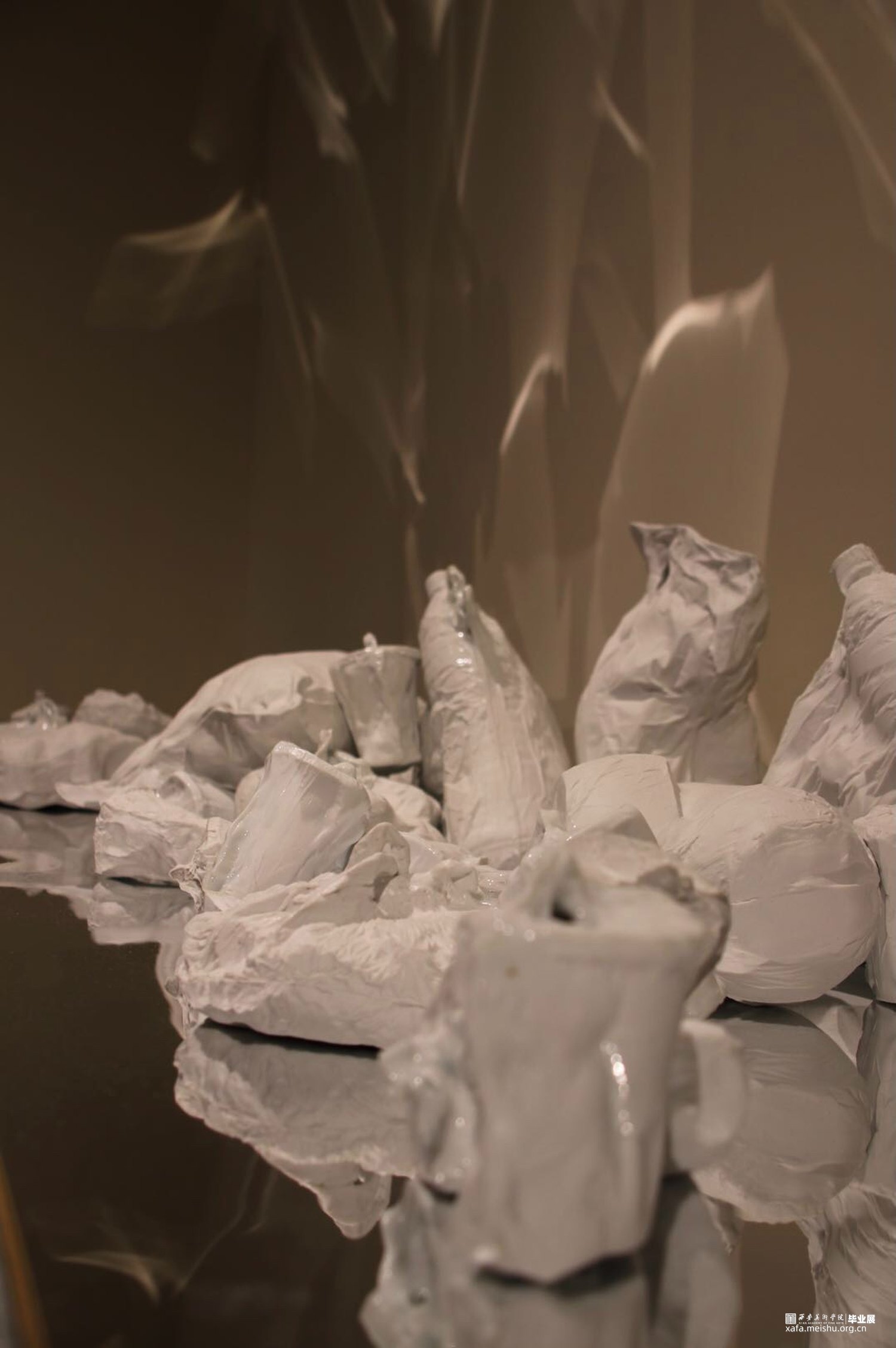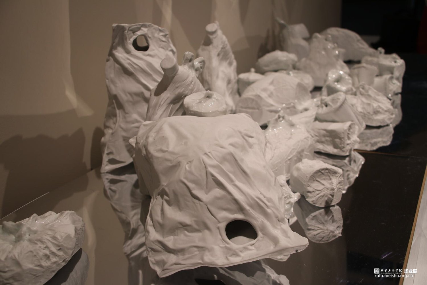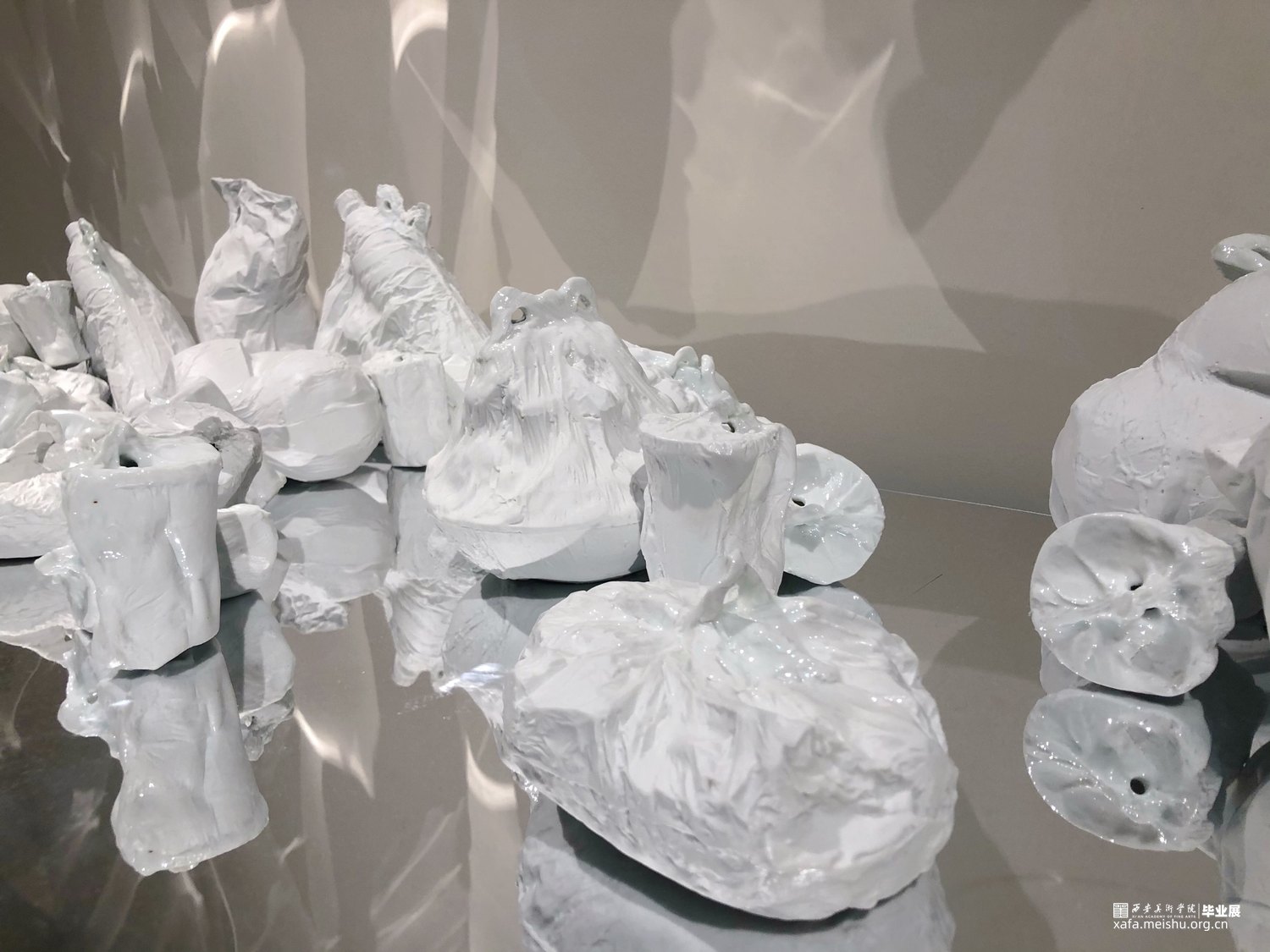 本组作品创作以陶瓷为基本材料语言介质,以现实生活中的外卖食品包装袋为造型基础,采用了磨具翻模注浆的工艺,在保留食品外卖包装袋造型特征的这一基础上,进行格调化统一处理,使素白的陶瓷系列外卖造型,成为一种能够表达当代大学生校园生活状态的一种真实写照,并给人一种展开想象的基础和空间。在一定层面上,使观者不仅能够了解当下大学生的