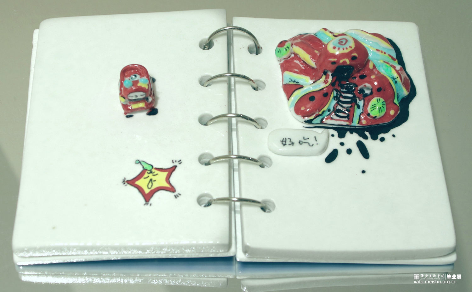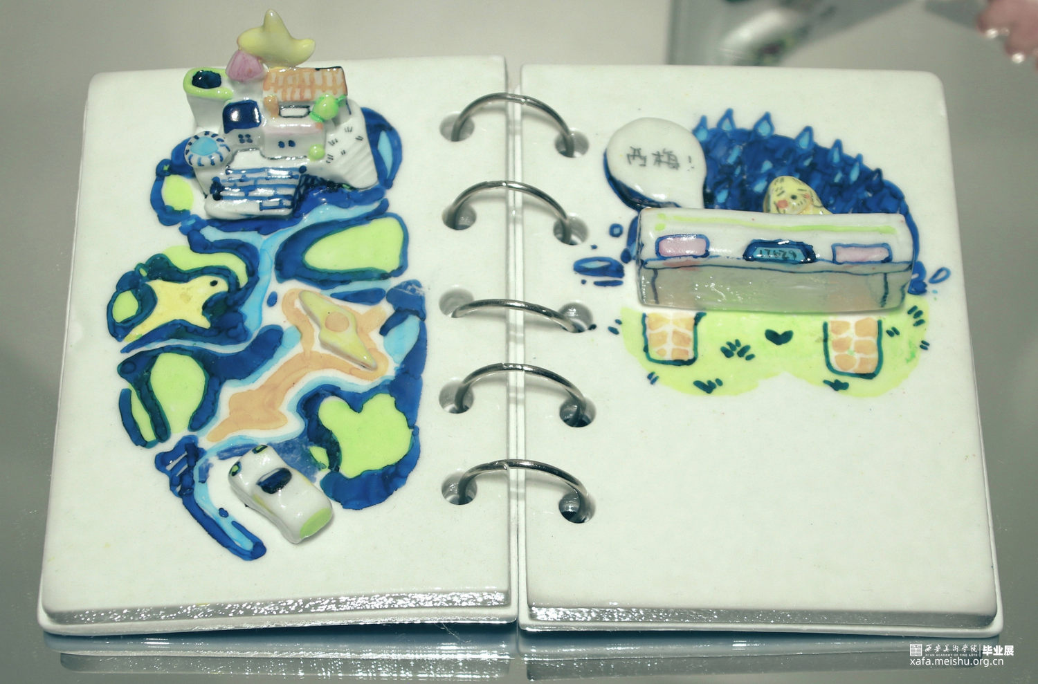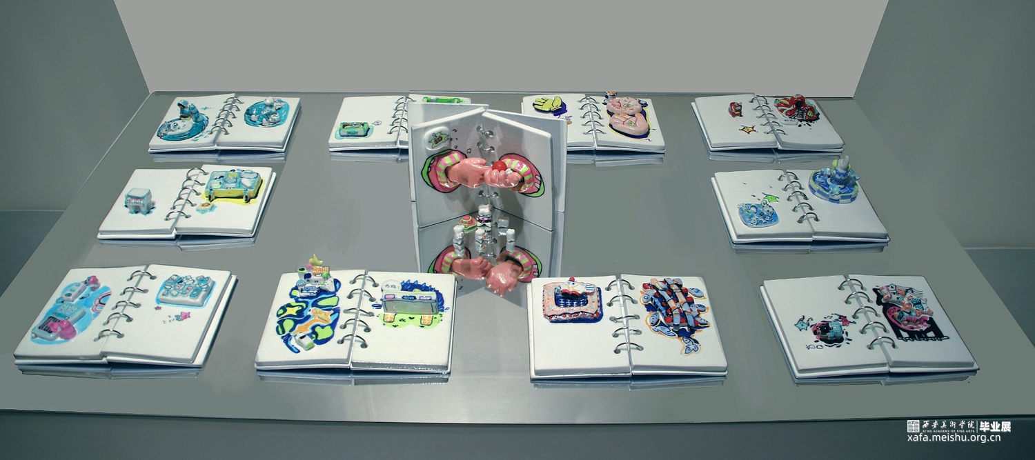 作品立意源自于作者对梦境中闪现的一系列生活状态的回忆与感触,创作立足陶瓷本身材料语言特性,运用插画艺术表现形式,以具有典型符号语言关系的笔记本,作为造型基础,塑造半立体形态,对梦境进行系列状态的塑造和渲染。充分发挥陶瓷材料的可塑性以及釉料,釉色的搭配,将插画进行既具象又概括的方式,塑造并装饰出丰富的梦境效果,以表达个人在日常生活中,亦真亦幻的状态写照。
