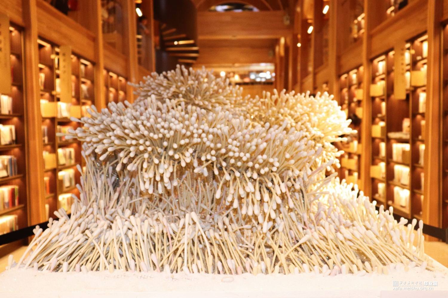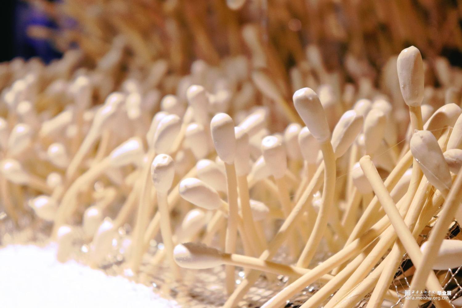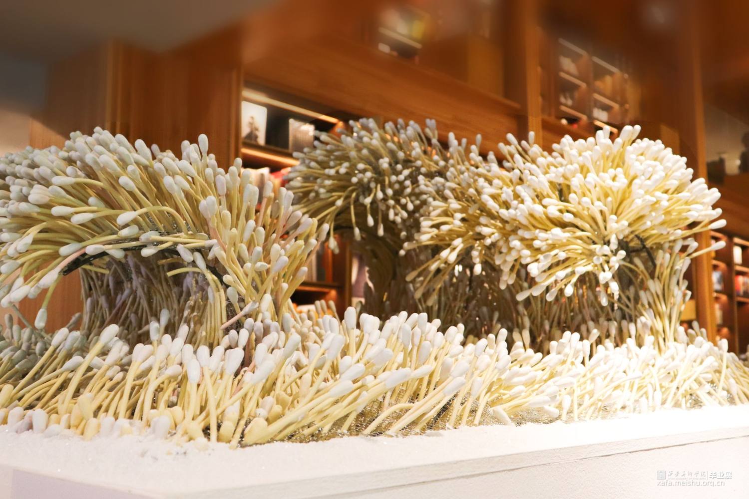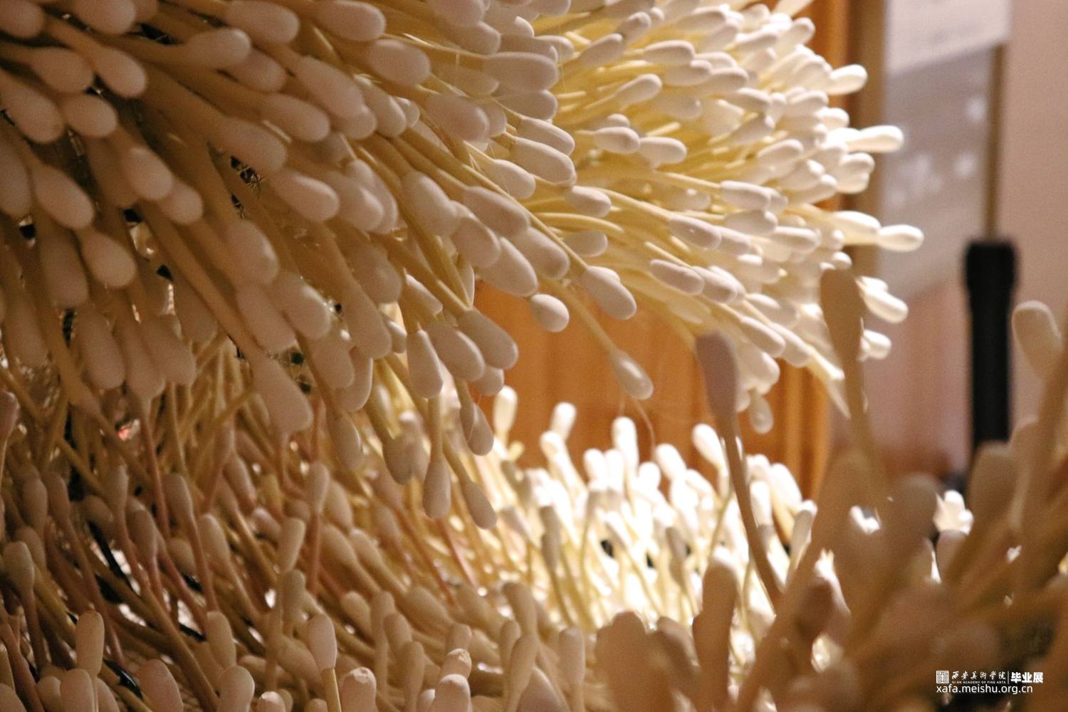 如果说日常生的状态是一片平静的海,那么新冠病毒的爆发就犹如猛然掀起的海浪,打破了海域以往的平静。疫情浪潮般呼啸而来的同时也对人们的社会生活带来了猛烈的冲击。在这样一种情境下,棉签作为检测病毒的工具,被赋予了更多的意义,它的大量使用消耗代表着人们同这场病毒的对抗,同时也是人们疫情生活的见证。这样的一根根棉签承载着巨大的能量,它代表着永不放弃的信念,同时也维系着千千万万医护人员与普通群众、维系着生活、维系着健康、也维系着责任。