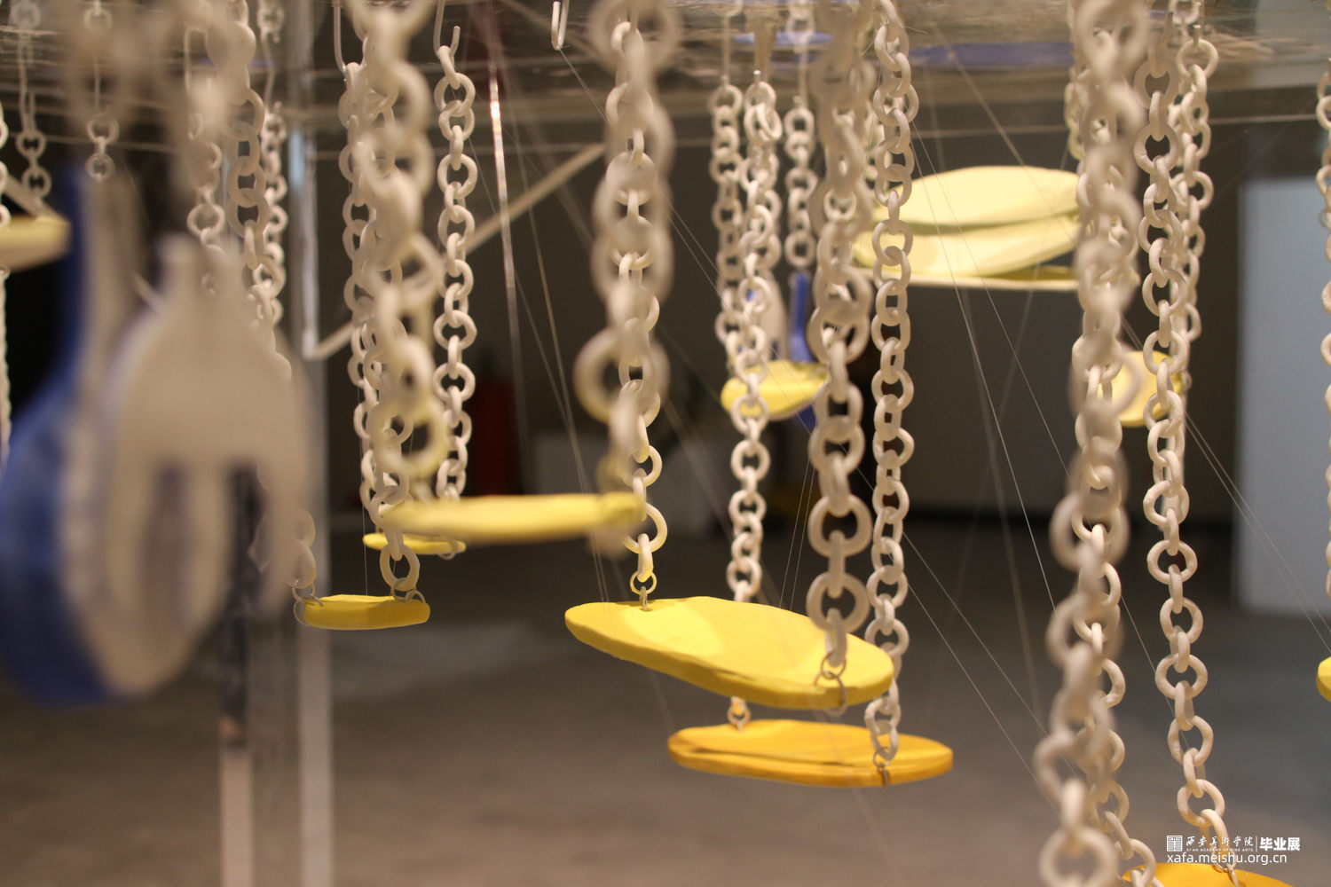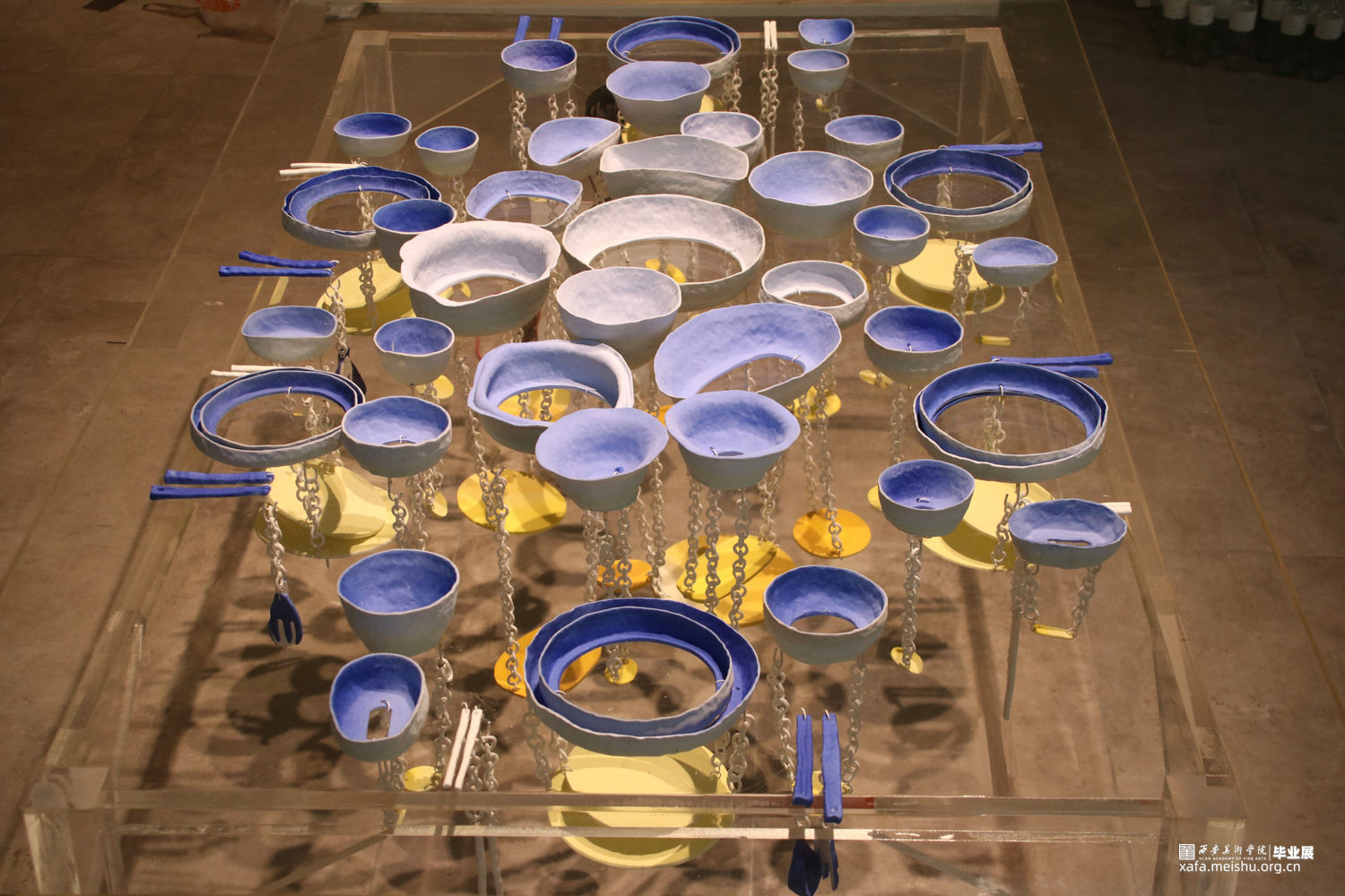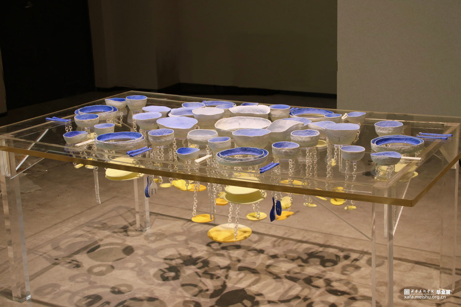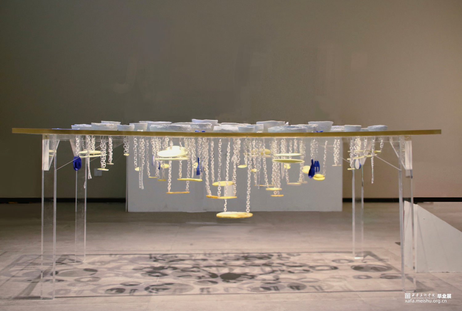 本次毕设方案立足于国人的餐桌文化,作品整个场景设置为多人饮食场景,将日常生活中常见的餐具置换为不可使用的状态,对日常实用器做出异常的改变。桌上和桌下划分为两个空间,以透明材料为介质,将桌上的平静和桌下隐藏的矛盾展现出来,处于明处关系和位于暗处关系相互交织,得以将坠落的餐具底部维持暂时的平衡,作品旨在由饮食文化来反映人和人之间错综复杂的关系。