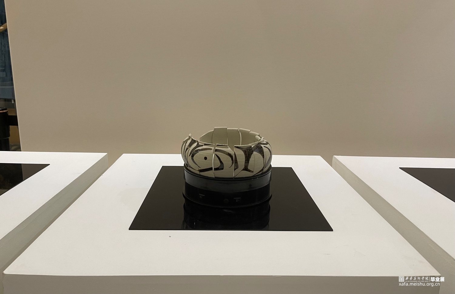 通过1比1还原出传统器皿,但只取其中图案部分一圈,将其做成大小不一的瓷片围绕在用薄胎瓷制作的圆形瓷片周围形成一个半立体的器皿,通过底部打灯和侧面打灯,将泥片的影子映在薄胎瓷上,不停旋转的泥片投影就像在完整的薄胎瓷上修补破碎一样,原本完整的