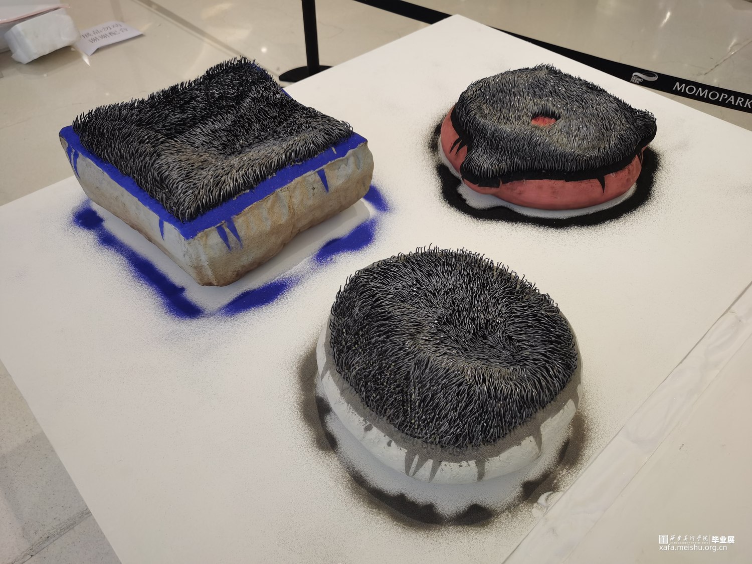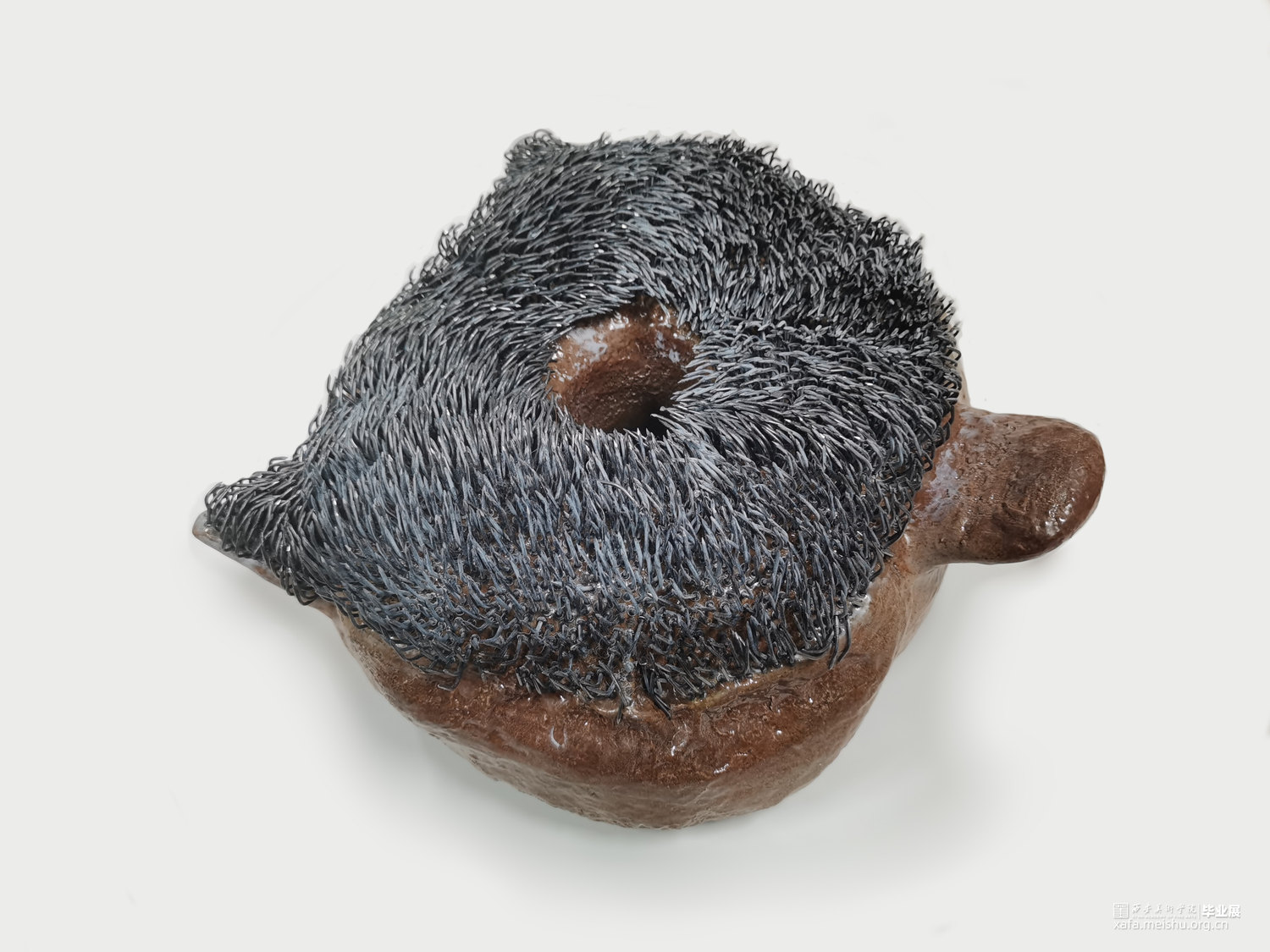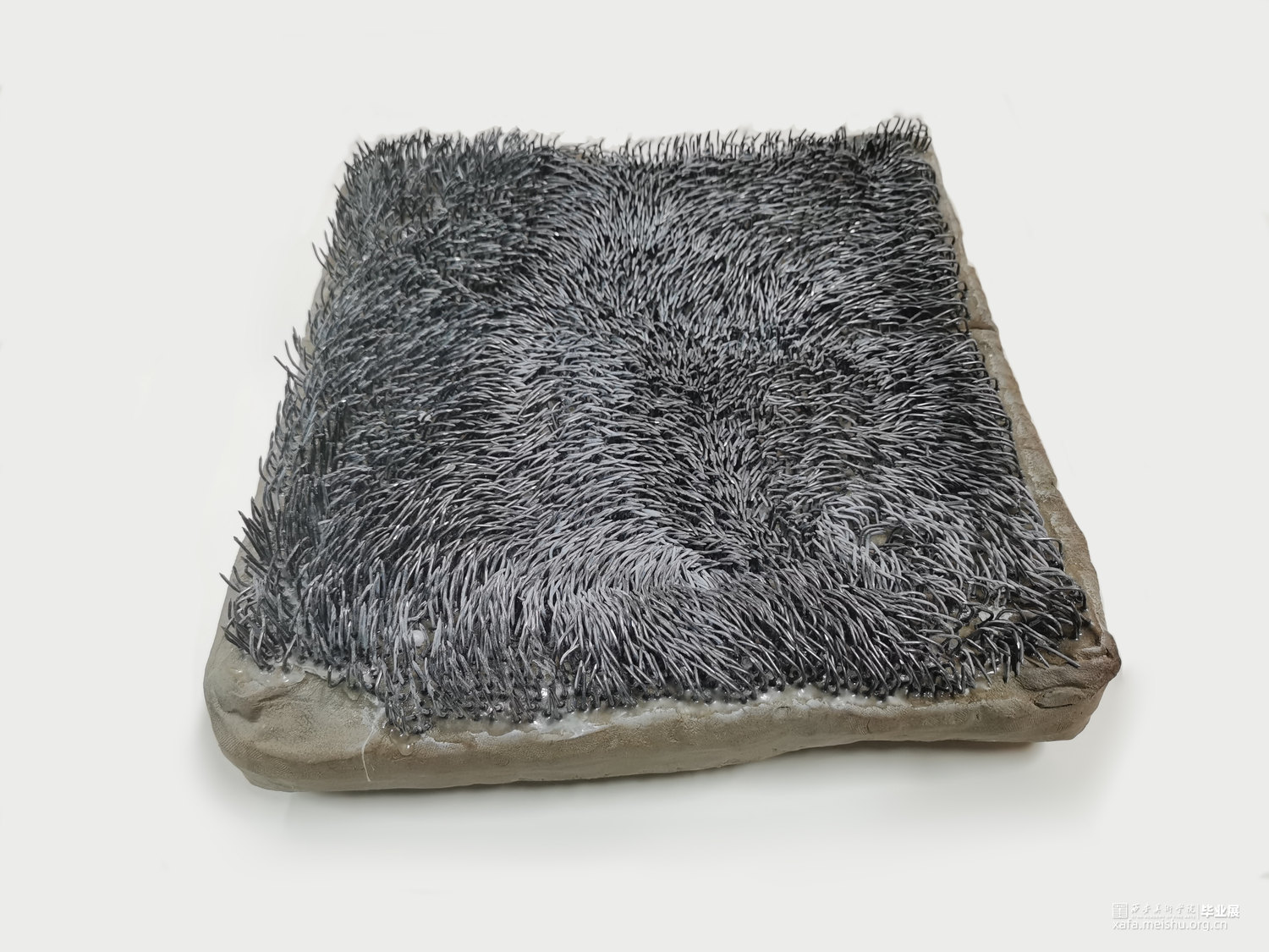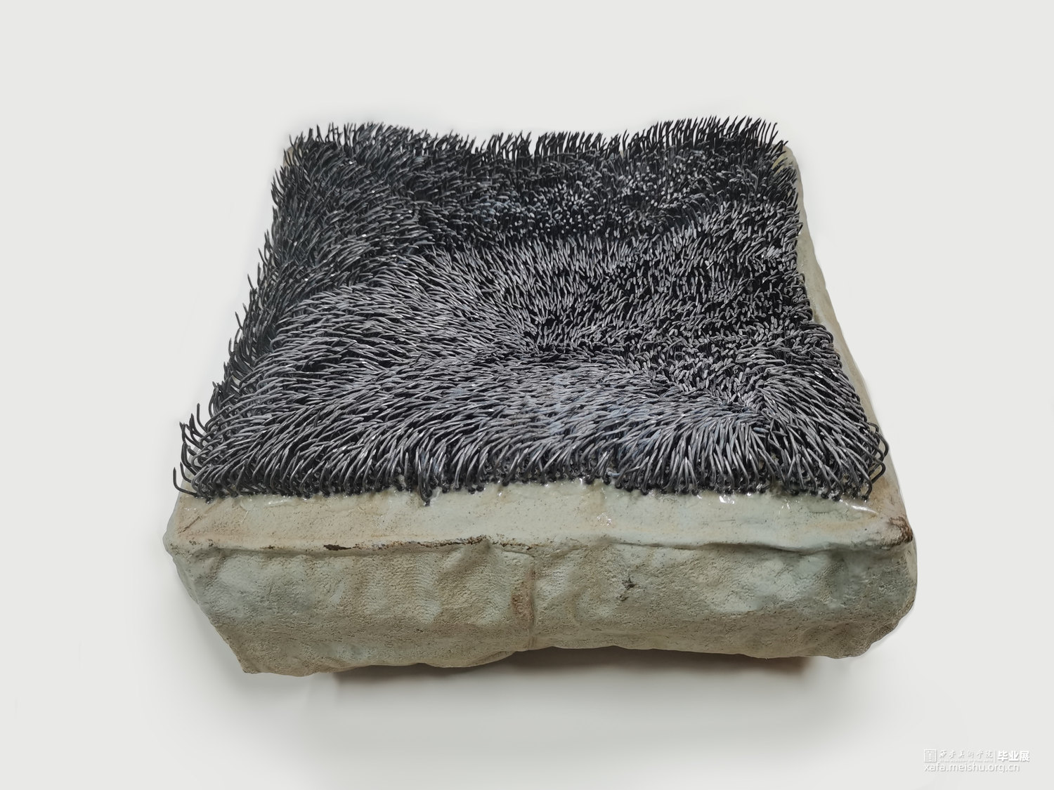 该作品试图通过对坐垫的功能和材质进行分解与再造,在“坐”与“不能坐”之间徘徊。柔软的坐垫不仅可以让人放松,而且可以让人产生舒适惬意的感受;但是人在过于舒适的状态中反而会产生惰性,甚至松懈的心理。作者尝试呈现一组坚硬冰冷,并且布满钉子看似柔软的陶瓷坐垫,刻意营造不舒适感,来警醒人们应该时刻保持一种紧迫感。
