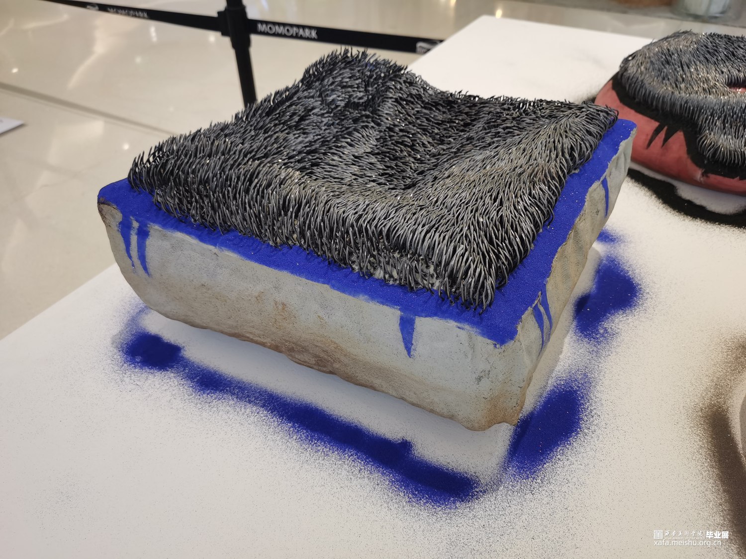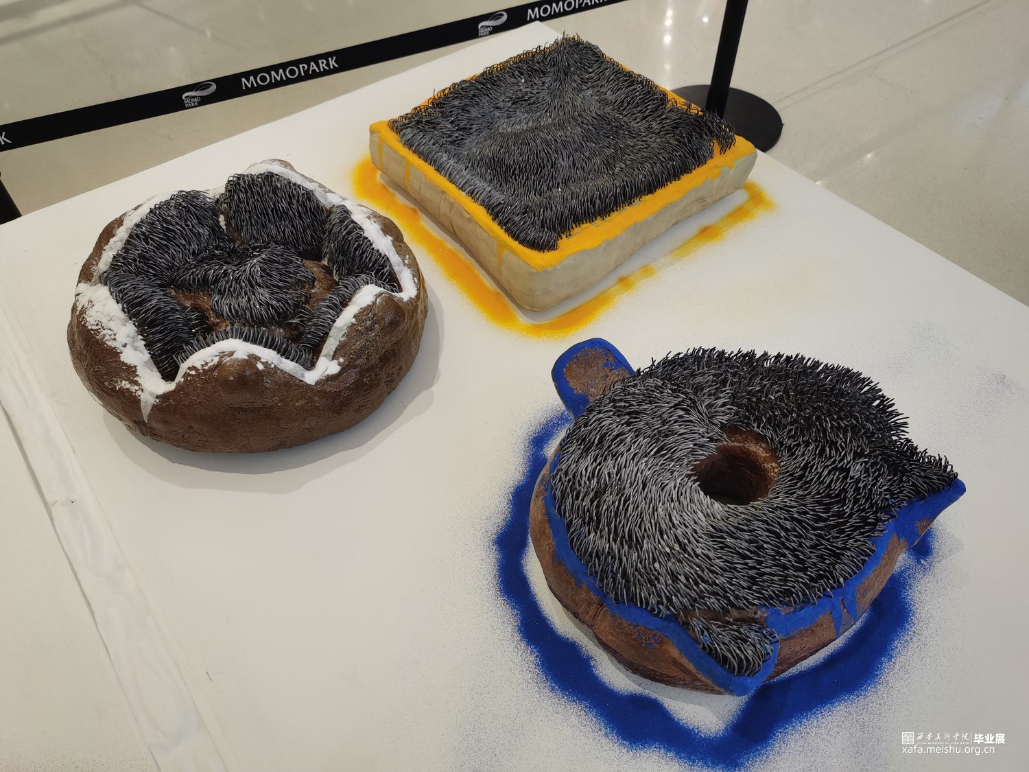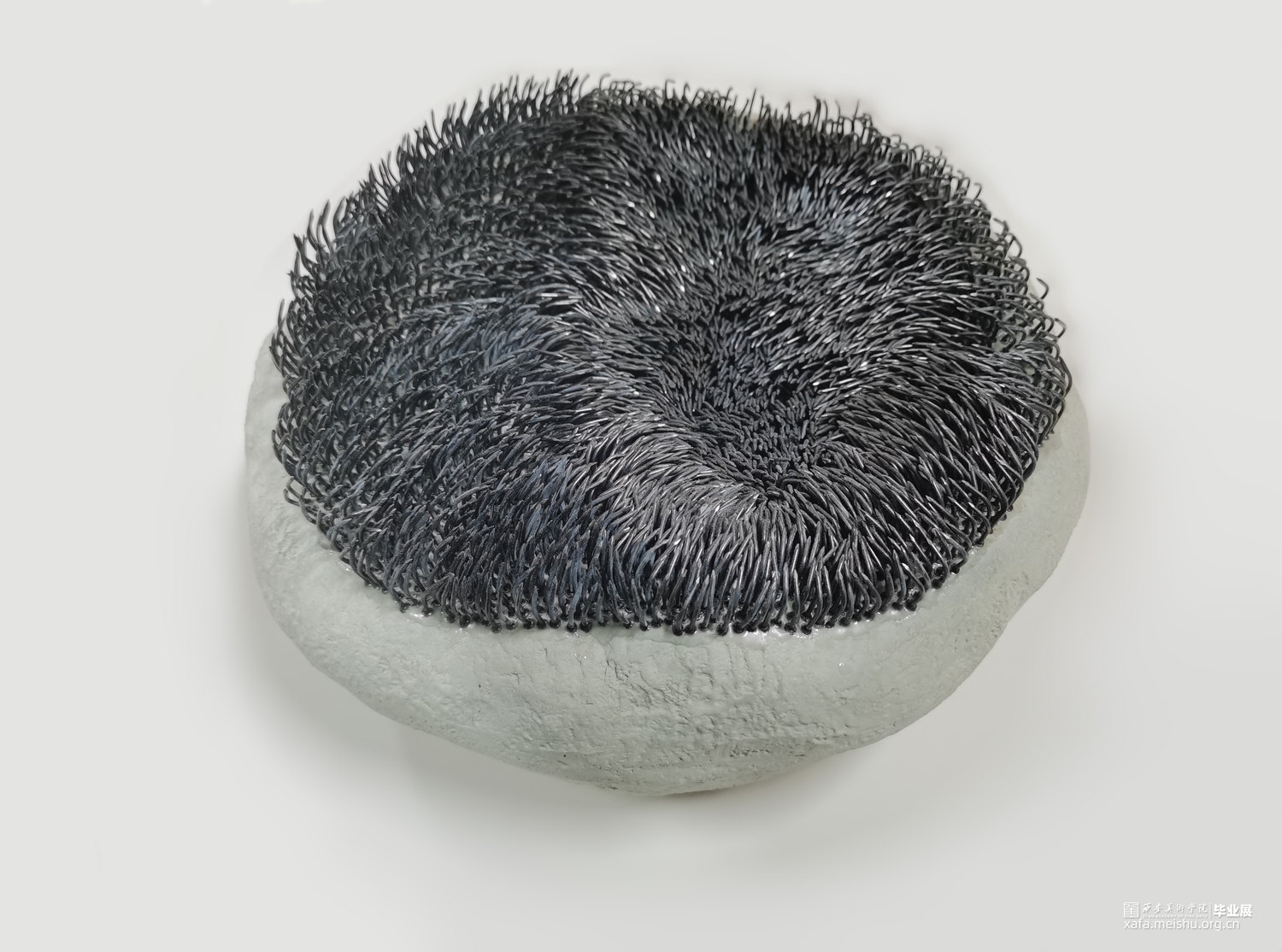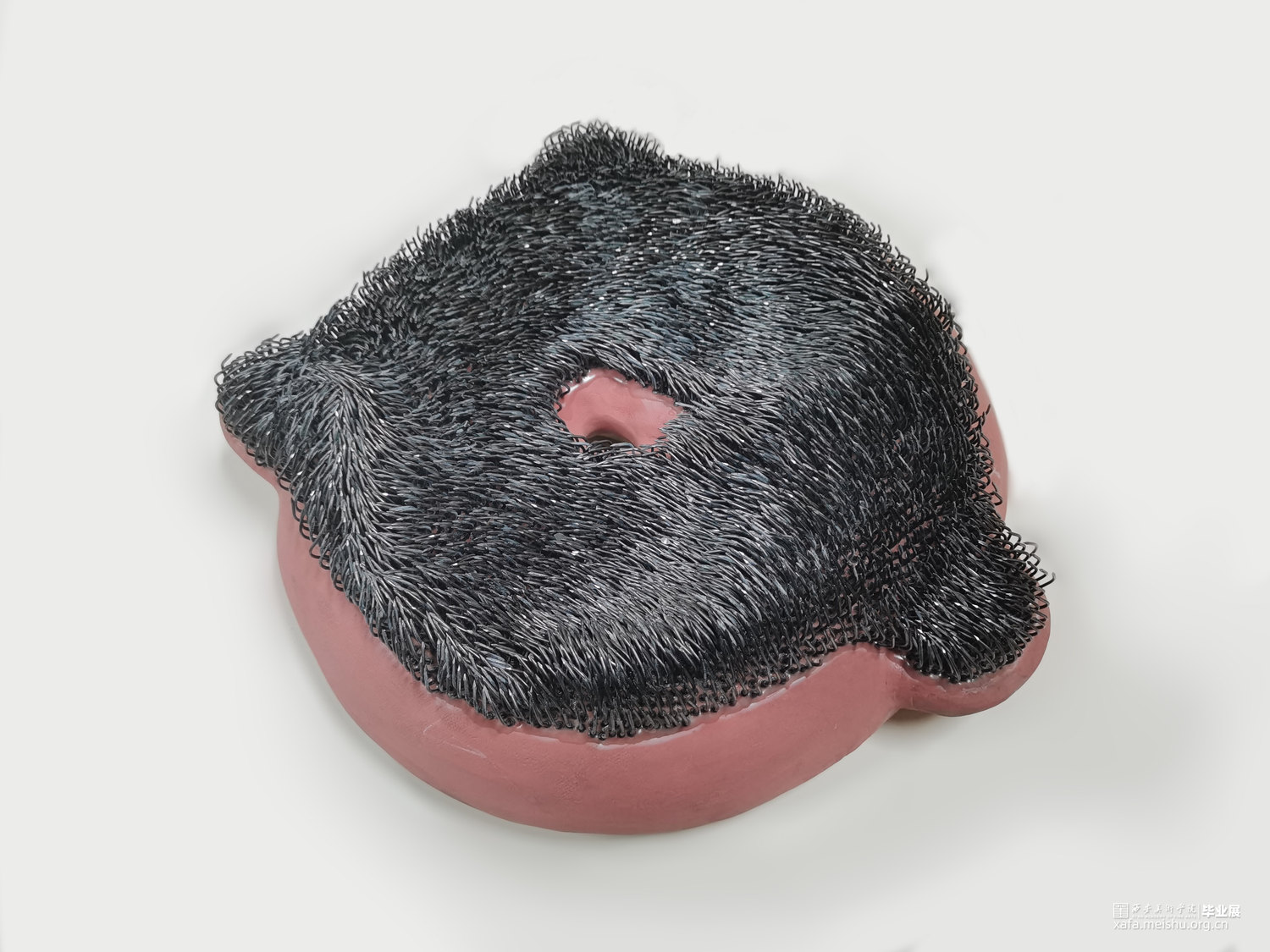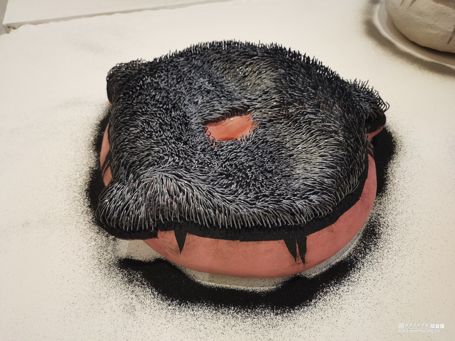该作品试图通过对坐垫的功能和材质进行分解与再造,在“坐”与“不能坐”之间徘徊。柔软的坐垫不仅可以让人放松,而且可以让人产生舒适惬意的感受;但是人在过于舒适的状态中反而会产生惰性,甚至松懈的心理。作者尝试呈现一组坚硬冰冷,并且布满钉子看似柔软的陶瓷坐垫,刻意营造不舒适感,来警醒人们应该时刻保持一种紧迫感。