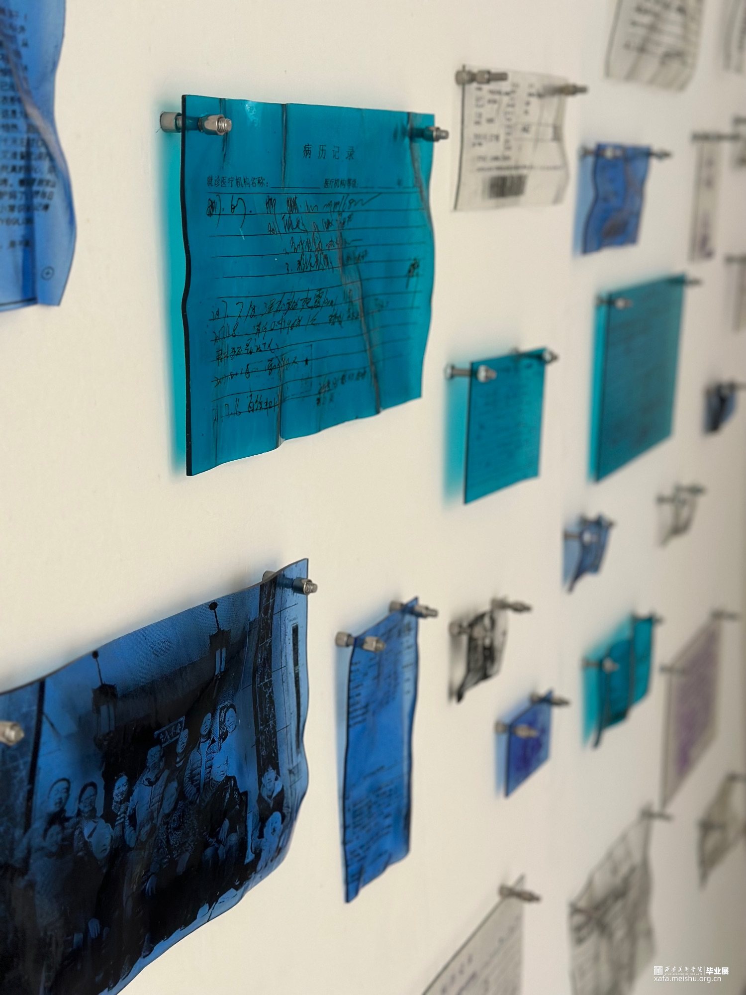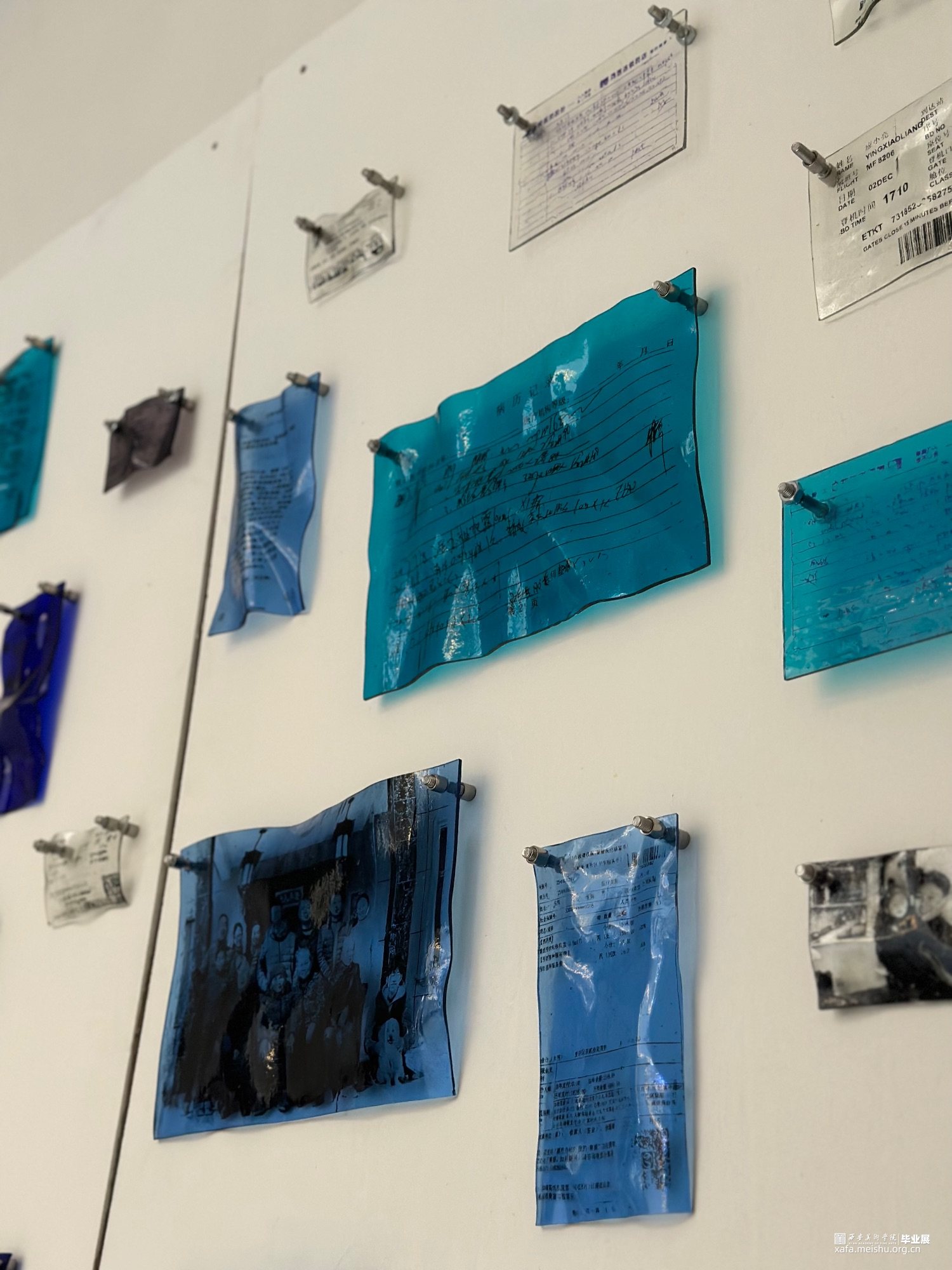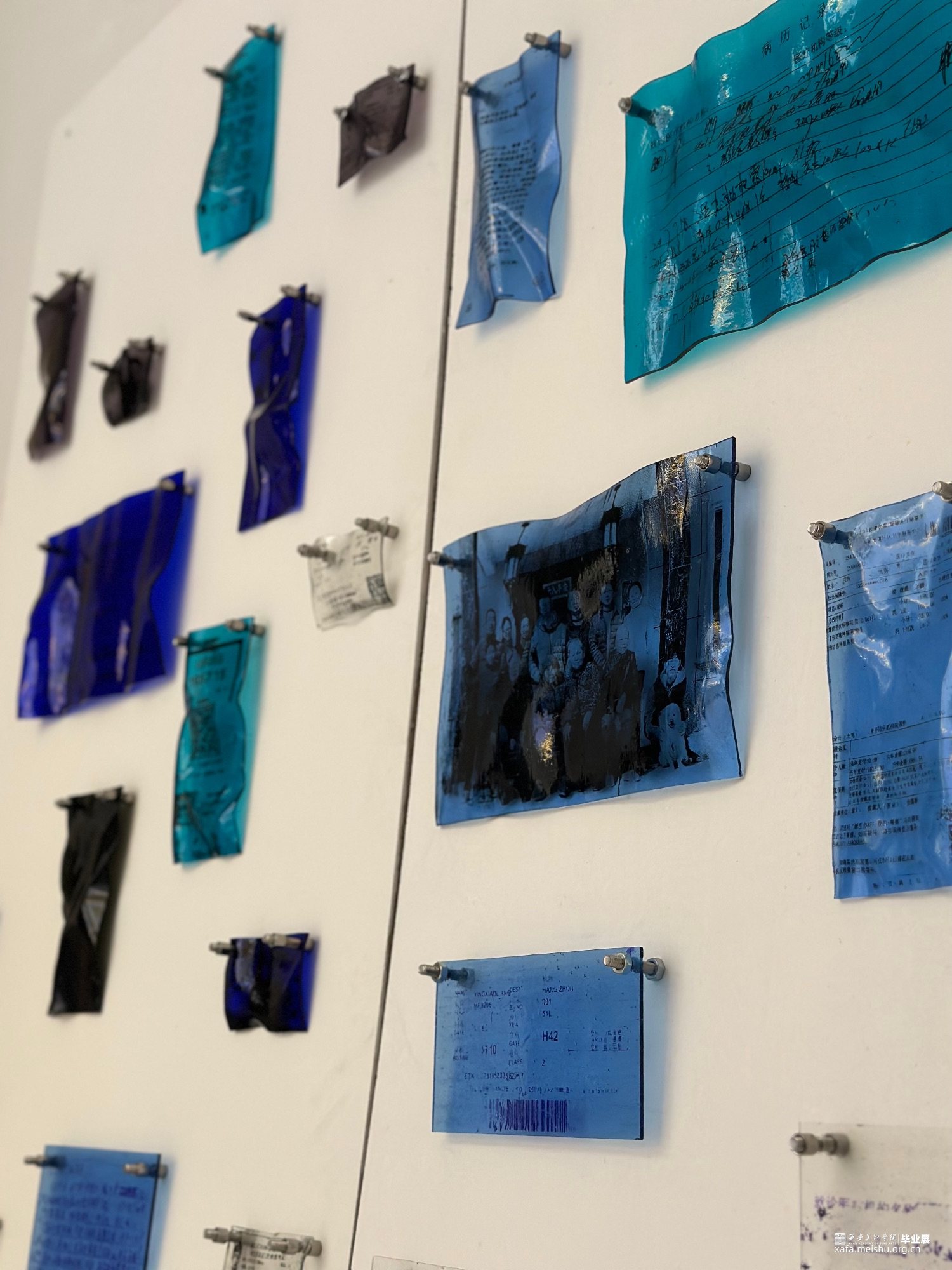 《一些蓝色回忆》作品是对自身成长的回溯,它源于学校、家庭、社会,是家庭庇护下的一方宁静,也是身处社会洪流中的迷惘与克制。家人的病历记录,一次考试失利的准考证,几页如今已不忍直视的日记,印在蓝色静谧闪着光的透明玻璃片上,时间和记忆仿佛平静的海面正在眼前波光闪烁。