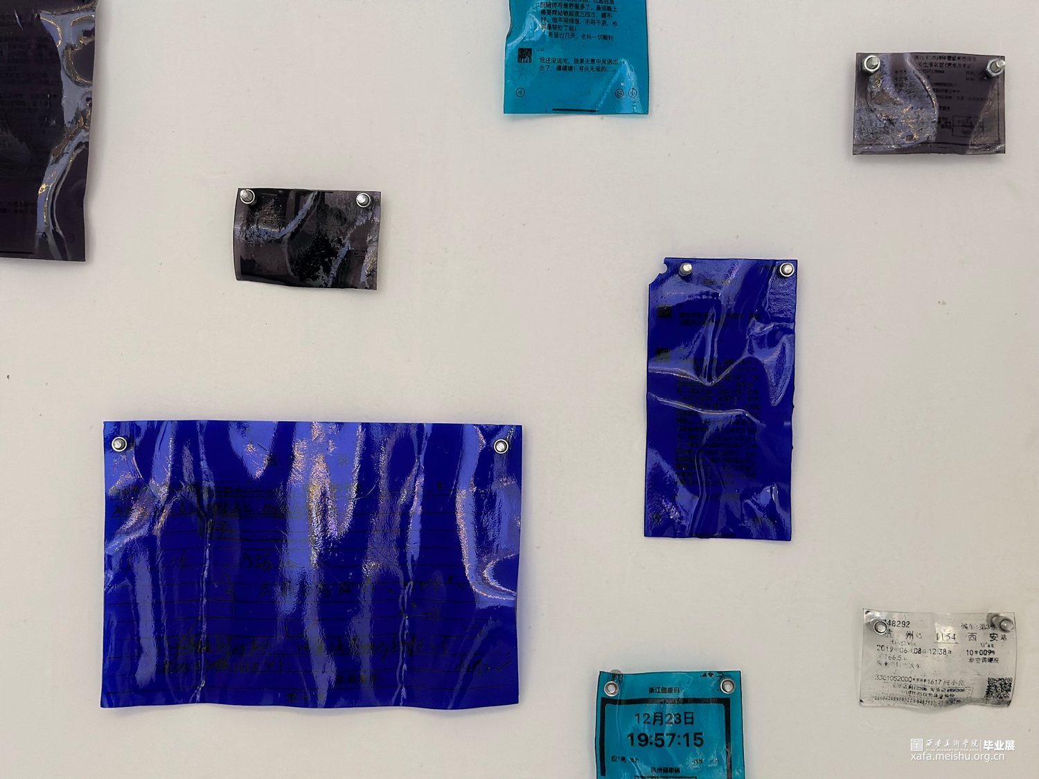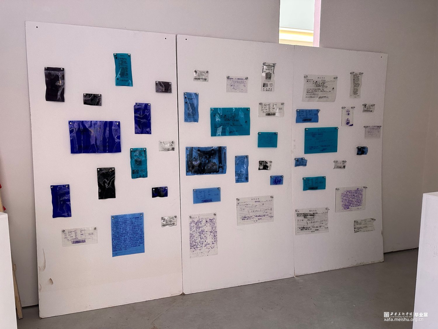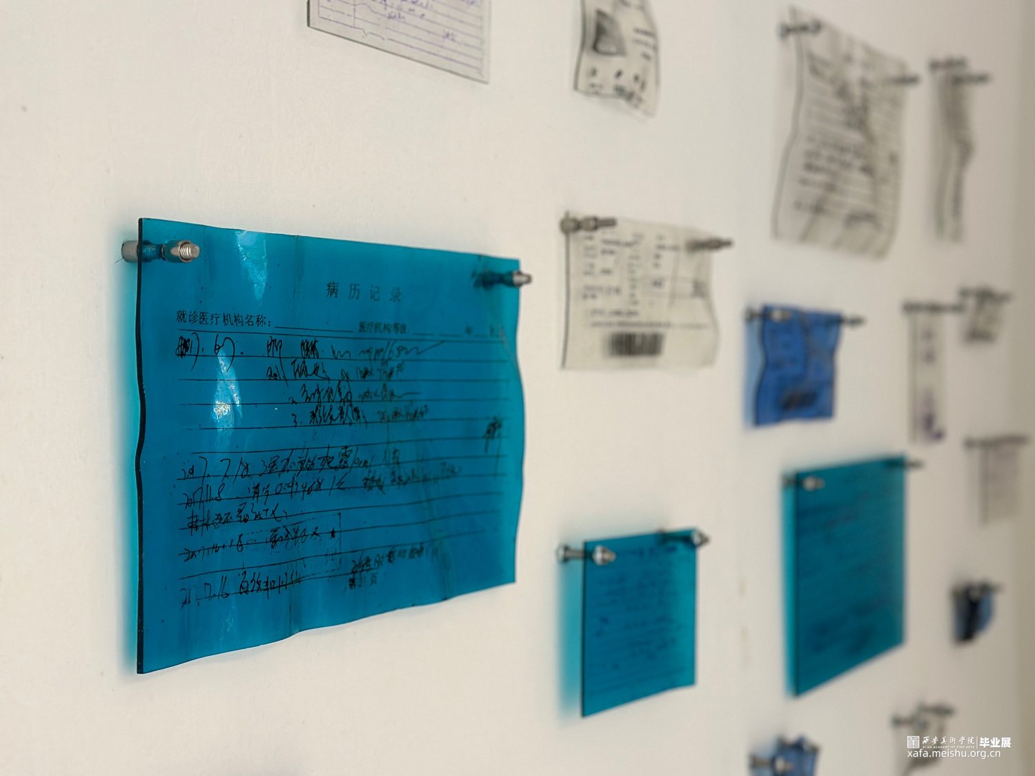 《一些蓝色回忆》作品是对自身成长的回溯,它源于学校、家庭、社会,是家庭庇护下的一方宁静,也是身处社会洪流中的迷惘与克制。家人的病历记录,一次考试失利的准考证,几页如今已不忍直视的日记,印在蓝色静谧闪着光的透明玻璃片上,时间和记忆仿佛平静的海面正在眼前波光闪烁。