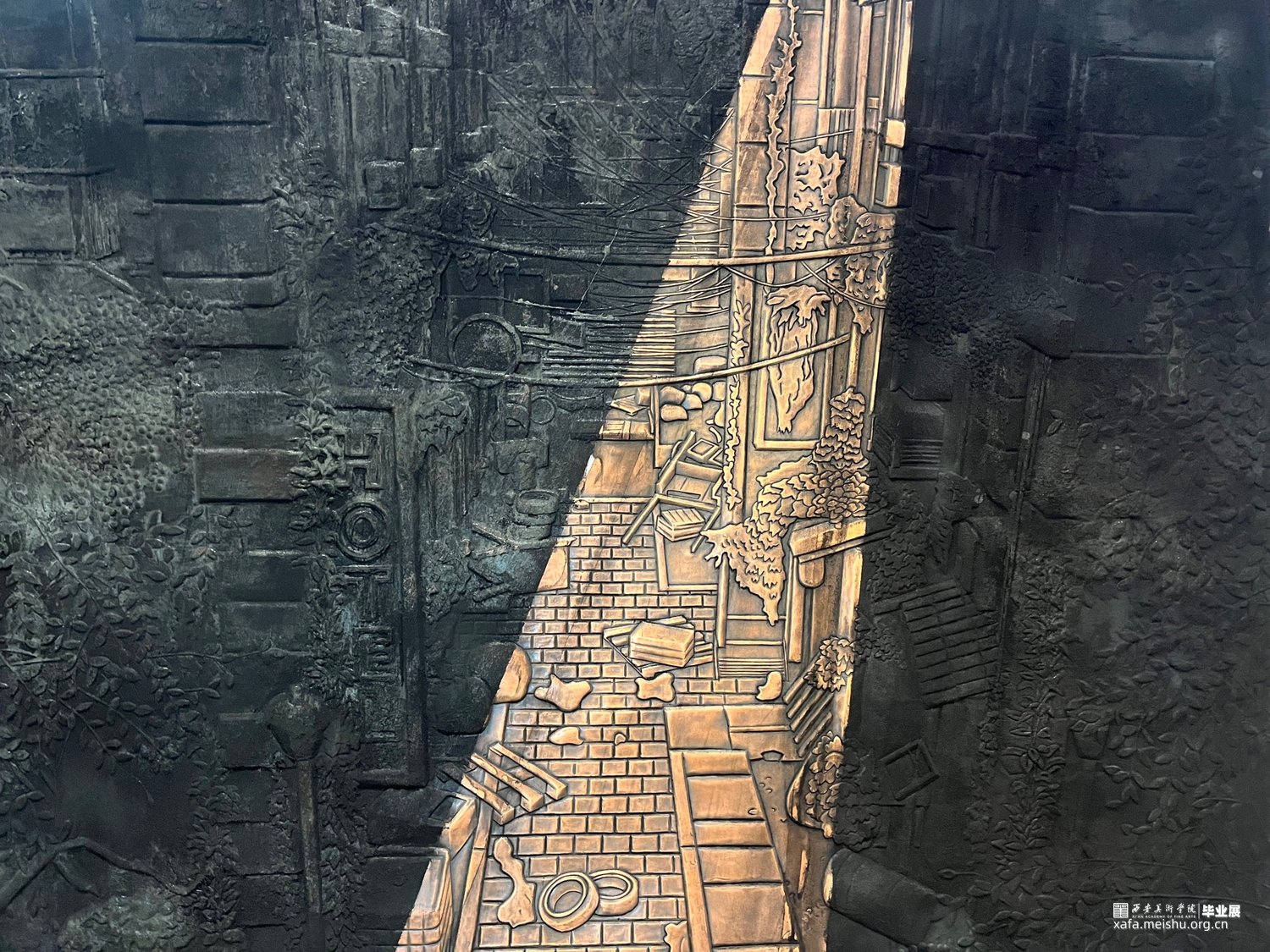 作品名称:《街》作者姓名:王子昂材料:铜板尺寸:140*180cm指导老师:高蕾、徐立乾、张潇娟、孙鹤来、李喆作品简介:灵感来源于梦里熟悉的老街,早晨起来一抹阳光照在脸上,也打在了记忆中的街道上。作者总是梦到的同一个场景,所以用锻铜工艺将其复刻出来,连同记忆中的光照一并呈现。整个作品因为这束光线变得立体而细腻,呈现出每个人心中熟悉而又模糊的难忘梦境。