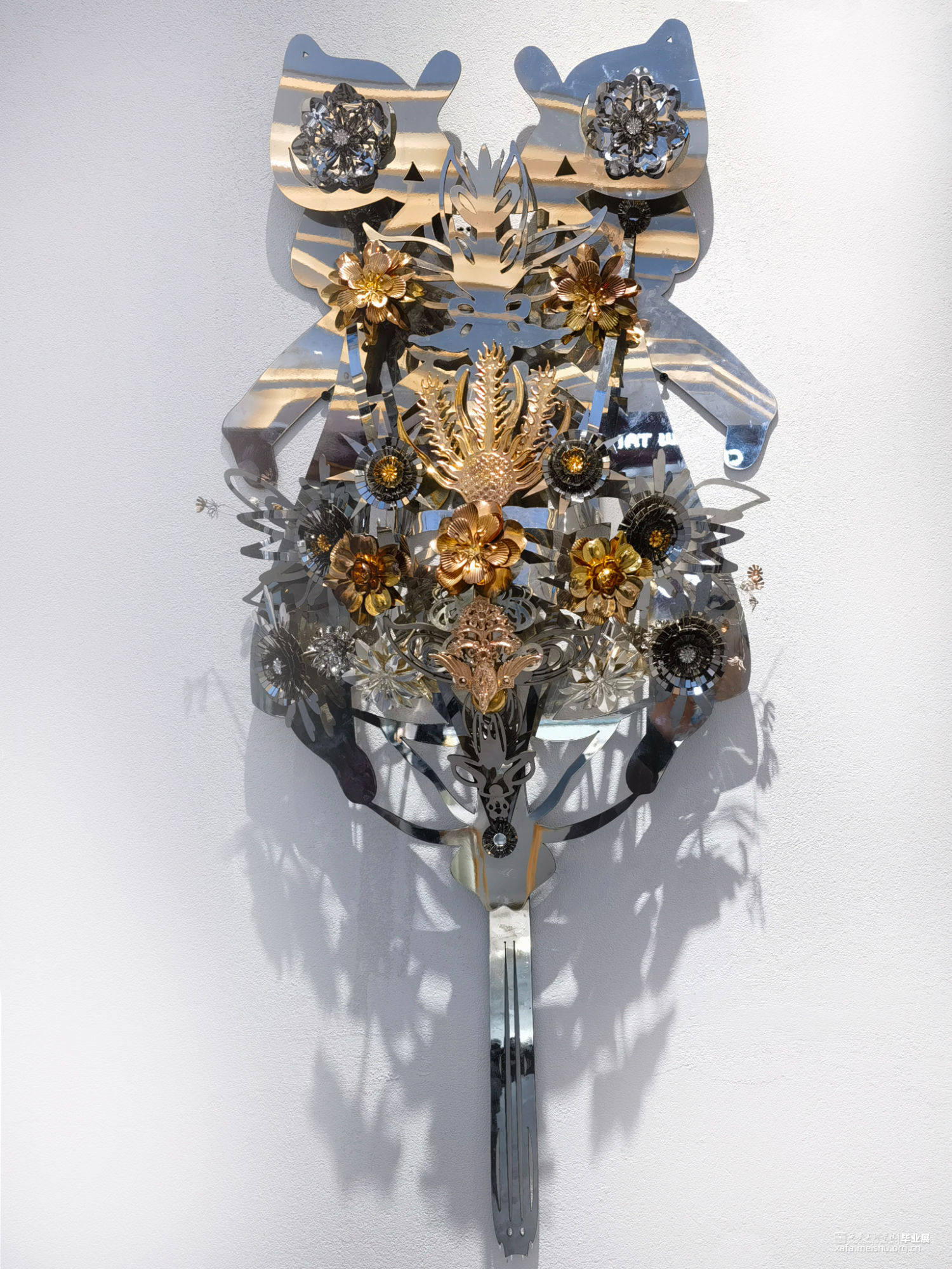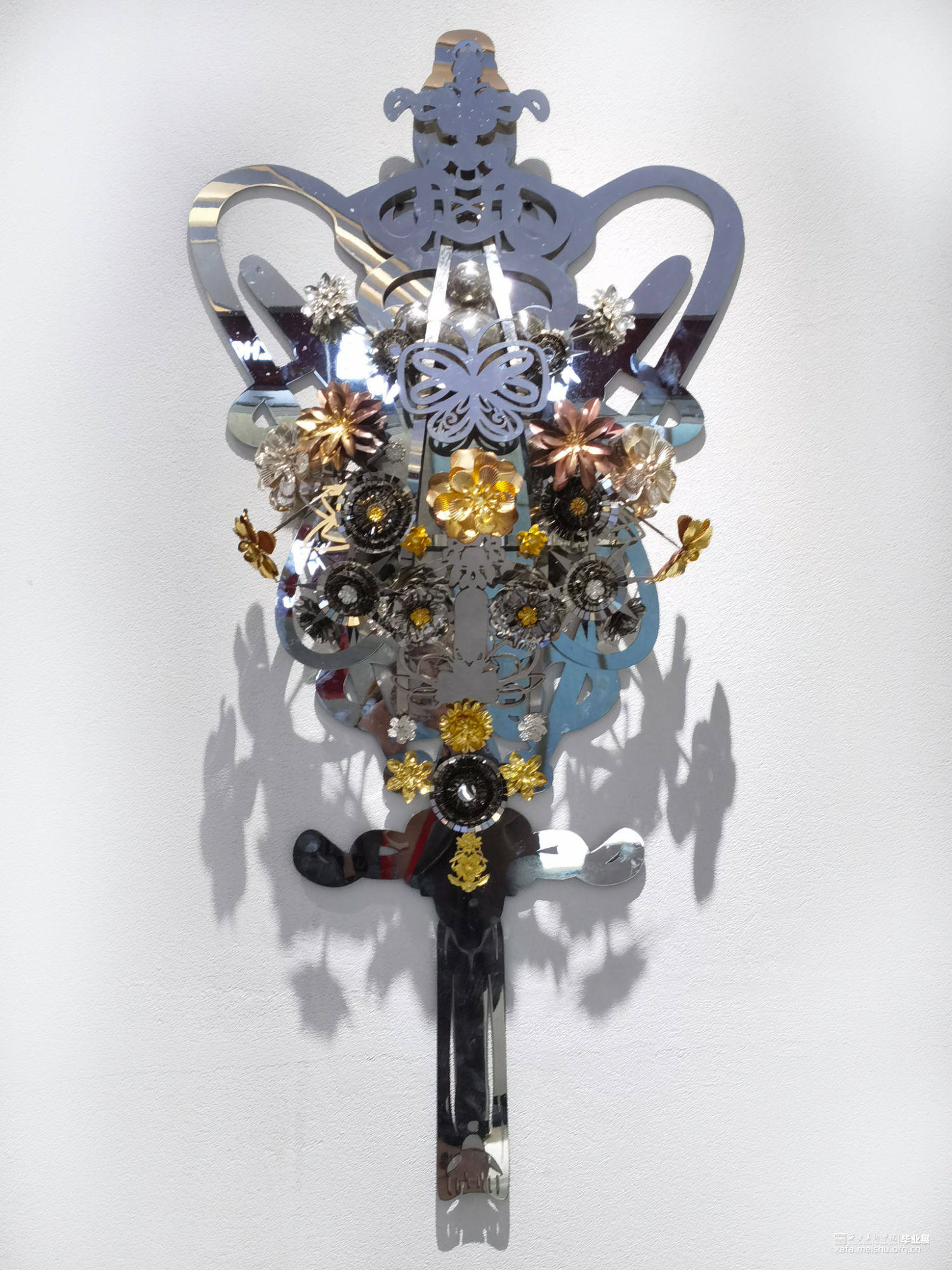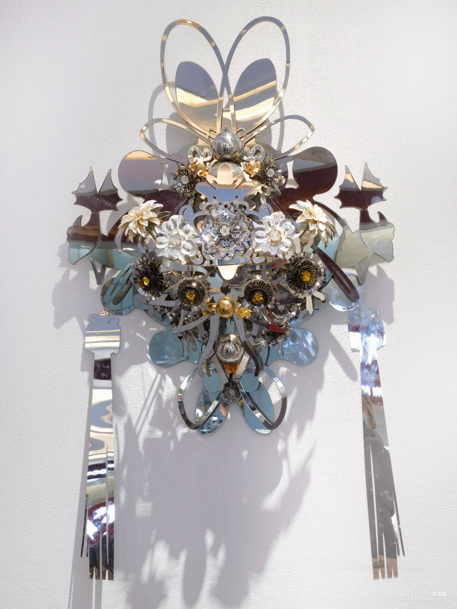 提取面花中造型元素进行重构以及再设计,区别于面花中最主要的材料“面”,结合镜面不锈钢去制作和表现作品,借用镜面反射效果试作品呈现出波光粼粼的效果。