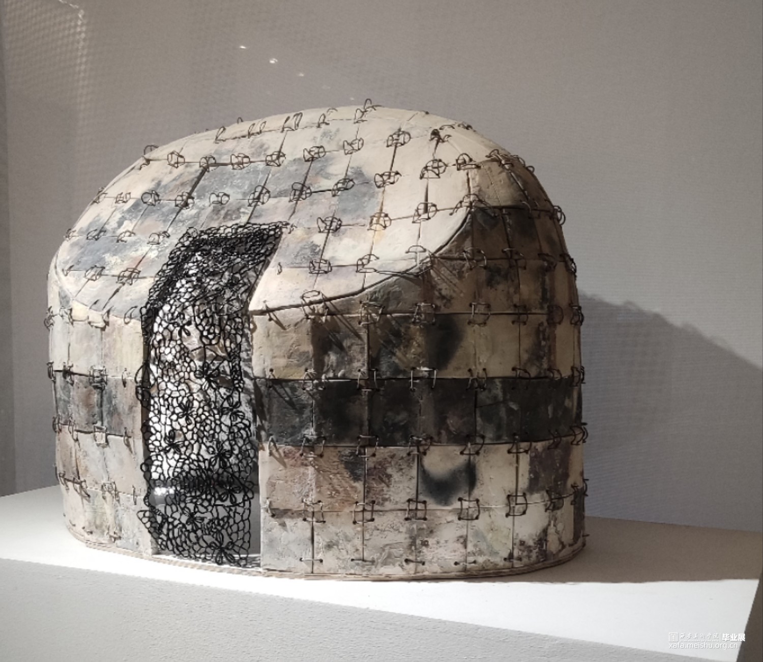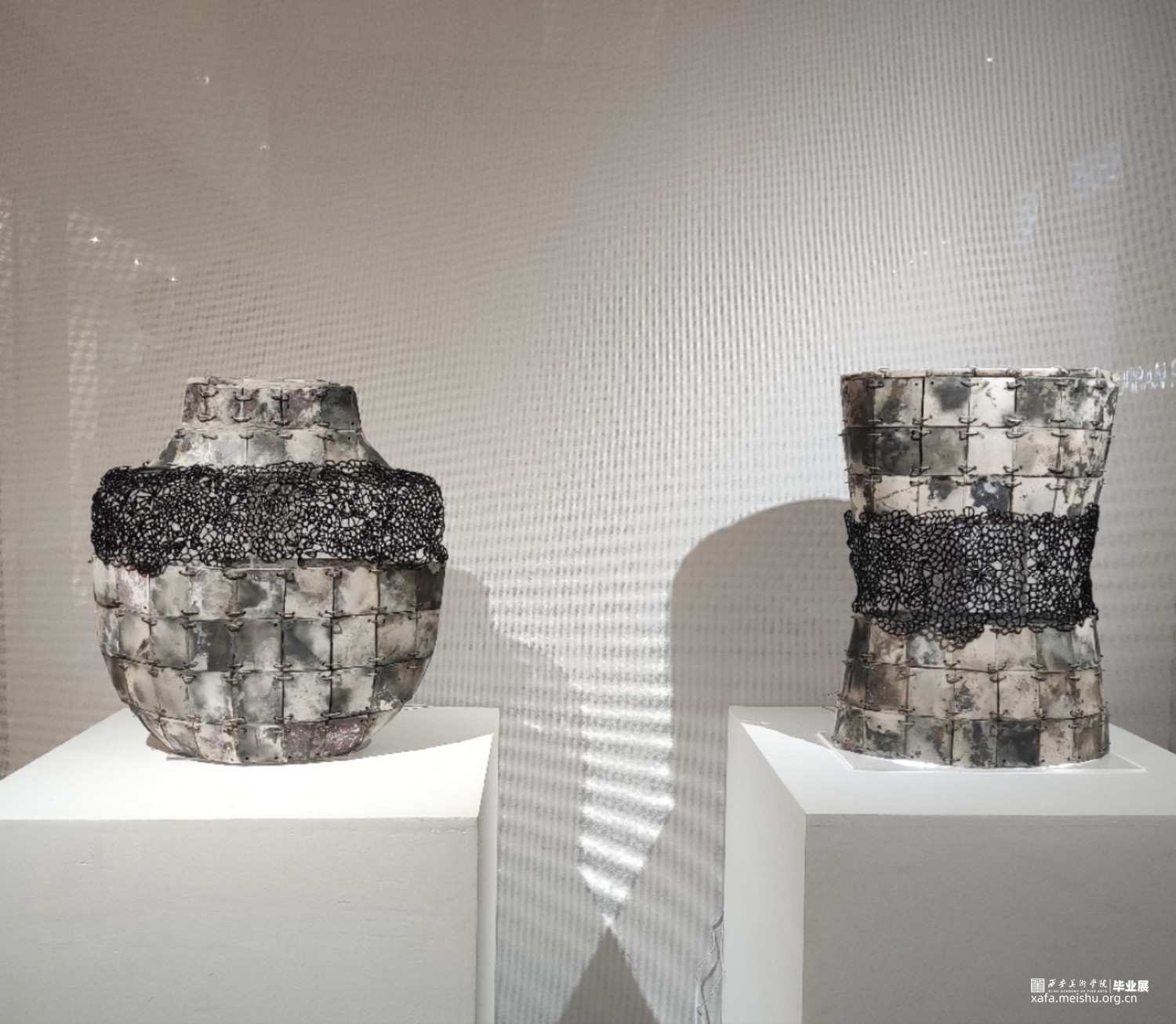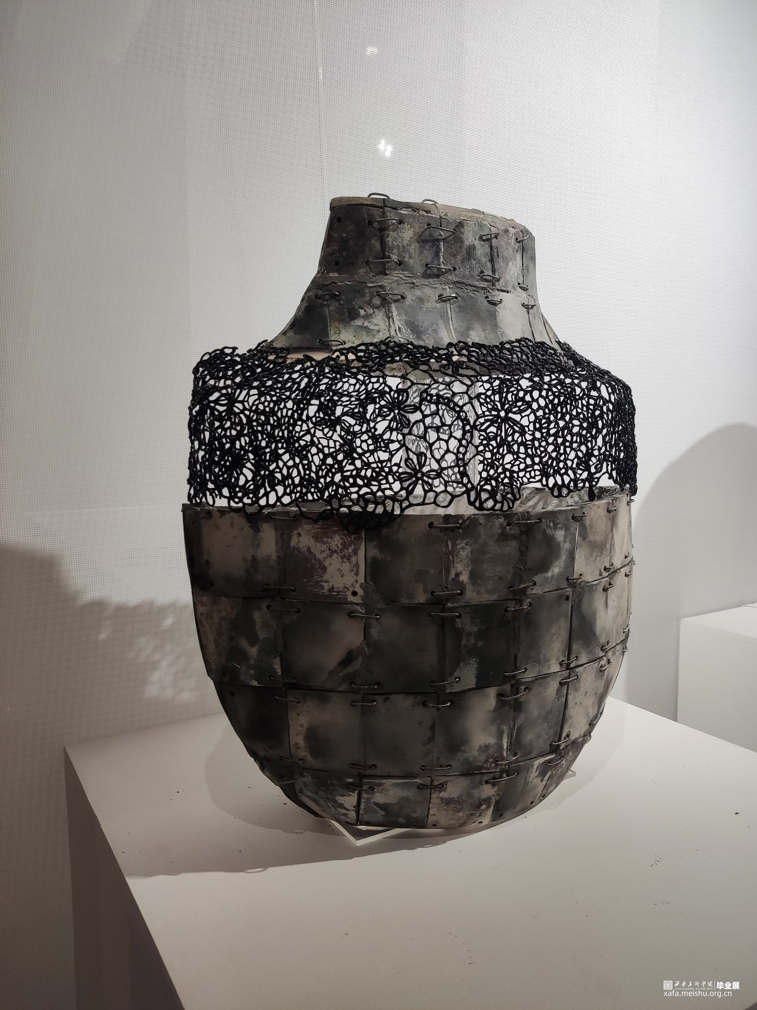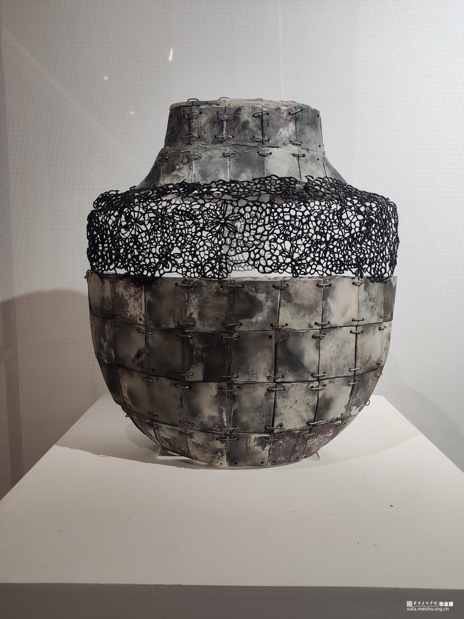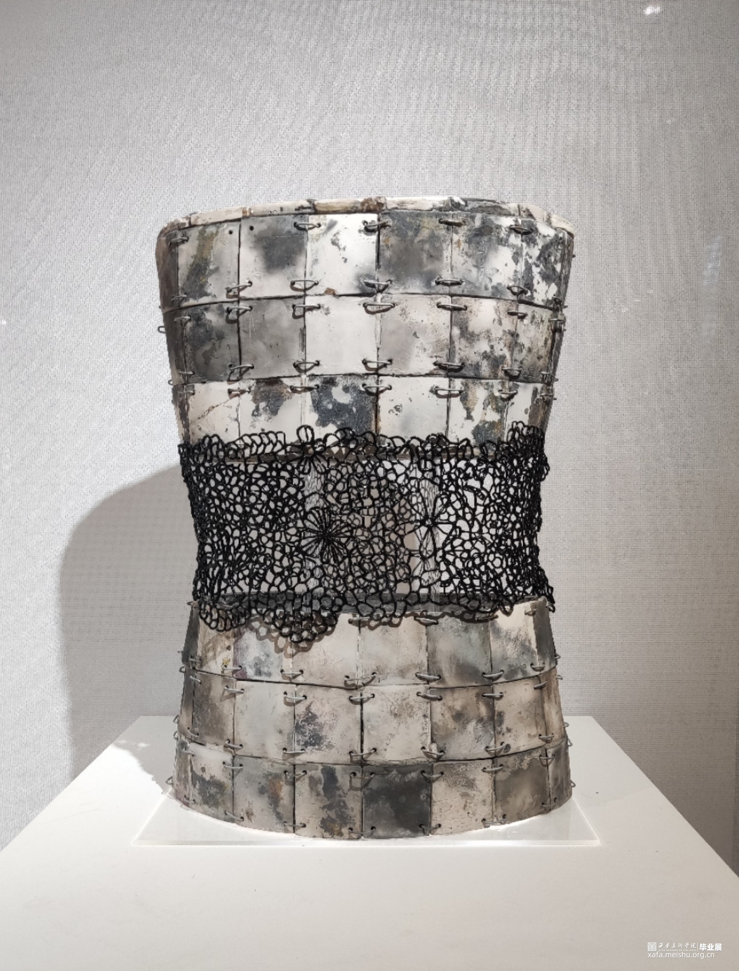 蕾丝常被定义于女性特有服饰材料,附着于身体。女性在传统上附属于于家庭、男性、孩子。提取蕾丝这一元素,将蕾丝作为一种被定义的存在,延伸到女性的处境。熏烧的陶瓷的粗犷厚重与灯工玻璃的华丽细腻形成对比,足以展现出强烈的视觉冲突,熏烧工艺的陶瓷盔甲敦厚,更多象征着男性语言。而用灯工玻璃制成的蕾丝轻盈华丽,去代表女性形象。