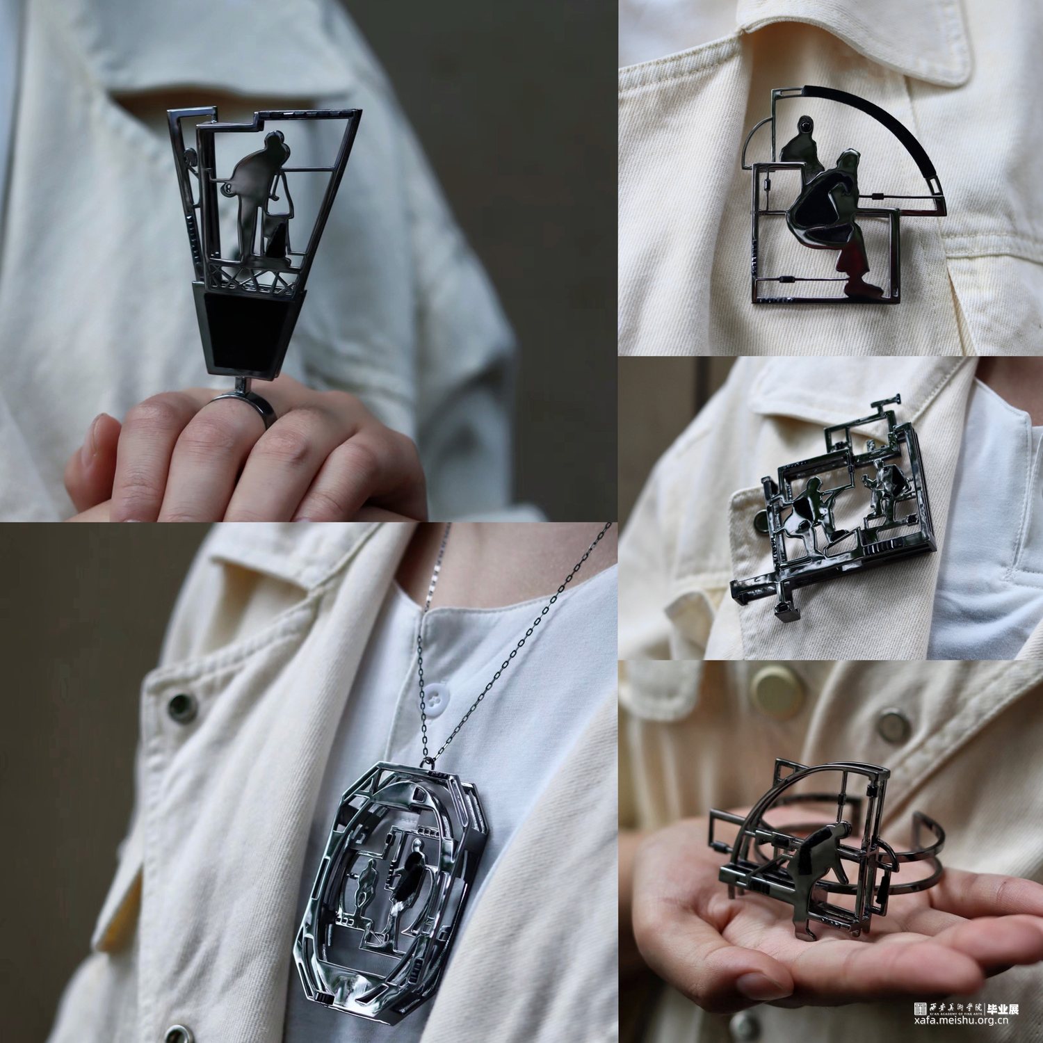 祖父母之间的感情一直打动着我,他们的爱写在平淡里,注释在生活的点点滴滴。作品用叙事性的创作手法展现了爱人之间的“朝朝暮暮”,通过首饰设计来承载和传递个人情感,凸显温婉细腻的意境。作品材料运用金属,石头等,涵盖电镀,镶嵌,植绒多种工艺,将材料、工艺与造型语言相互支撑,探索当代叙事性首饰更多的可能性。