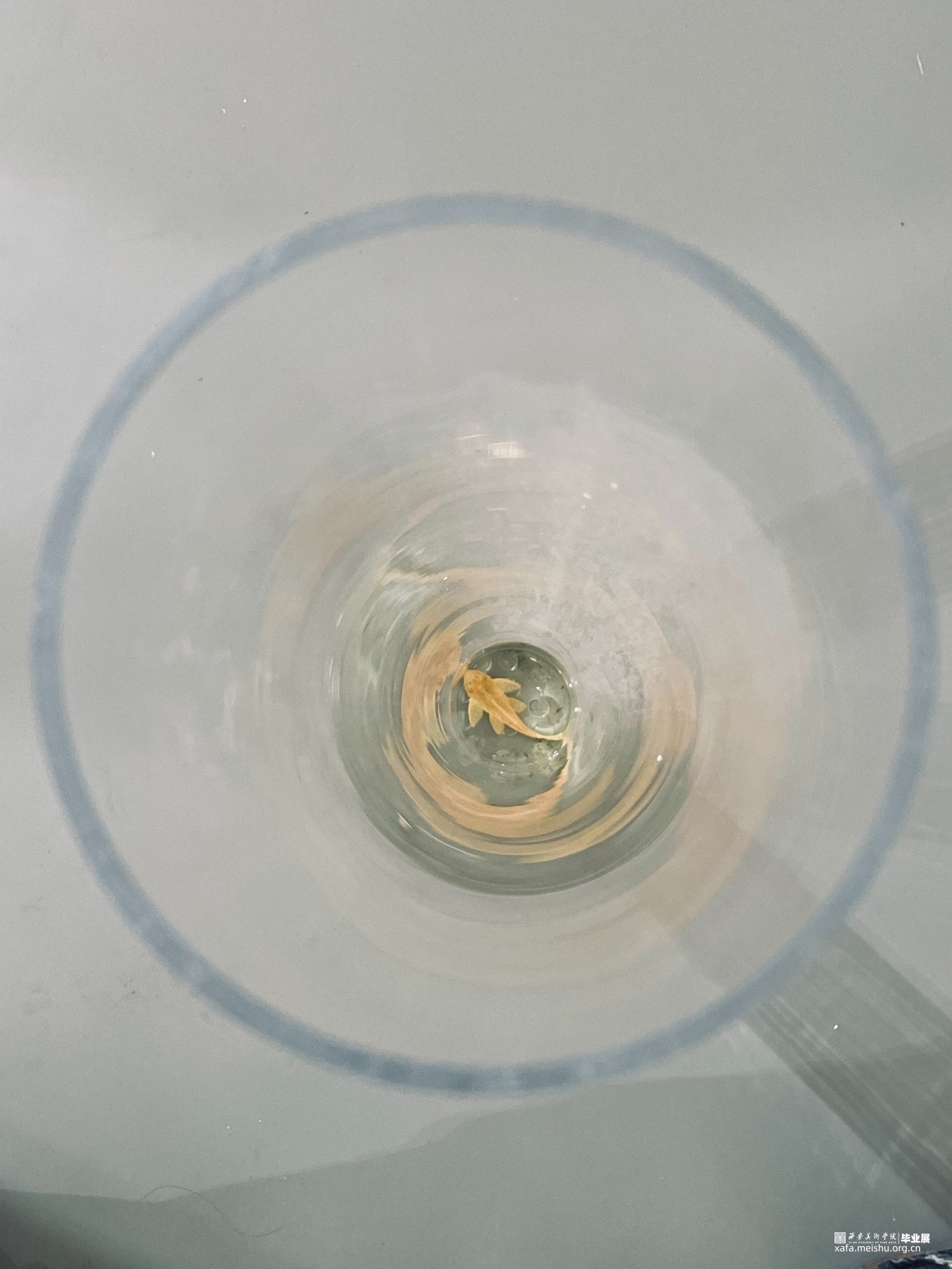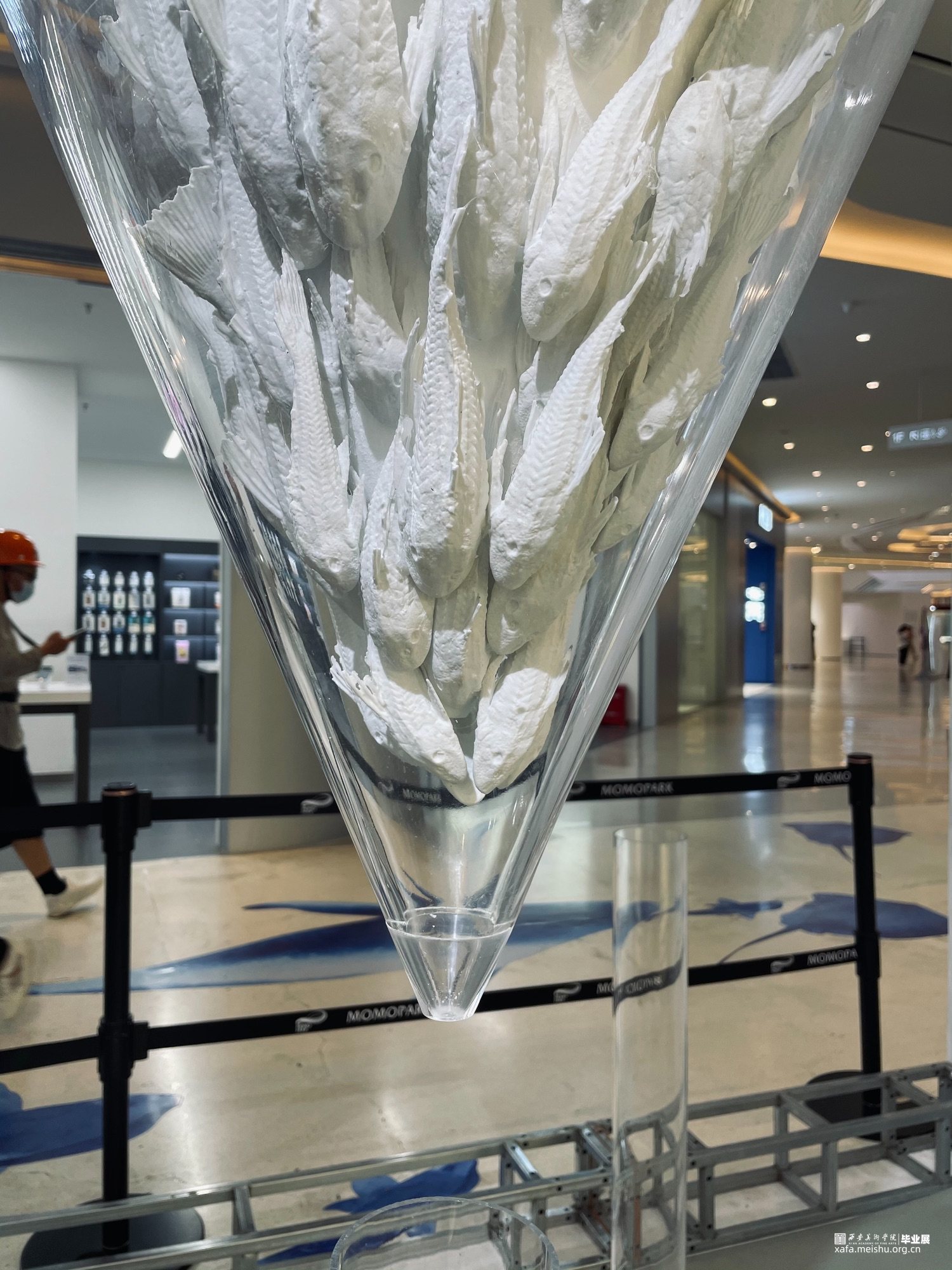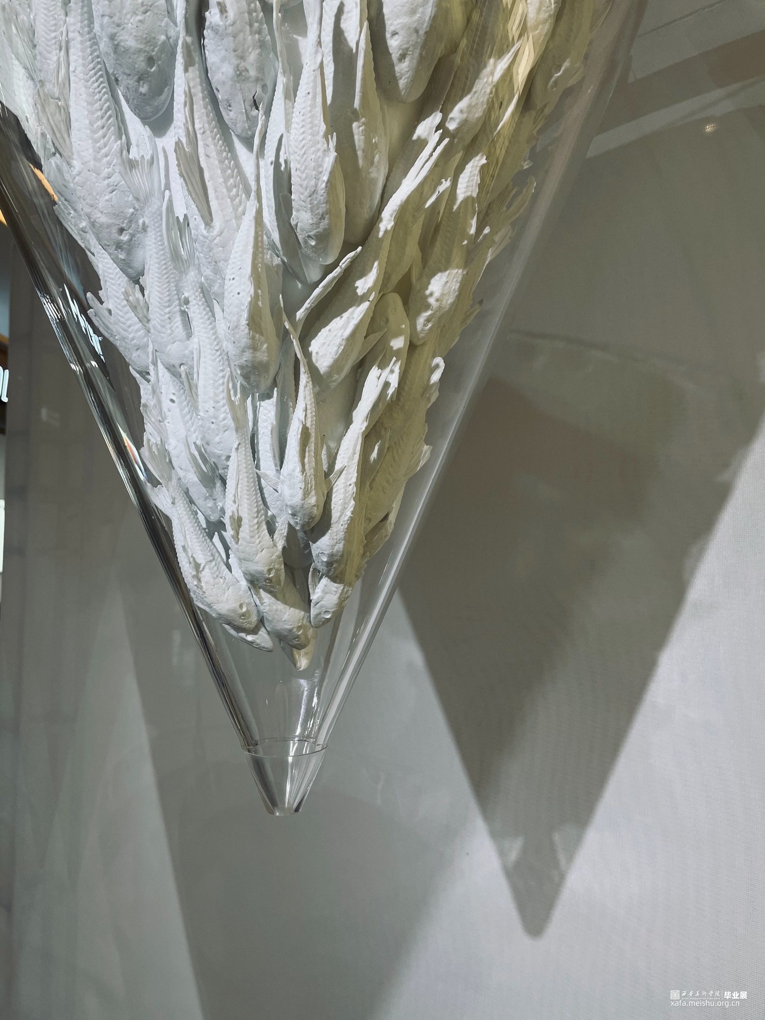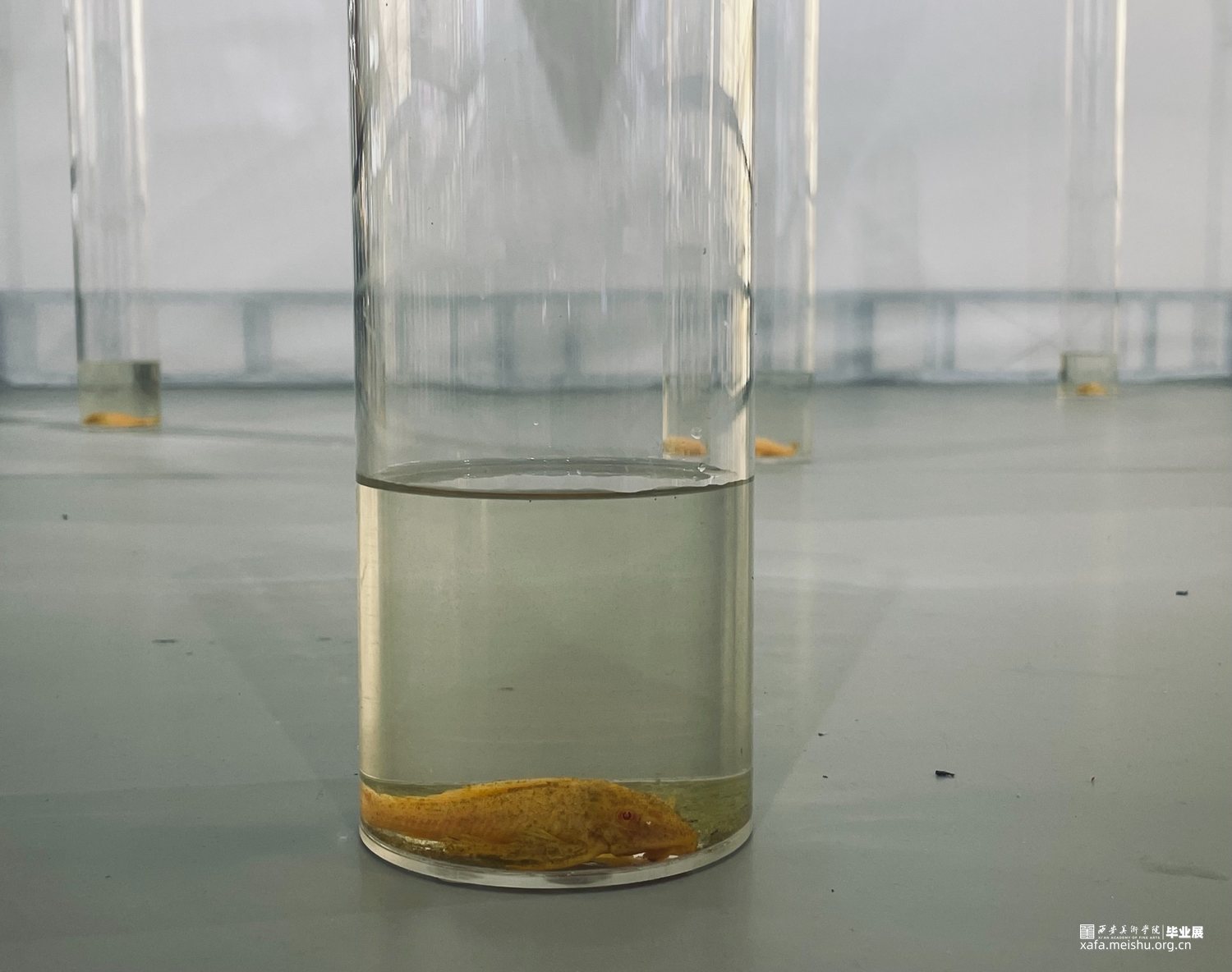 隐藏在我们生存空间当中的苦难、机遇、疾病、快乐正在向白色陶瓷清道夫滴落。白色清道夫本不存在,它是我所创造的,那是一个个纯净的人类个体,随着时间的推移逐渐被染黑,其自身的属性也随之向真实的黑色清道夫所转移,就像为了生存所产生的无休止的欲望,无数被染黑的陶瓷清道夫正在趋之若鹜地涌向装有清澈水源和金色清道夫所在的狭窄容器,黑色的液体顺着倒锥形容器底部的孔洞慢慢滴入柱形容器,其终将被完全注满,清澈水域中的金色清道夫也将回归尘土。