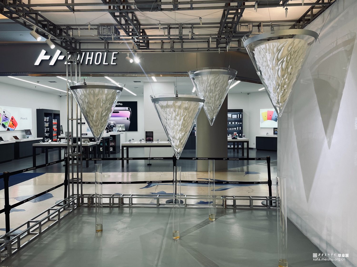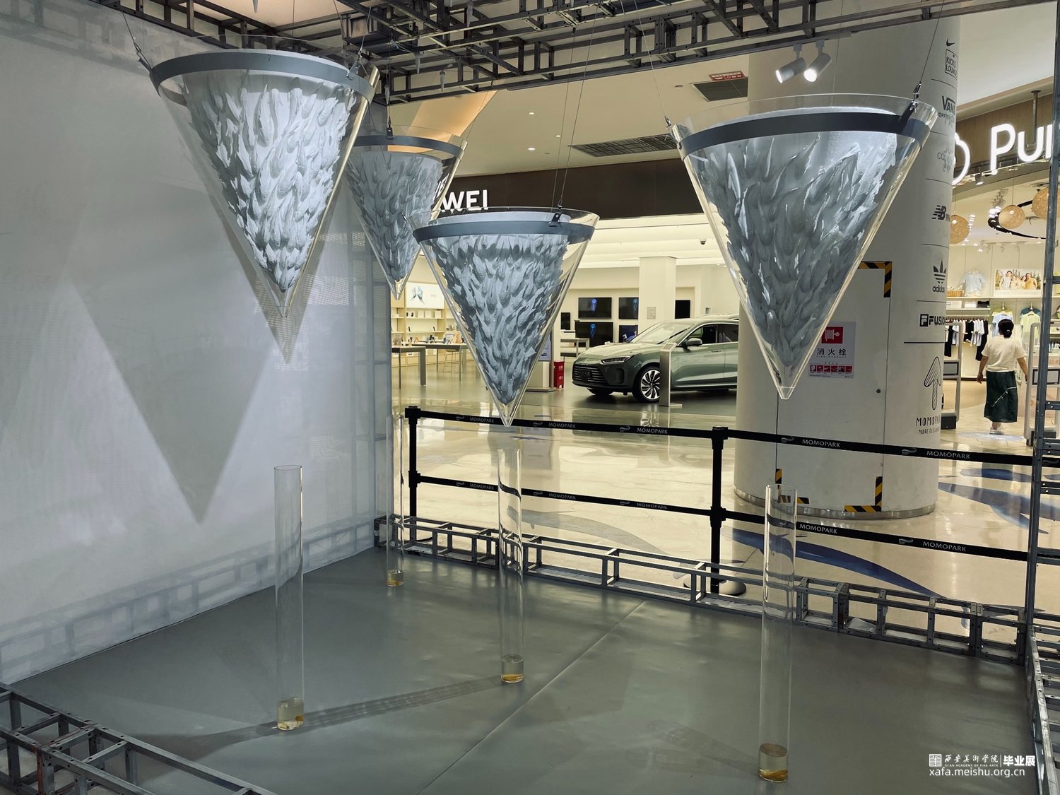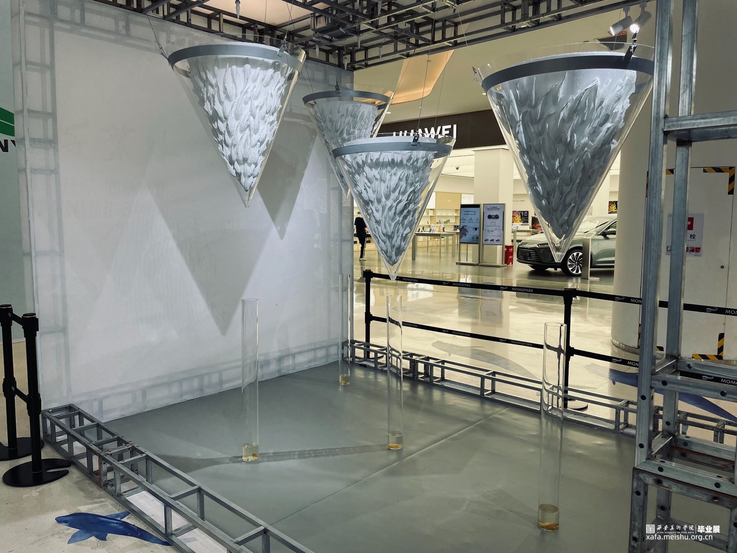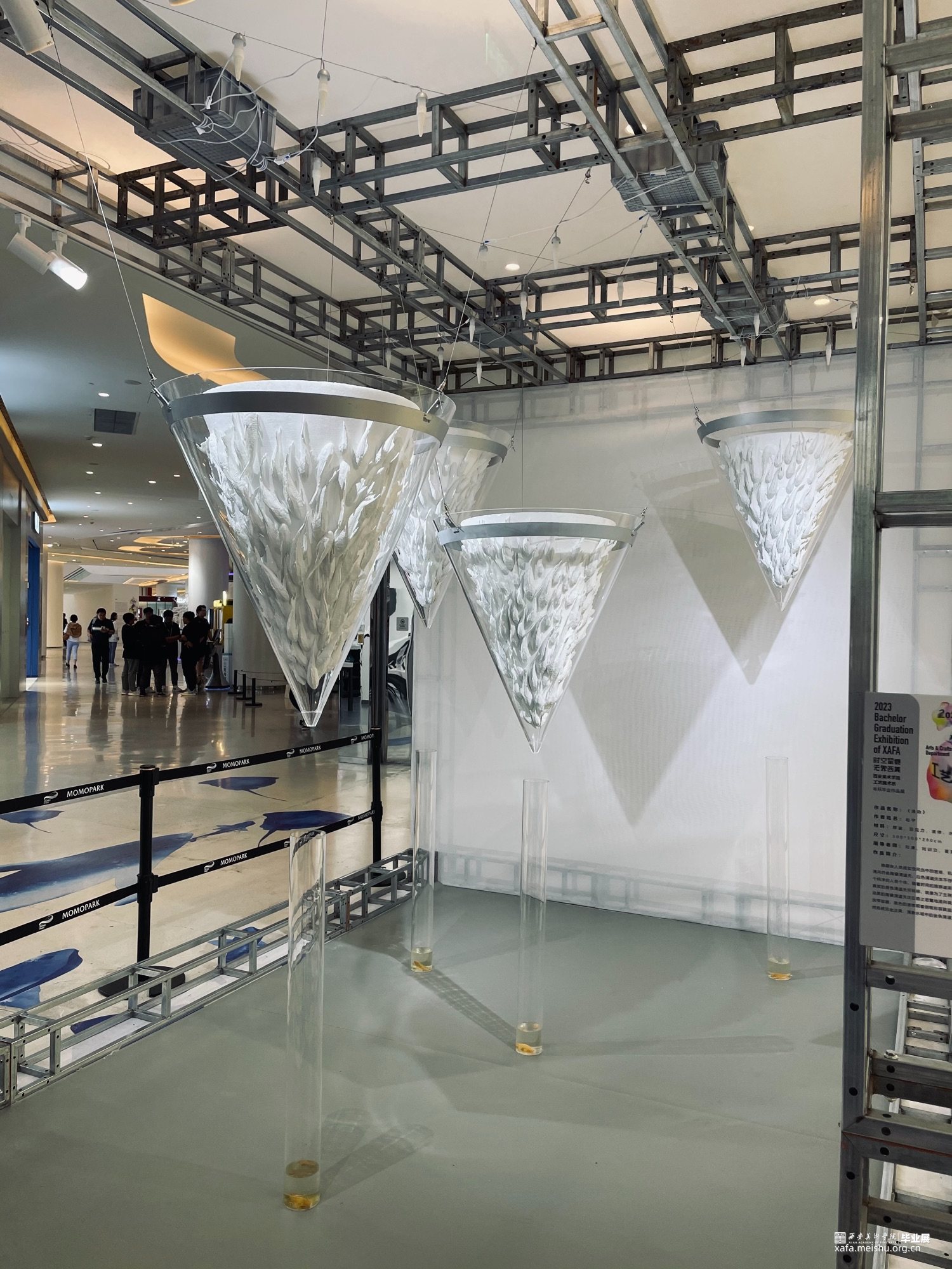 隐藏在我们生存空间当中的苦难、机遇、疾病、快乐正在向白色陶瓷清道夫滴落。白色清道夫本不存在,它是我所创造的,那是一个个纯净的人类个体,随着时间的推移逐渐被染黑,其自身的属性也随之向真实的黑色清道夫所转移,就像为了生存所产生的无休止的欲望,无数被染黑的陶瓷清道夫正在趋之若鹜地涌向装有清澈水源和金色清道夫所在的狭窄容器,黑色的液体顺着倒锥形容器底部的孔洞慢慢滴入柱形容器,其终将被完全注满,清澈水域中的金色清道夫也将回归尘土。