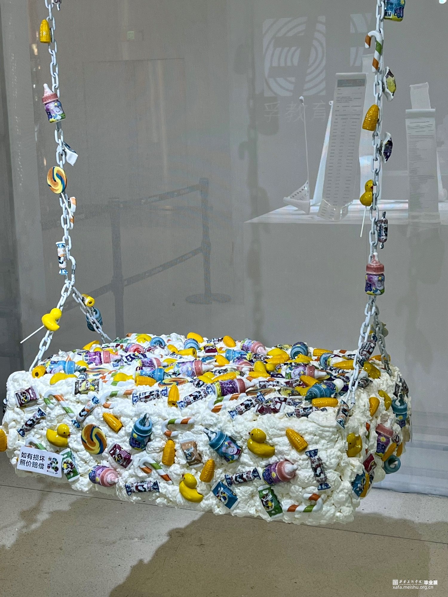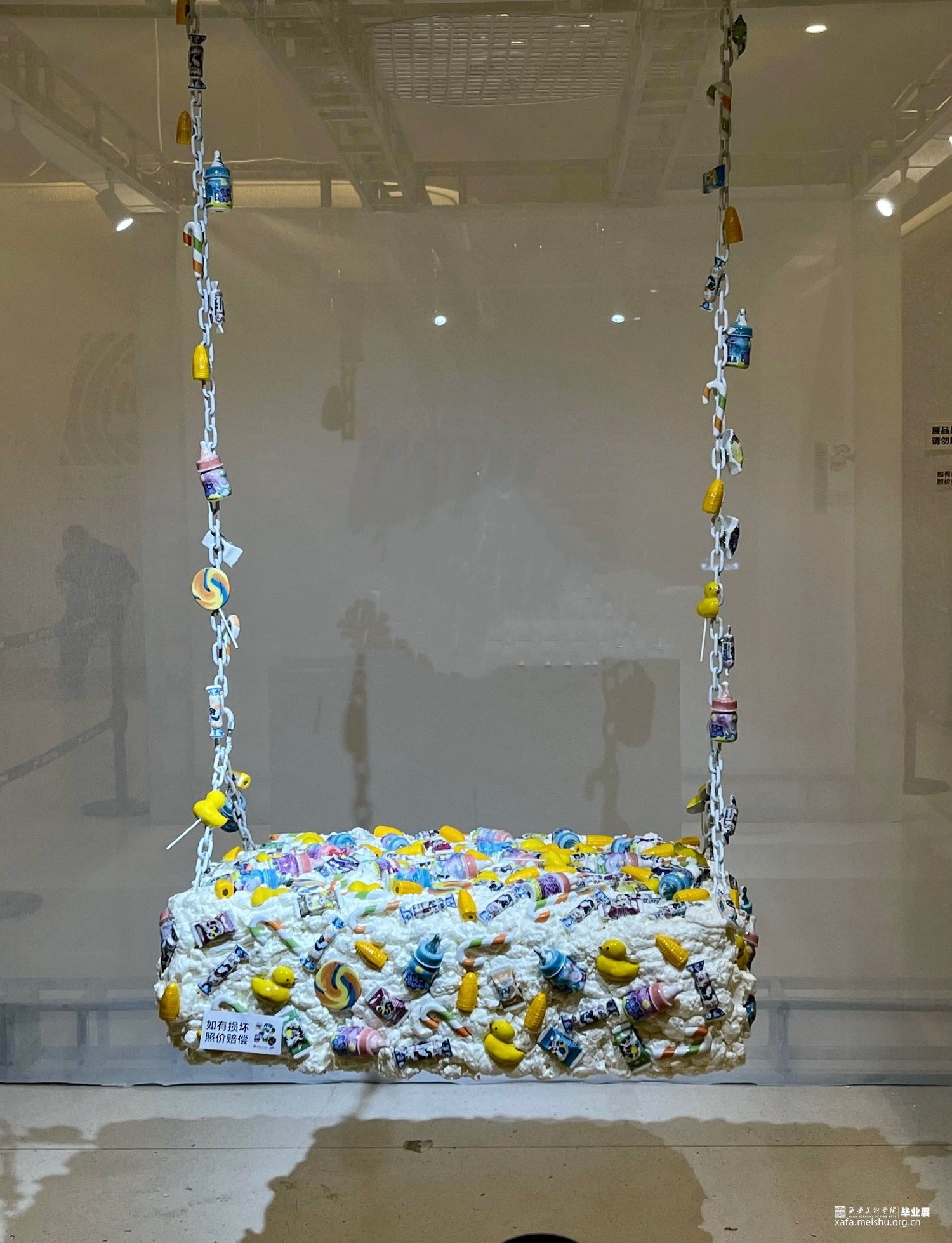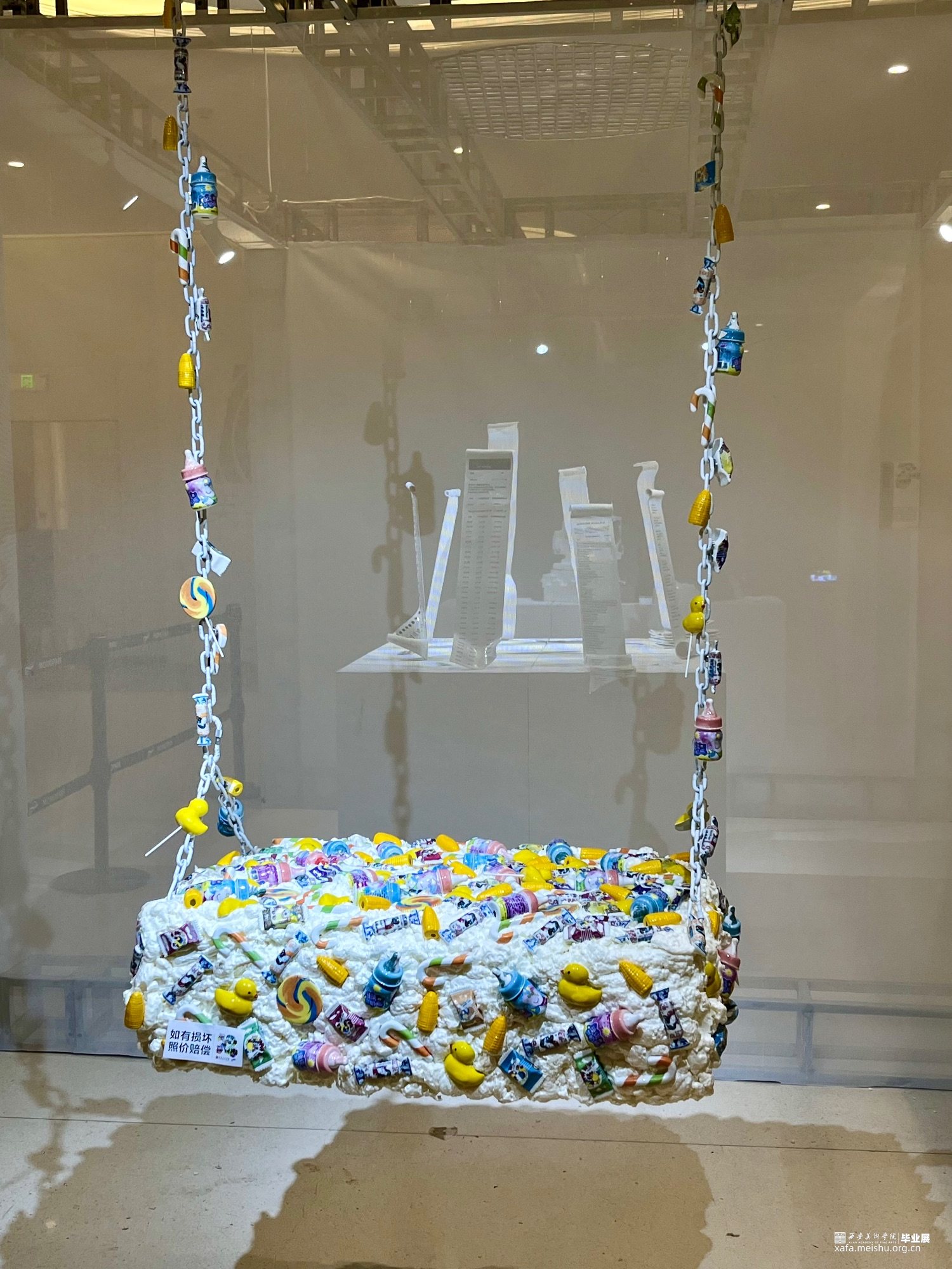 童年,犹如梦一般,像甜甜的糖果。作品以童年为主旨,通过搜集一些童年比较典型的具有年份代表的糖果来表达对童年的回忆。秋千,幼年时最好的陪伴,作品将甜甜的糖果与秋千相结合,做一个糖果秋千,来回忆美好的童年,作品通过悬挂在空中来展陈,采用粘贴手法将糖果粘在秋千上,希望观者看到作品会回忆起童年属于自己的那一份快乐!