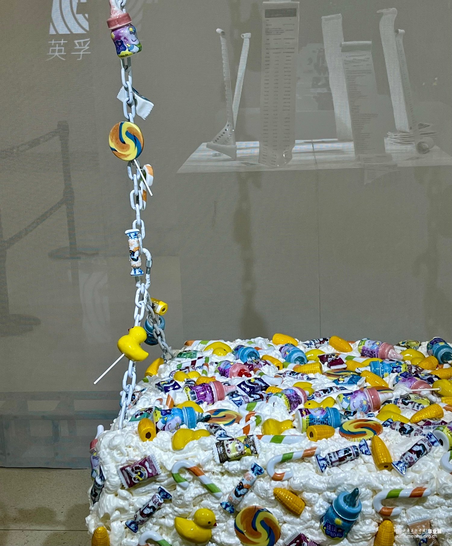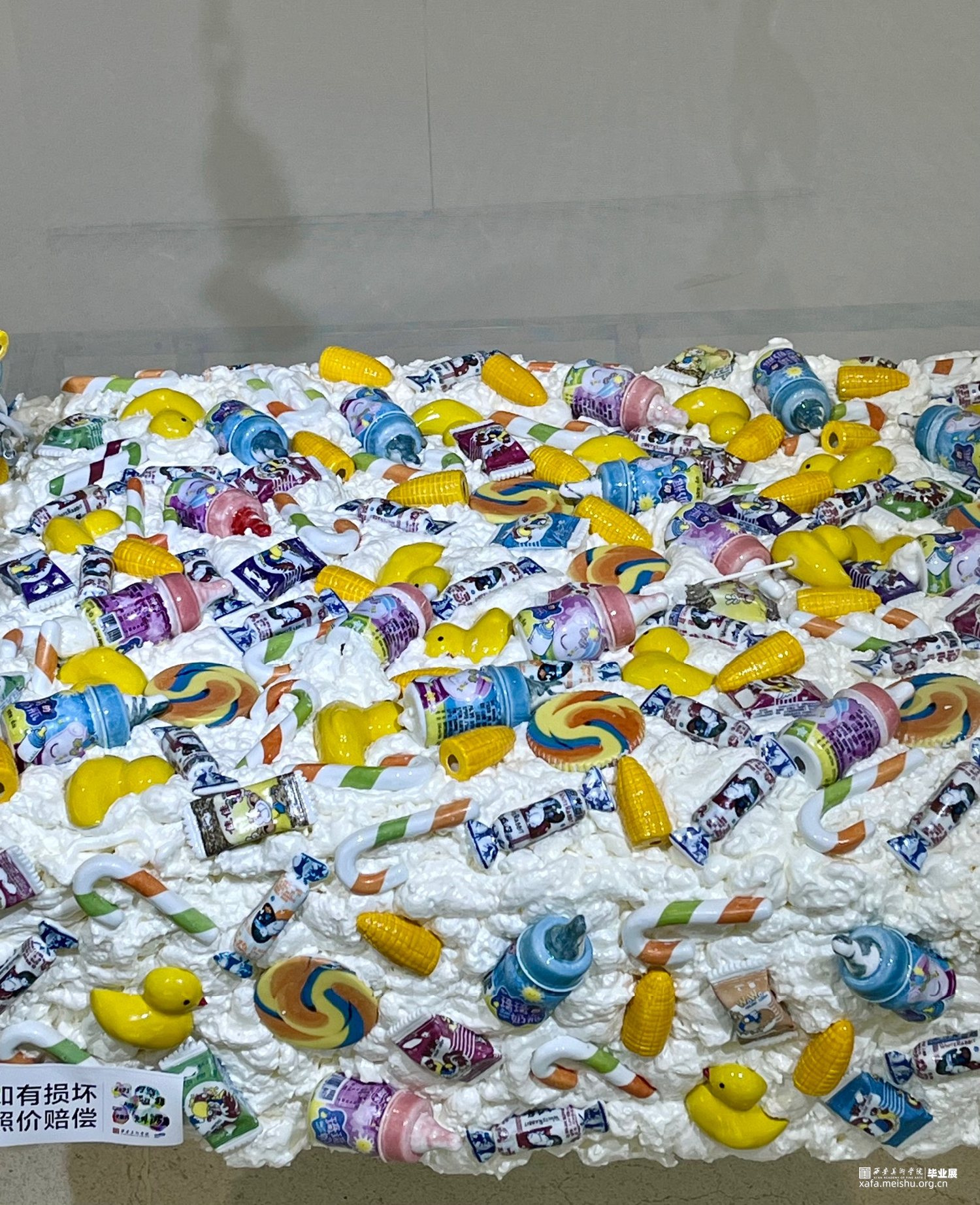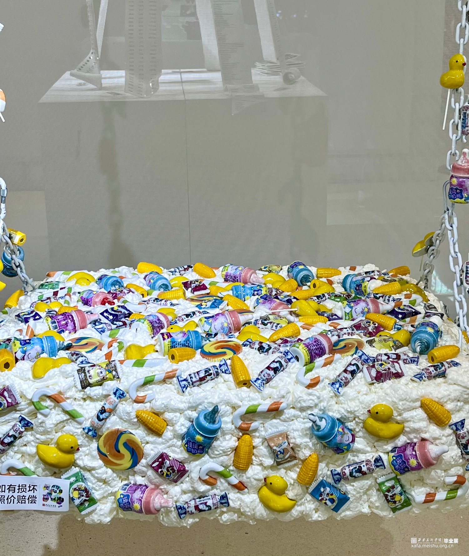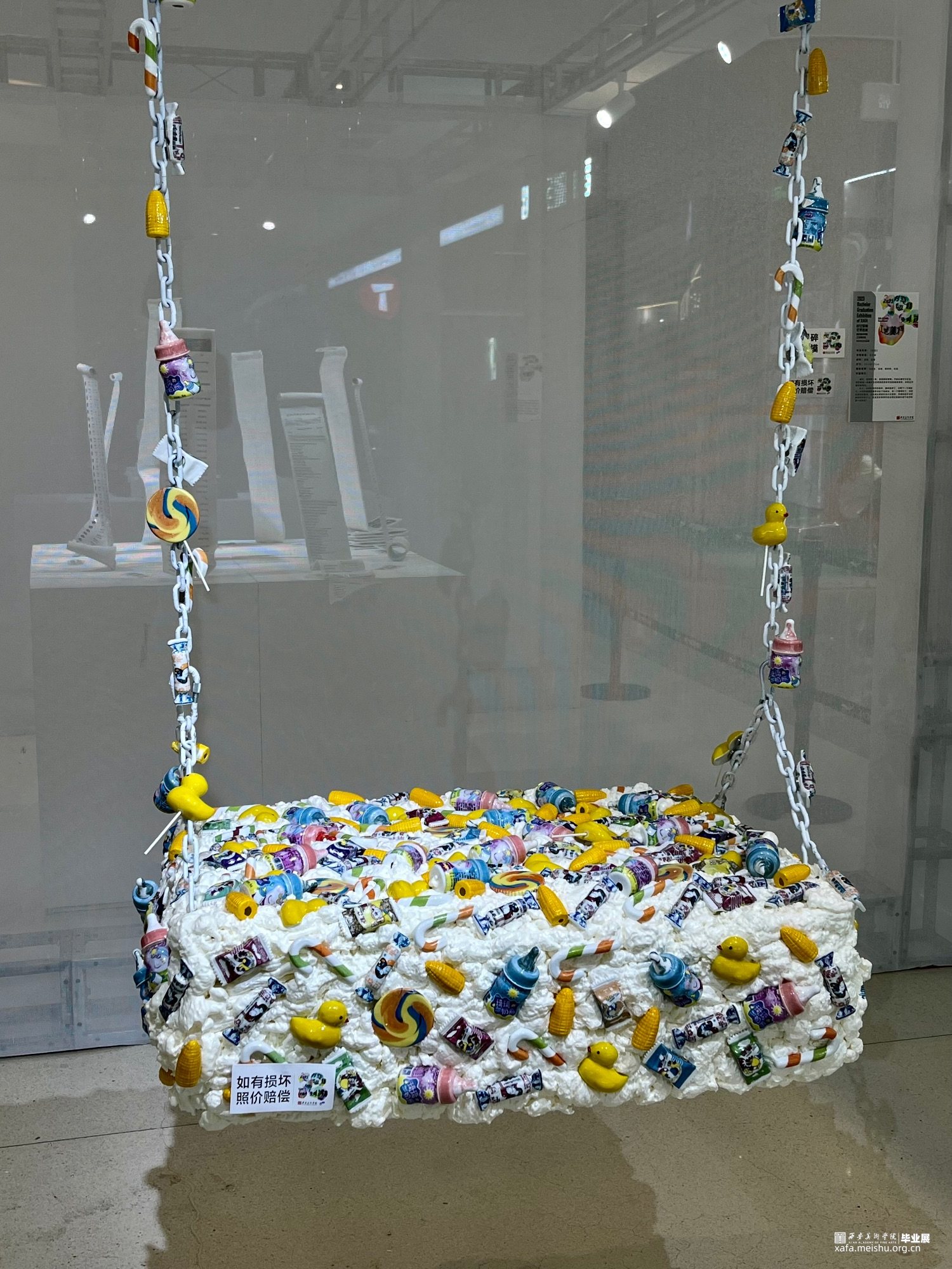 童年,犹如梦一般,像甜甜的糖果。作品以童年为主旨,通过搜集一些童年比较典型的具有年份代表的糖果来表达对童年的回忆。秋千,幼年时最好的陪伴,作品将甜甜的糖果与秋千相结合,做一个糖果秋千,来回忆美好的童年,作品通过悬挂在空中来展陈,采用粘贴手法将糖果粘在秋千上,希望观者看到作品会回忆起童年属于自己的那一份快乐!
