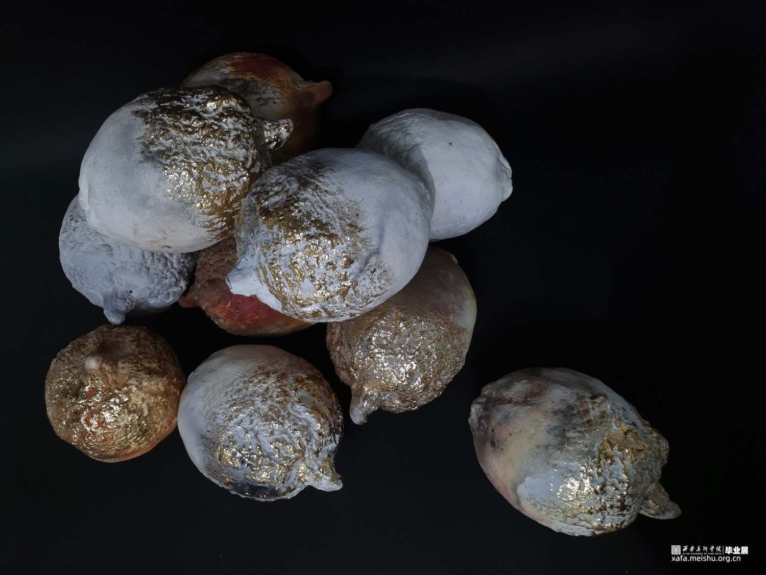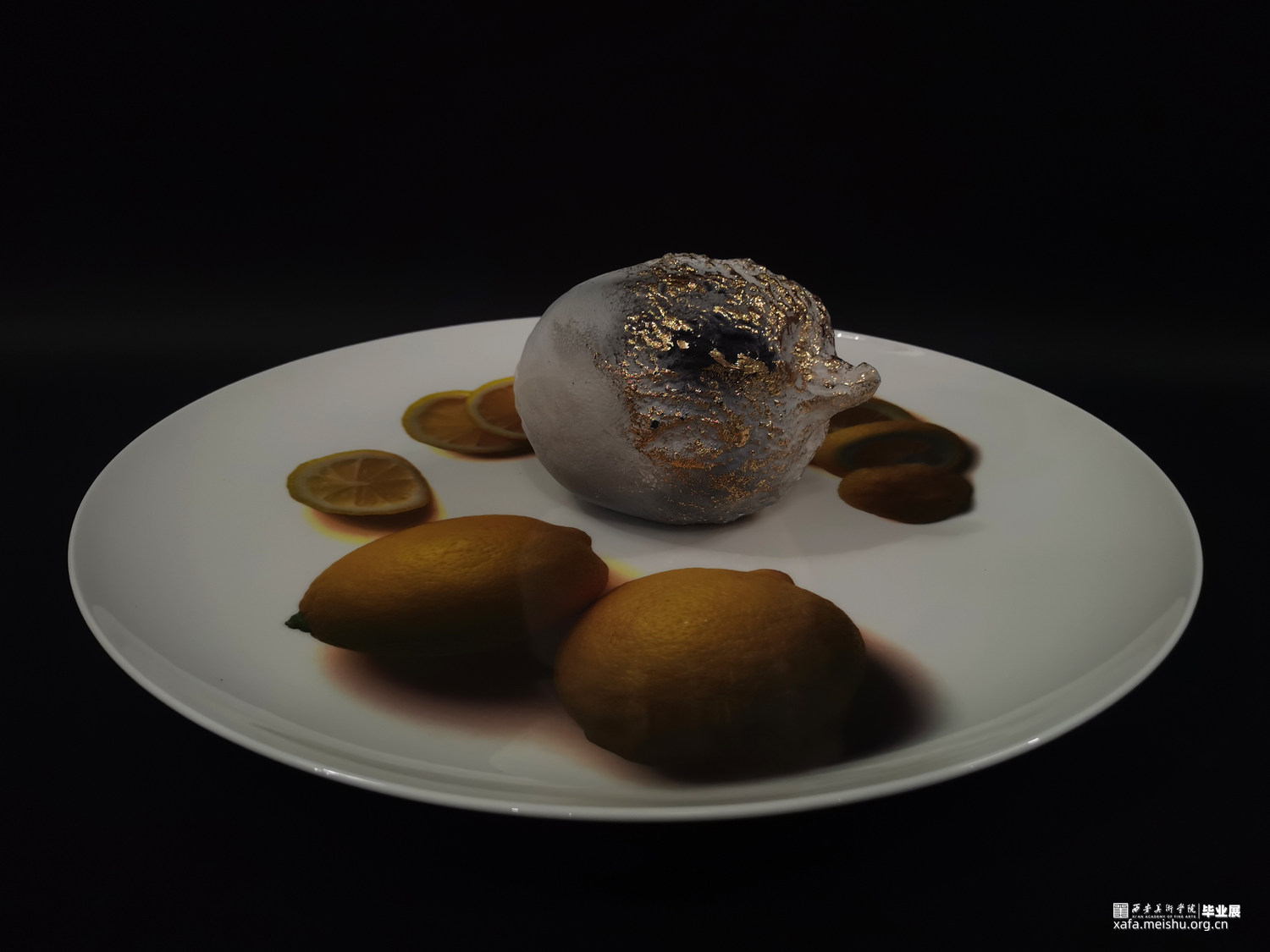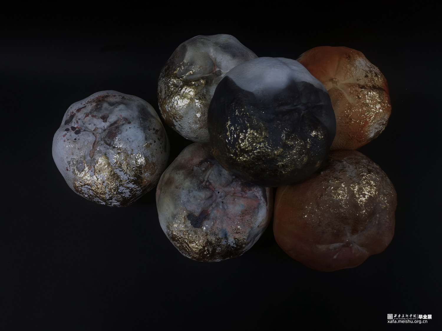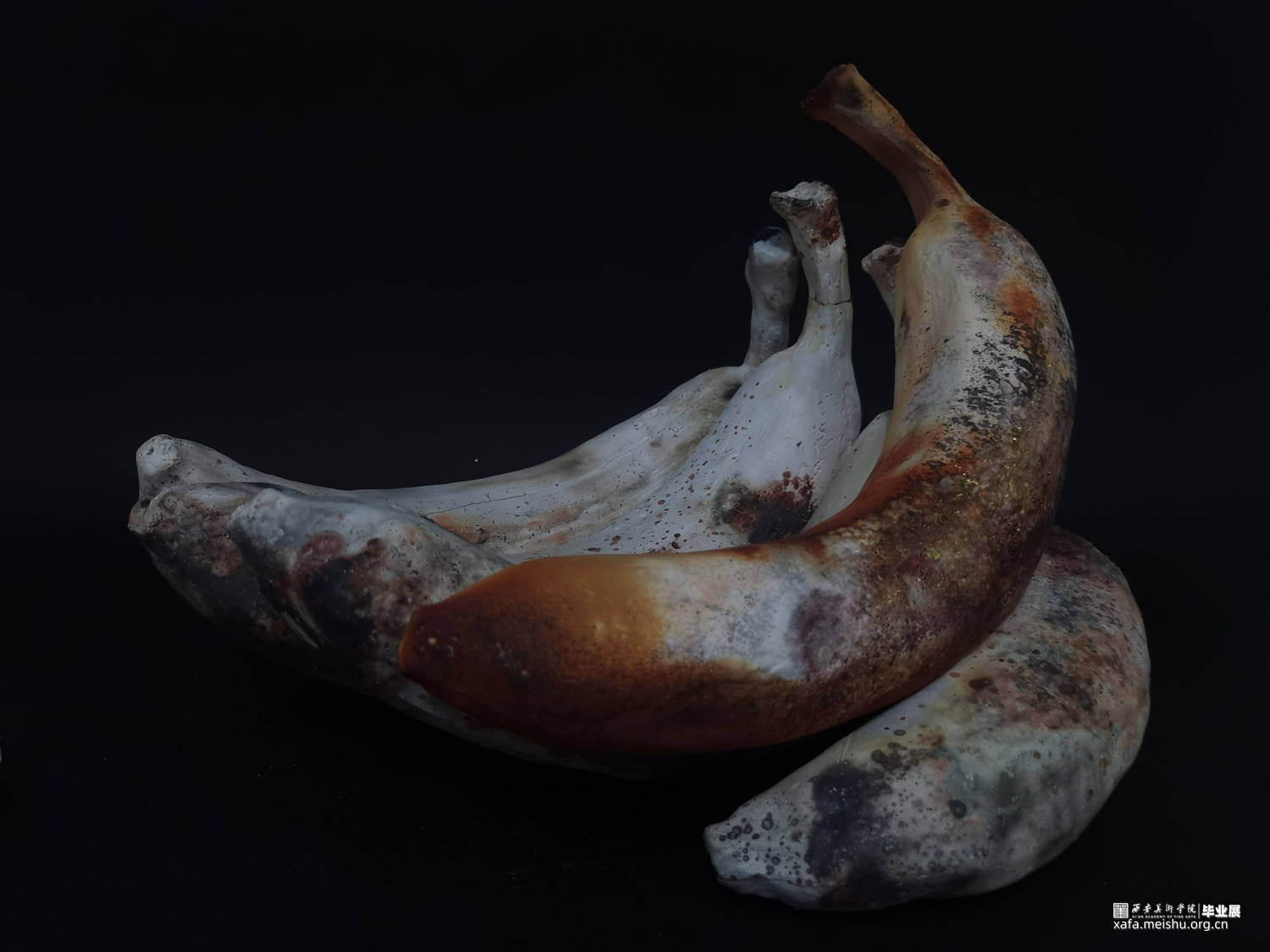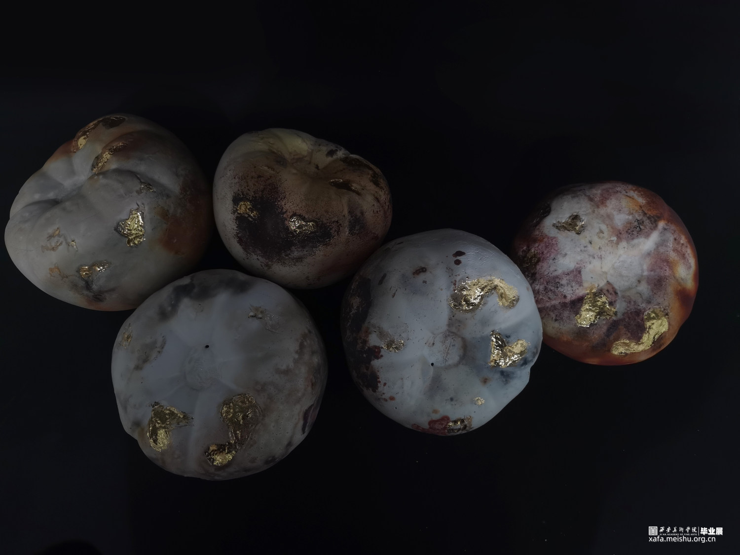 人本身的欲望驱使着我们对禁止的事物充满好奇,越是禁止就越想要触碰,“禁食”并不能阻止人们“进食”,皮表部分腐烂的水果其肉质已经完全腐坏,浮华的装饰无法阻挡时间的侵蚀与食物的腐坏,陈腐与新鲜本肉眼可辨,但人的主观意识不一定可辨。水果腐烂的部分以金箔为装饰试图掩盖腐坏的事实,造成可“进食”的假象,用陶瓷熏烧的艺术效果表达自欺欺人“禁食”本身的寓意,该作品旨在提醒人们要客观对待现实生活中的事实,善待自己,追求美好。