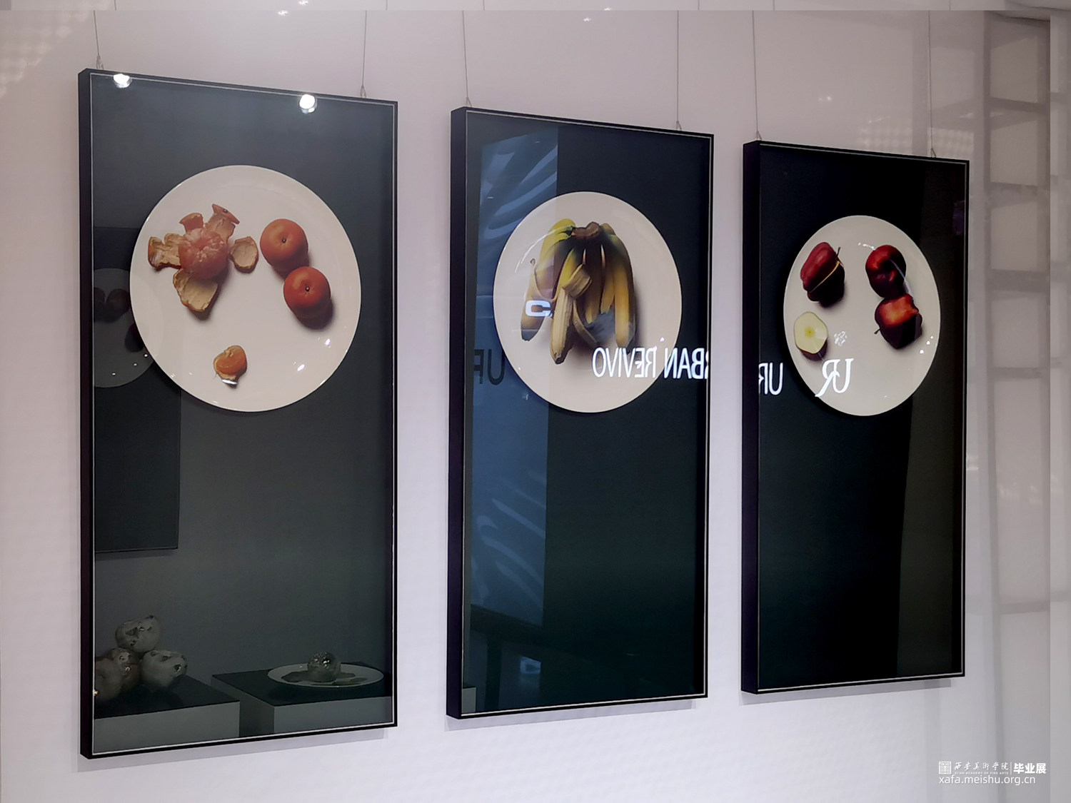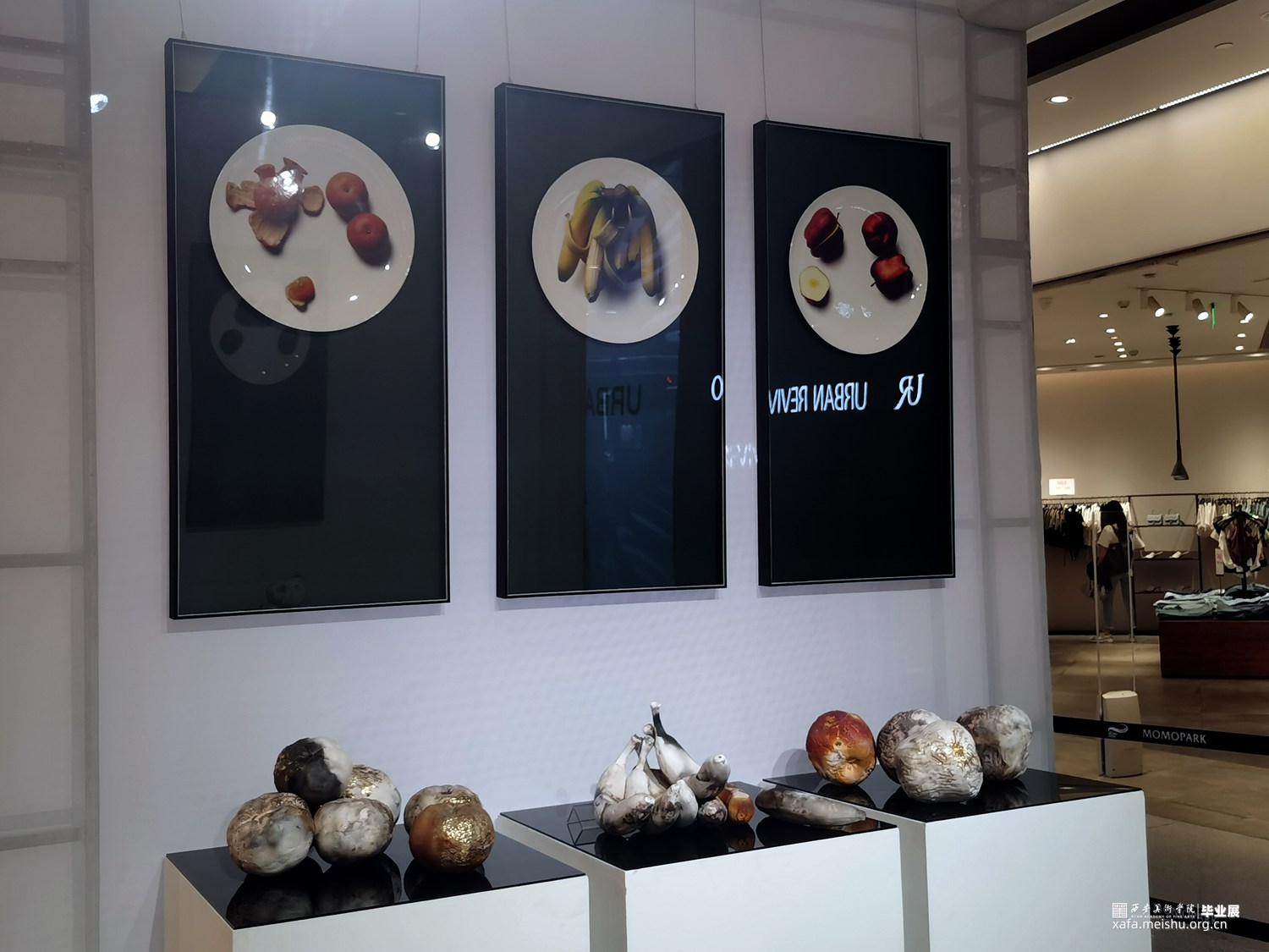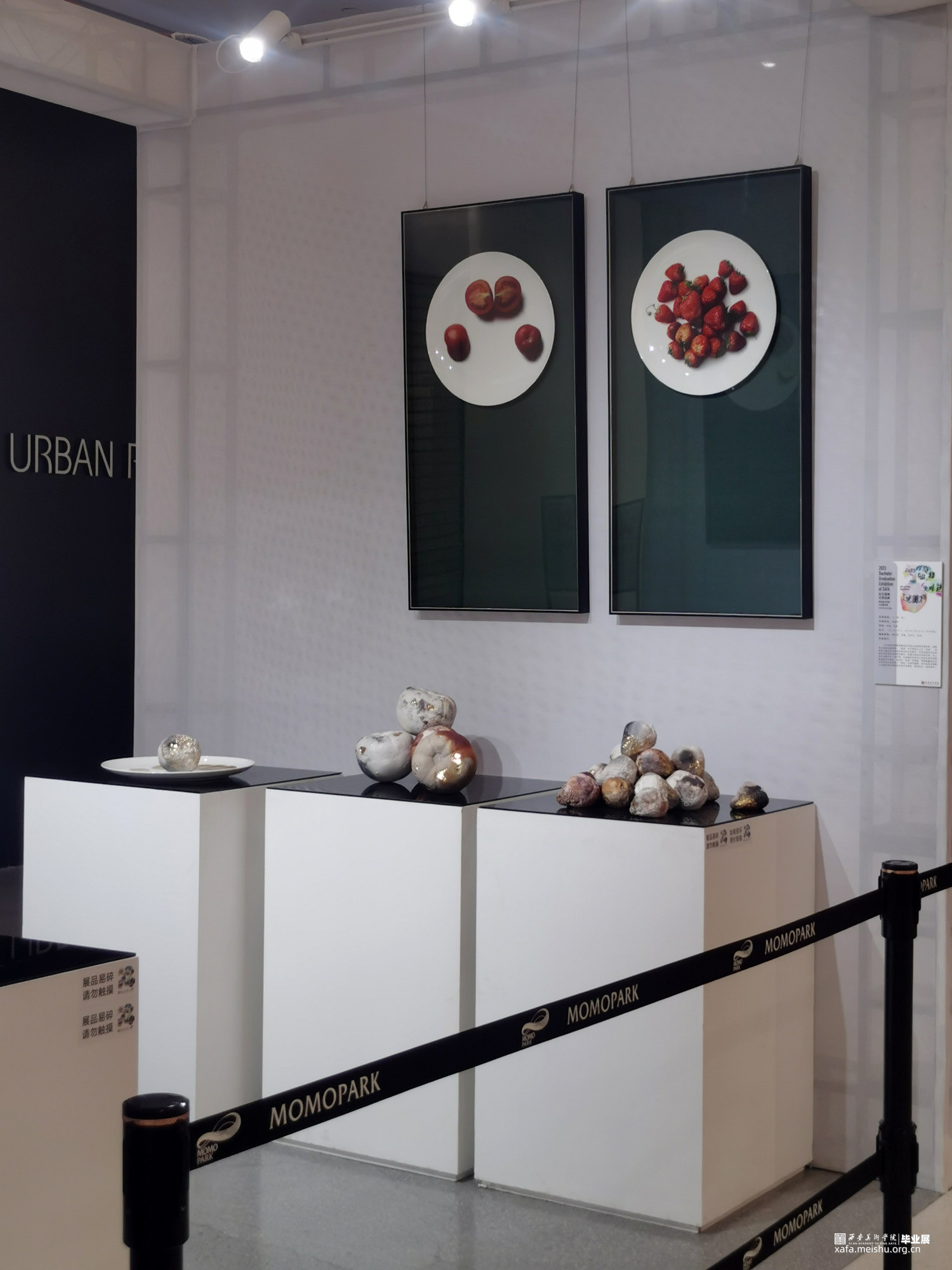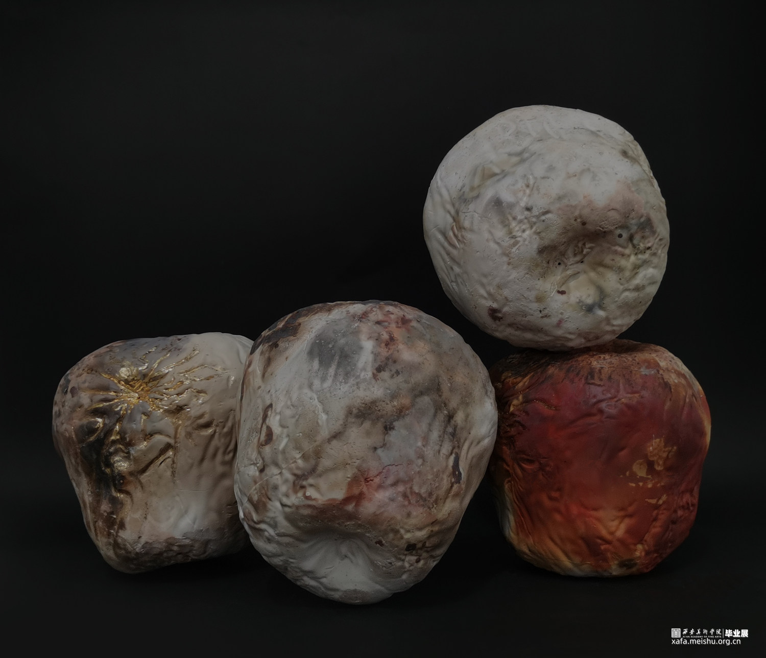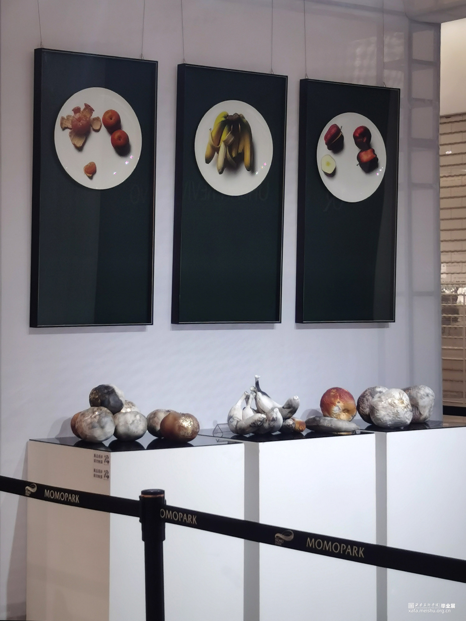 人本身的欲望驱使着我们对禁止的事物充满好奇,越是禁止就越想要触碰,“禁食”并不能阻止人们“进食”,皮表部分腐烂的水果其肉质已经完全腐坏,浮华的装饰无法阻挡时间的侵蚀与食物的腐坏,陈腐与新鲜本肉眼可辨,但人的主观意识不一定可辨。水果腐烂的部分以金箔为装饰试图掩盖腐坏的事实,造成可“进食”的假象,用陶瓷熏烧的艺术效果表达自欺欺人“禁食”本身的寓意,该作品旨在提醒人们要客观对待现实生活中的事实,善待自己,追求美好。