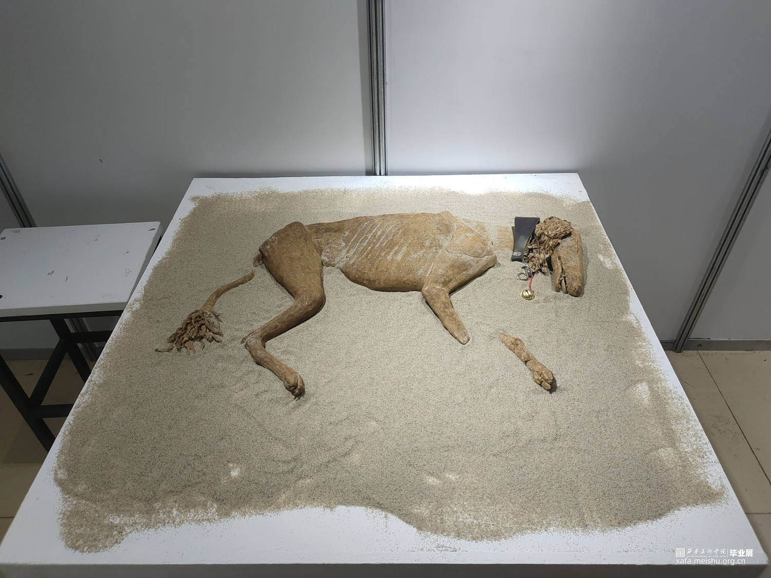 泥塑作品,塑造的是一只被投毒杀死的陕西细犬。