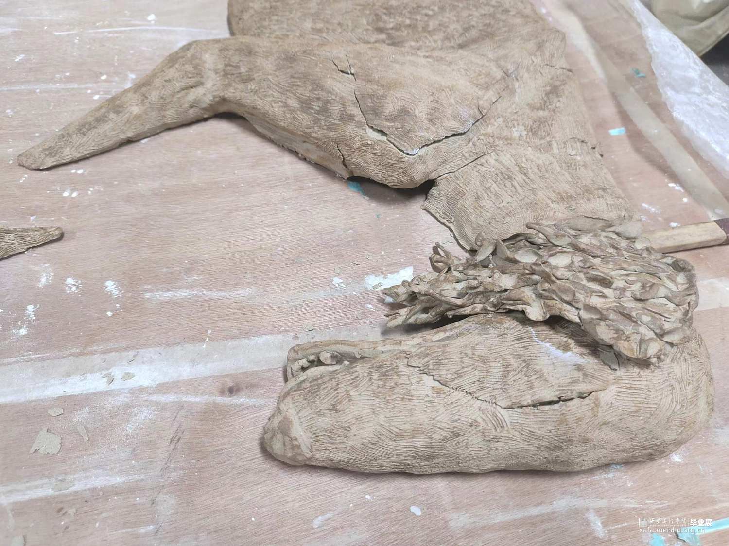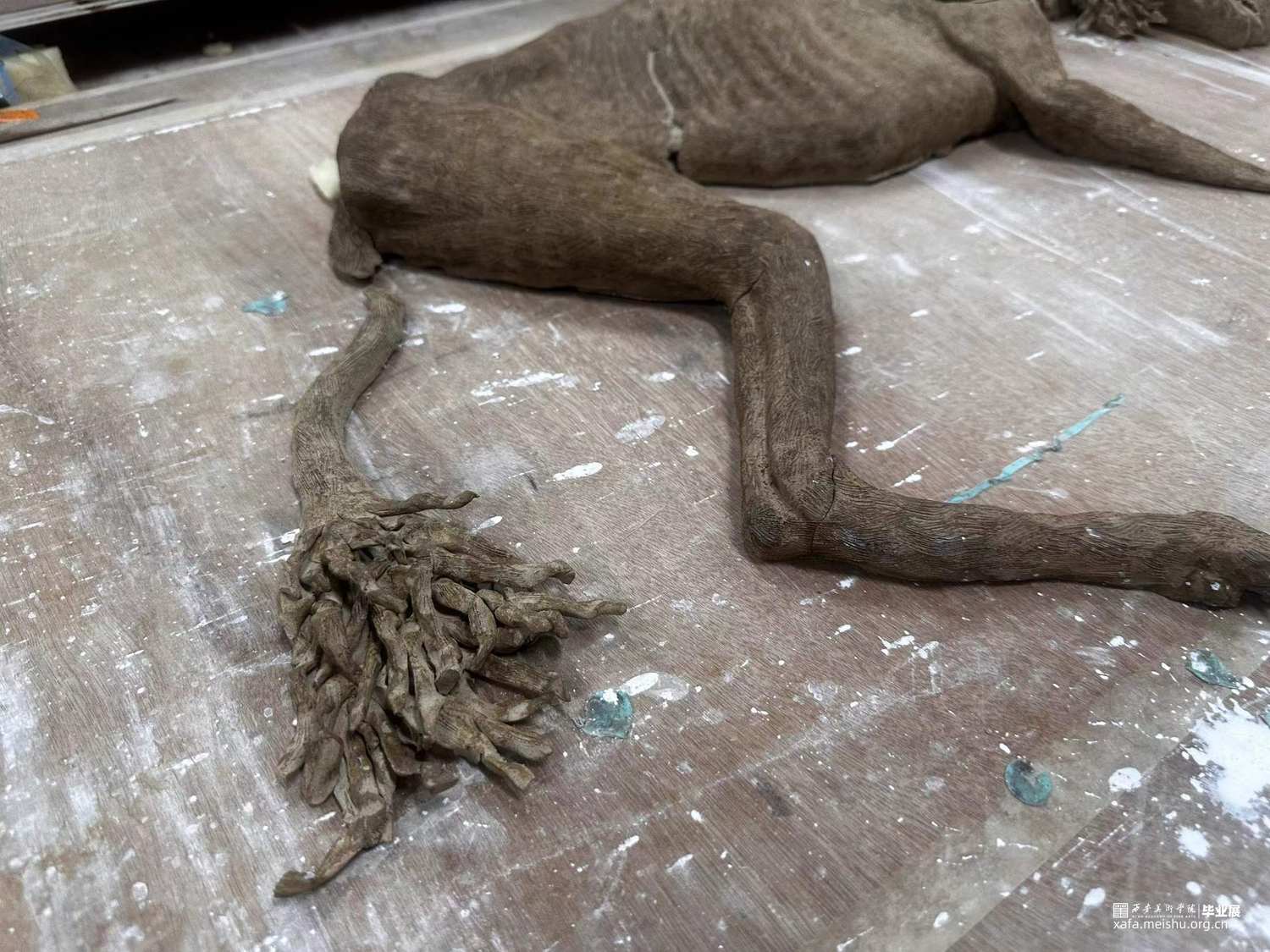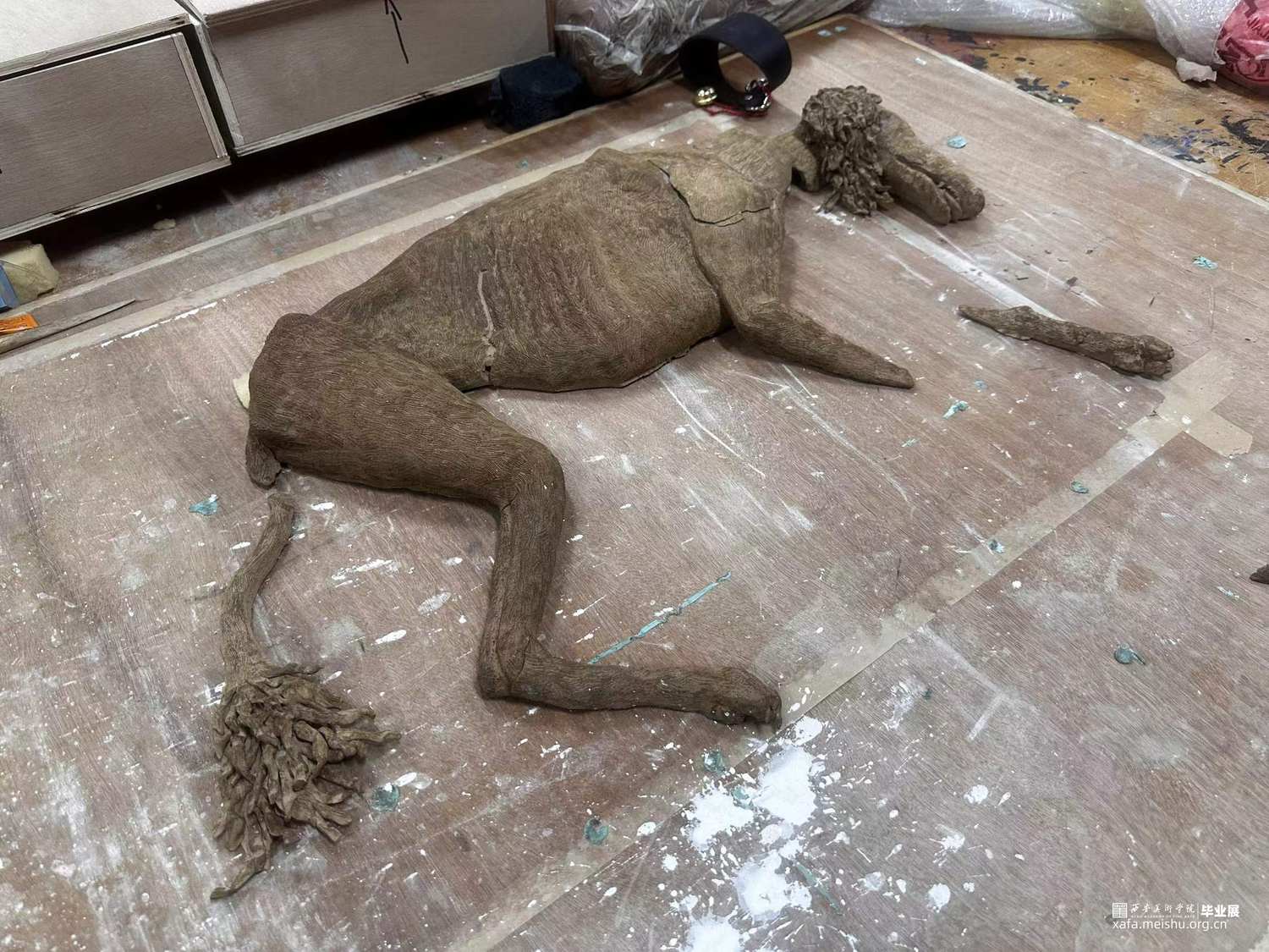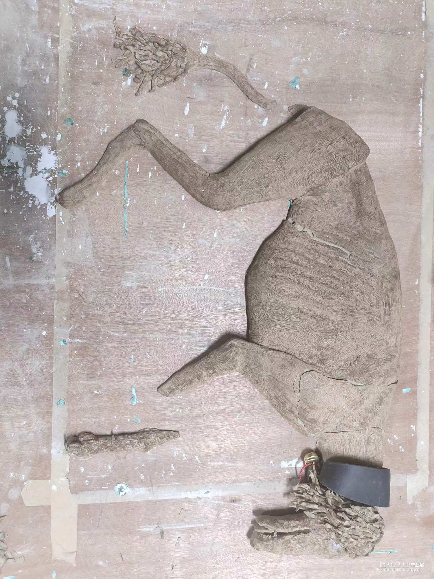 本人饲养陕西细犬,前些年是有一只优秀的公犬被人投毒杀死。为记录这只细犬的死亡,我用泥片成型的方法塑造了细犬死亡“半截入土”的状态。