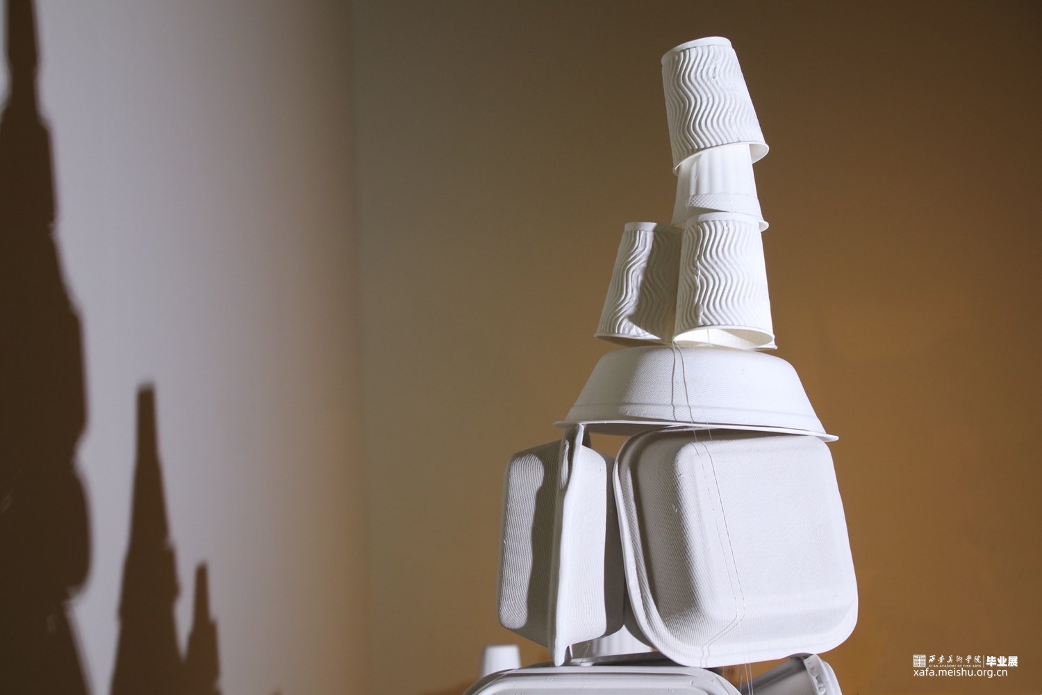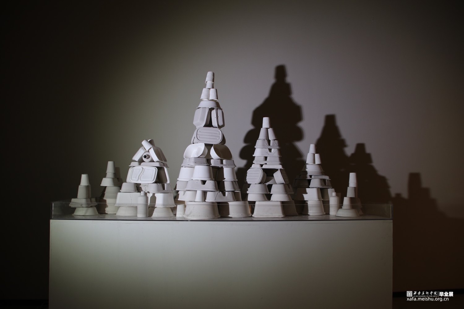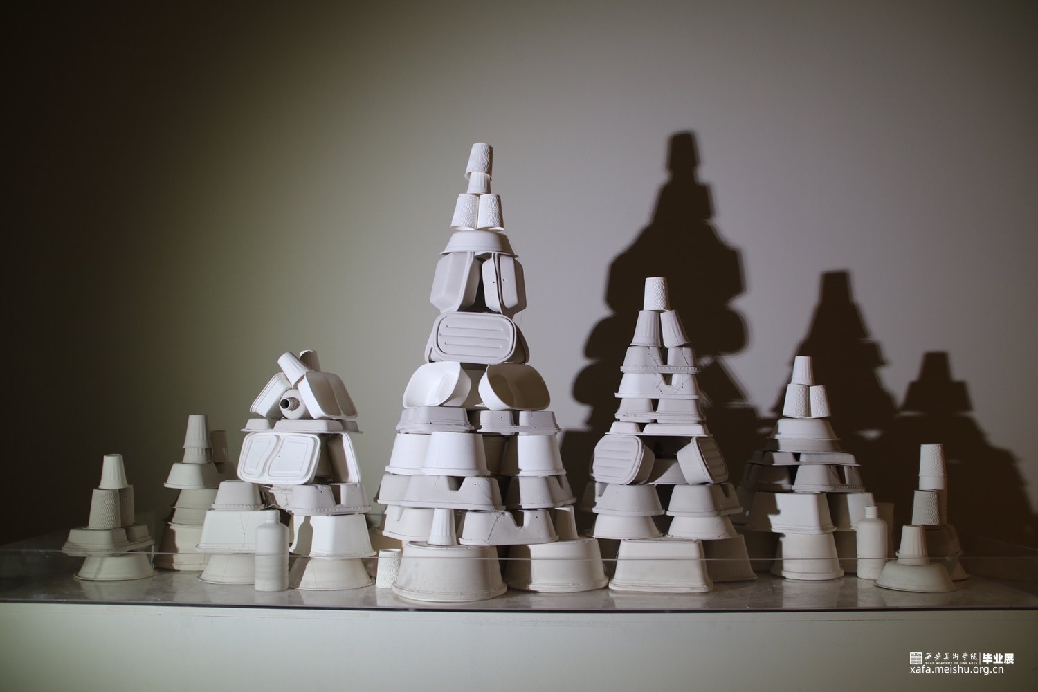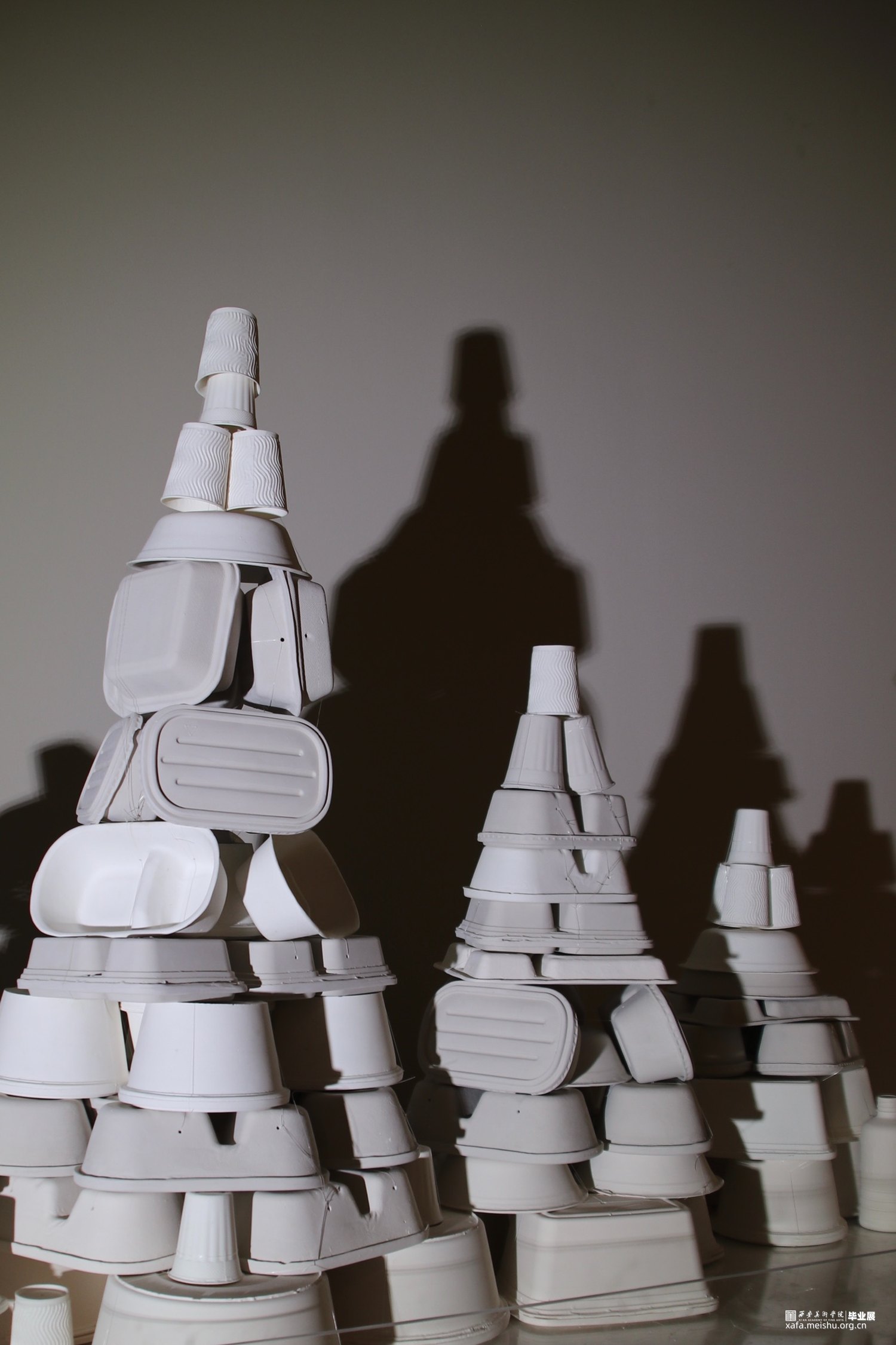 《森•林》使用白胎瓷分别制成塑料以及纸质两种不同质地的“白色垃圾”,作品由高温瓷、低温瓷以及不进行烧制的胚体3个部分组成,3个部分交错堆叠出